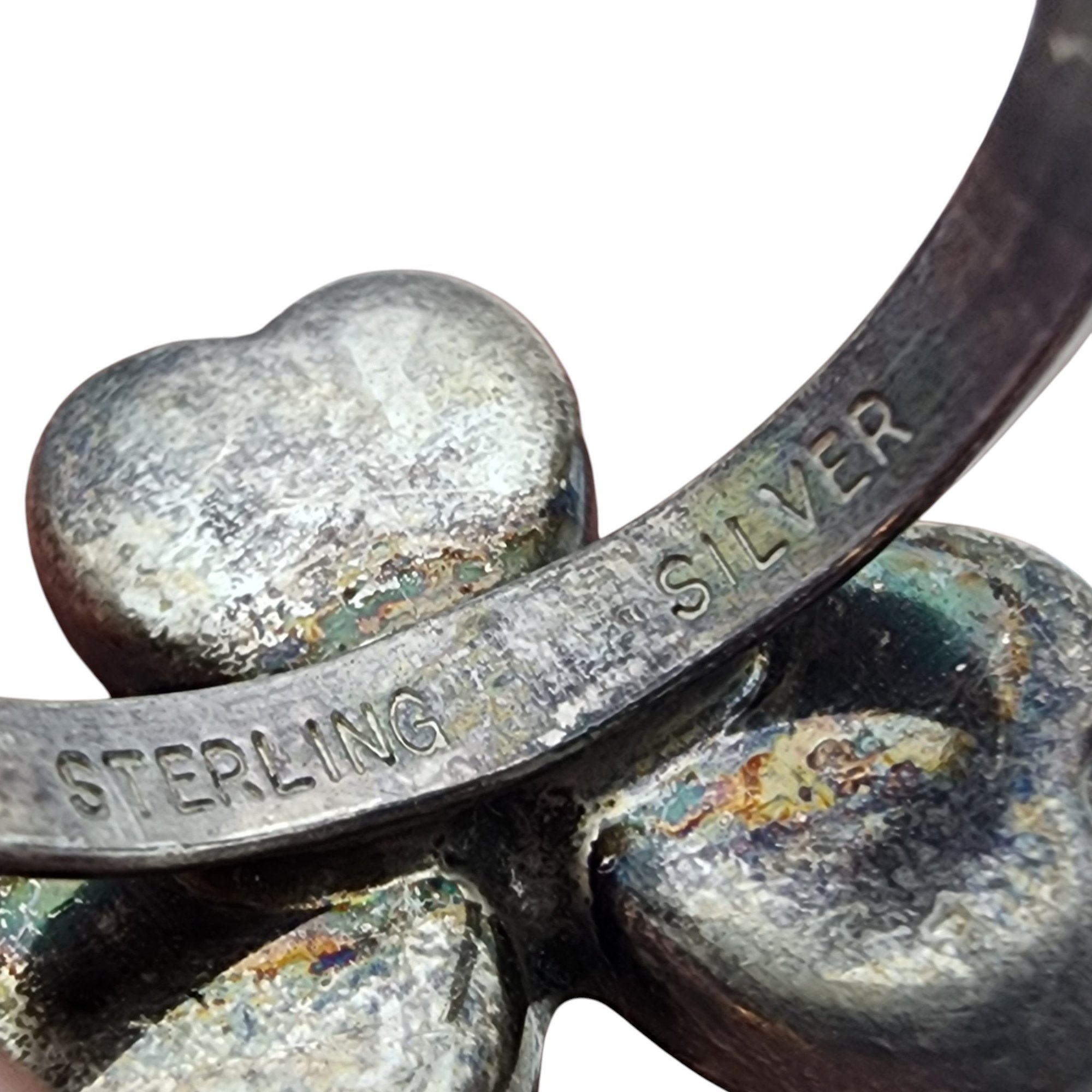 Vintage Sterling Connemara Marble? Emerald? Shamrock Adjustable Ring – currently a size 6 – 3.6g – stone tests in range of emerald-nephrite/jade with the presidium gem tester.
