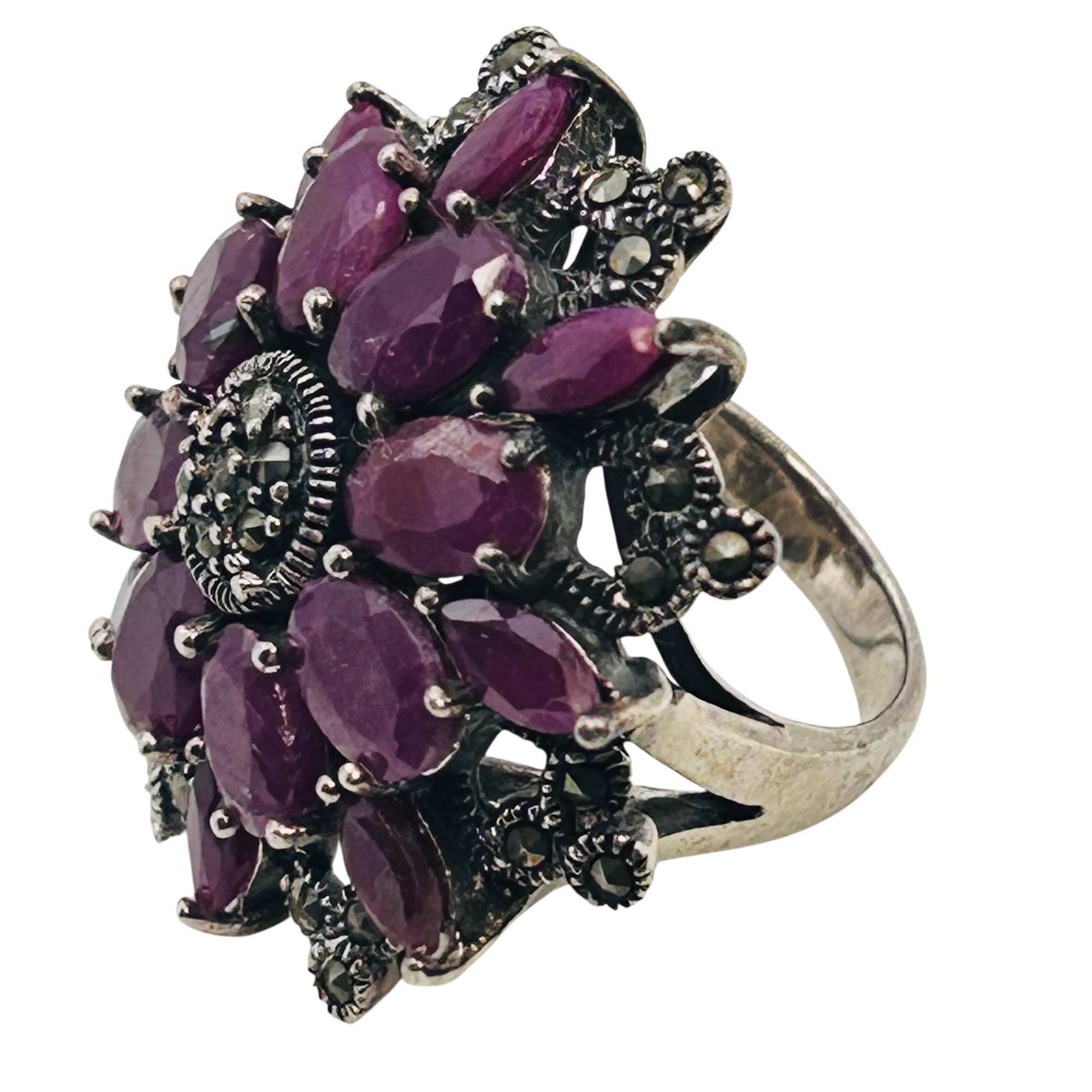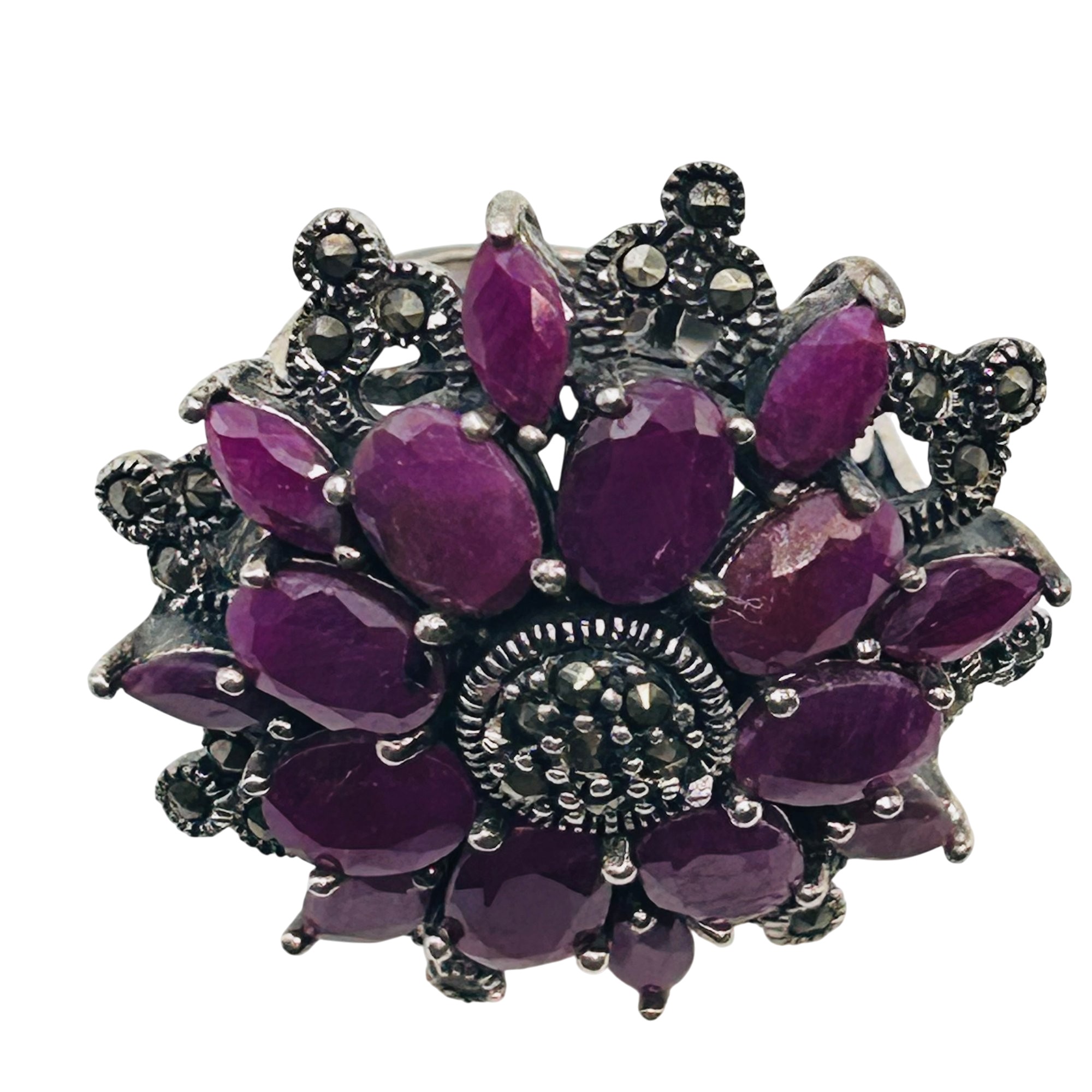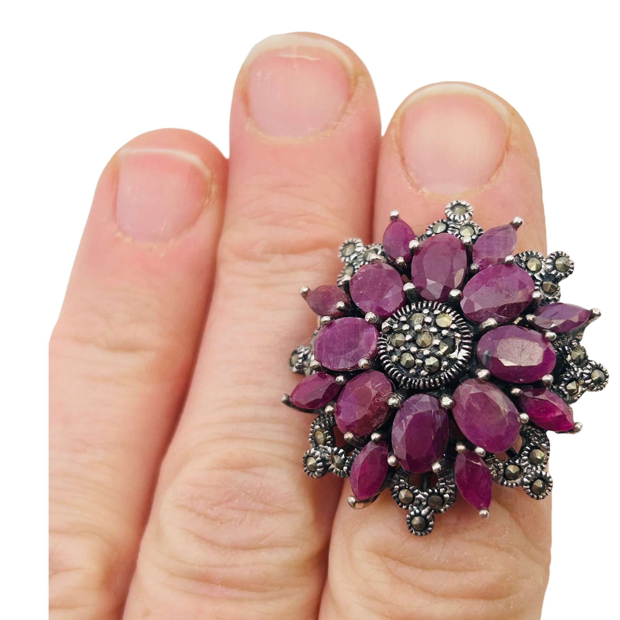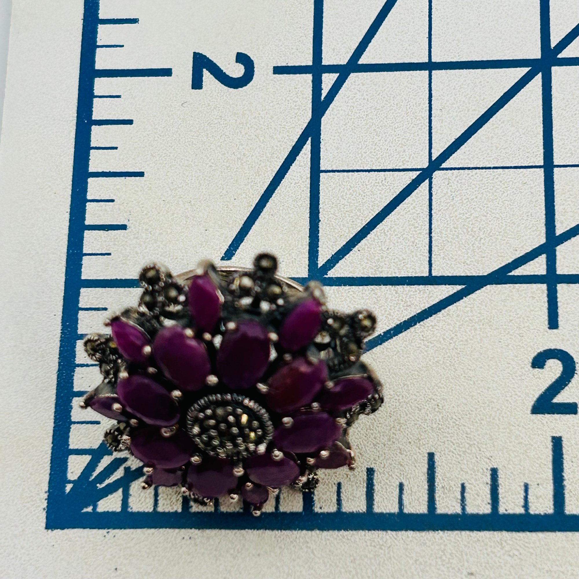 Ruby and marcasite sterling flower statement ring size 6 12.7 g