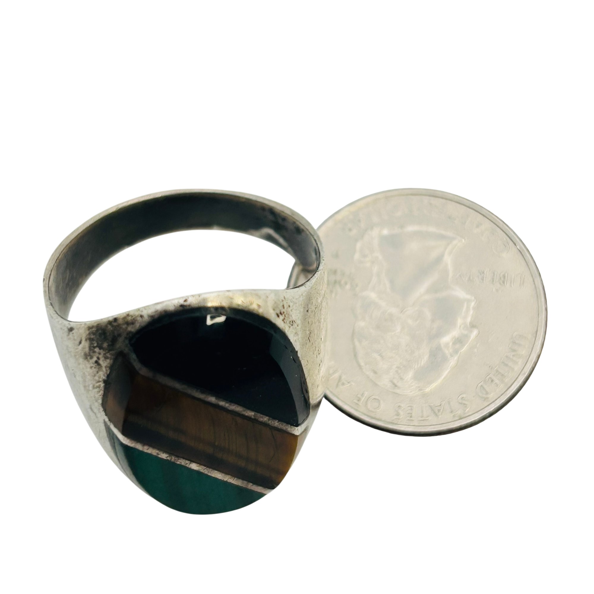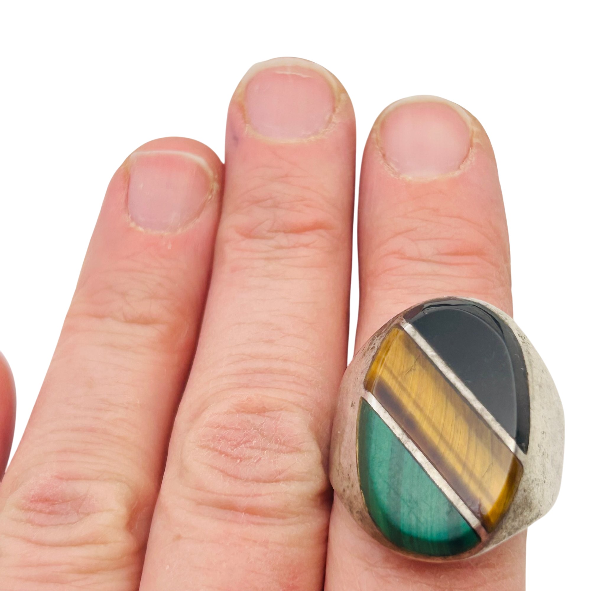 Taxco TE-14 Mexico Malachite, Tigers Eye, Onyx Statement Ring Size 13.5, 16.34g