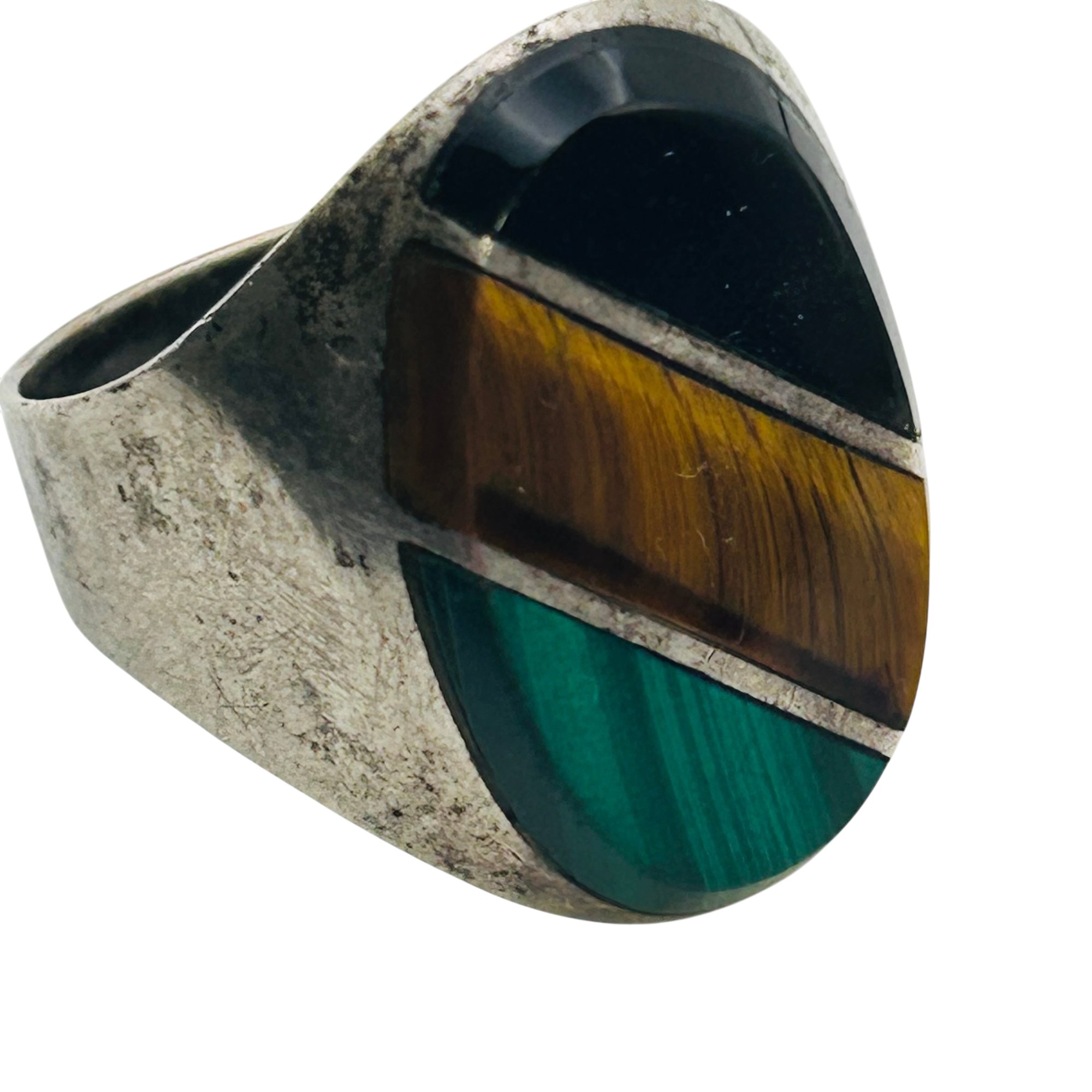 Taxco TE-14 Mexico malachite tigers eye onyx statement ring size 13.5 16.34g