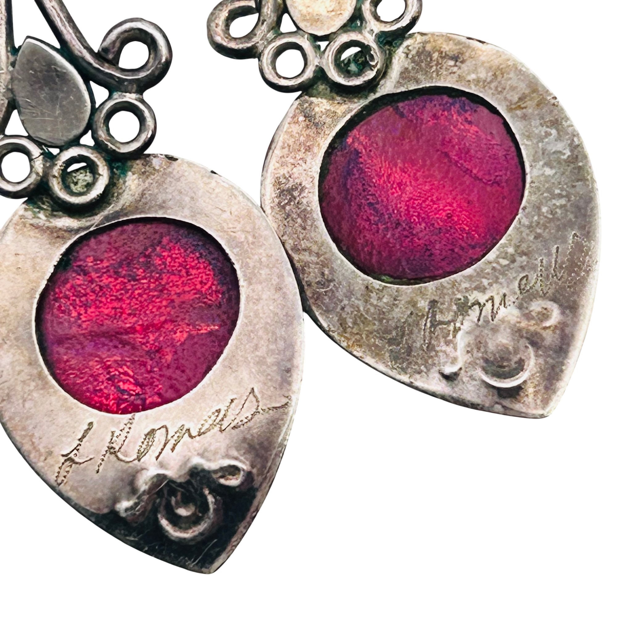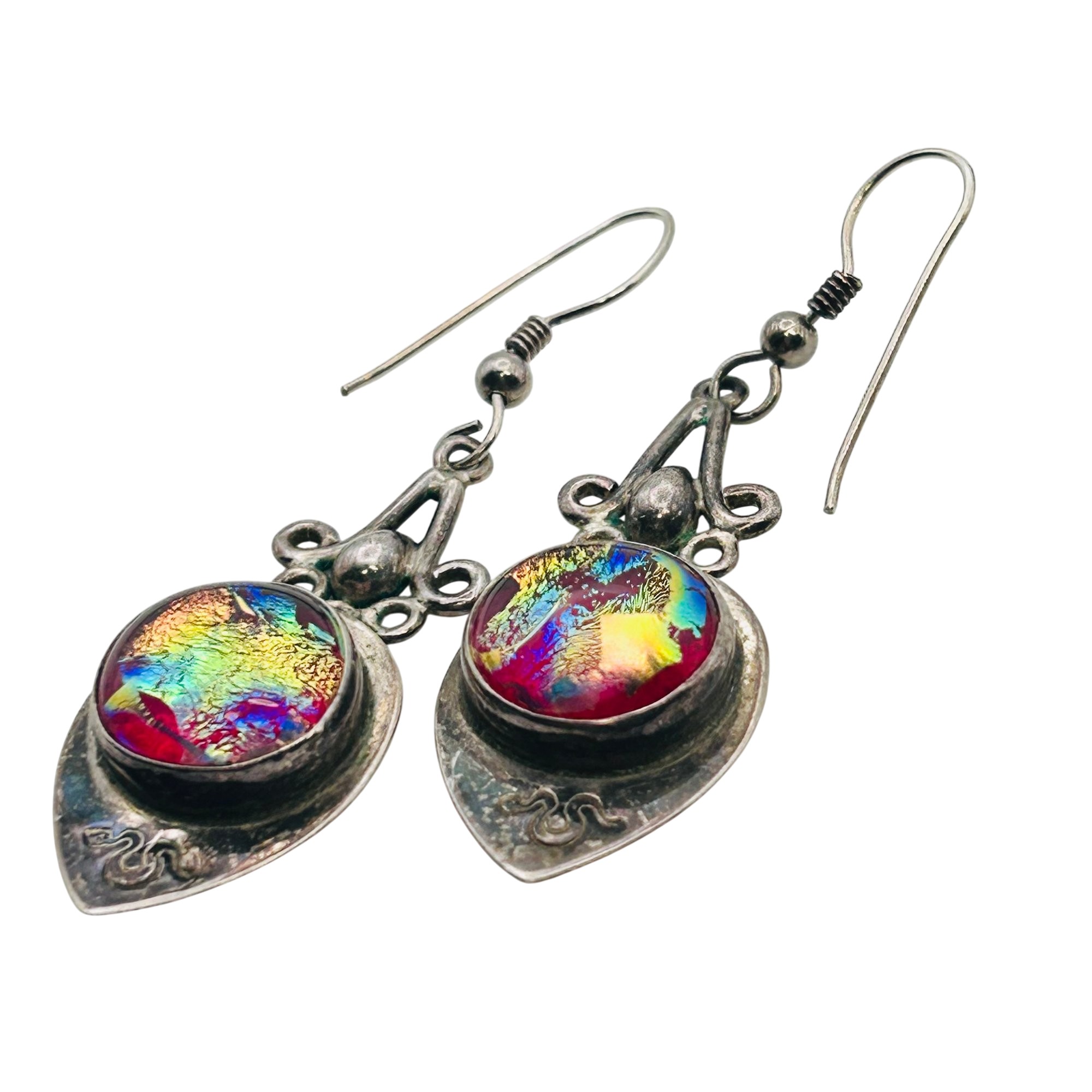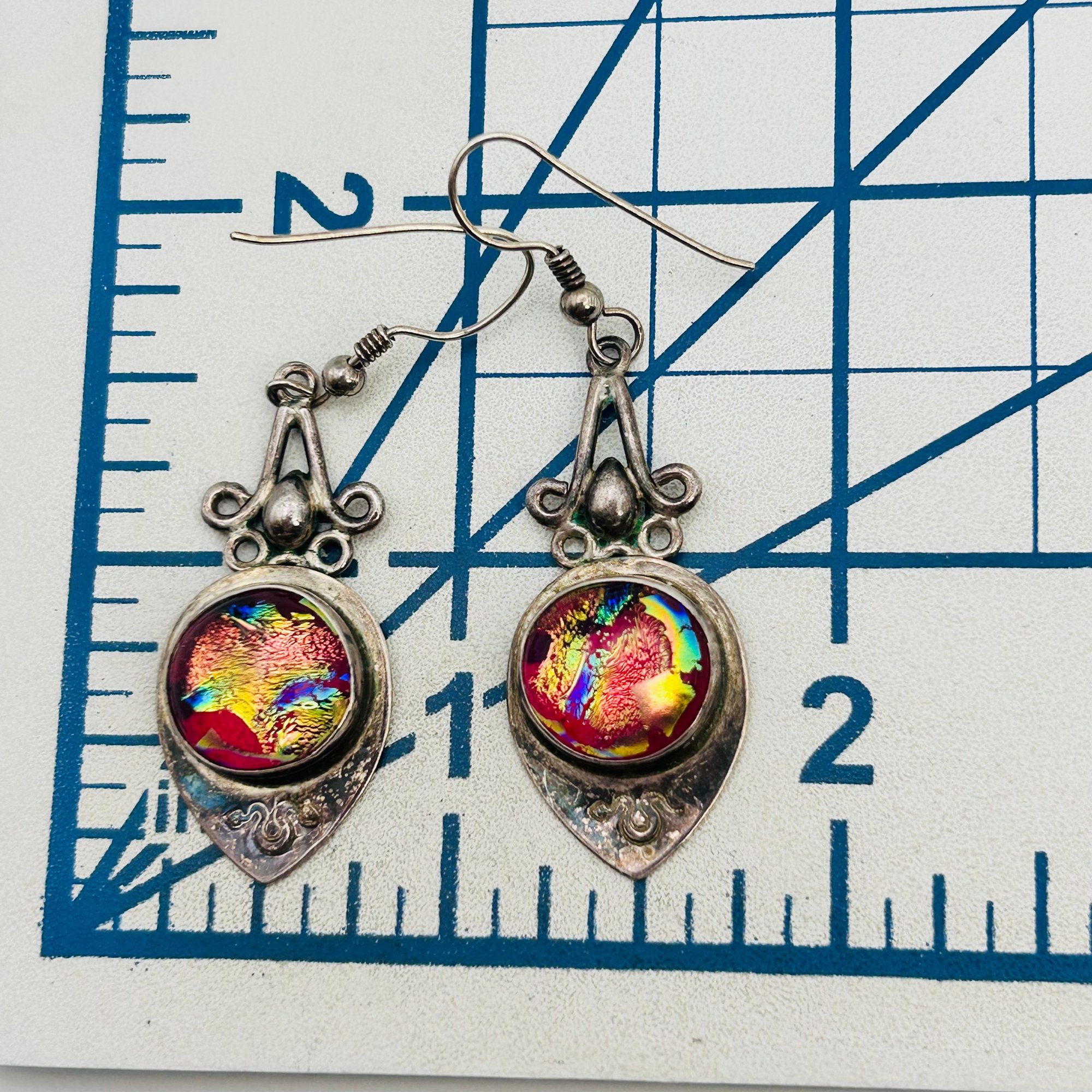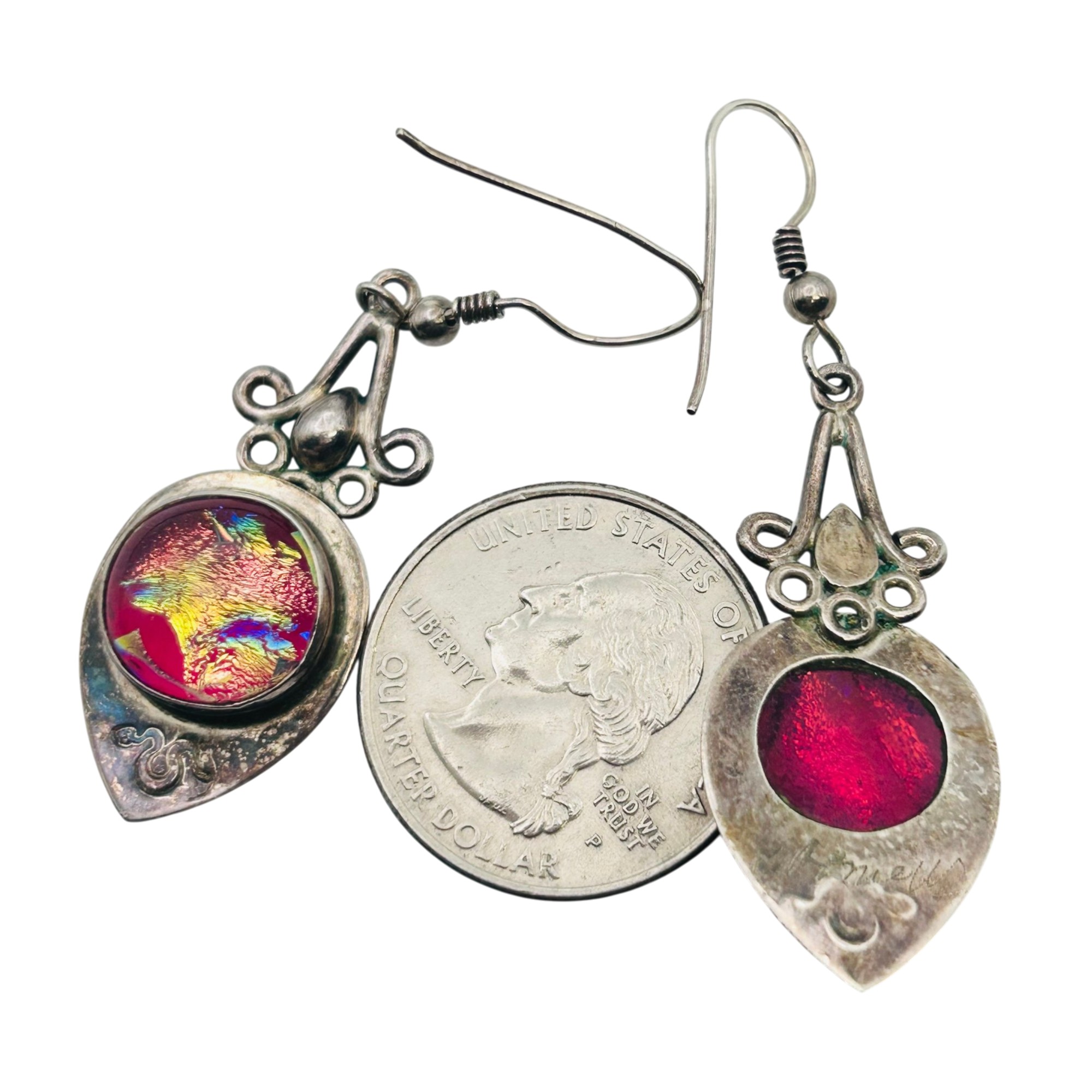 Signed L. ROMEUS. Dichroic glass sterling dangle earrings 7.12 g.