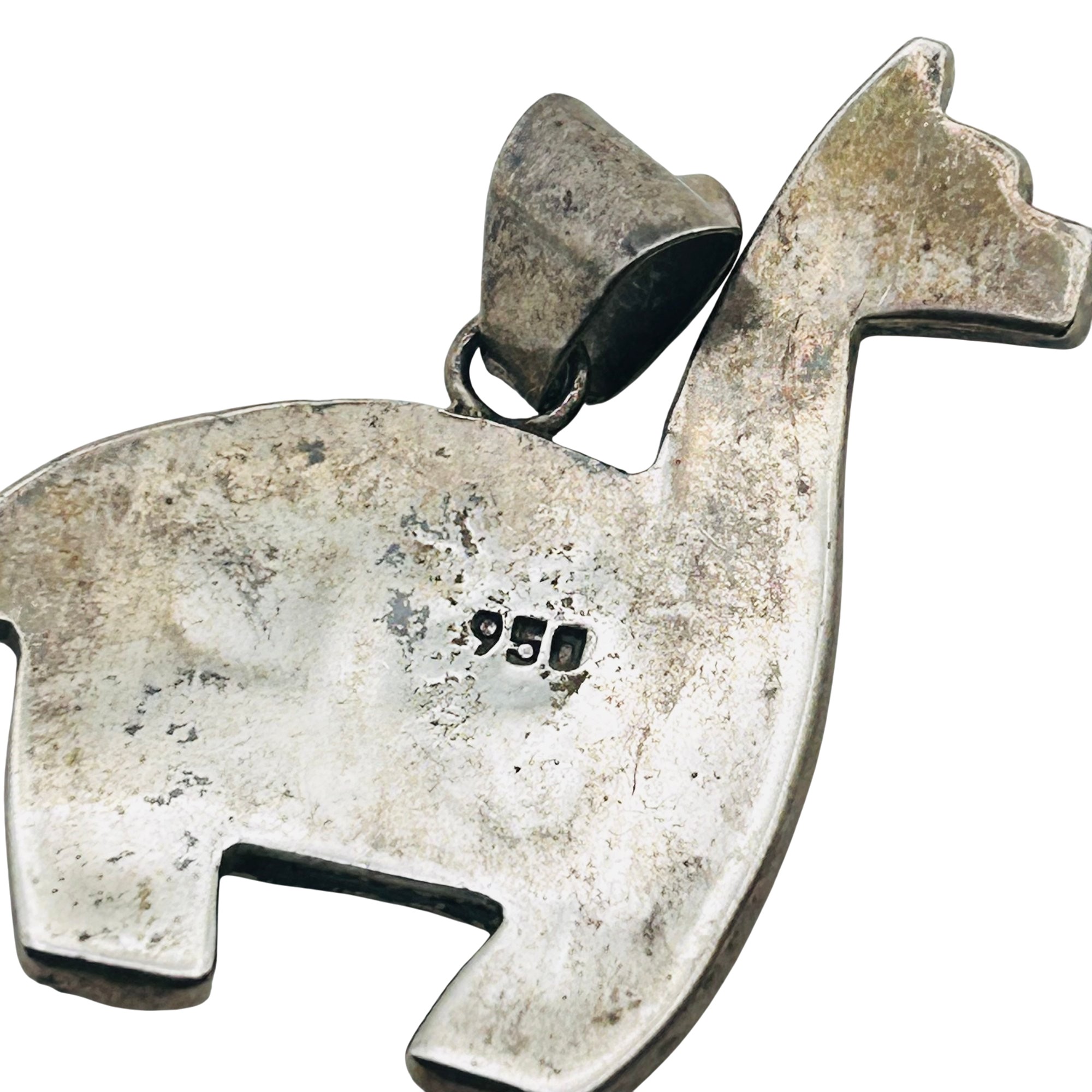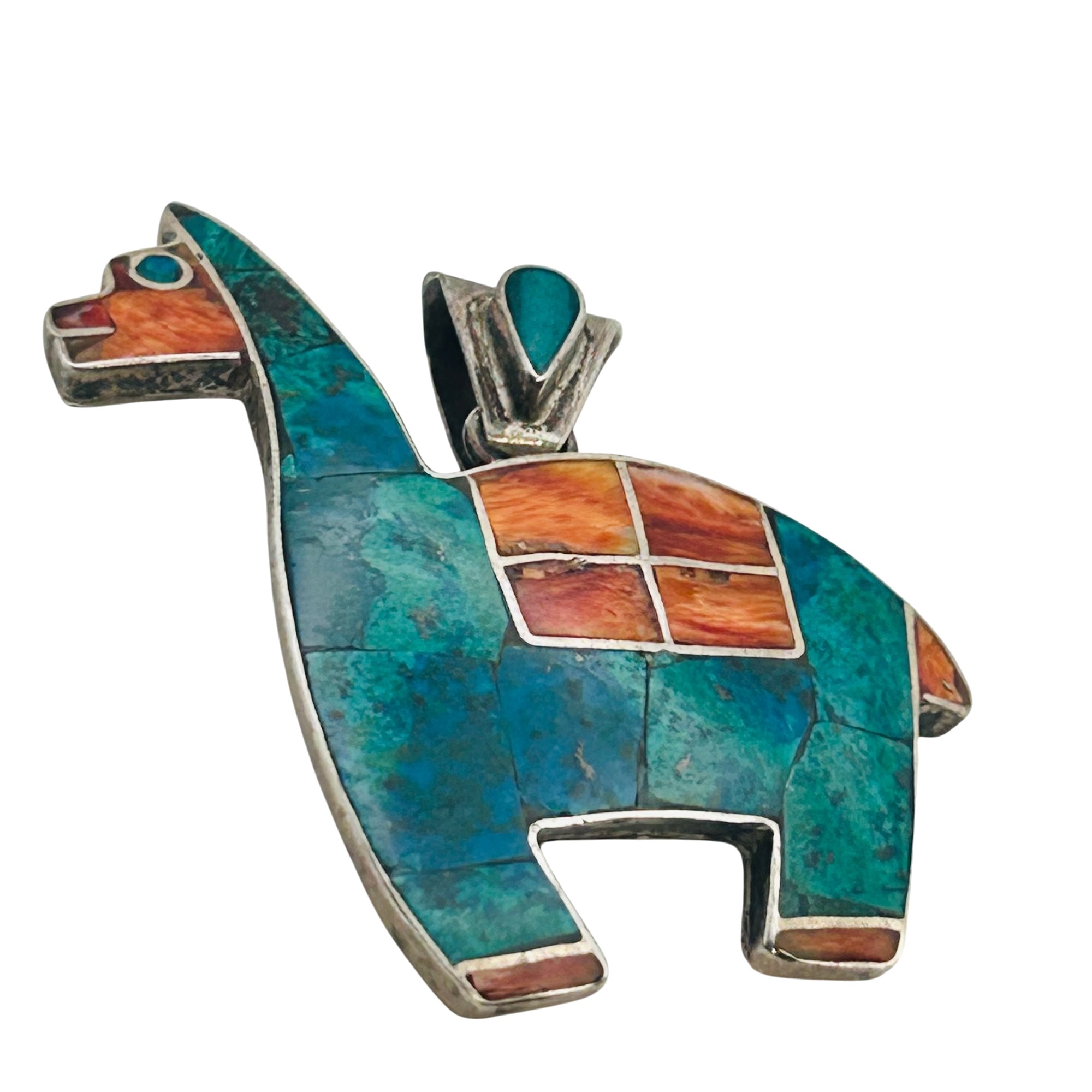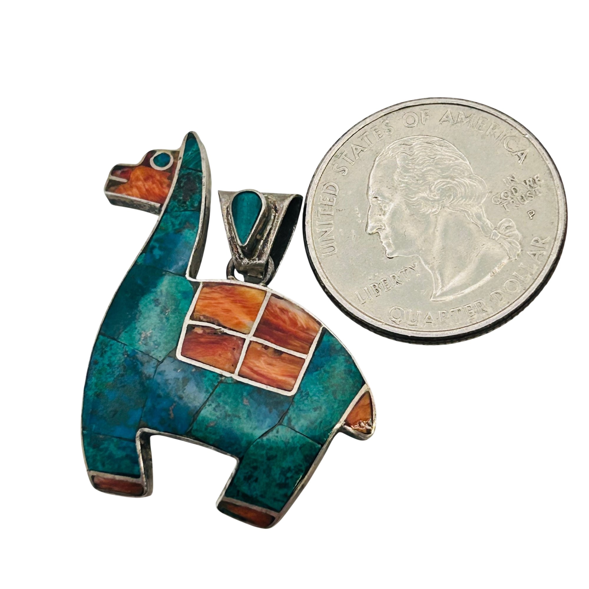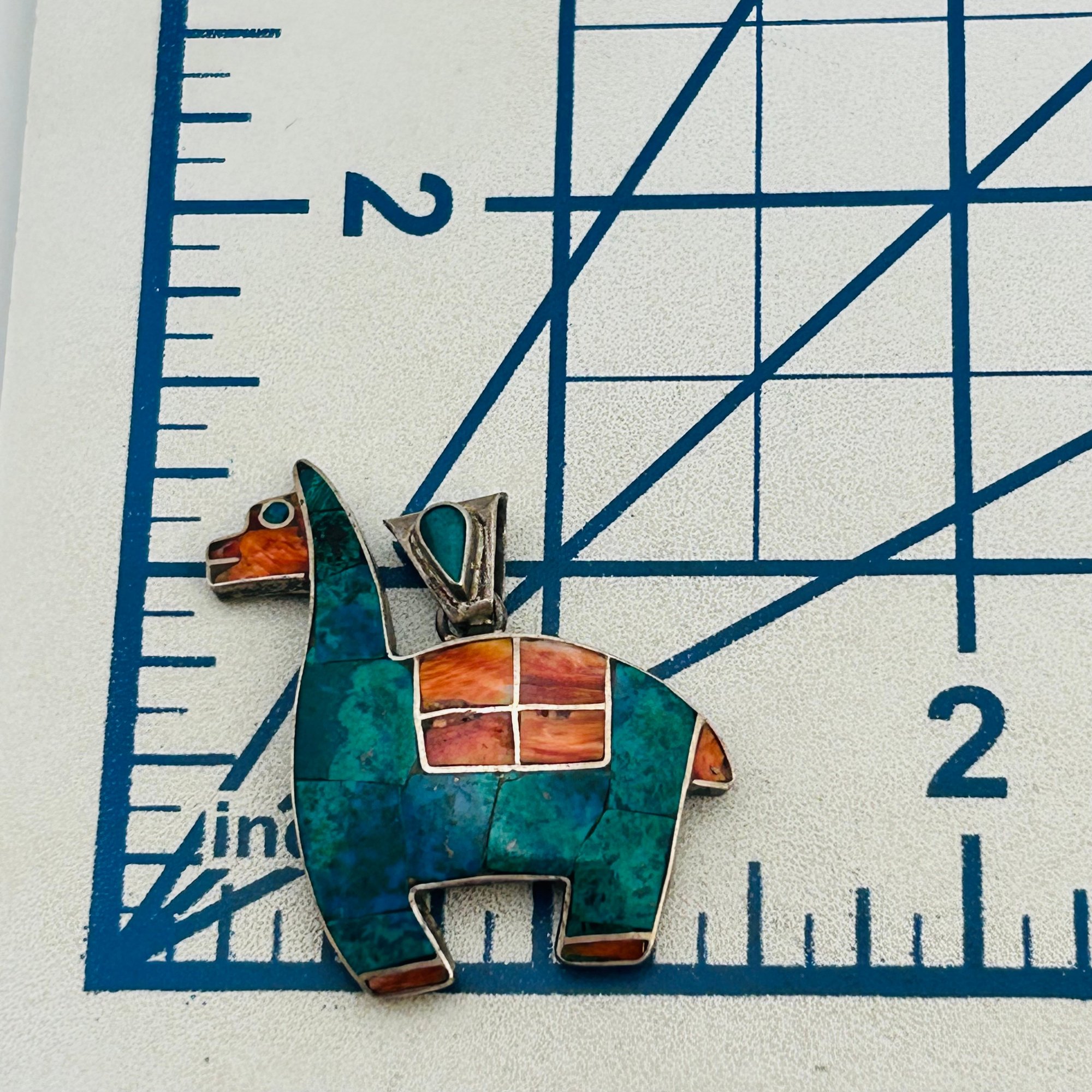 Vintage 950 silver Southwest llama Sterling inlay Stone coral and turquoise pendant 5.4 g