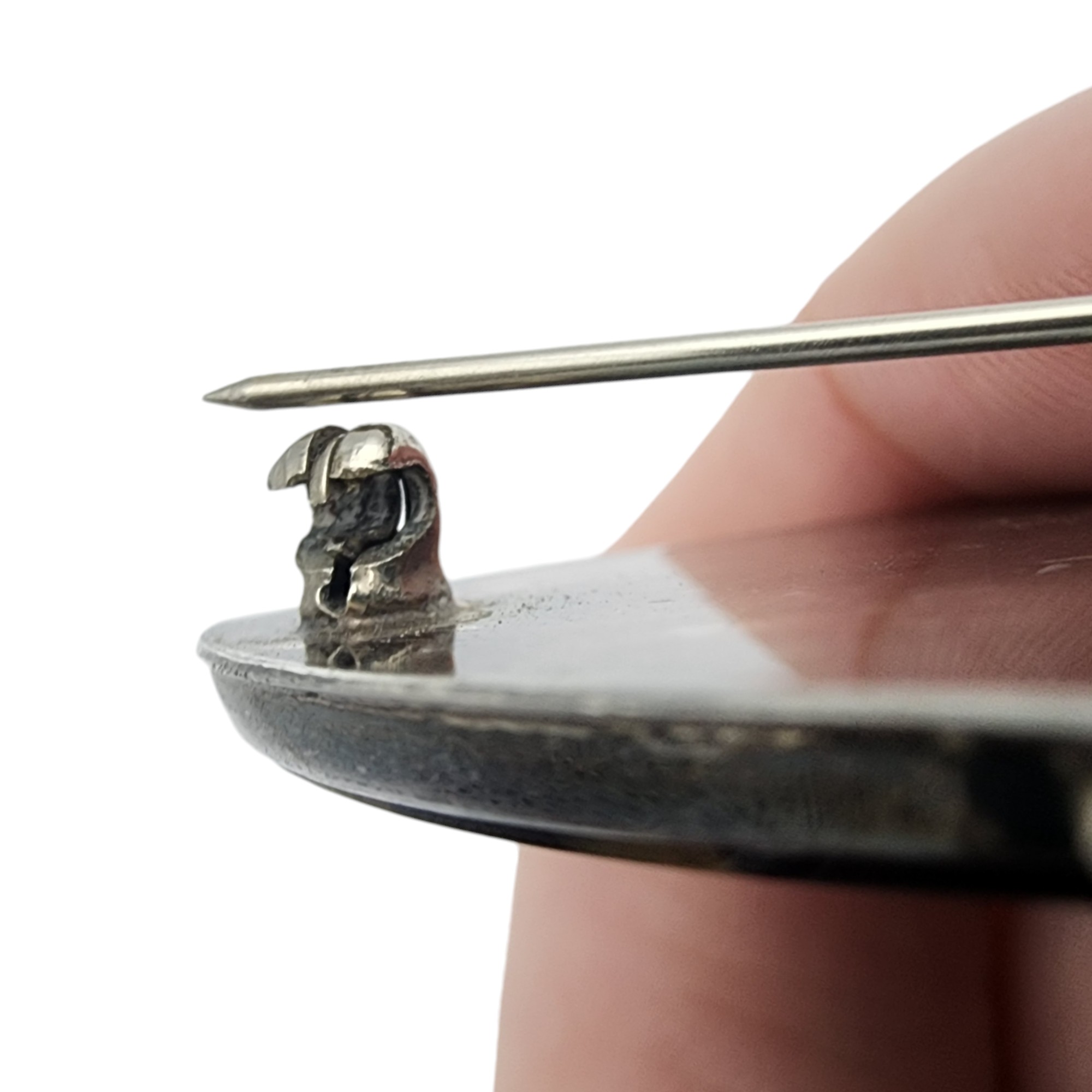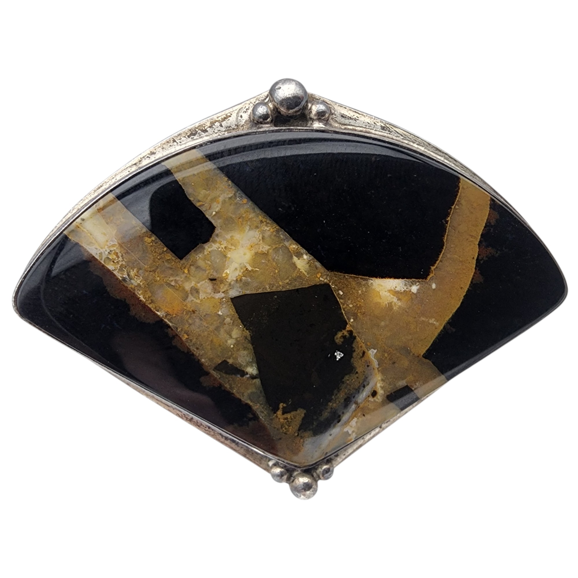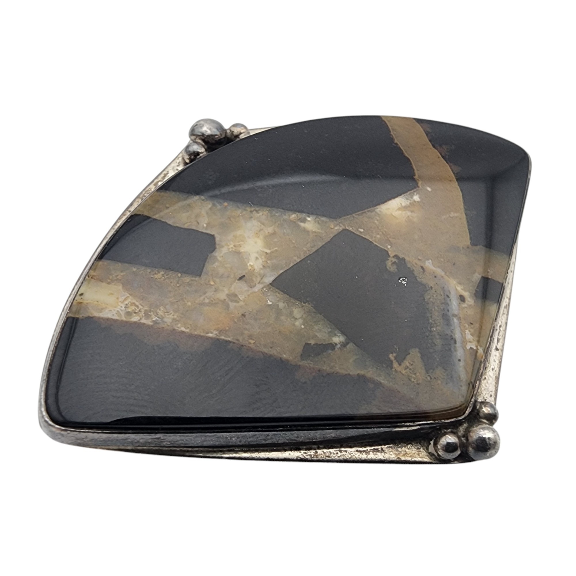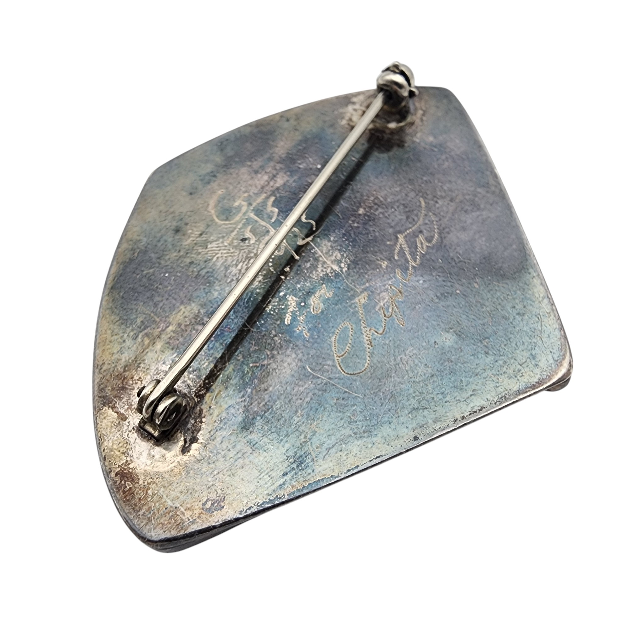 Gorgeous! Signed Artisan Sterling Silver Jasper/Agate Brooch, 18.3g, very unique stone! The rotating jaw of brooch catch appears to be misaligned, requires pressure to press pin into/out of the jaw, and pressure and wiggle movement to close the rotating jaw around the pin, jaw/catch likely needs replaced – see pictures, bid as you feel comfortable, sold as is.