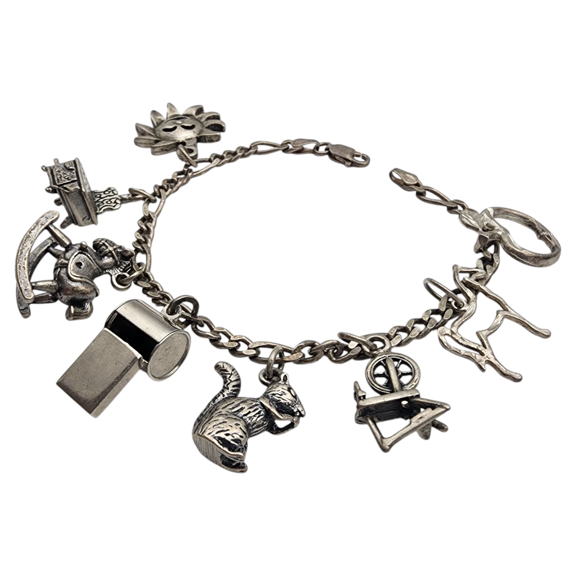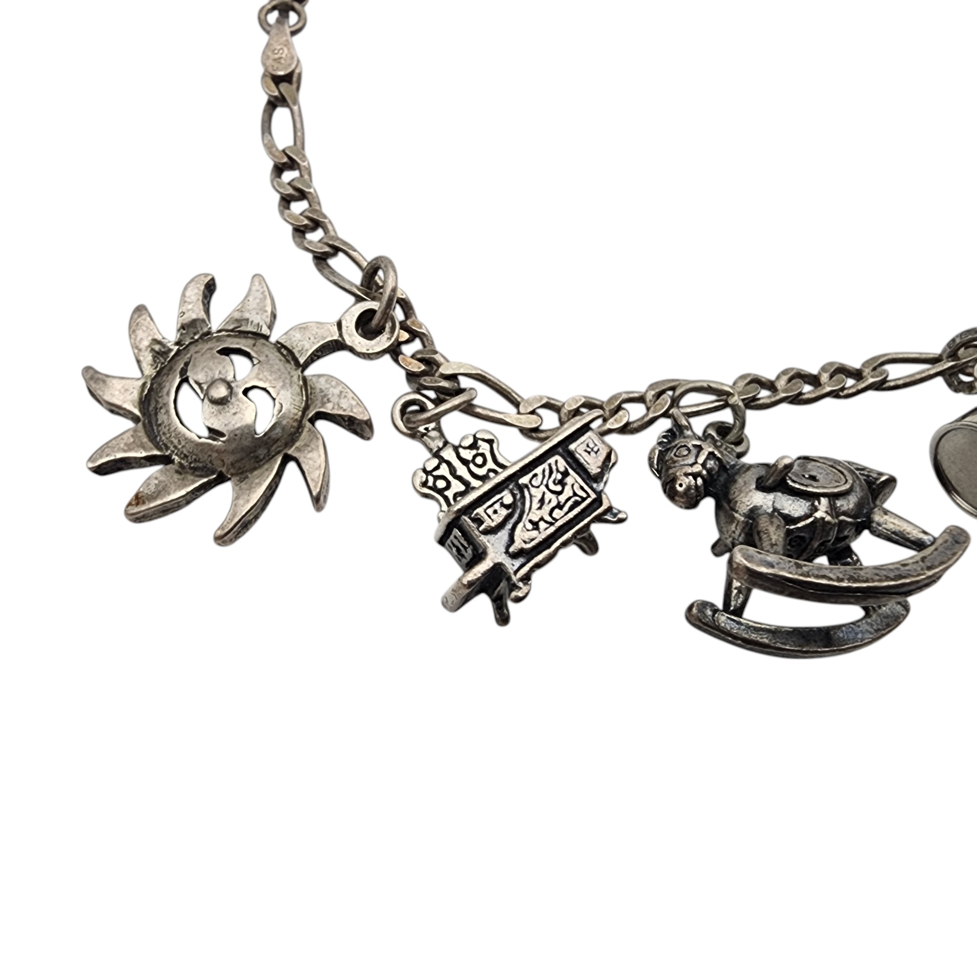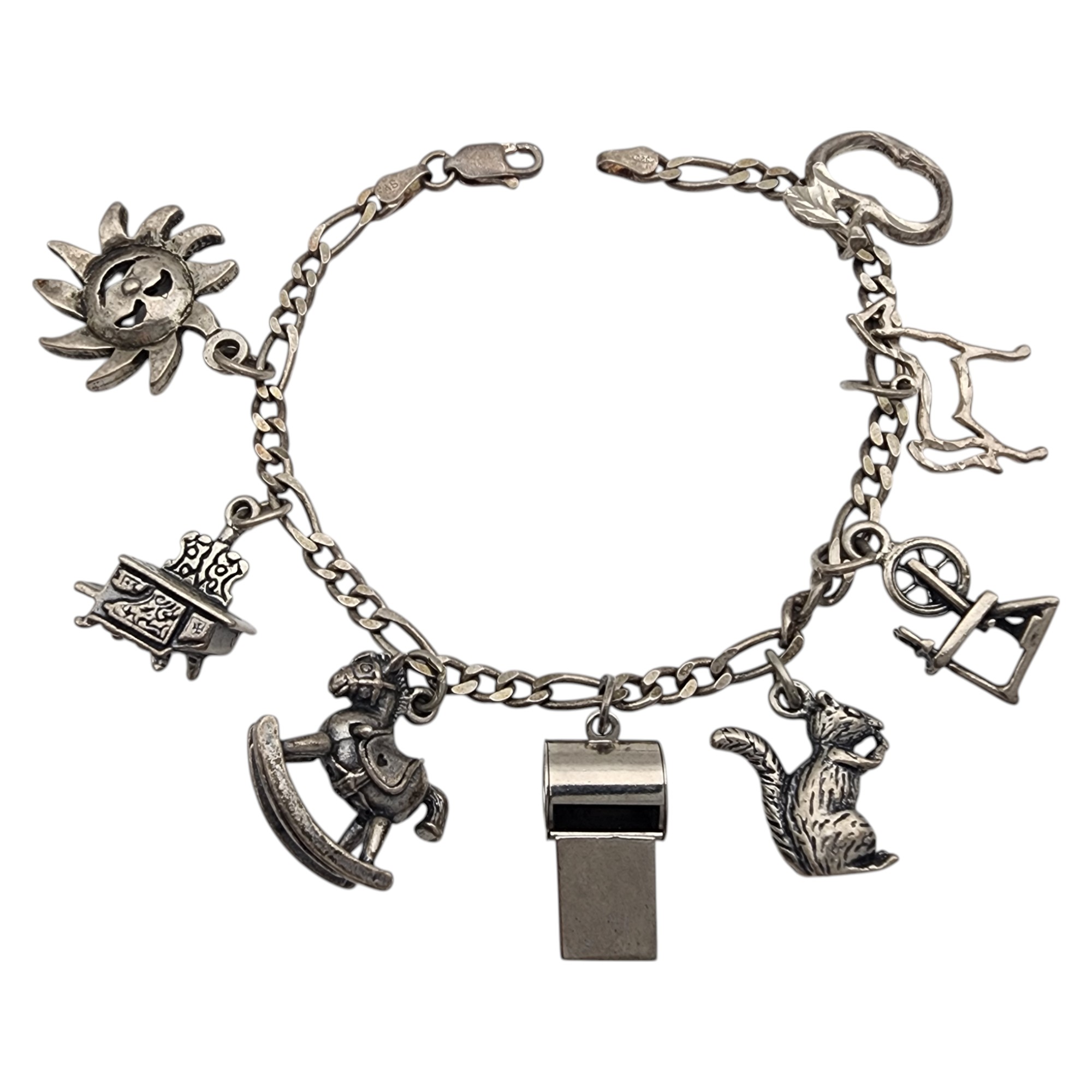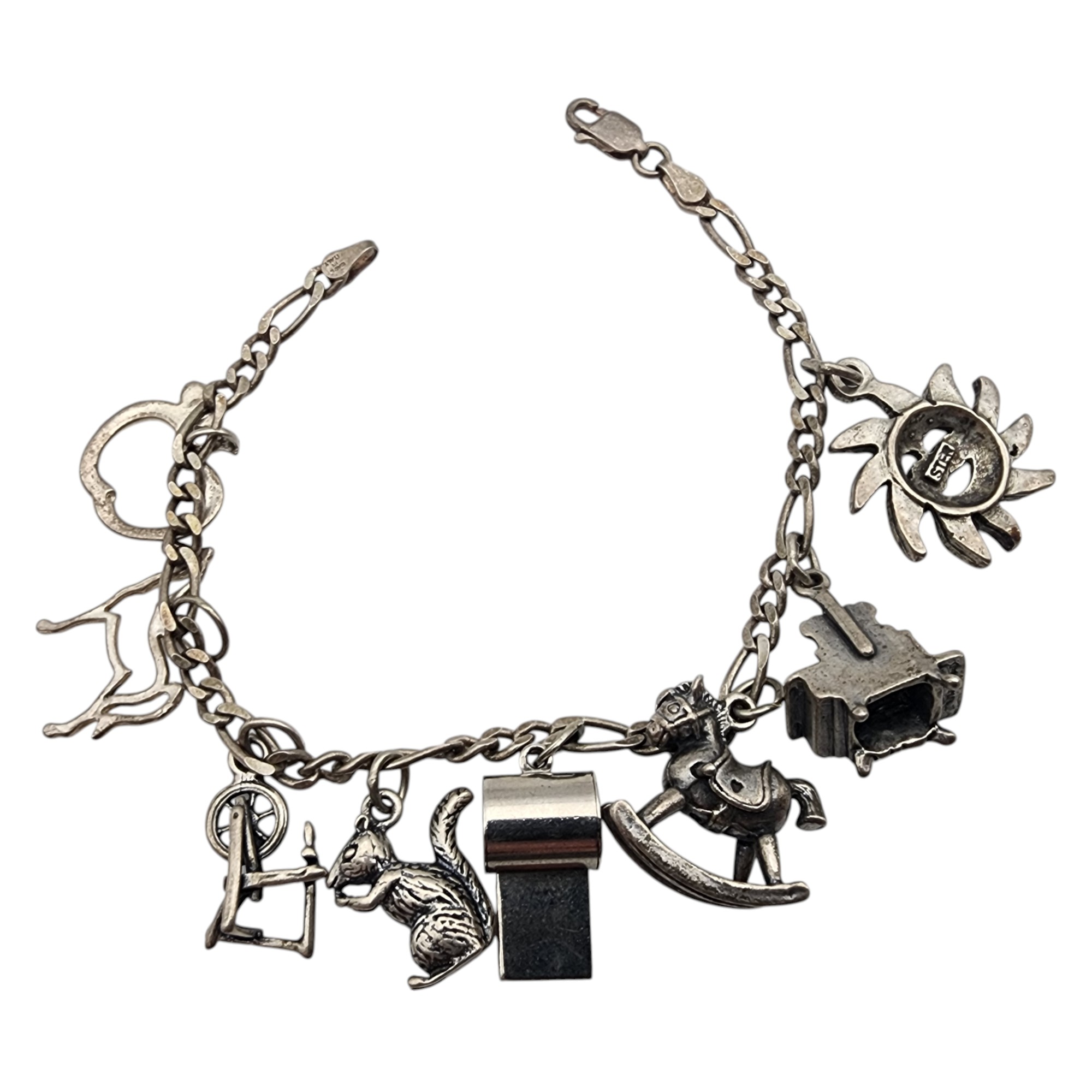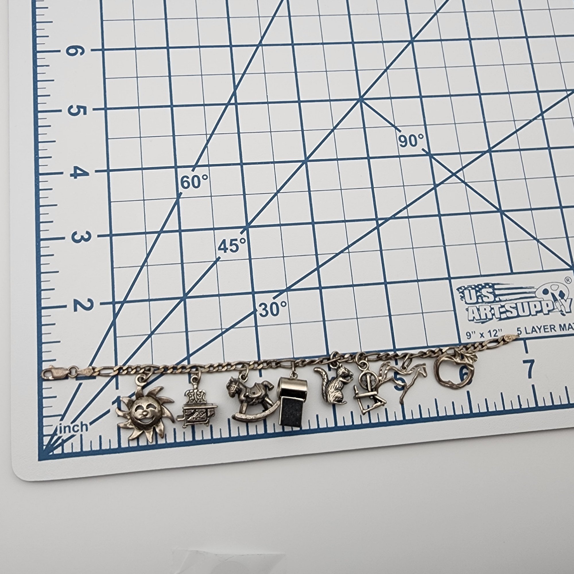 Vintage Sterling Silver Charm Bracelet, 24.6g, variety of 8 charms including a sun, rocking horse, horse, whistle, squirrel, apple, sewing machine, and more.
