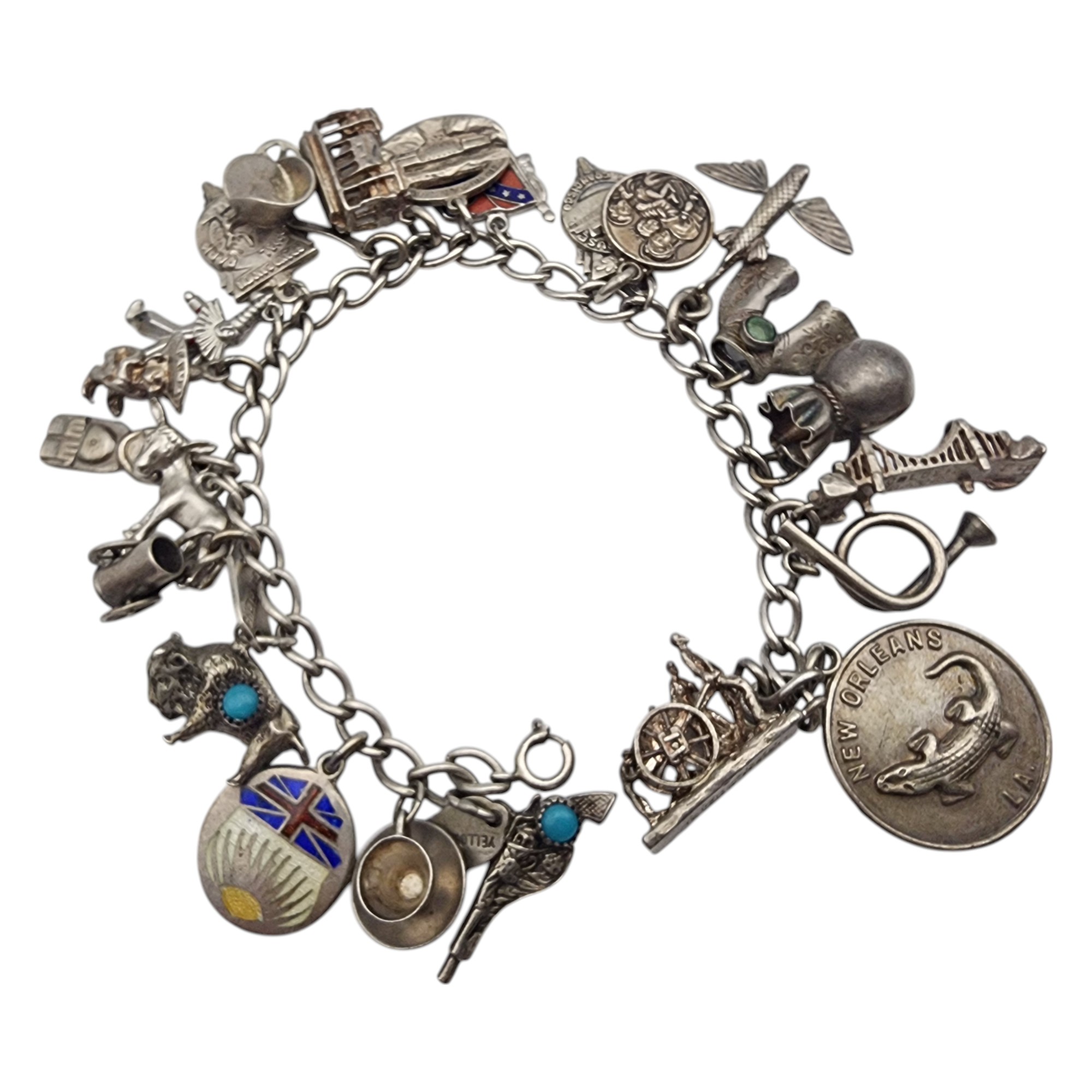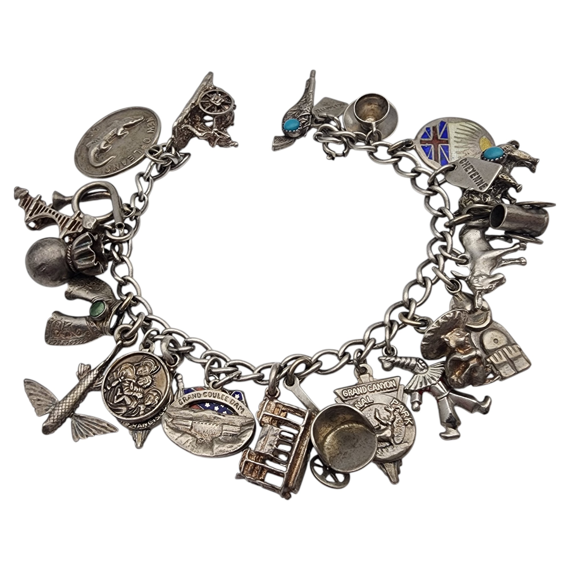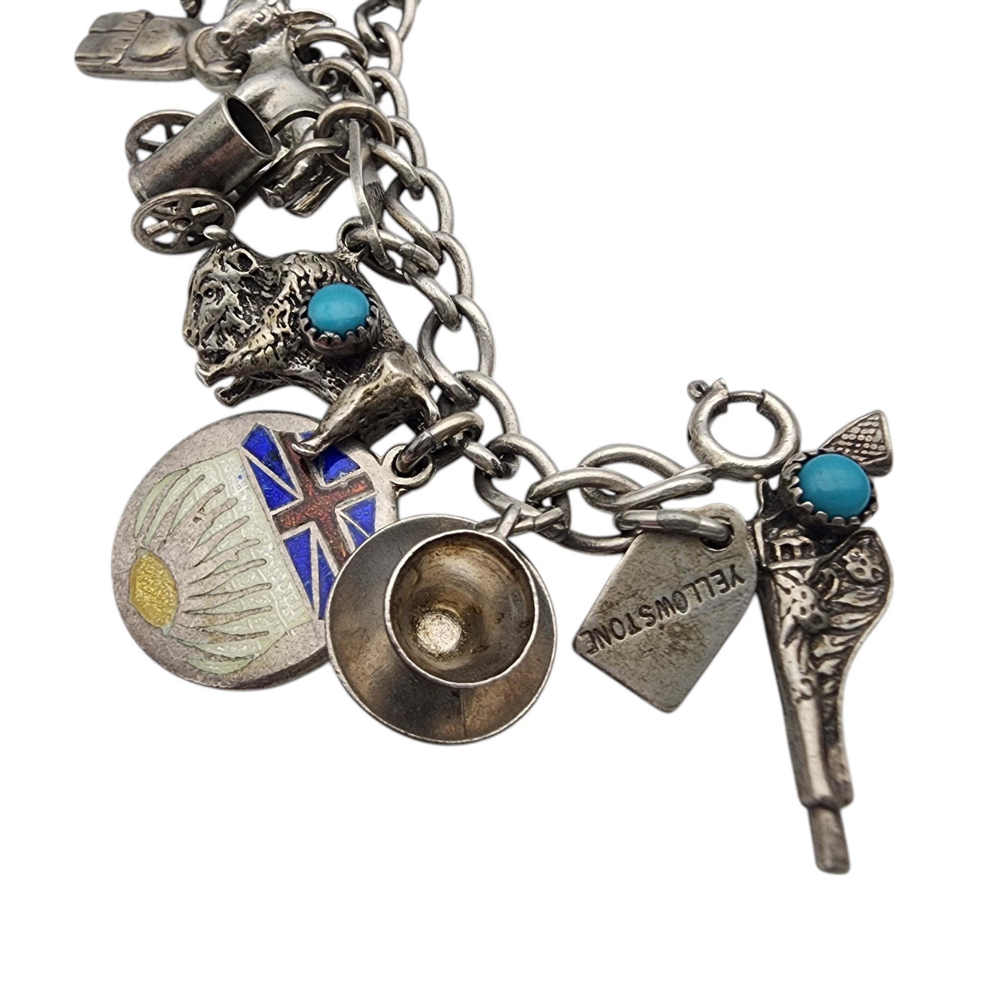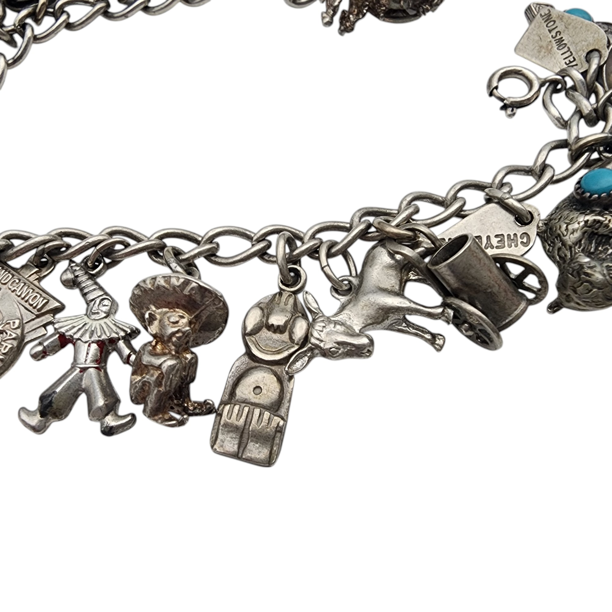 Vintage Sterling Silver Charm Bracelet, 53.8g, features a collection of unique charms, including approximately 23 charms with a variety of themes, including turquoise chaps, turquoise pistol, turquoise buffalo, Yellowstone National Park, donkey, sombrero man, golden gate bridge, fish (maybe dragonfly) with moving fins, Grand Canyon, New Orleans alligator charm, Utah charm, British Columbia charm, and more. Many of the charms are signed and/or marked sterling. One of the charms is missing a wheel, as shown in photos.
