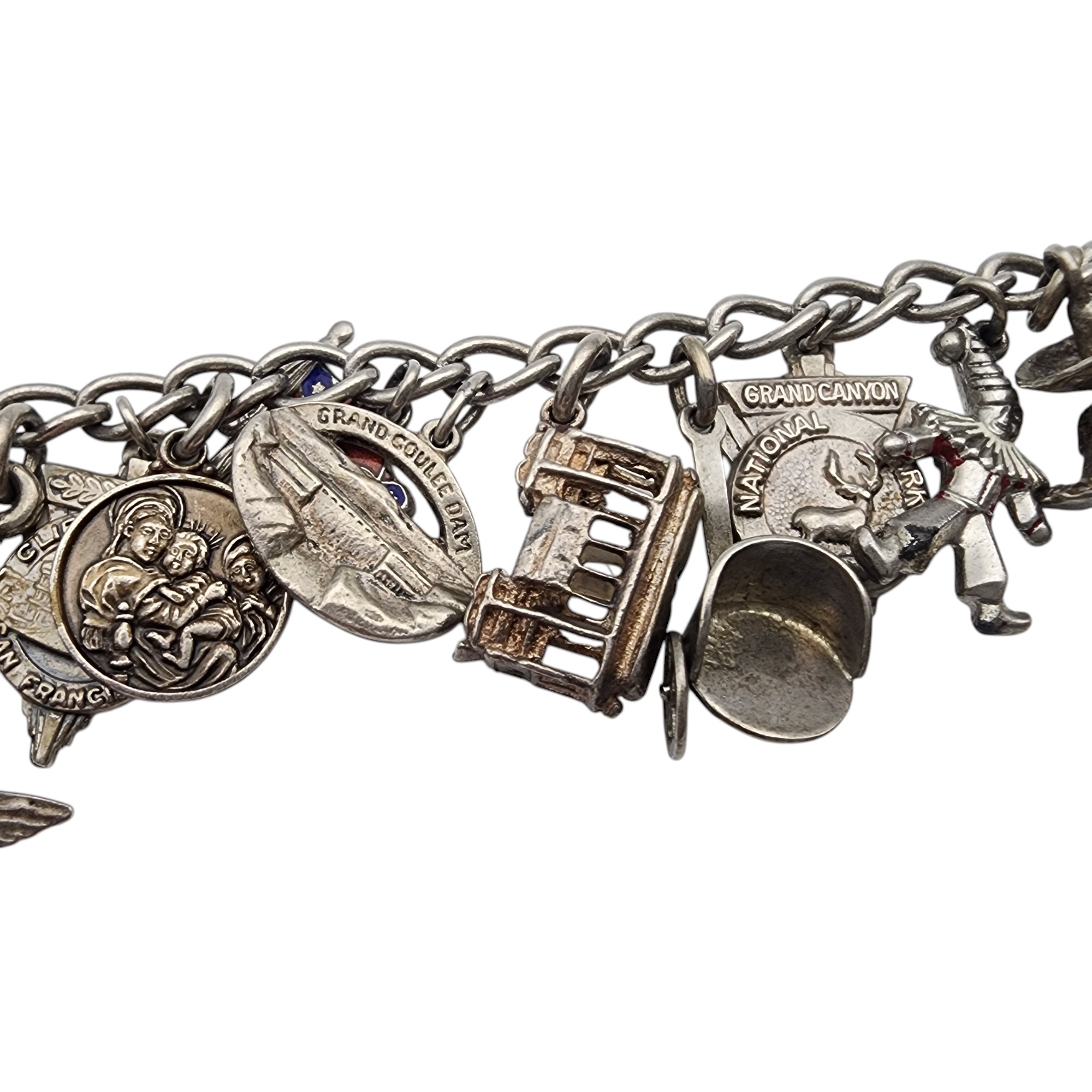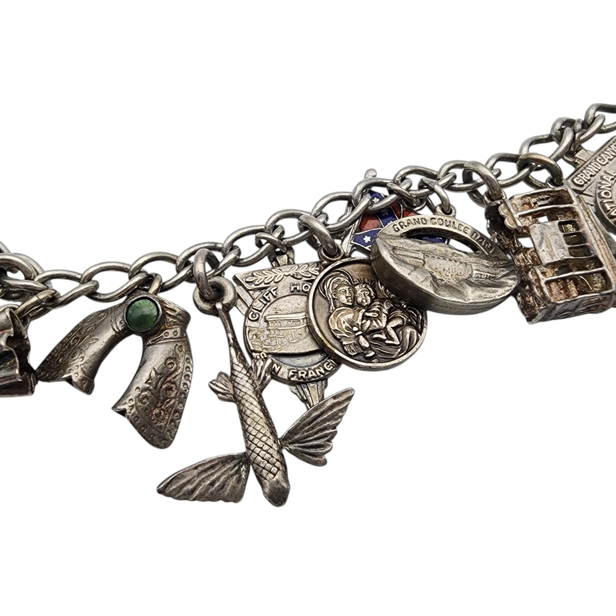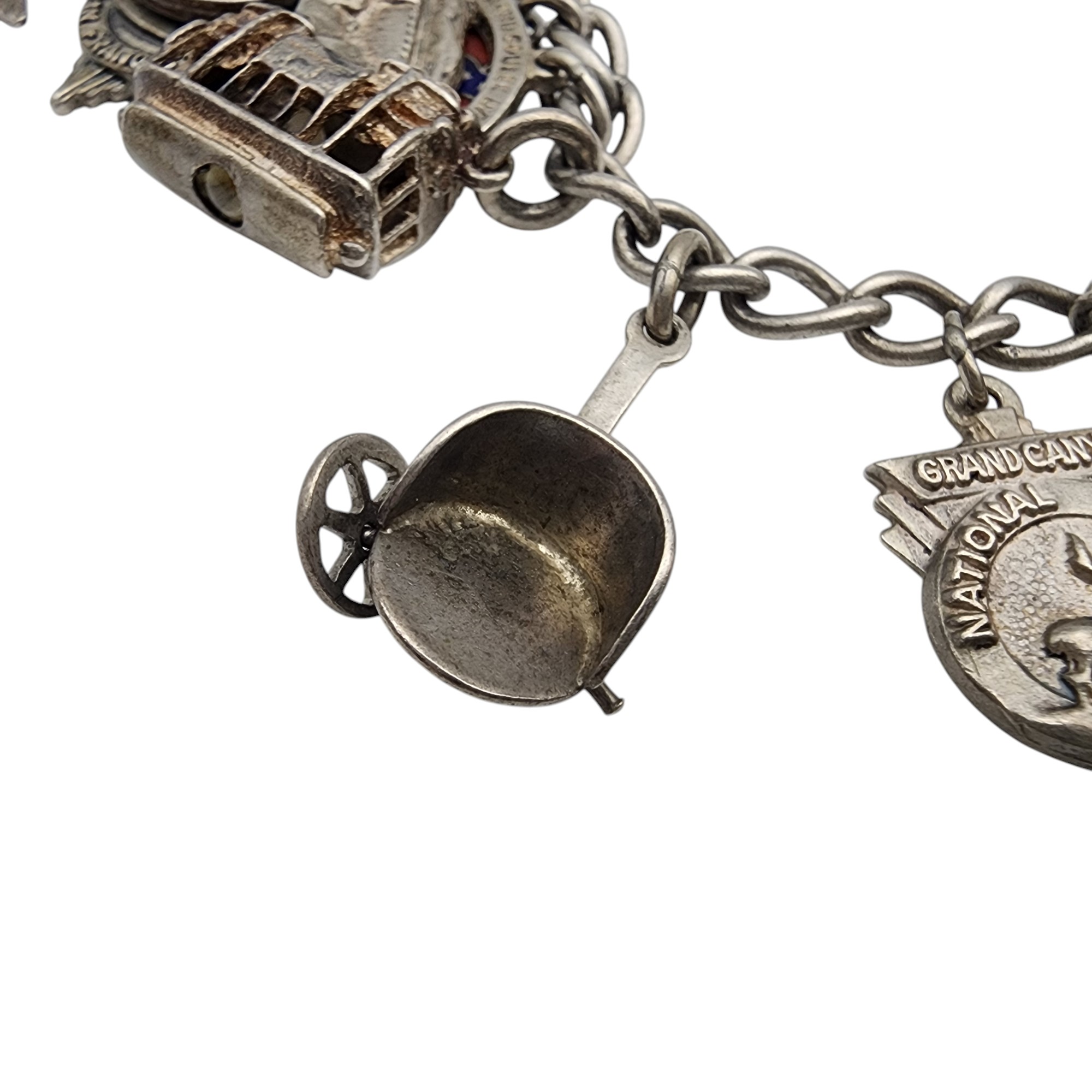 Vintage Sterling Silver Charm Bracelet, 53.8g, features a collection of unique charms, including approximately 23 charms with a variety of themes, including turquoise chaps, turquoise pistol, turquoise buffalo, Yellowstone National Park, donkey, sombrero man, golden gate bridge, fish (maybe dragonfly) with moving fins, Grand Canyon, New Orleans alligator charm, Utah charm, British Columbia charm, and more. Many of the charms are signed and/or marked sterling. One of the charms is missing a wheel, as shown in photos.