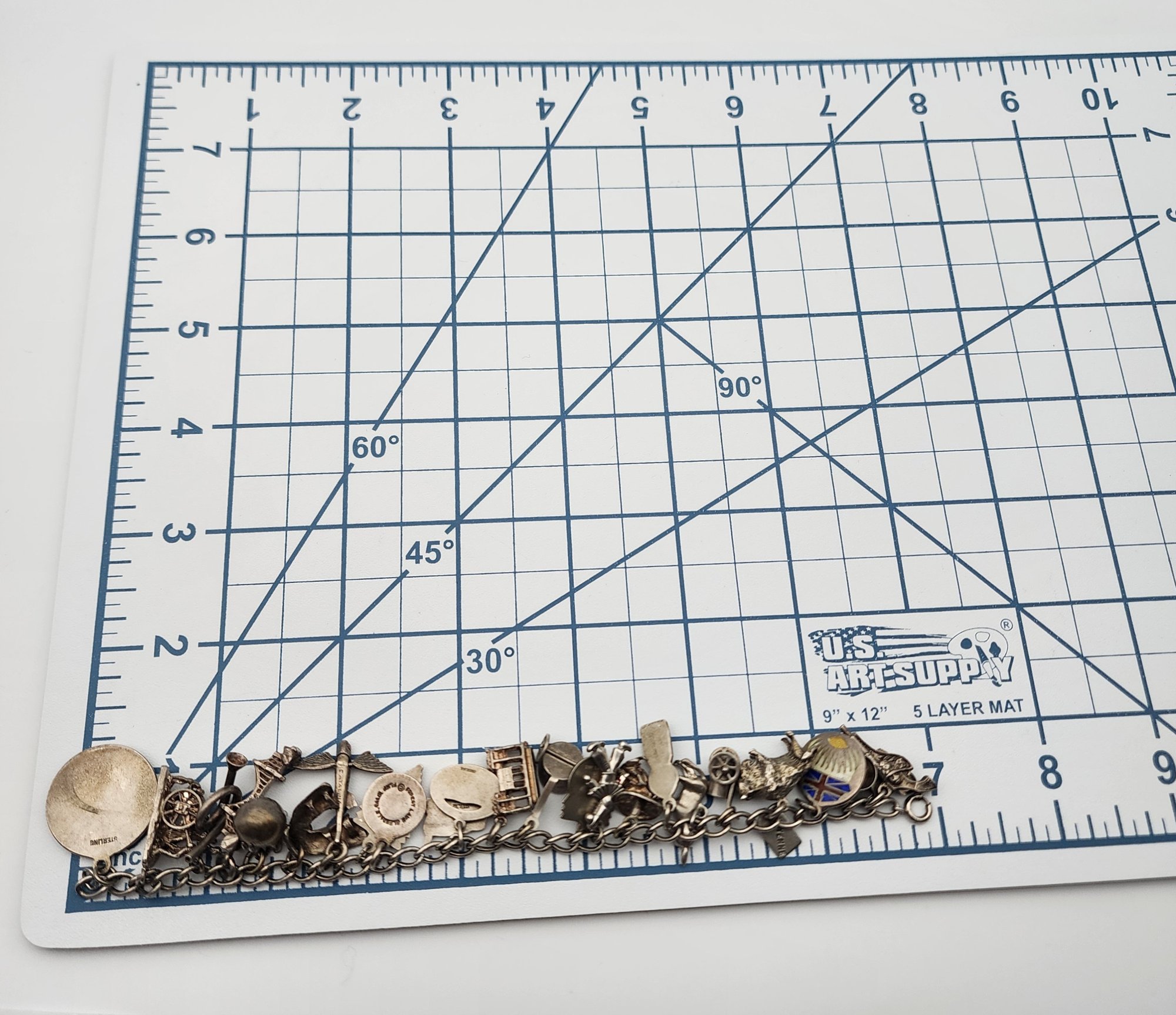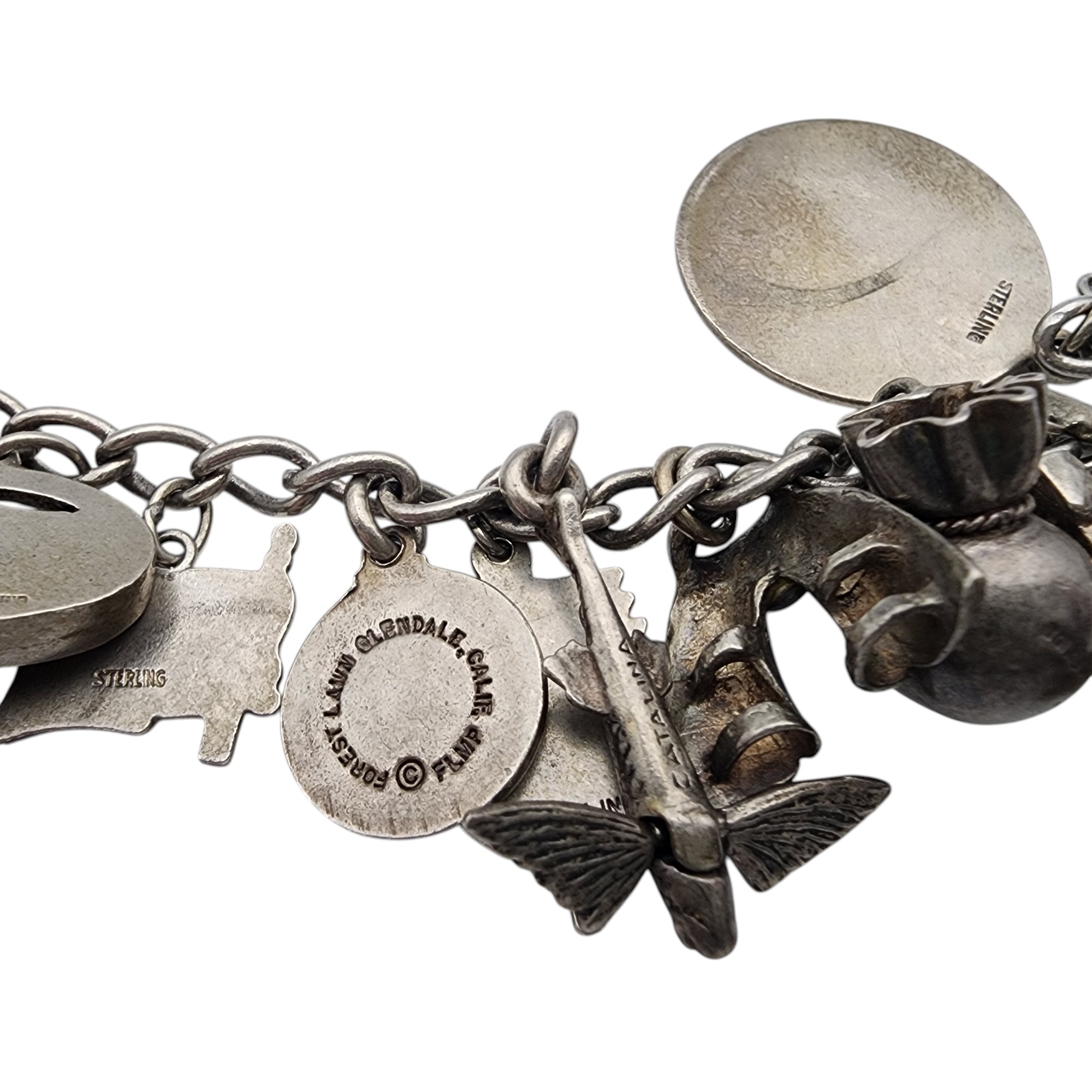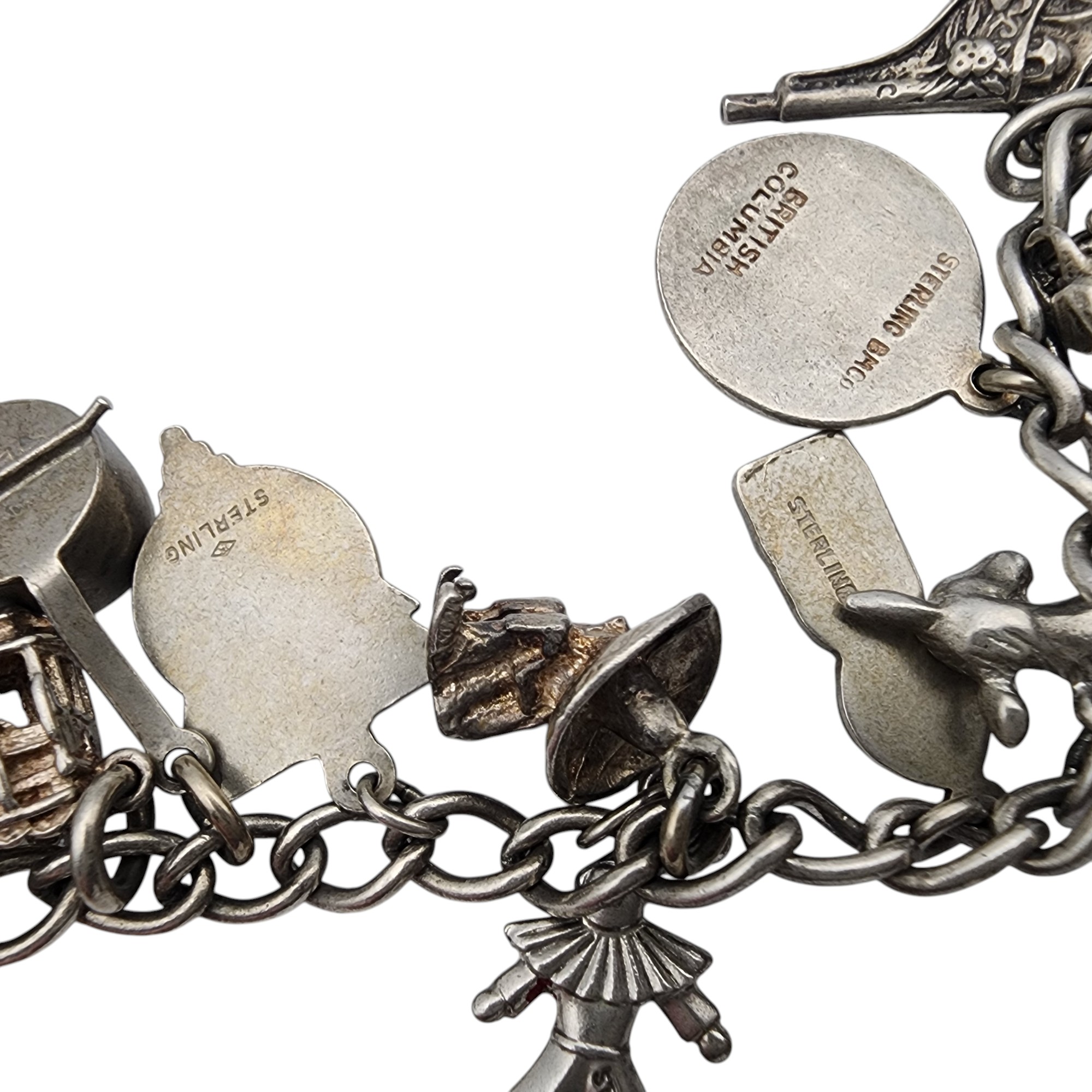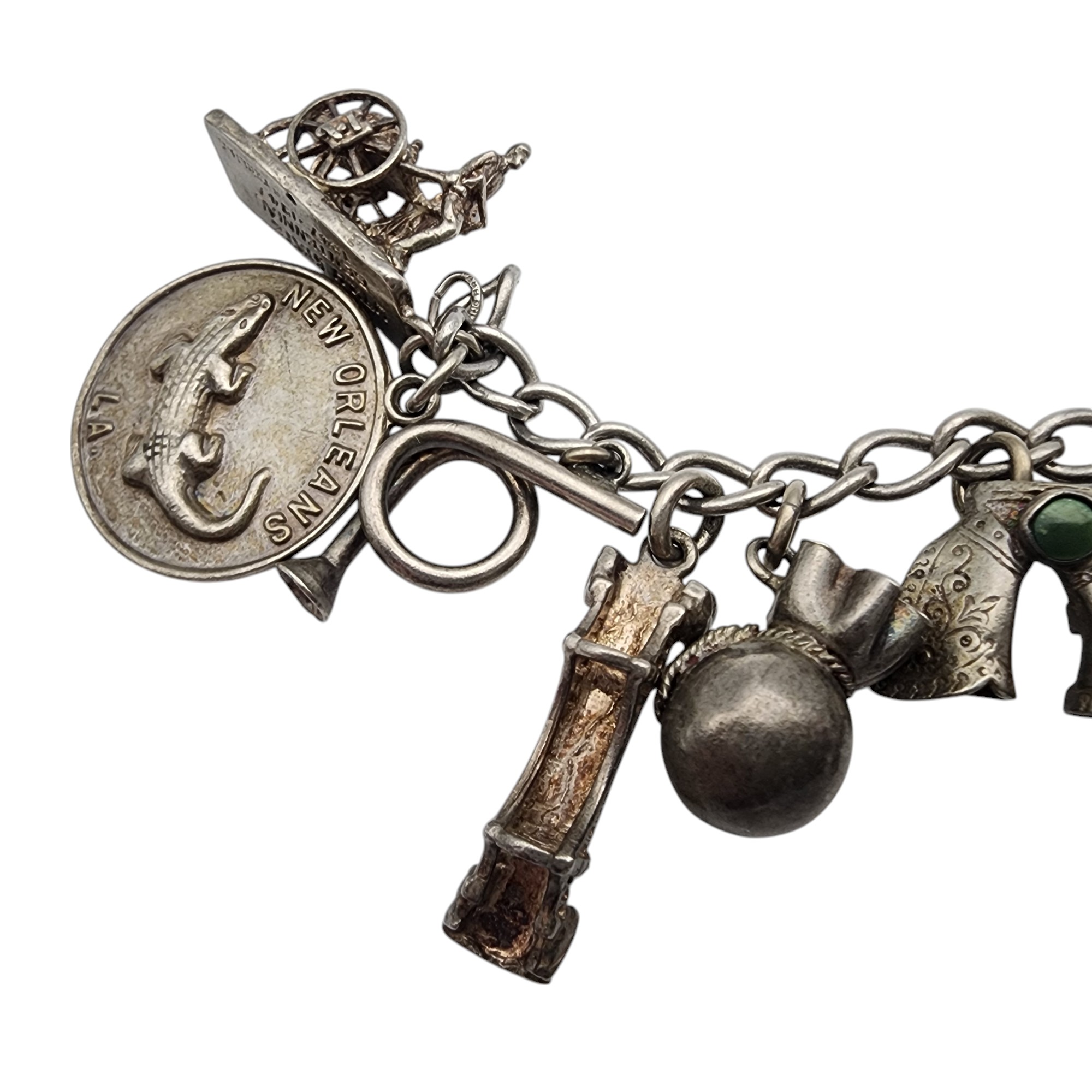 Vintage Sterling Silver Charm Bracelet, 53.8g, features a collection of unique charms, including approximately 23 charms with a variety of themes, including turquoise chaps, turquoise pistol, turquoise buffalo, Yellowstone National Park, donkey, sombrero man, golden gate bridge, fish (maybe dragonfly) with moving fins, Grand Canyon, New Orleans alligator charm, Utah charm, British Columbia charm, and more. Many of the charms are signed and/or marked sterling. One of the charms is missing a wheel, as shown in photos.