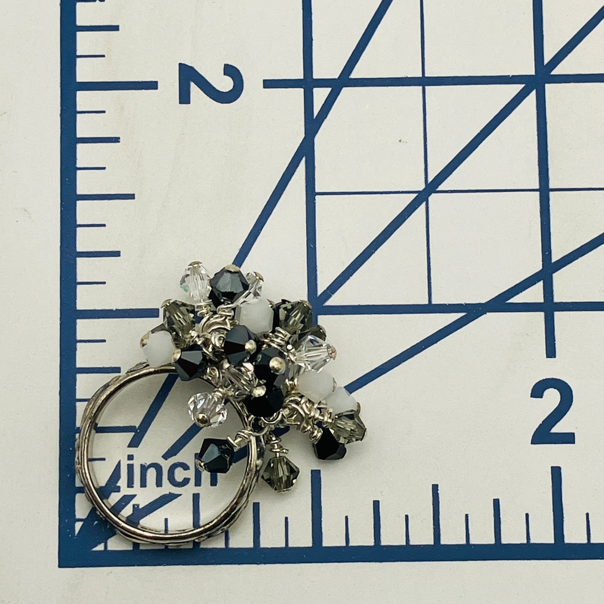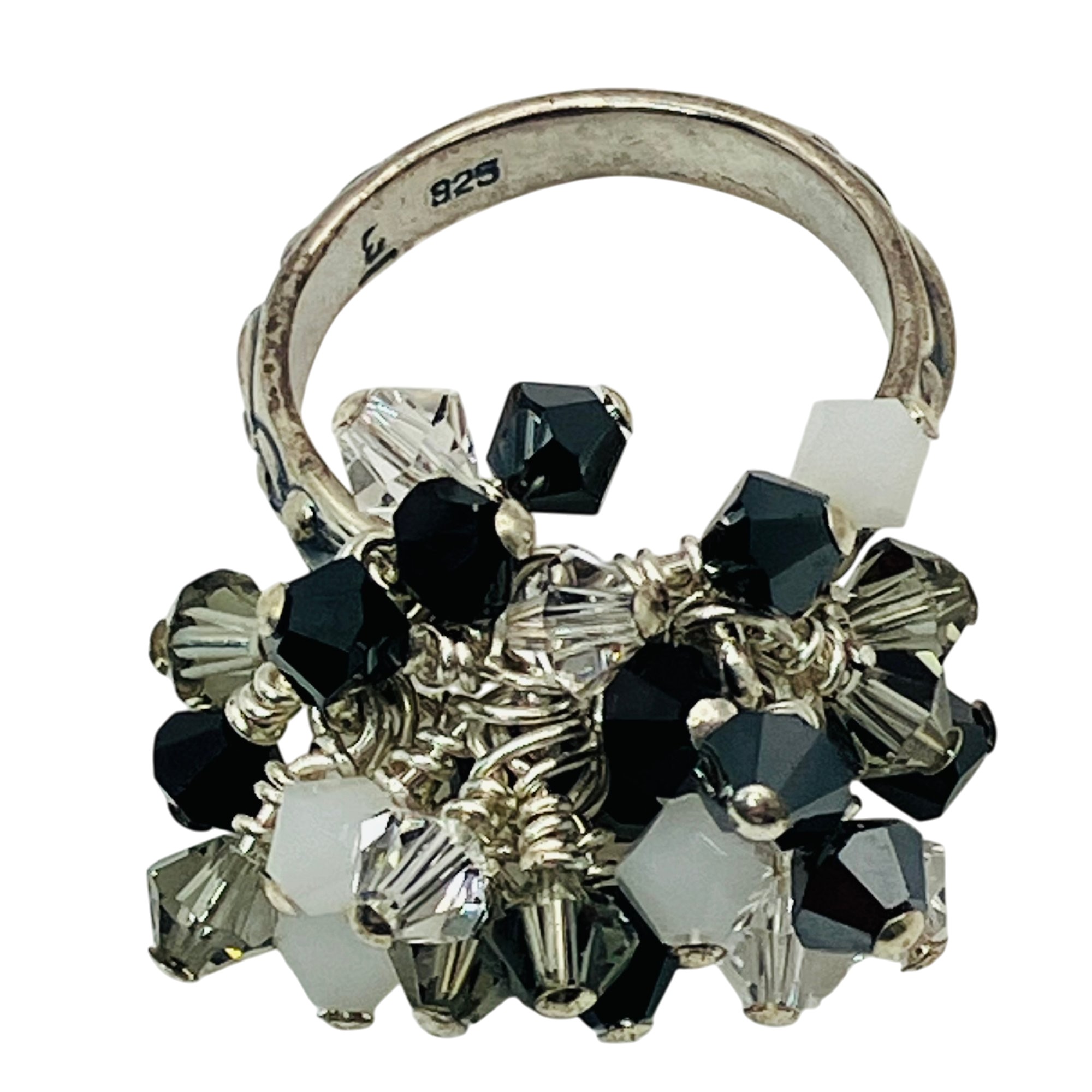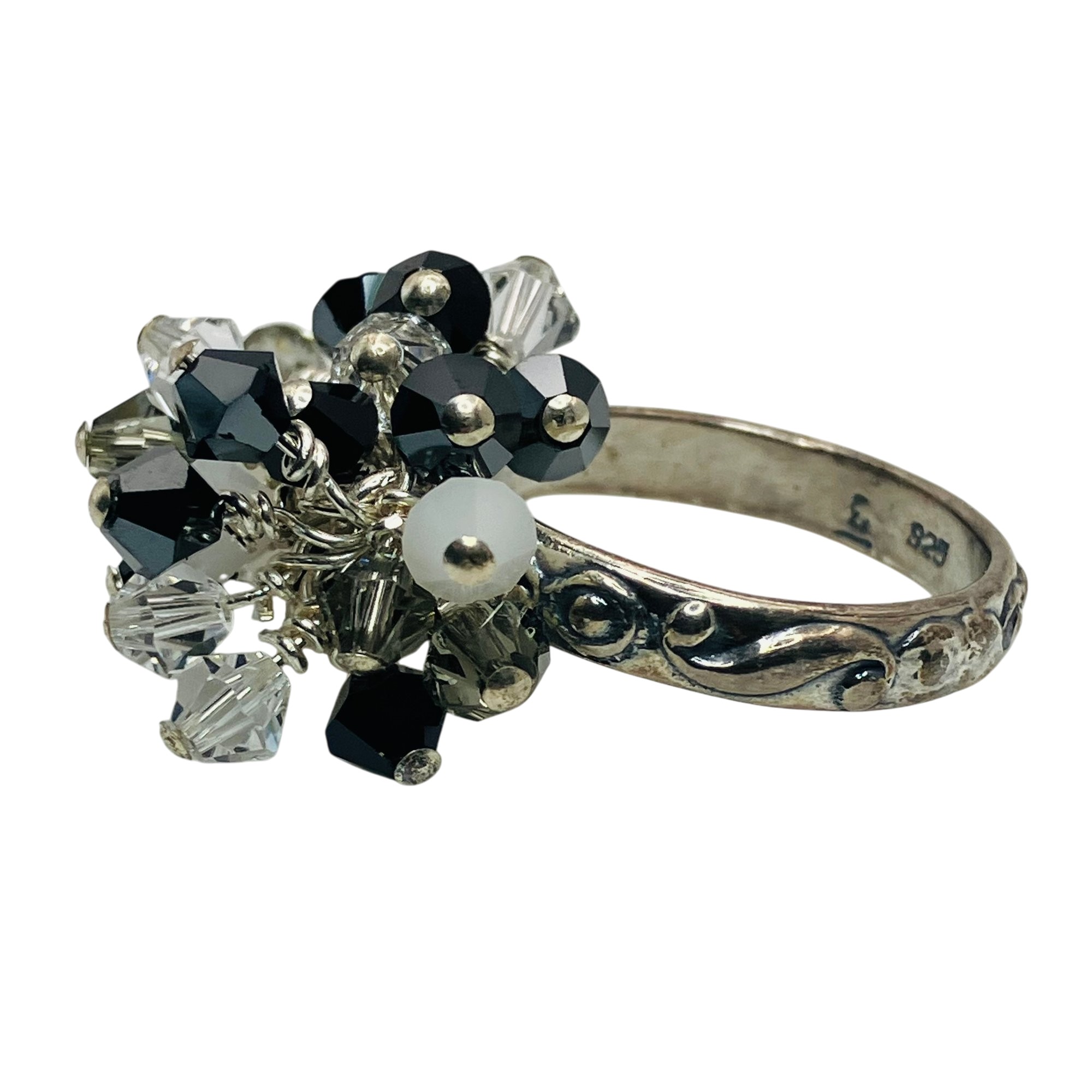 Sterling clear white and black stone dangle decorative band ring unknown marking size 6 6.27 g