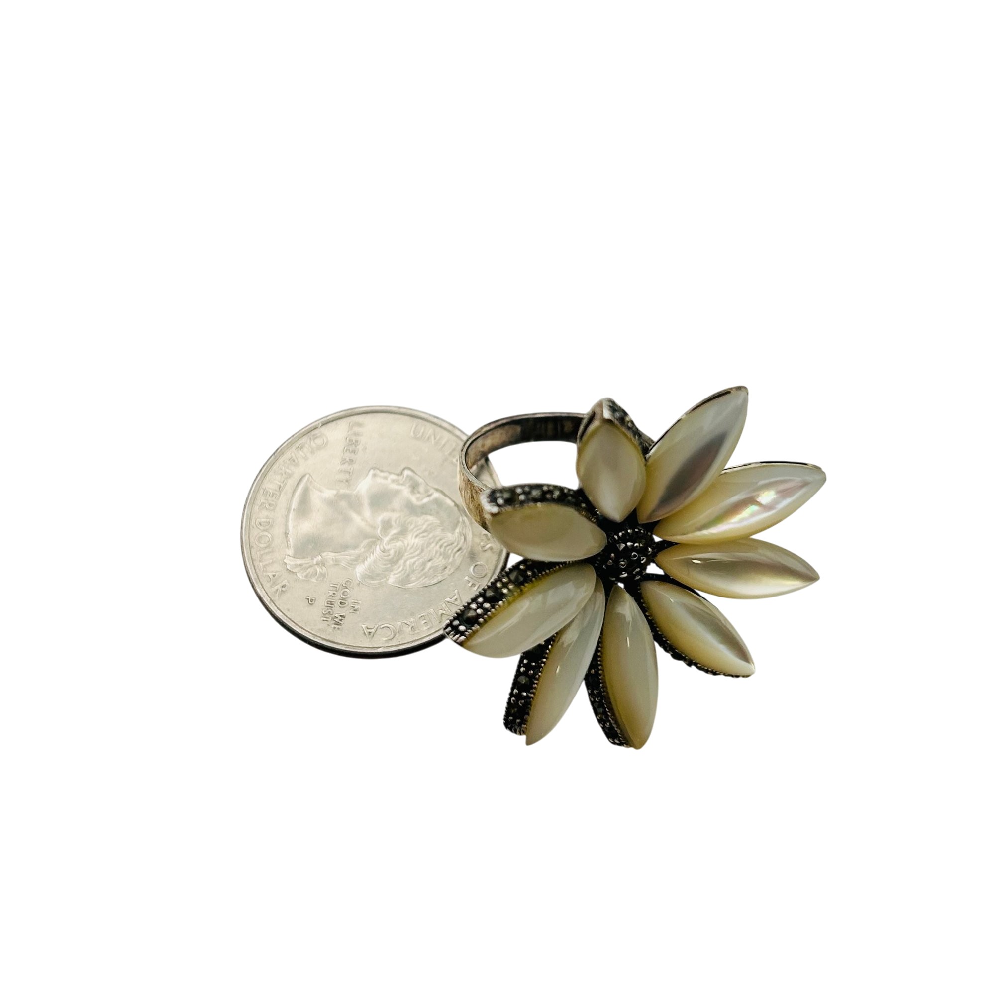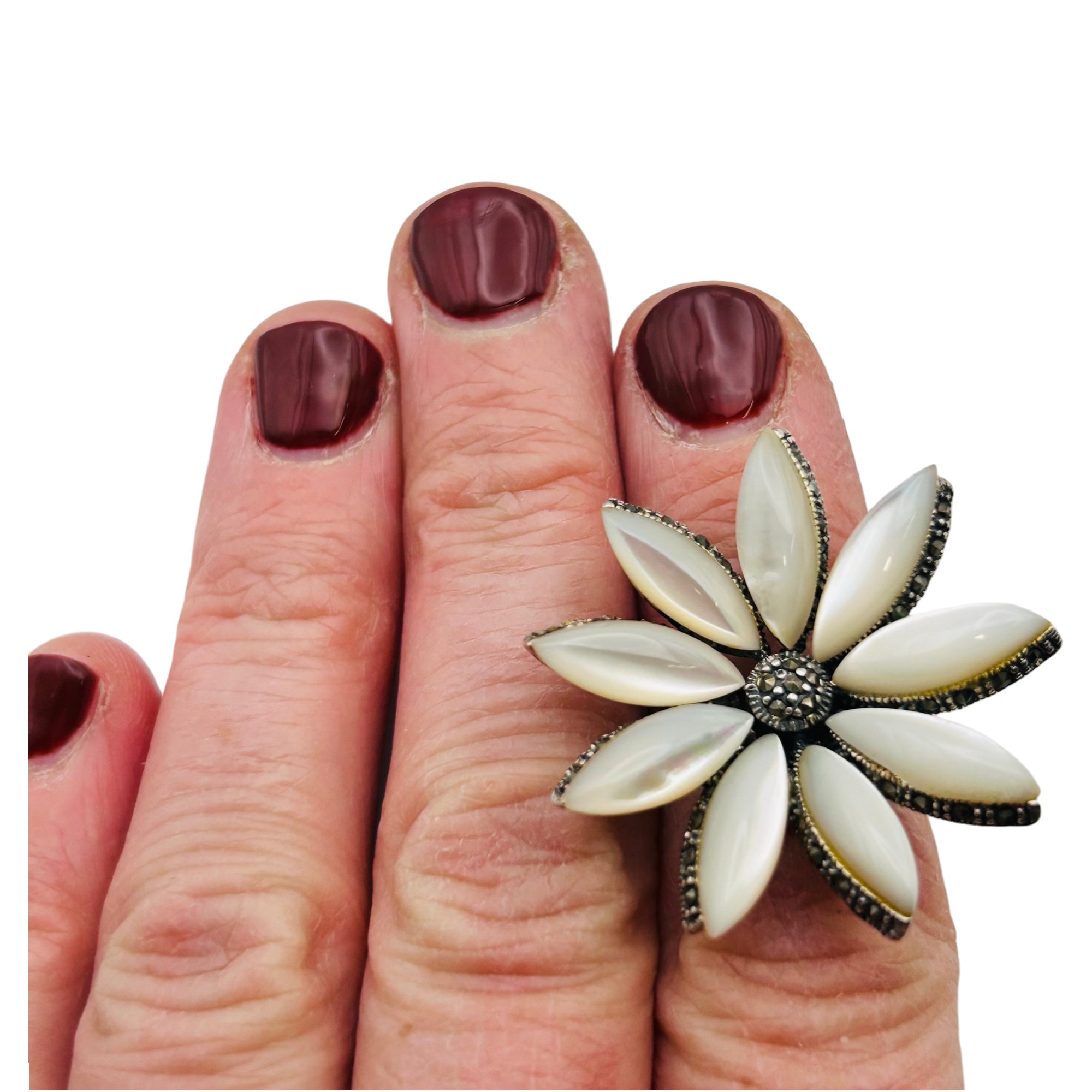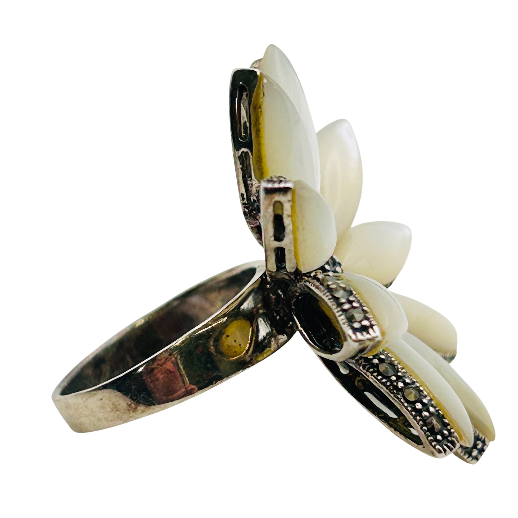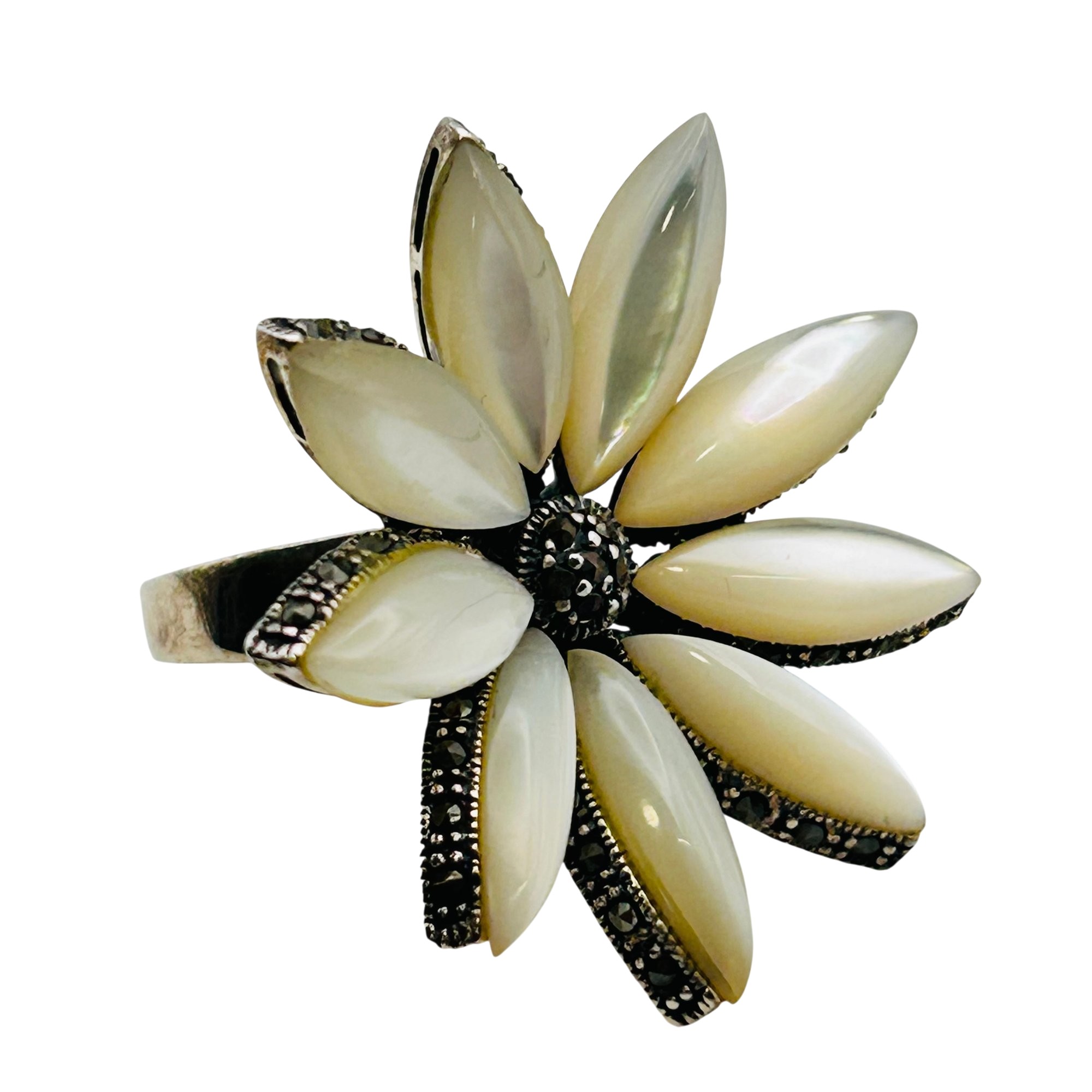 MARCASITE and mother of pearl Sterling flower statement ring size 5.5 8.98 g