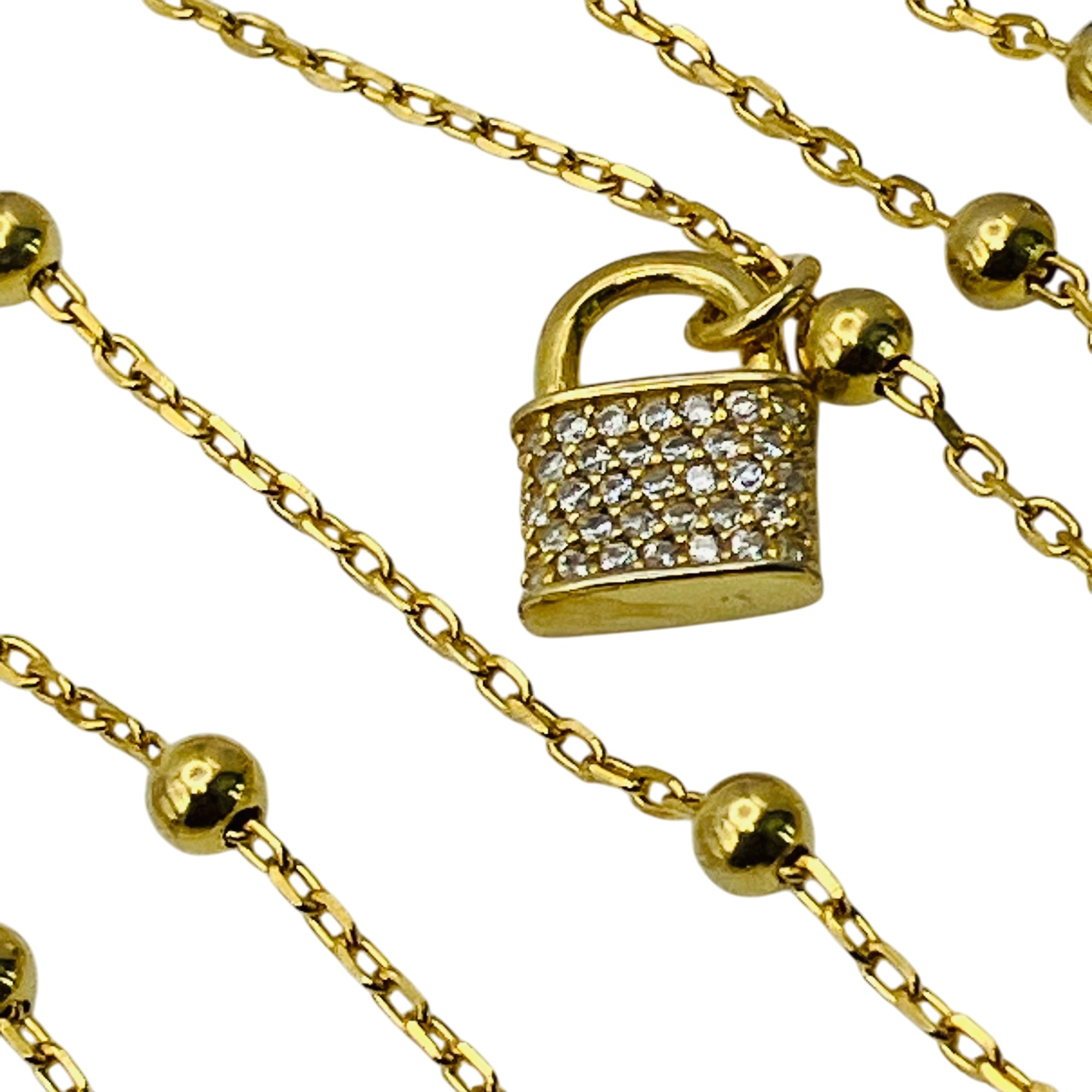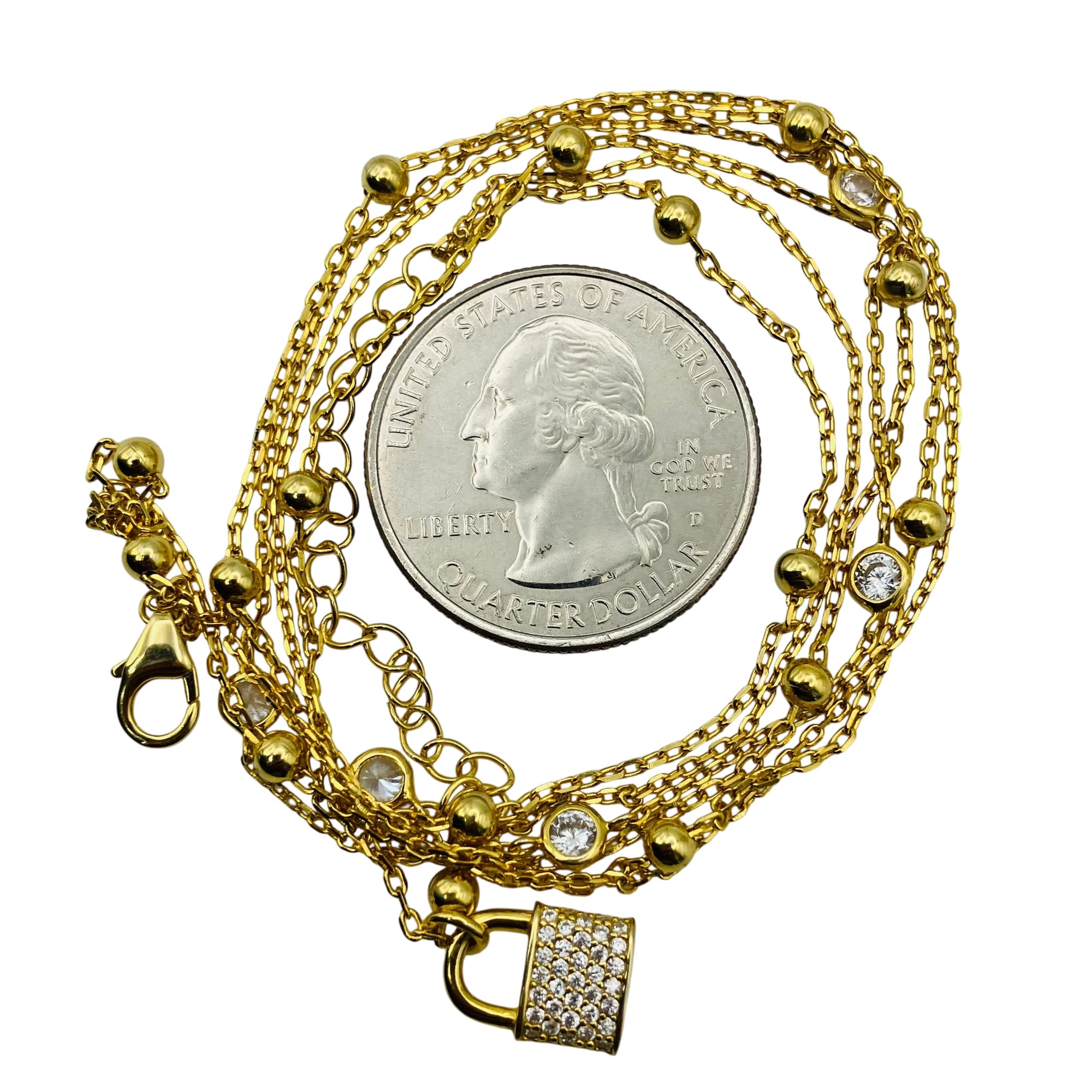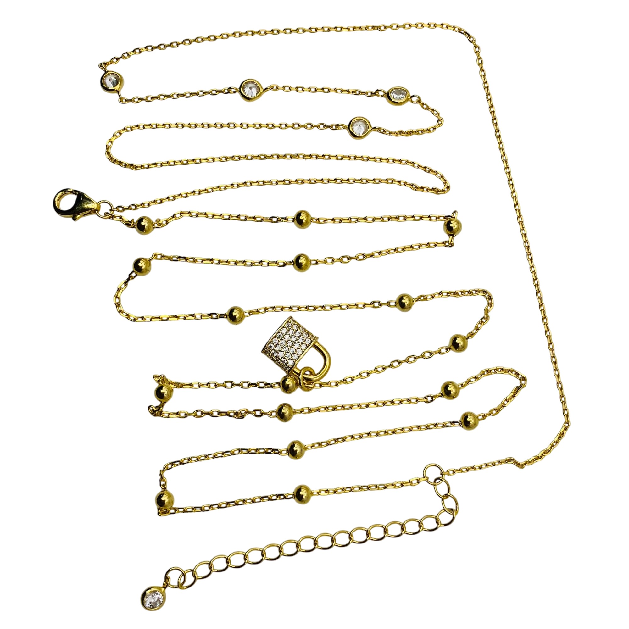 Sterling clear stone lock pendant on Bezel set beaded layered cable chain necklace 5.24 g