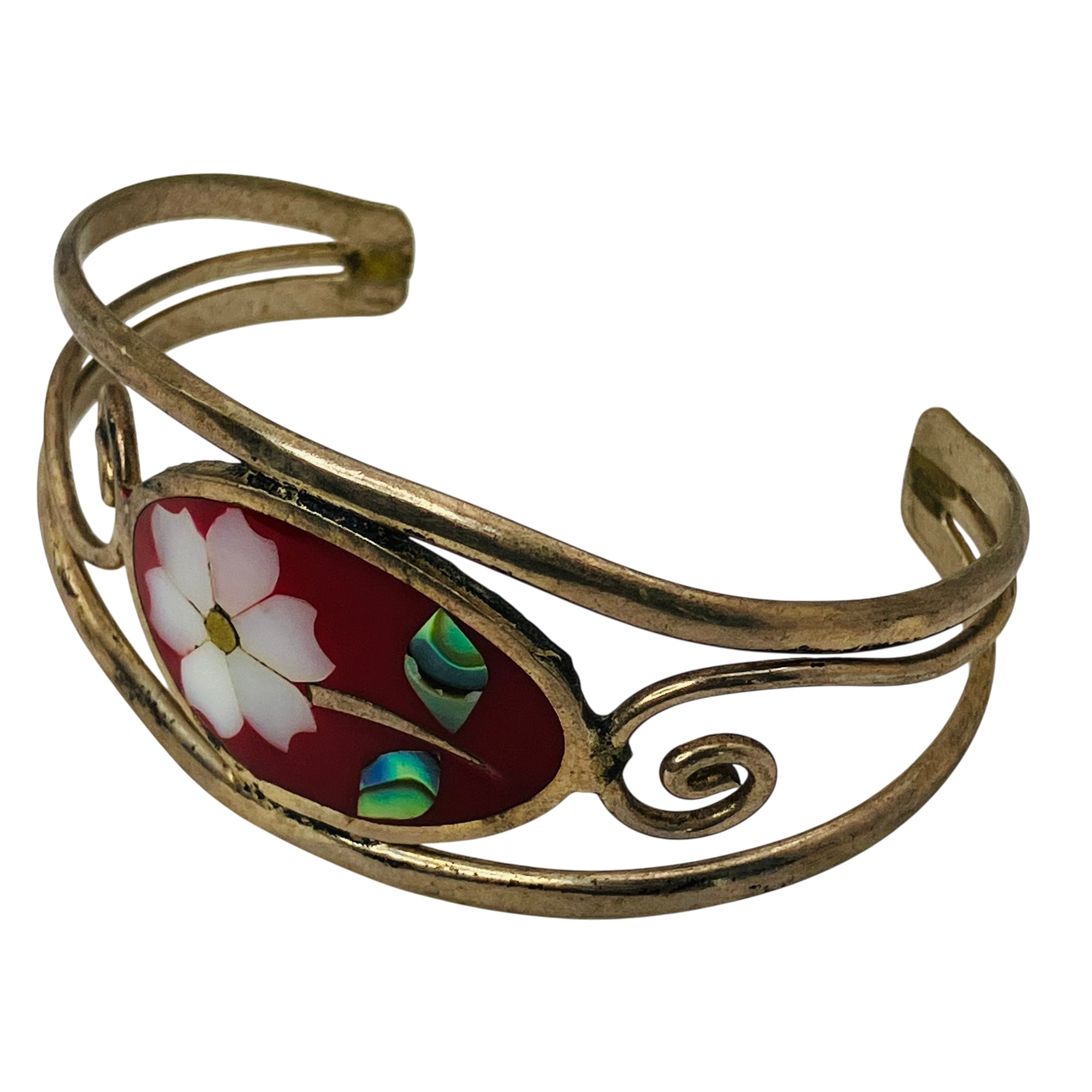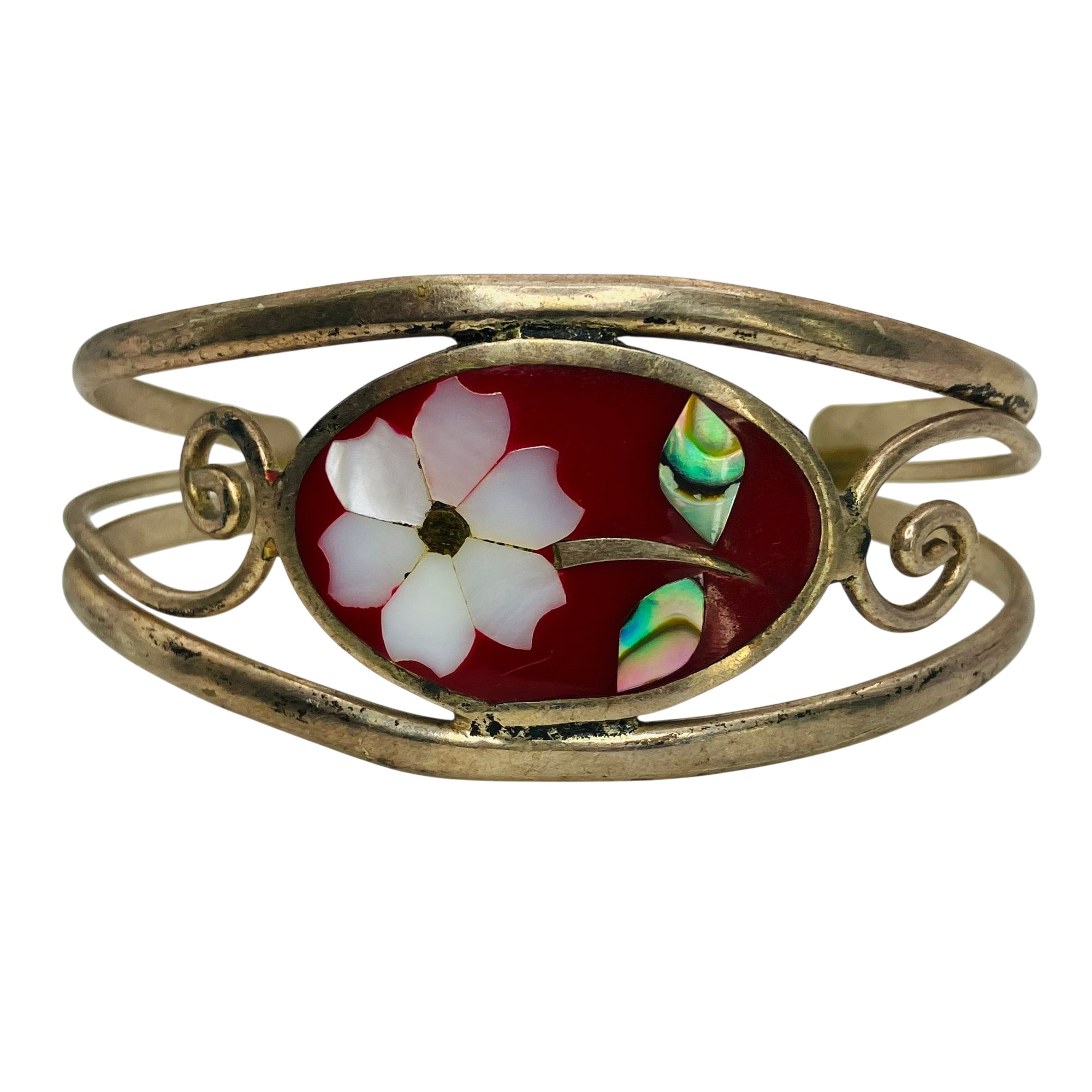 ALPACA MEXICO MOTHER OF PEARL ABALONE flower with stem inlay silver cuff bracelet 15.54 g