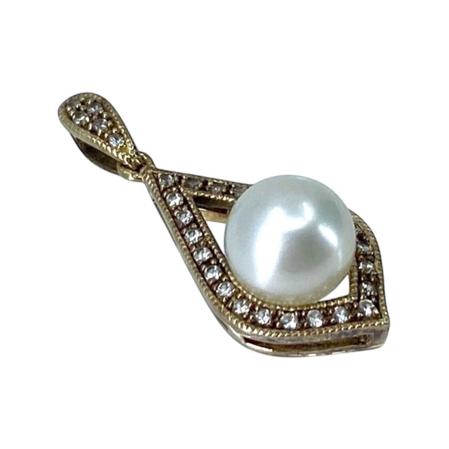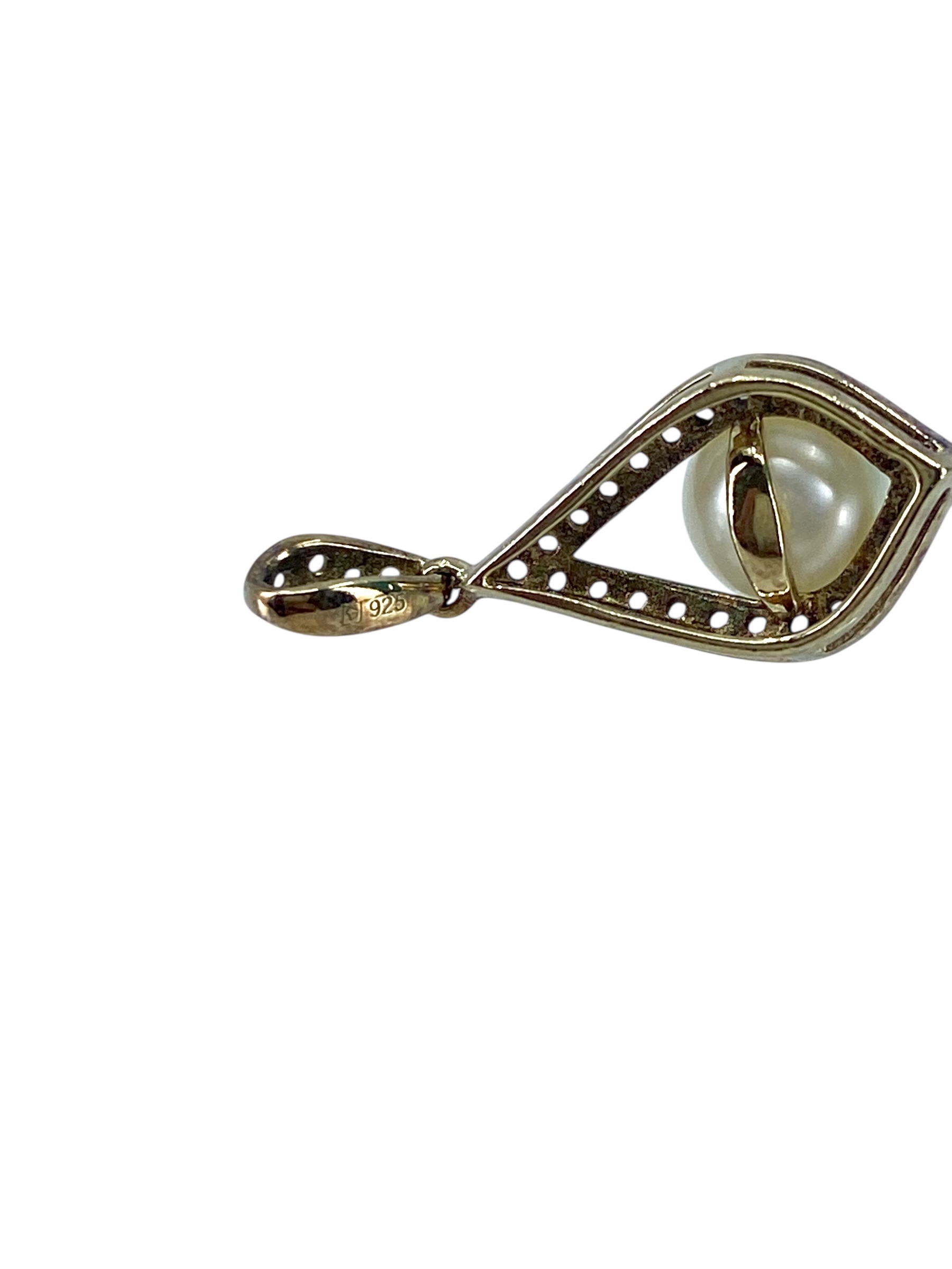 Beautiful Gold Over Sterling Silver Signed Teardrop Pendant w/ Pearl & White Sapphire Stones, 1.82g, Engraved “925” + Hallmark