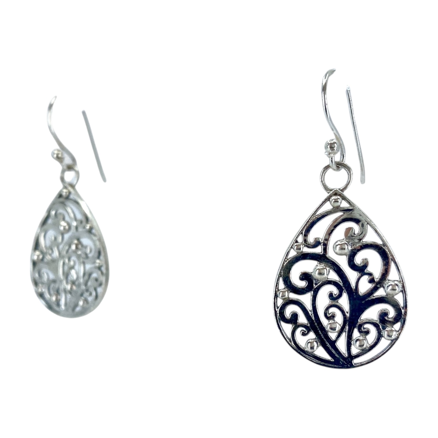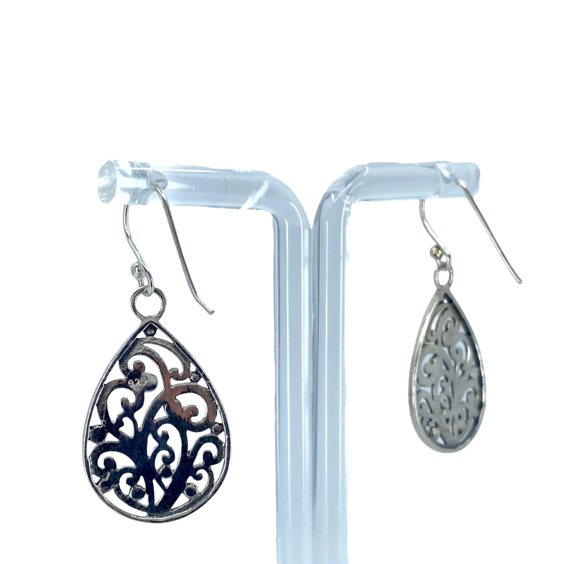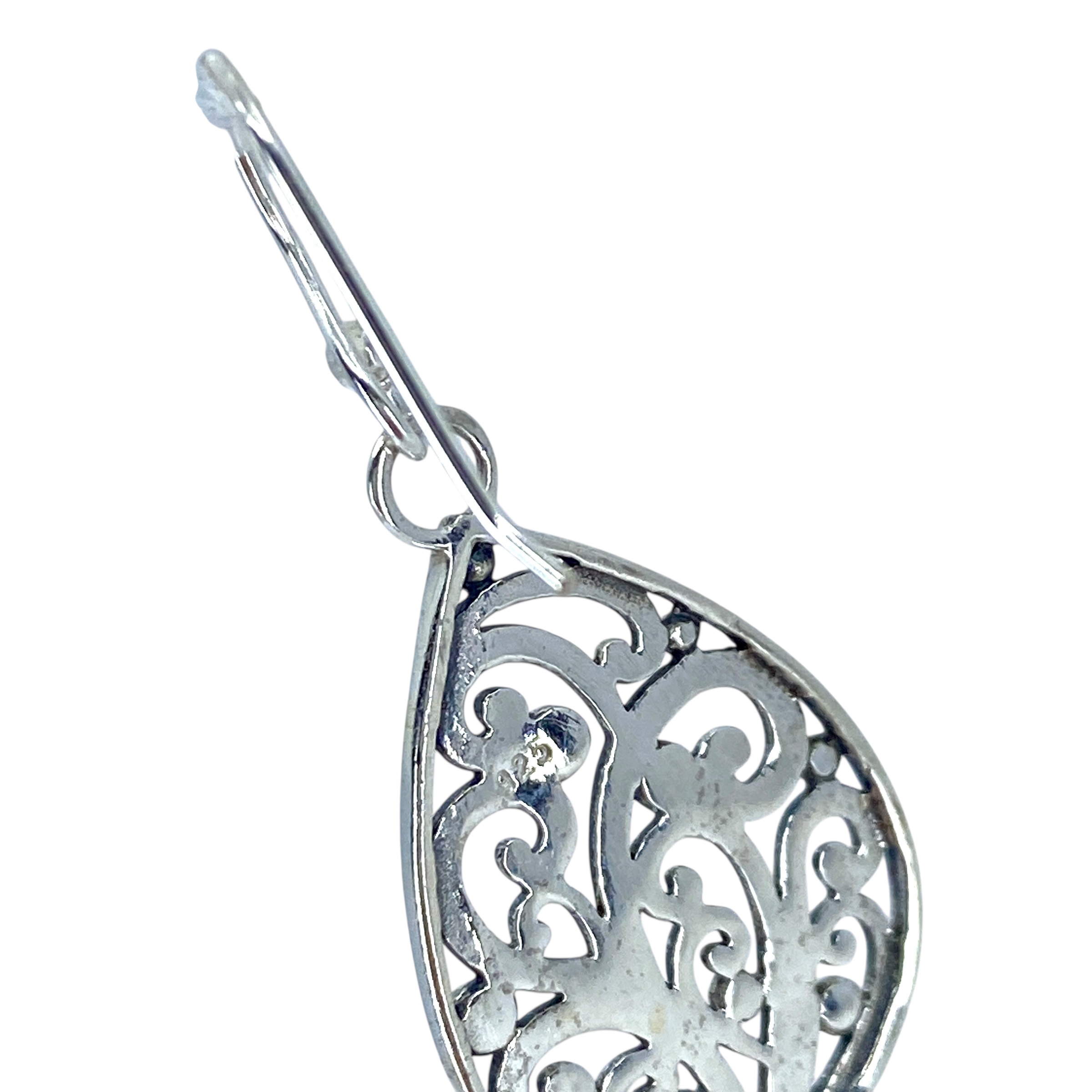 Elegant Filigree Swirl Teardrop Sterling Silver Signed Earrings, 4.48g, Engraved “925 g”