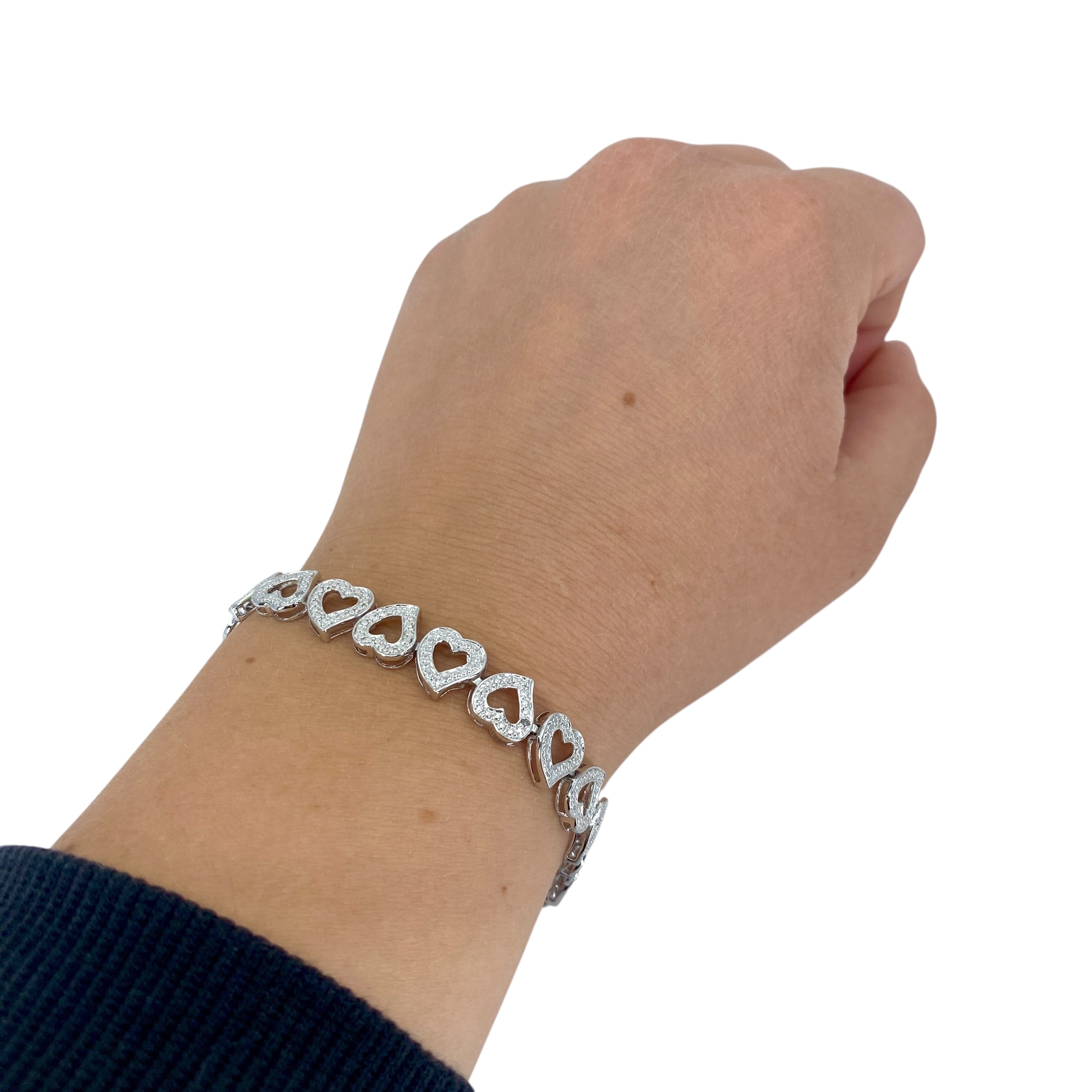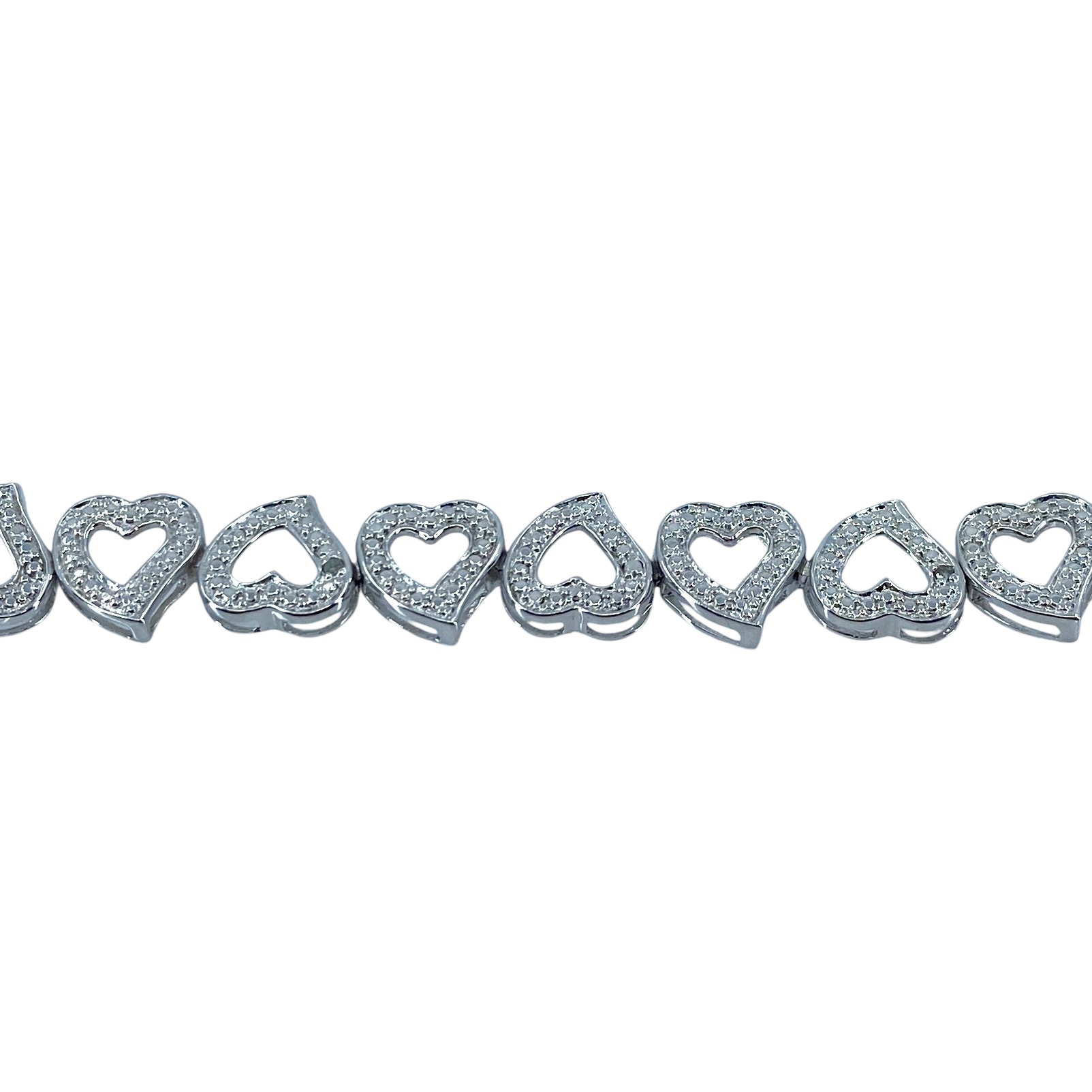 Romantic Diamond Sterling Silver Signed Heart Chain Tennis Bracelet, 7.75in, 12.1g