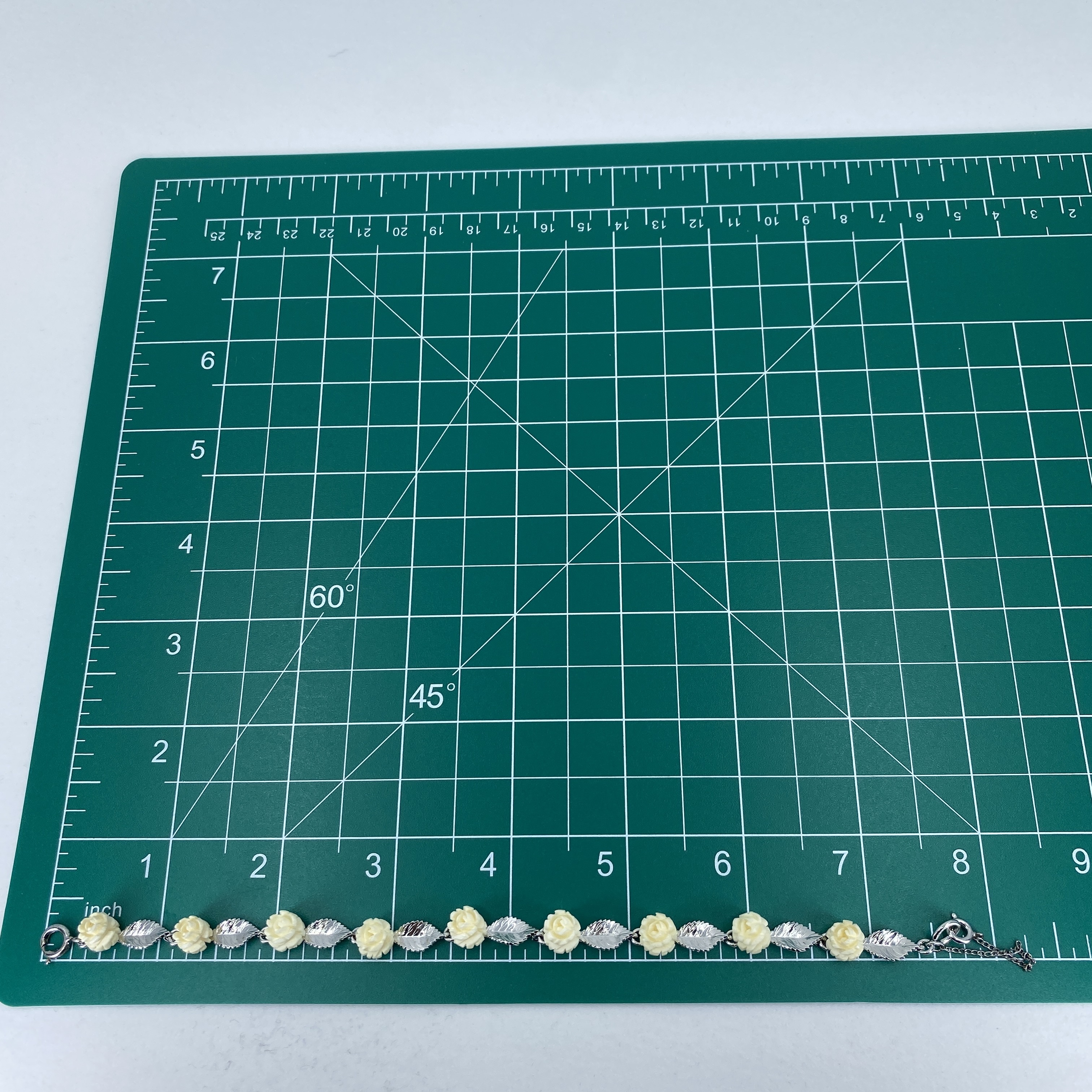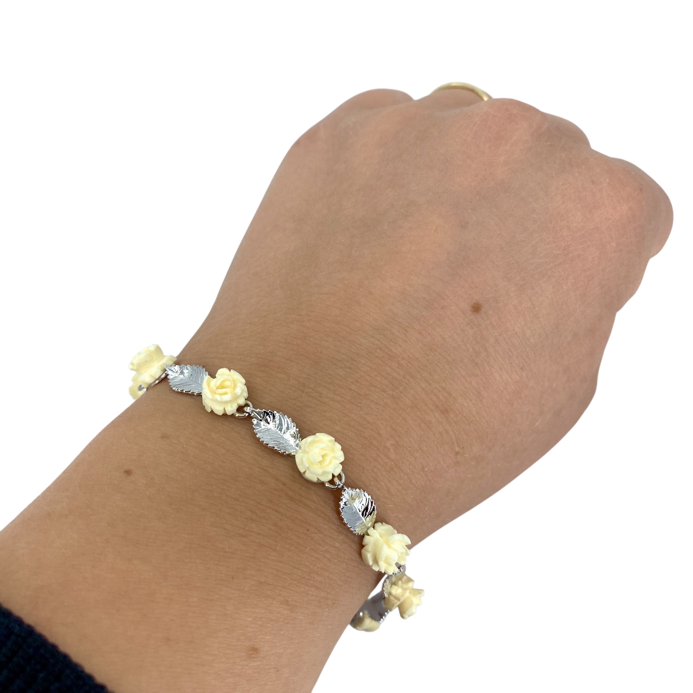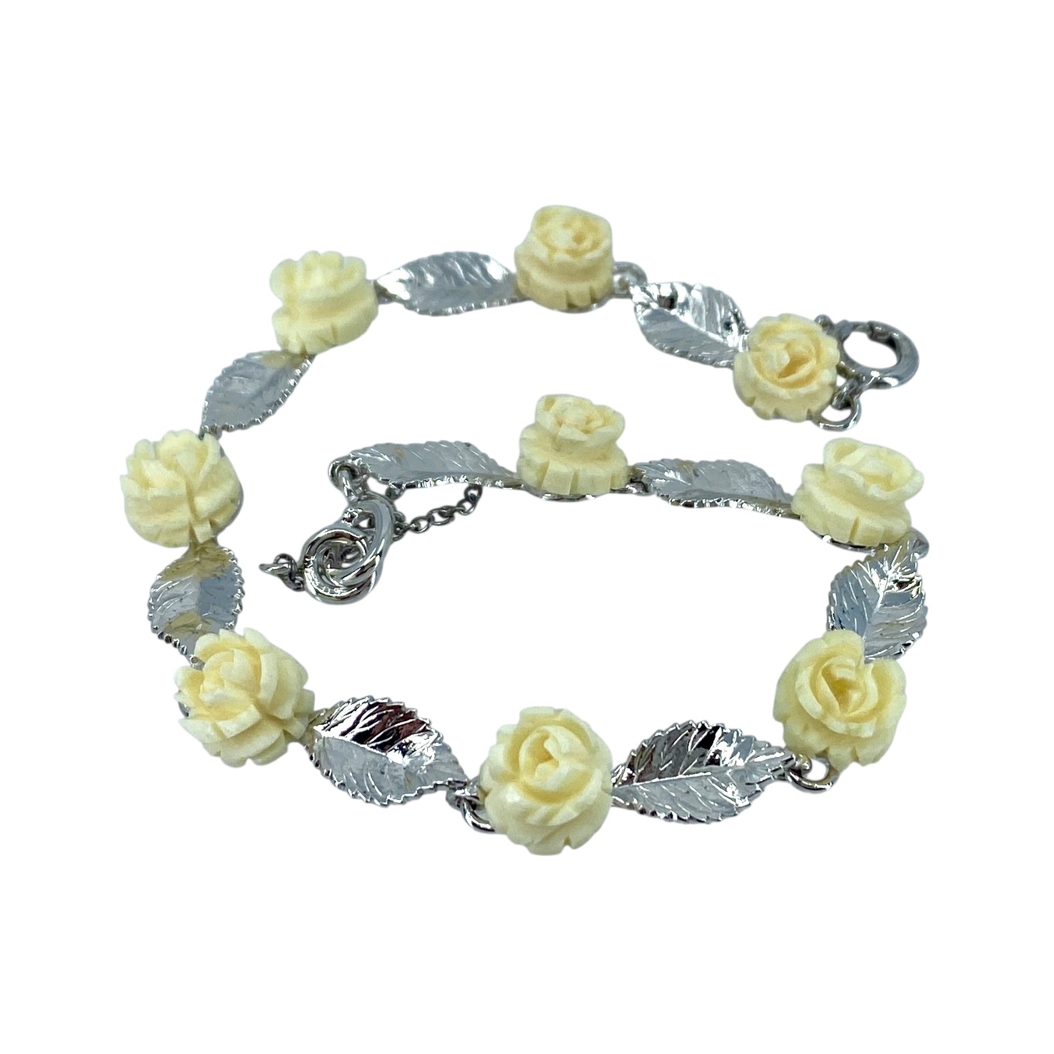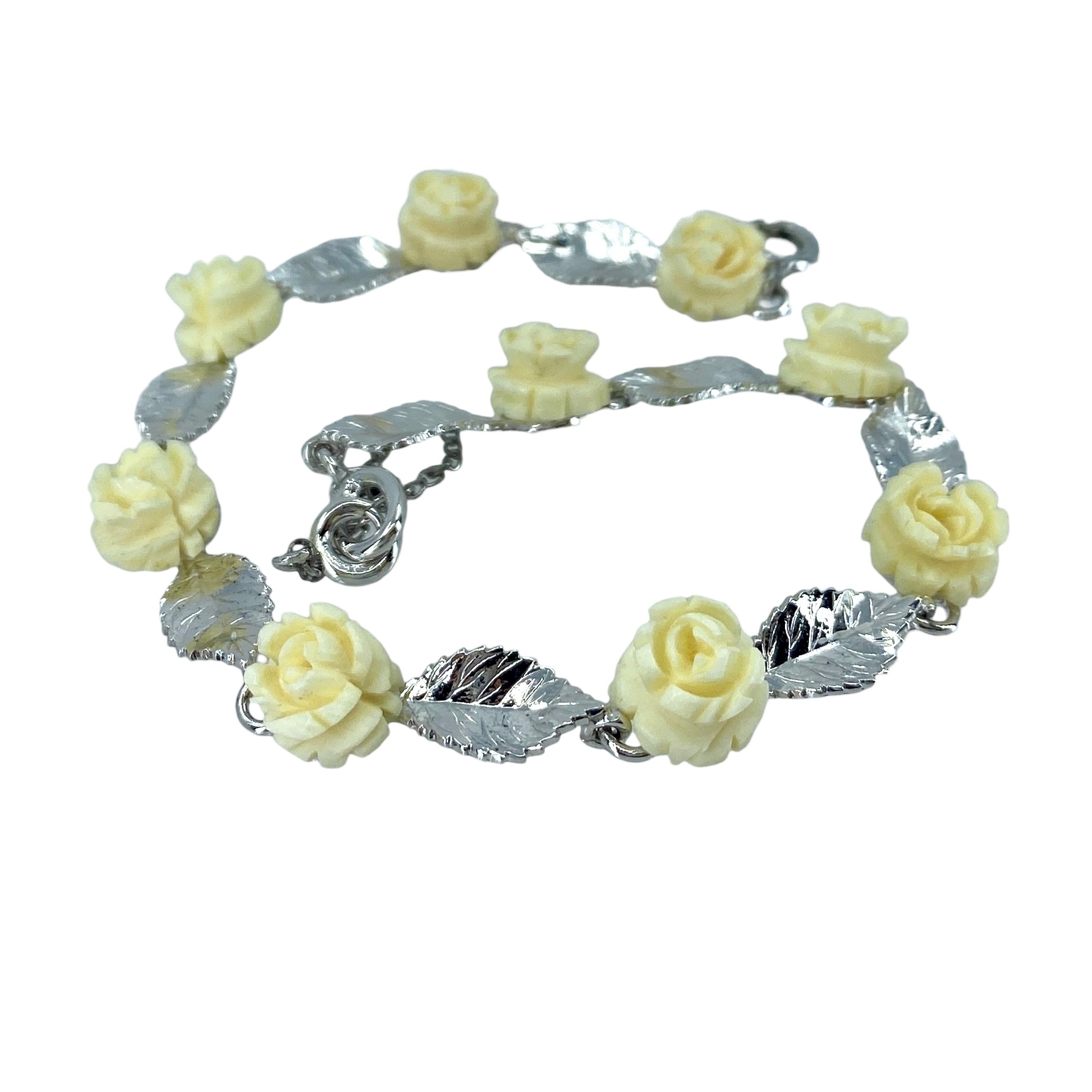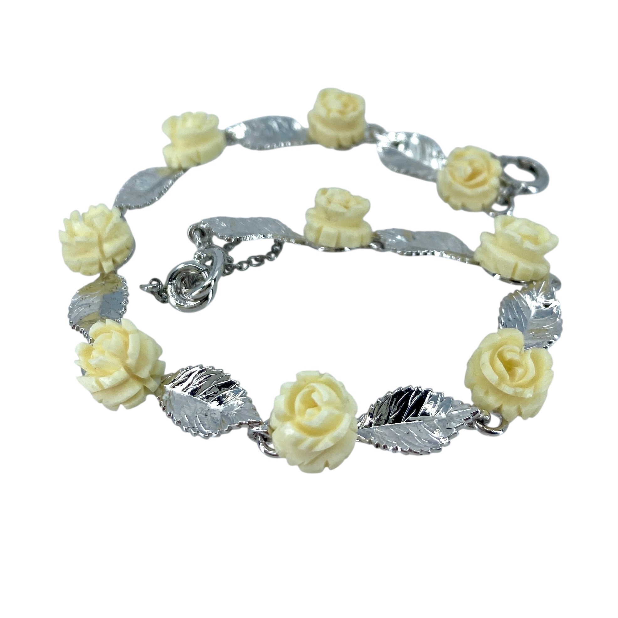 Lovely Rose and Leaf Chain Bone and Sterling Silver Signed Bracelet, 7.75in, 8.01g, Engraved w/ Hallmark