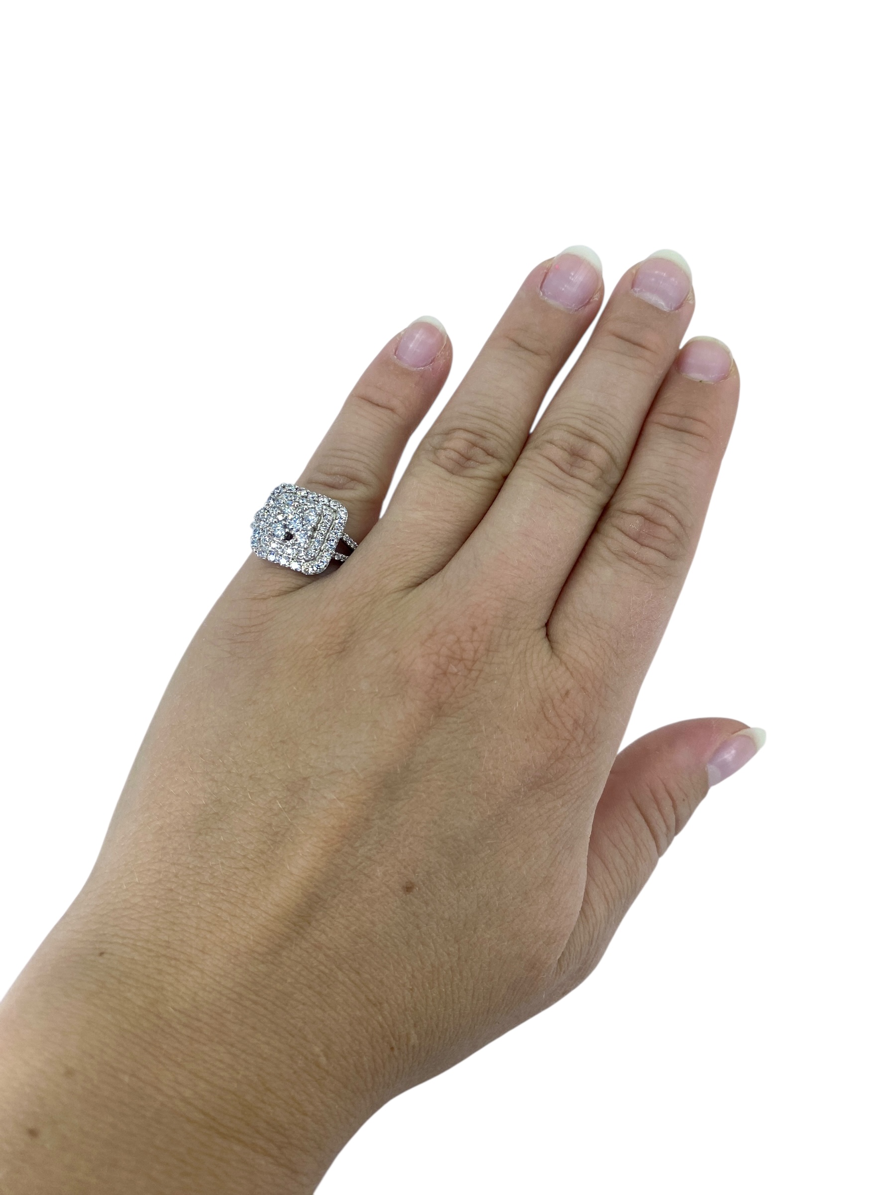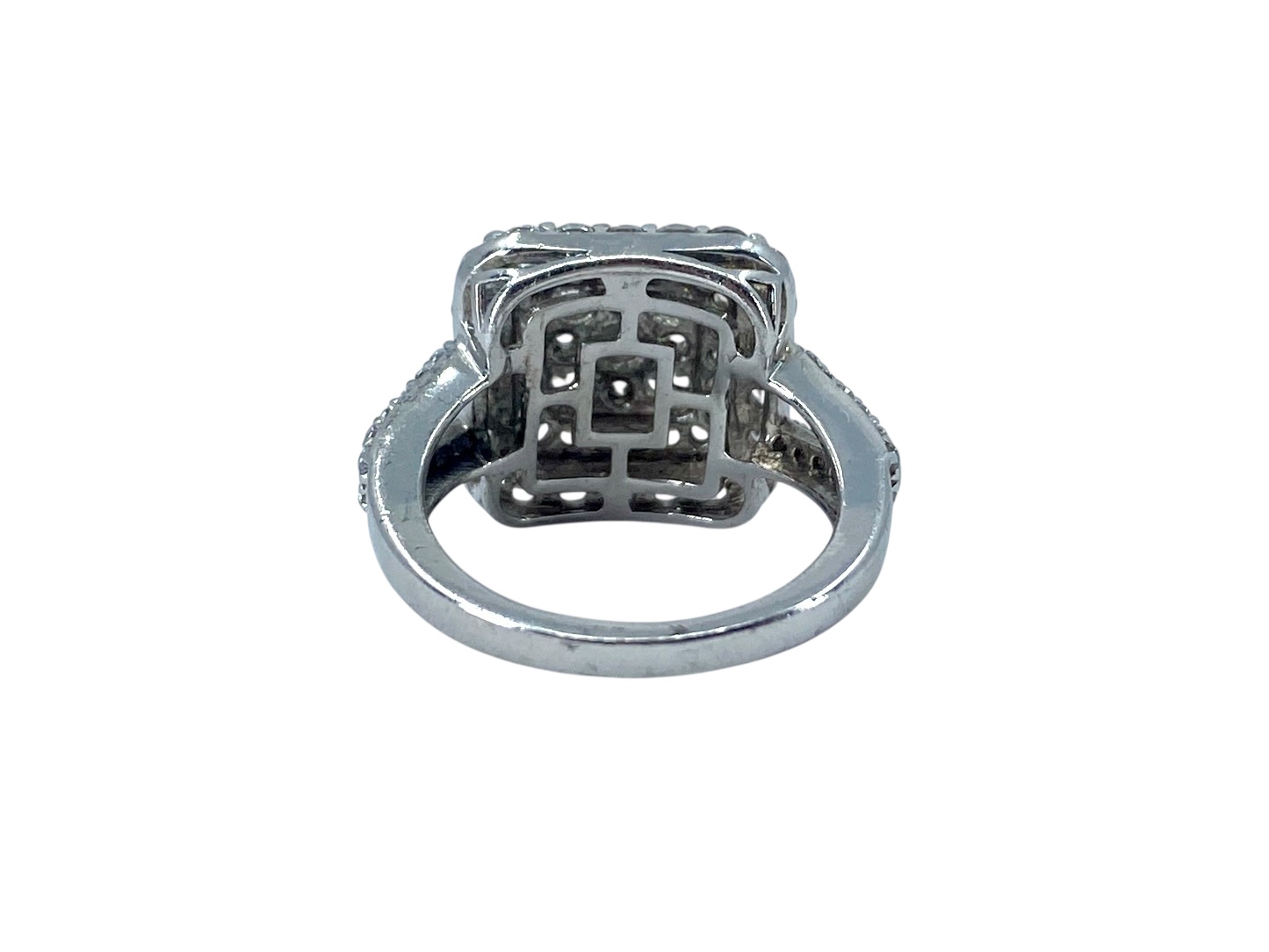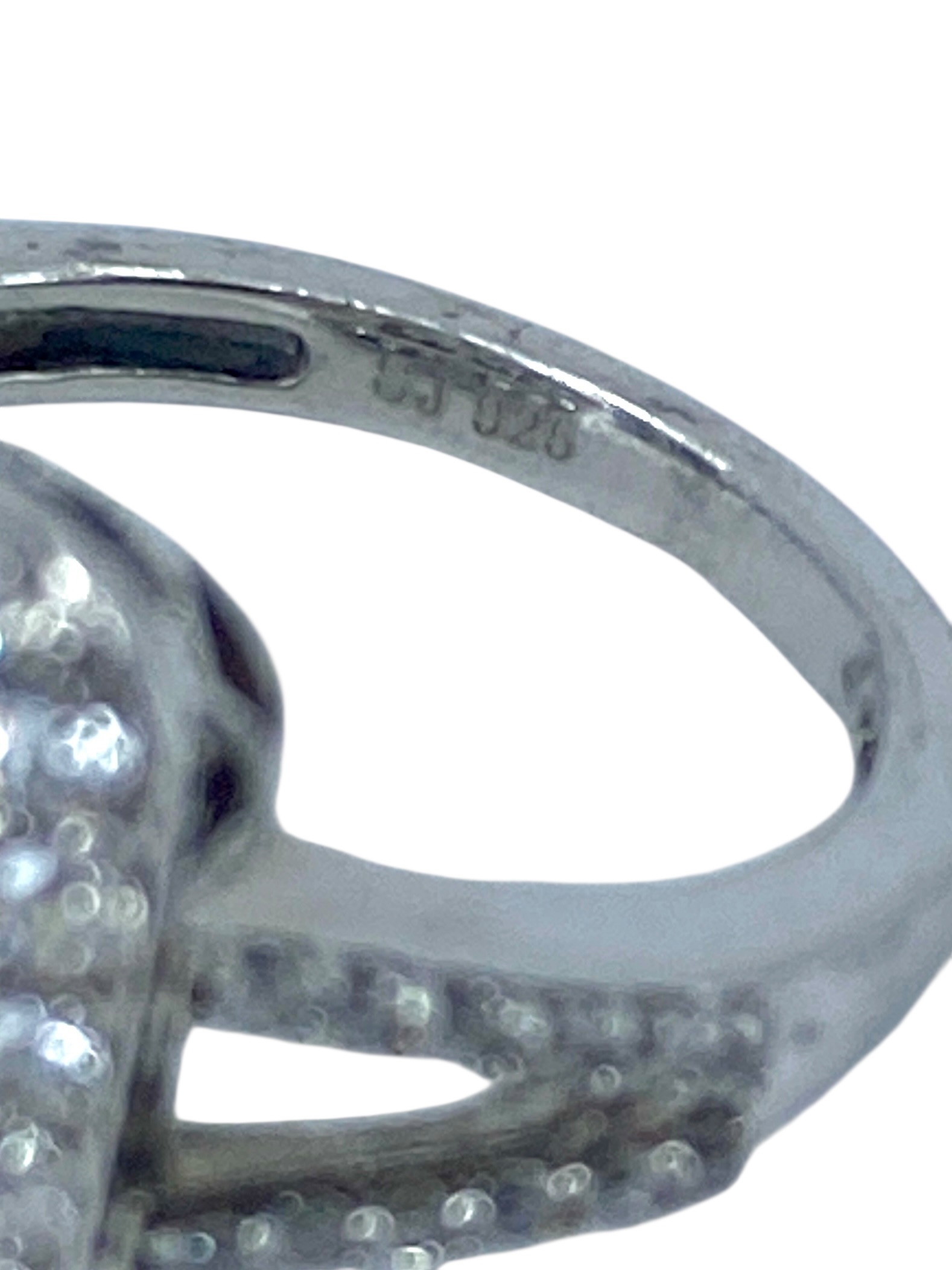 Sparkling SJ Signed Rhinestone Cluster Halo Sterling Silver Cocktail Ring with missing stone, sz 5.75, 4.91g, Engraved “SJ 925”