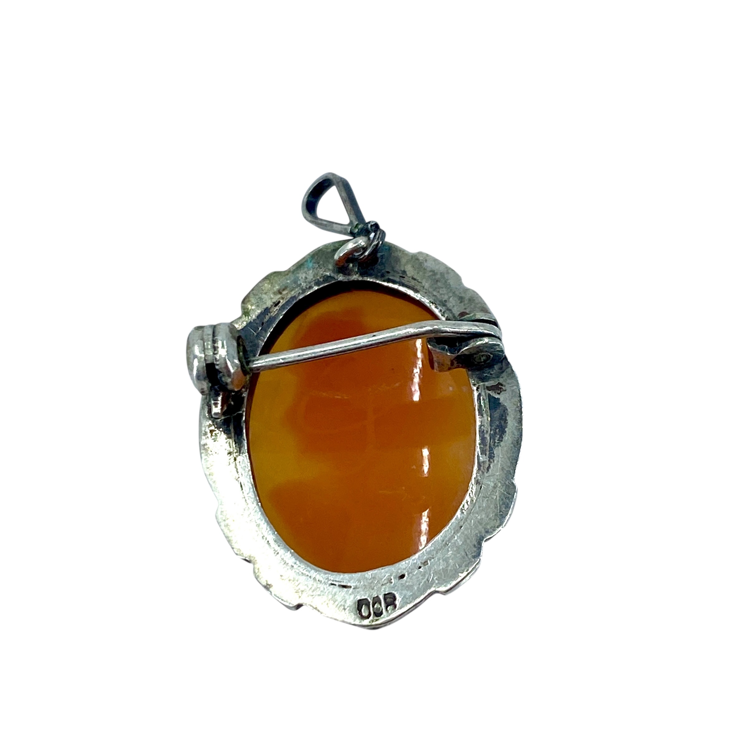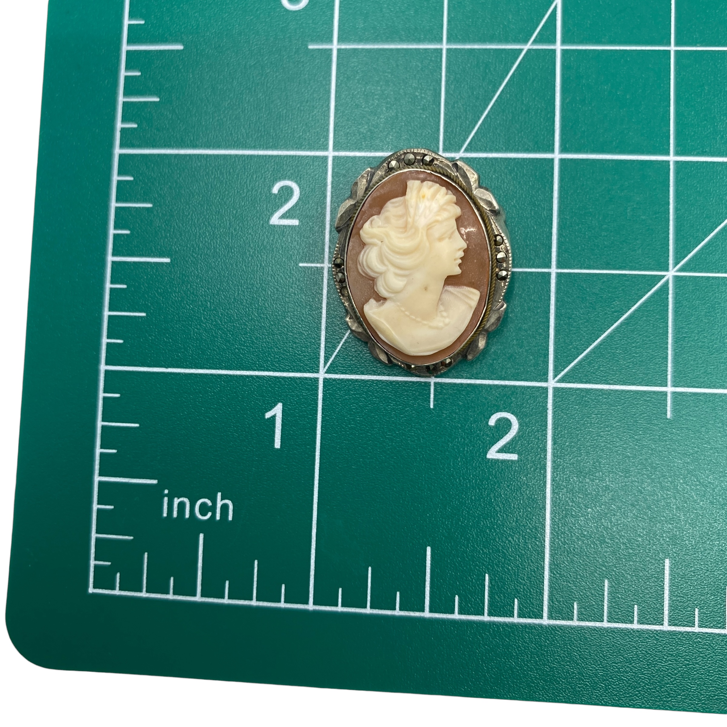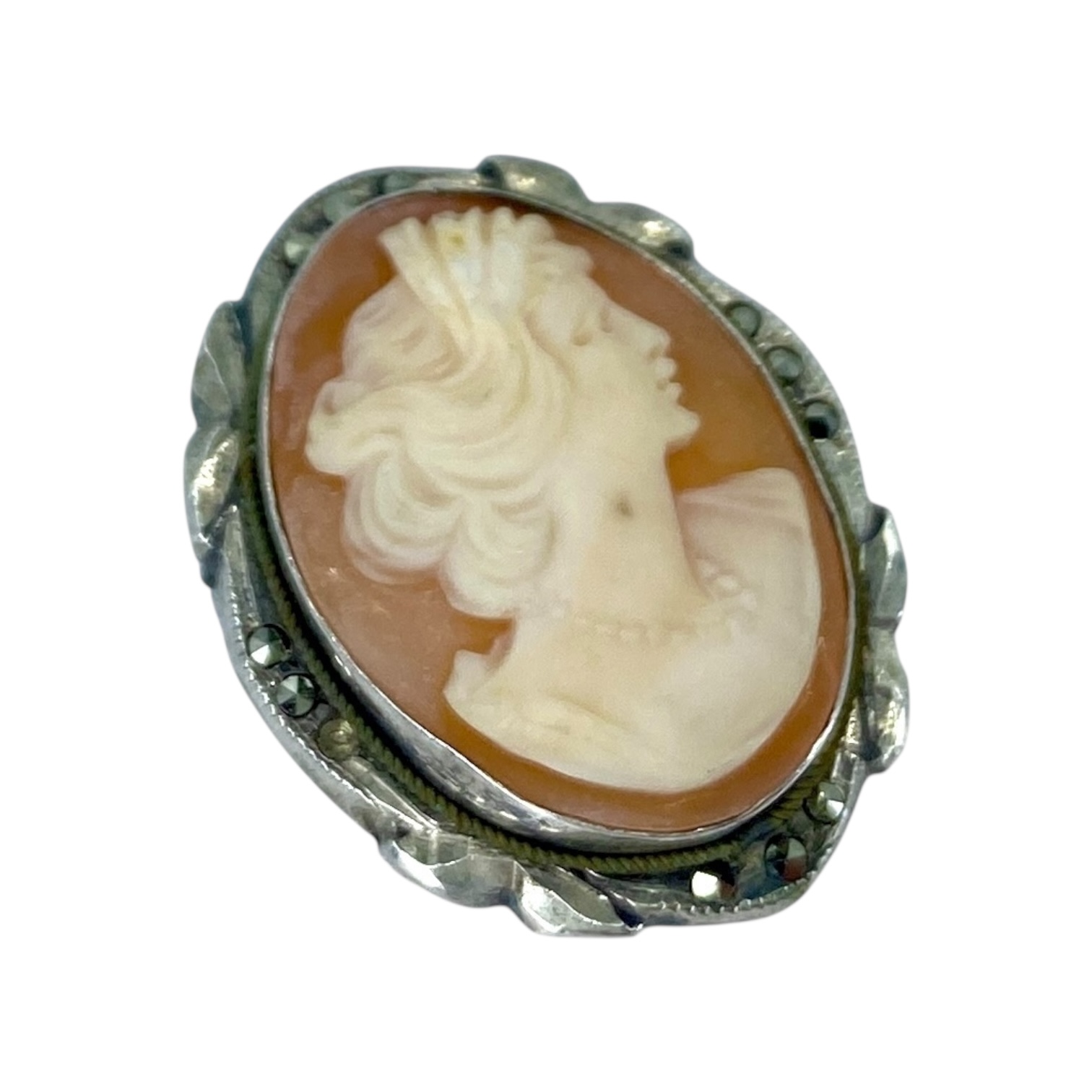 Vintage Cameo Carved Shell Sterling Silver Brooch w/ Marcasite, 4.29g, Engraved “800”