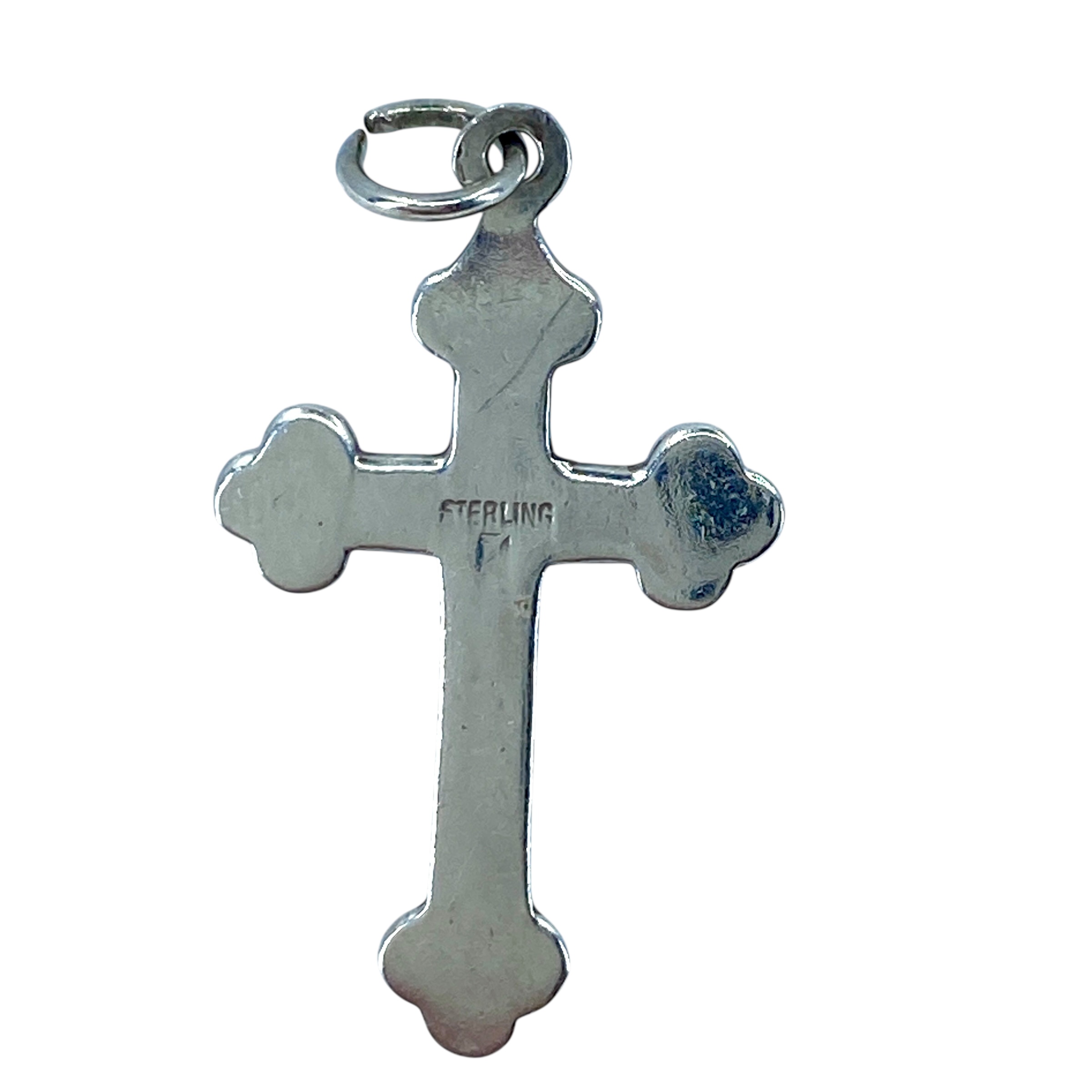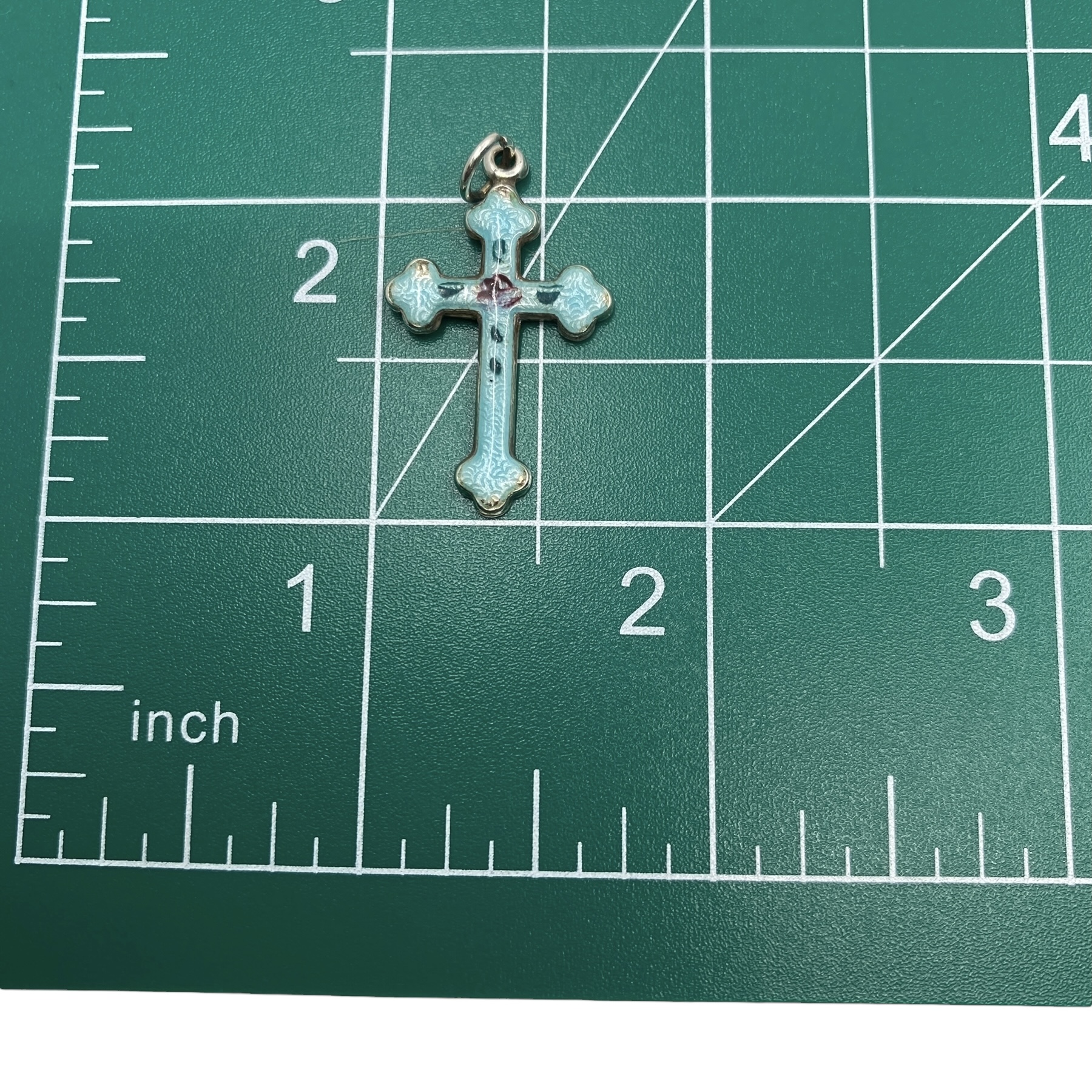 Blue Enamel Sterling Silver Cross Pendant w/ Red Rose Design, 1.98g, Engraved “Sterling”