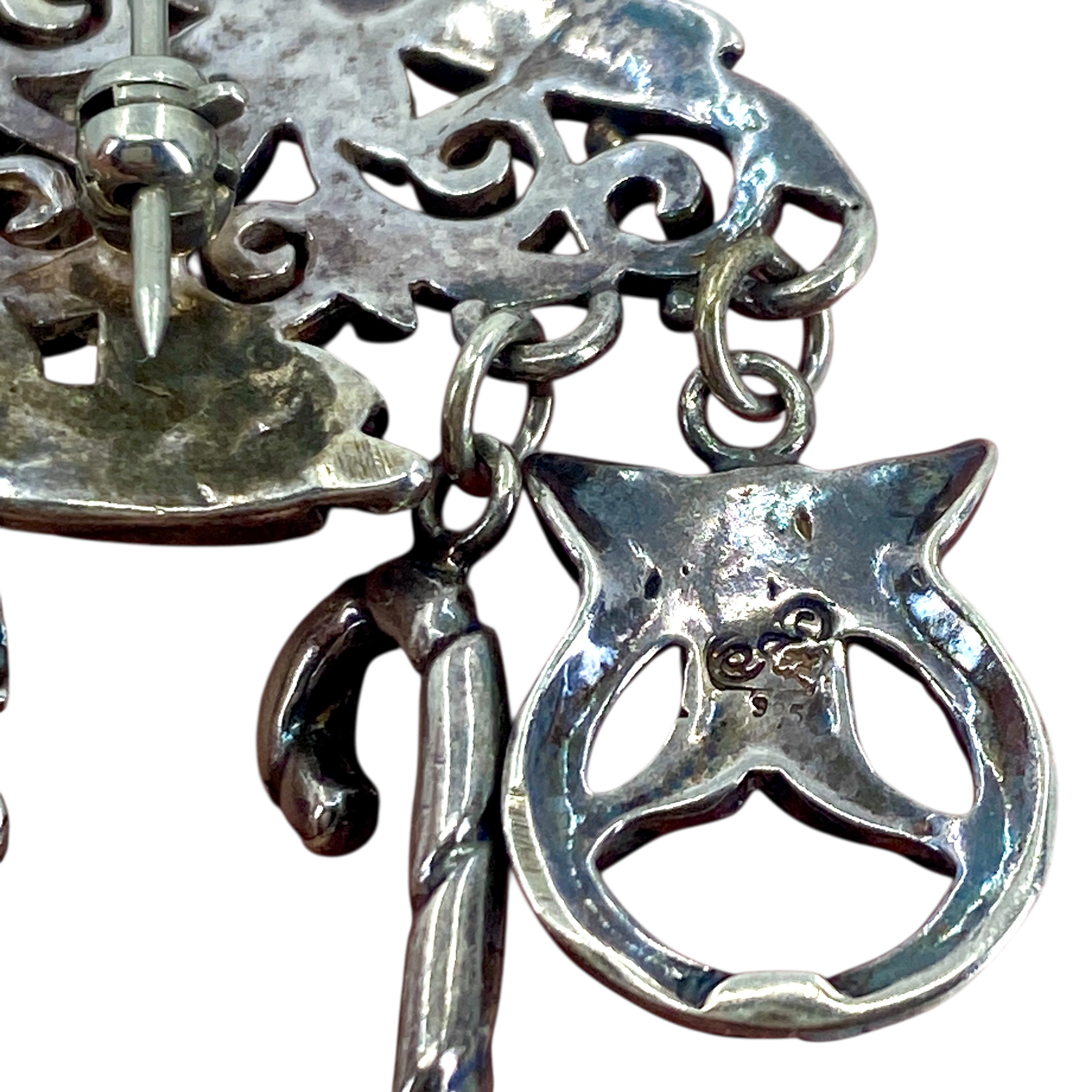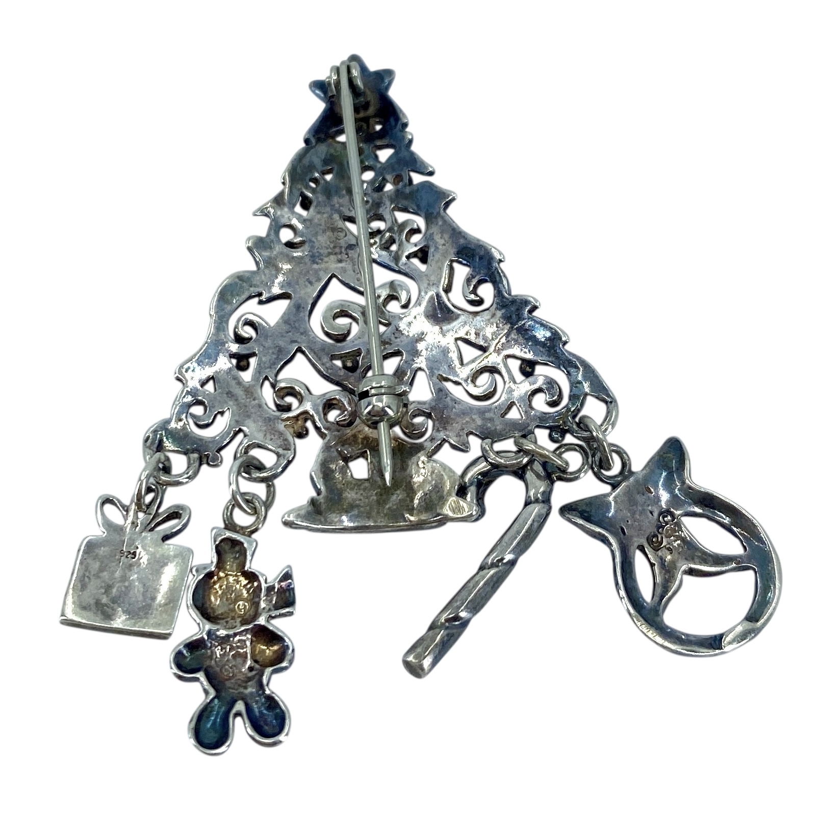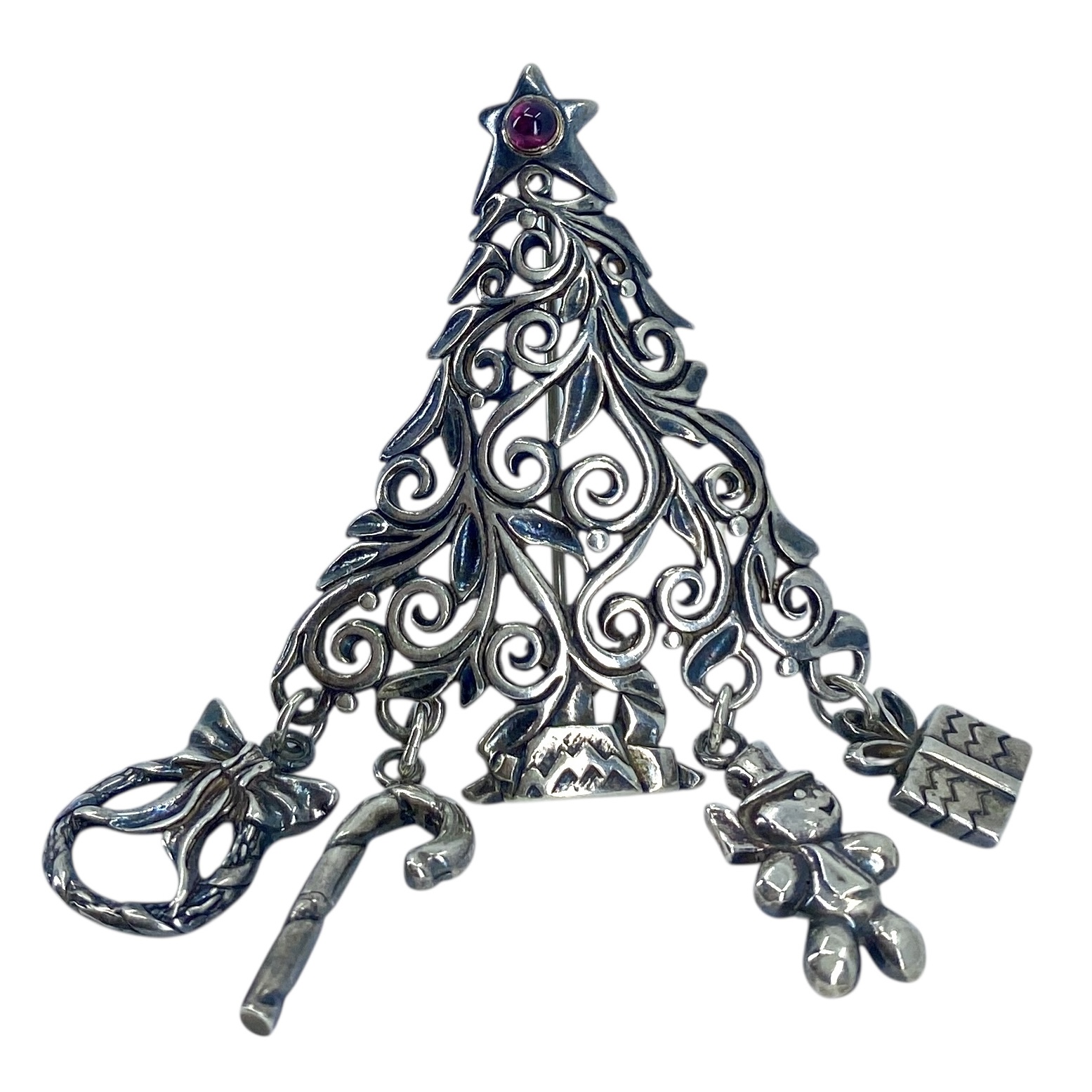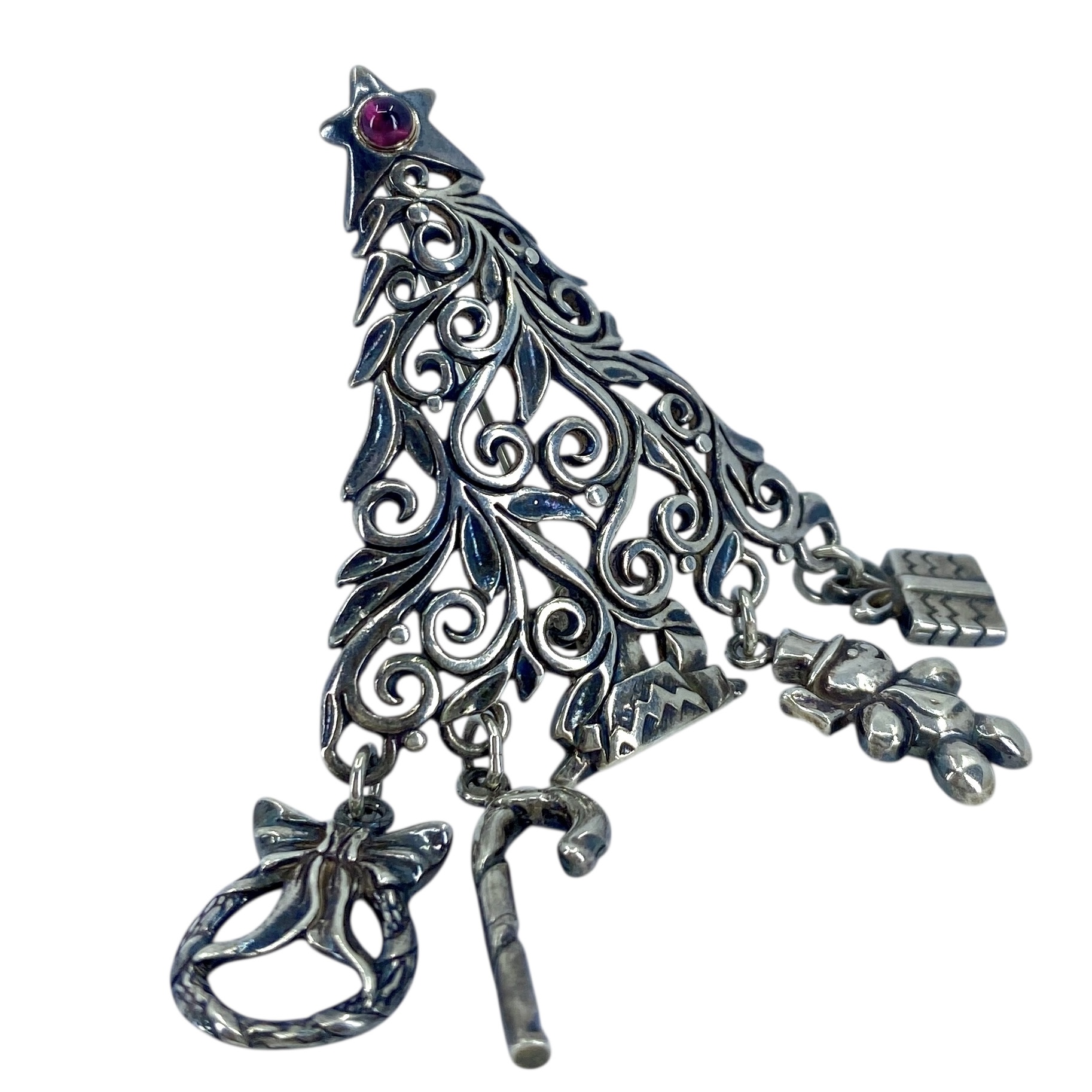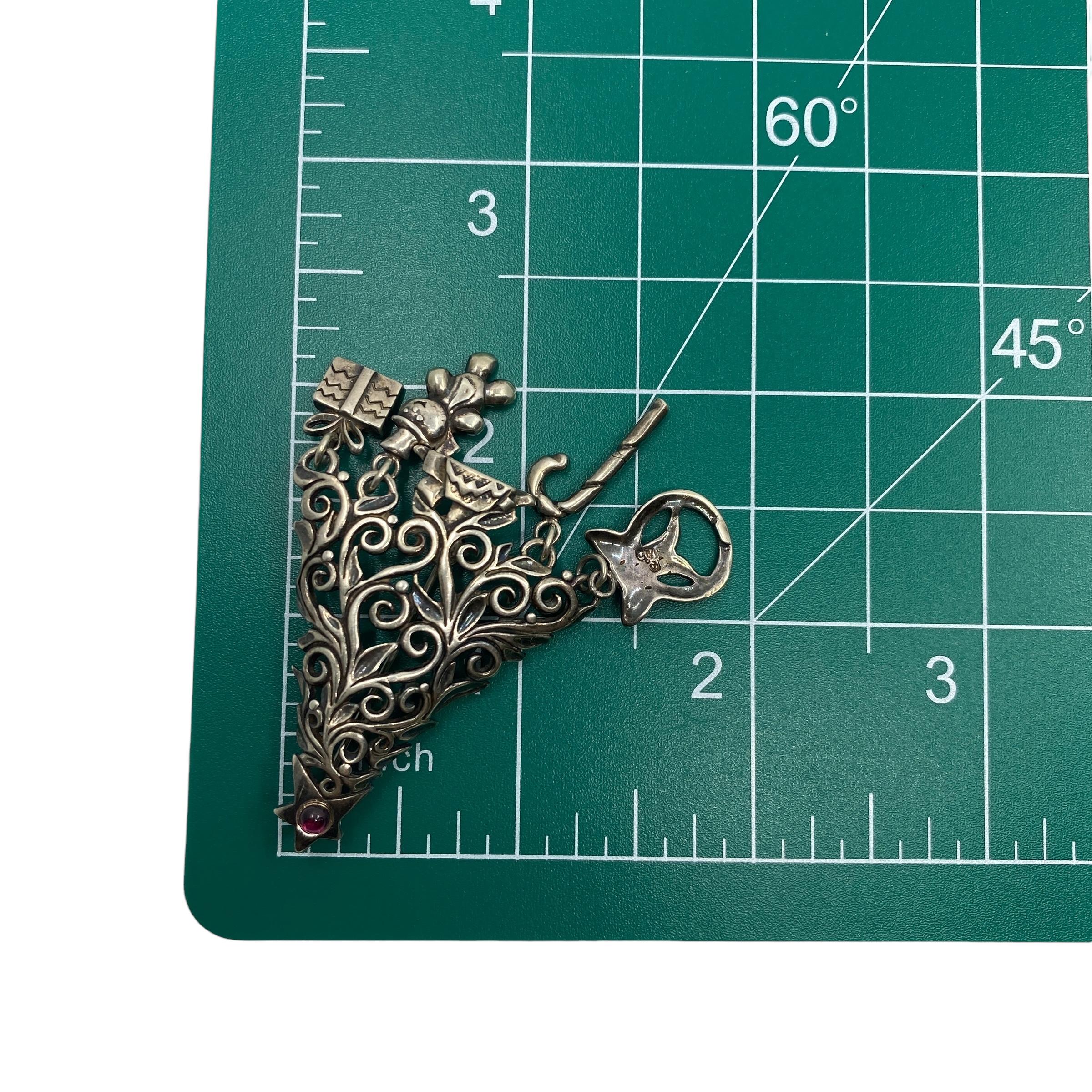 Vintage Sterling Silver Christmas Tree + Charms & Red Glass Bead Signed Brooch, 13.43g, Engraved “925” + Hallmark