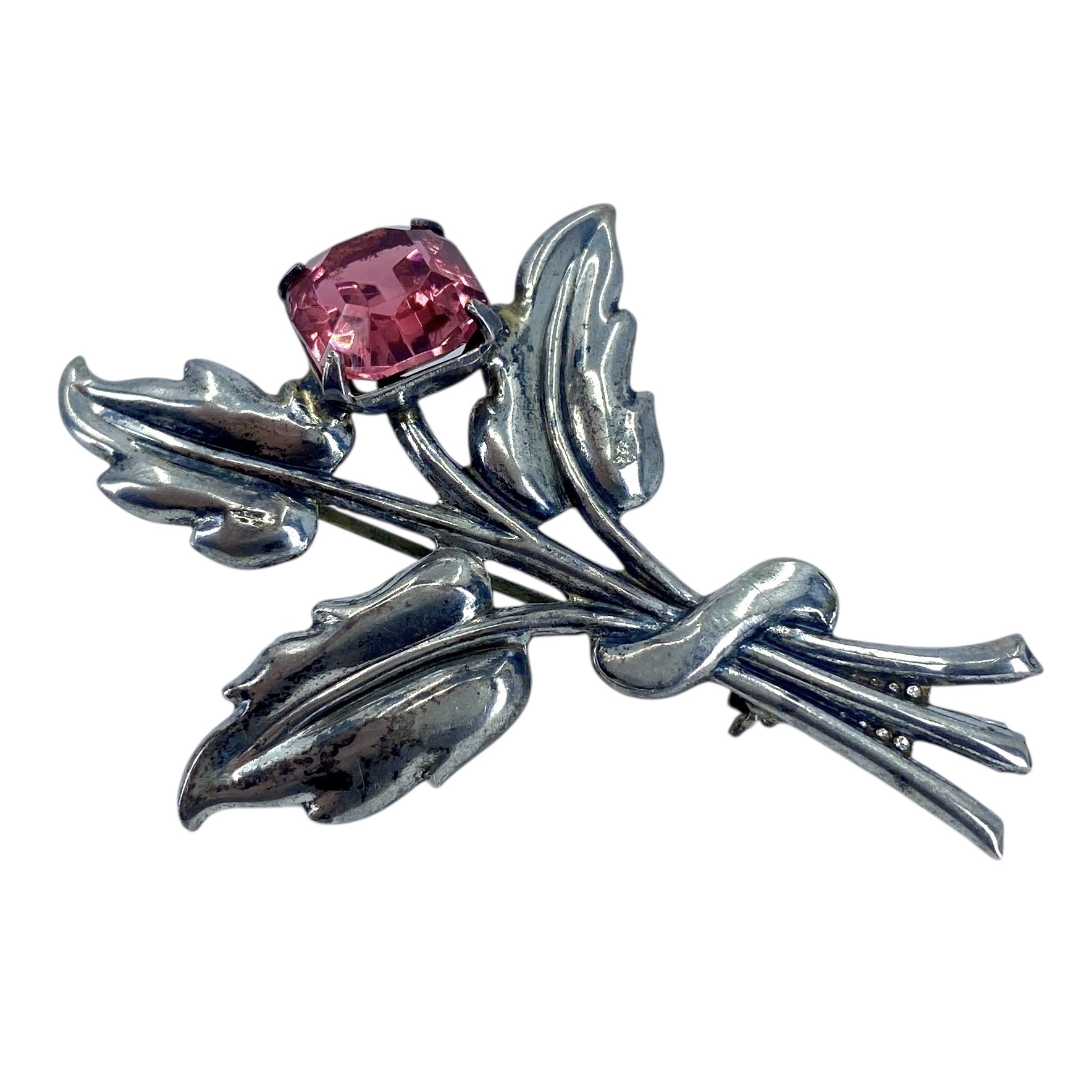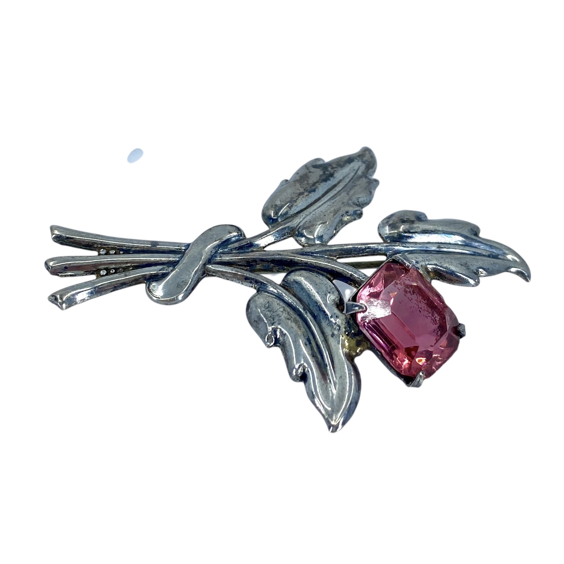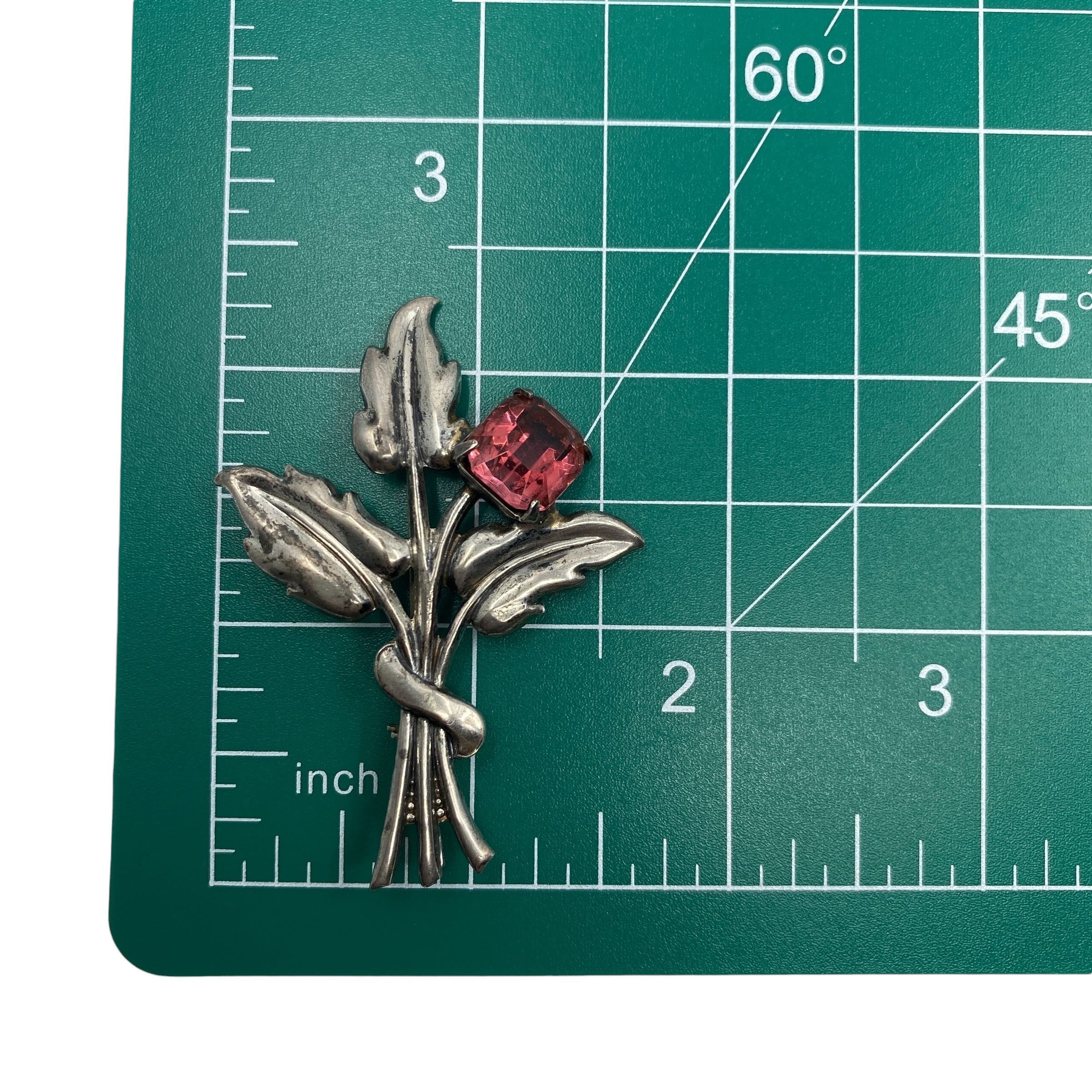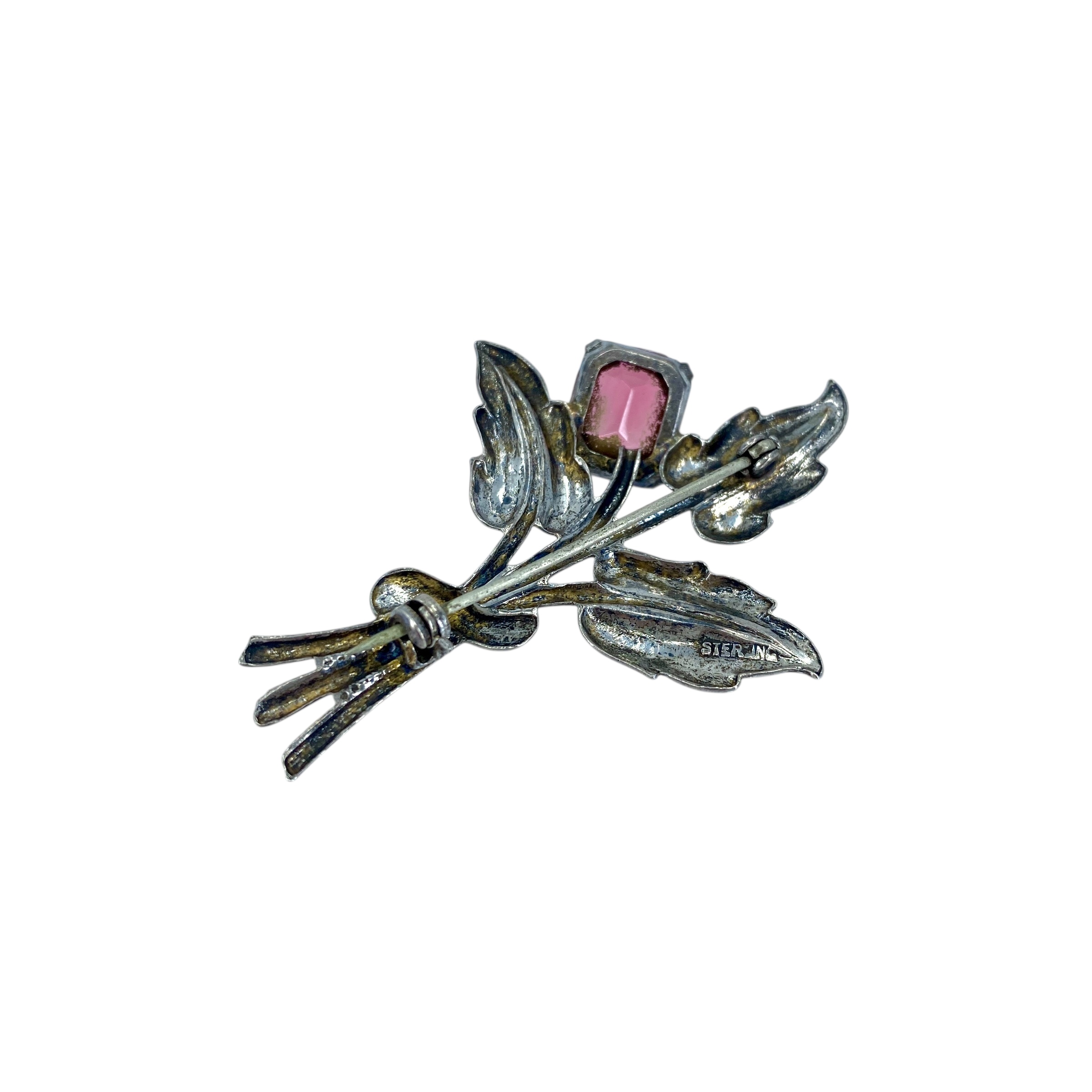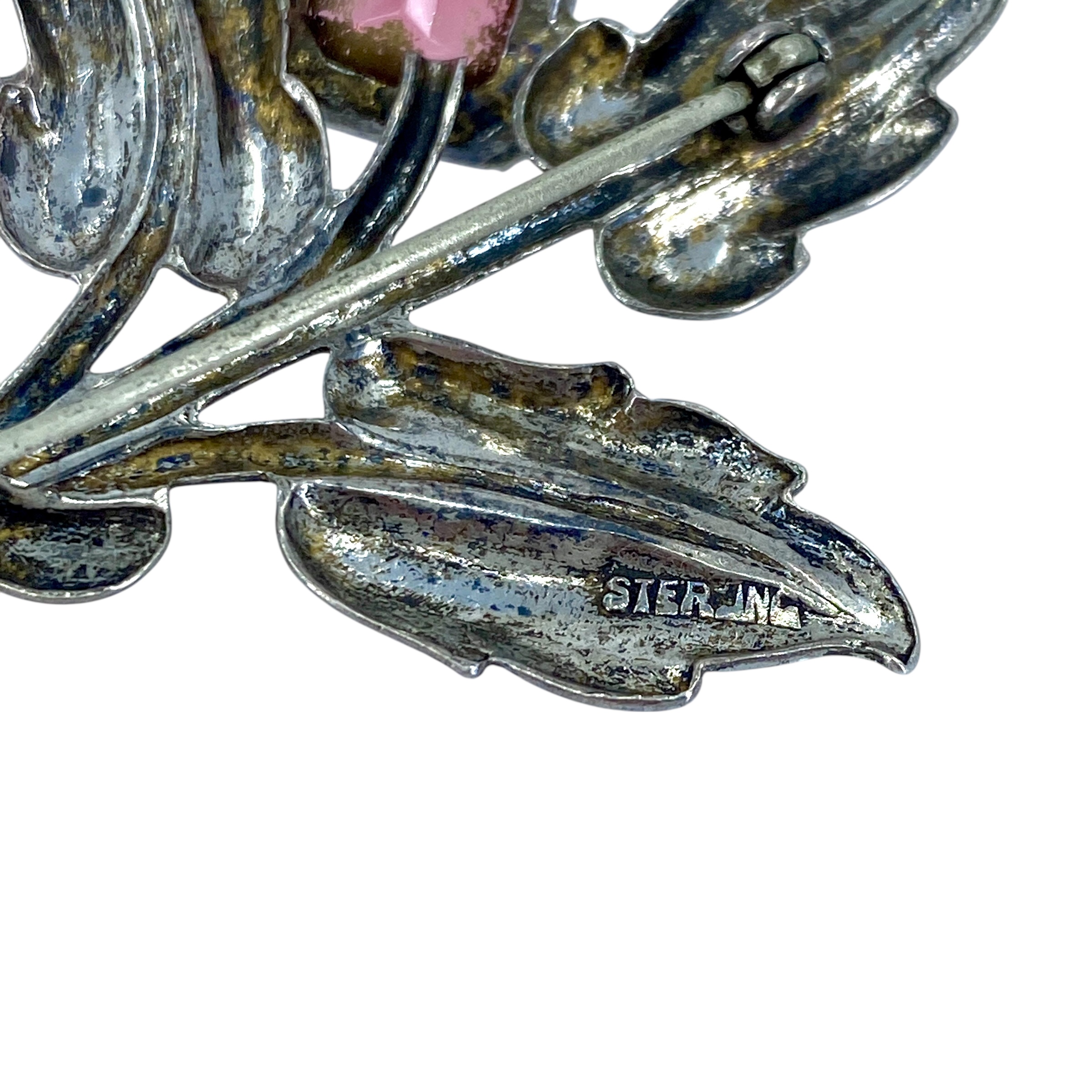 Vintage Sterling Silver Floral Coral Pink Rhinestone Brooch, 7.44g, Engraved “Sterling”