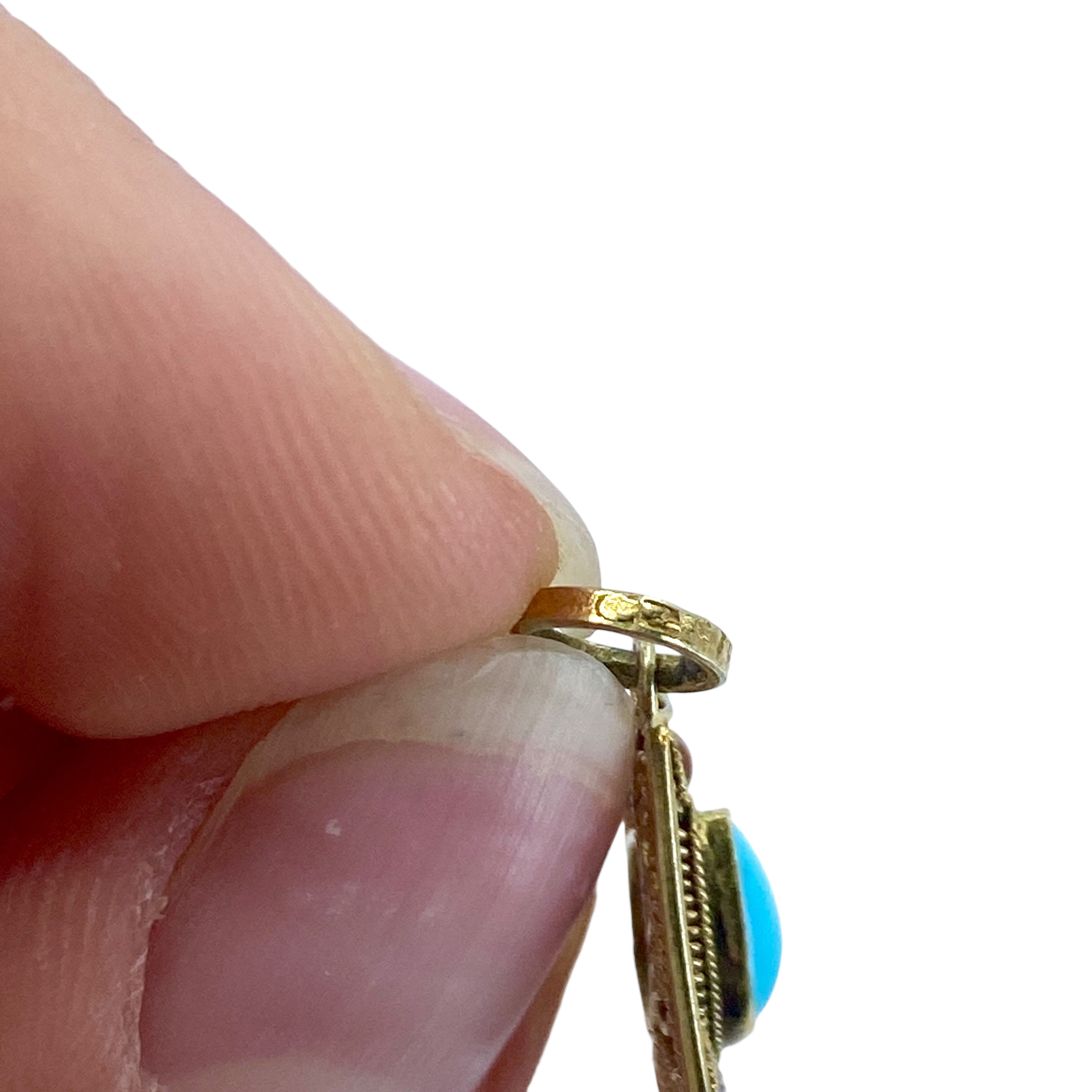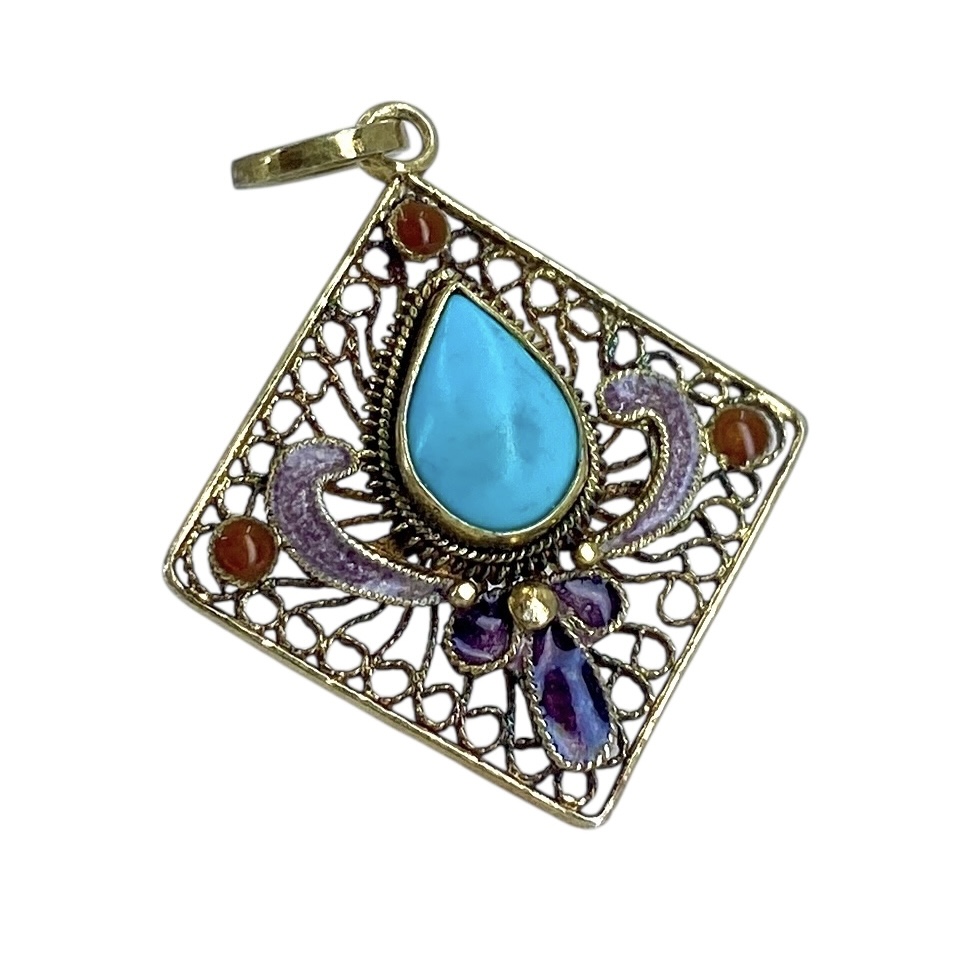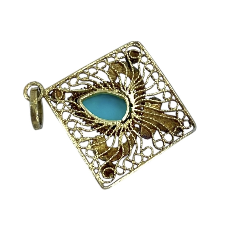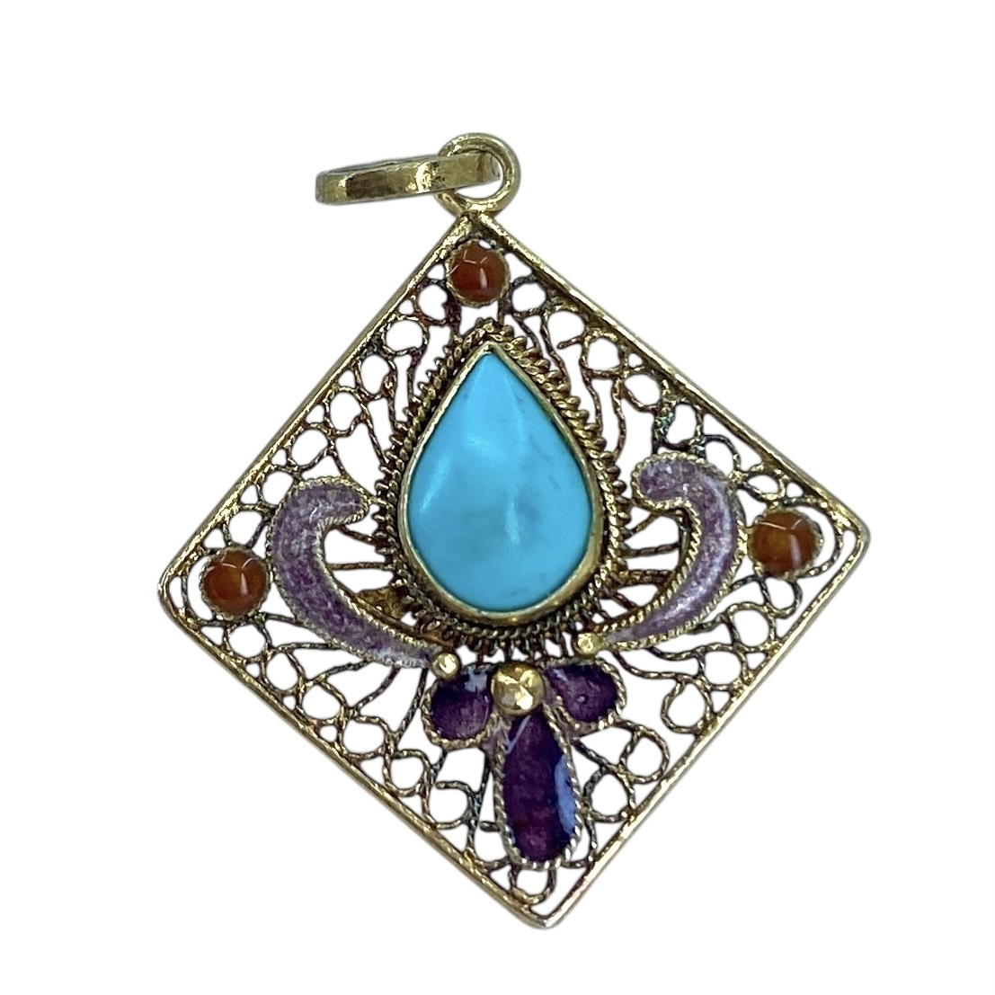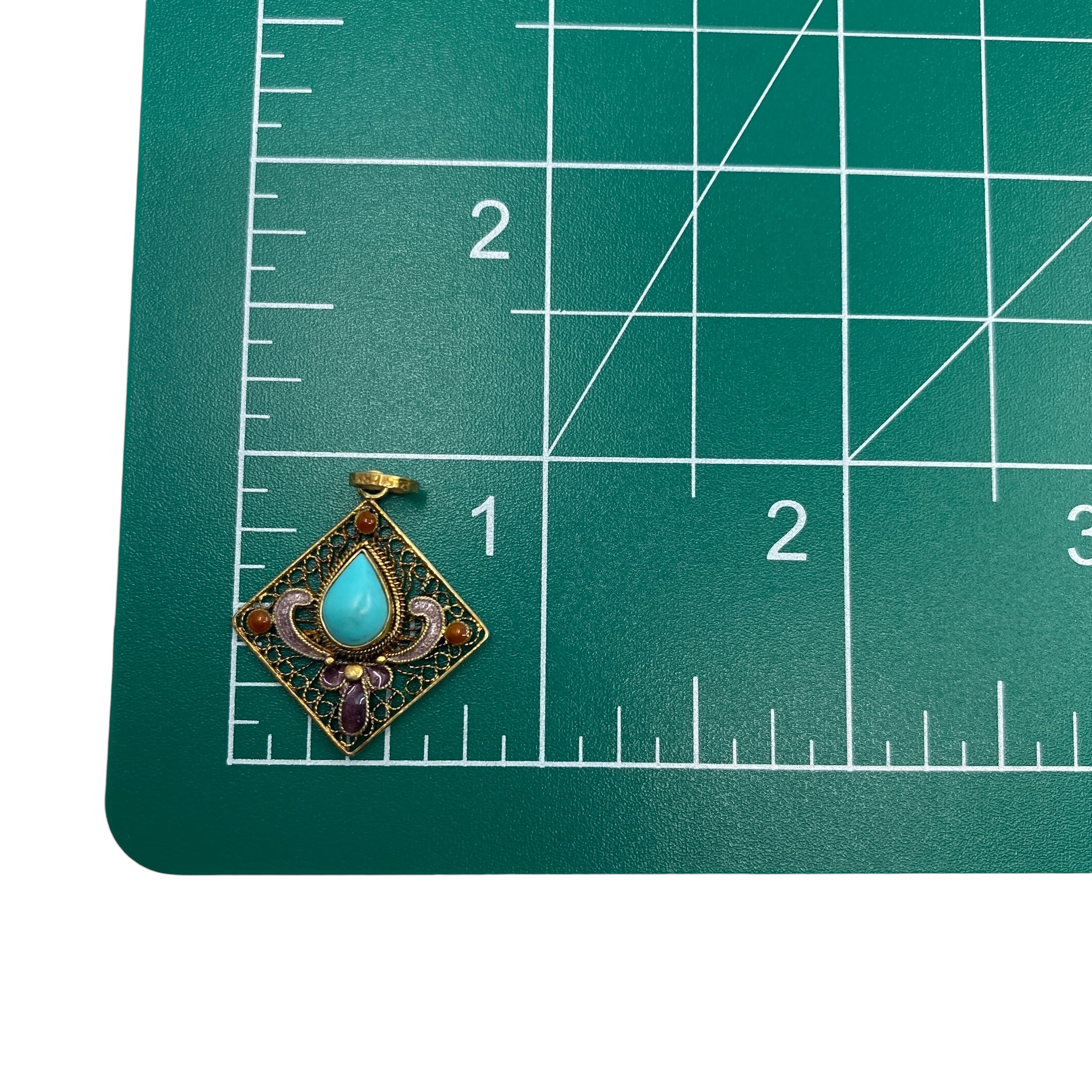 Diamond Shaped Filigree Turquoise Multi-Stone Gold Over Sterling Silver Pendant, 1.2g