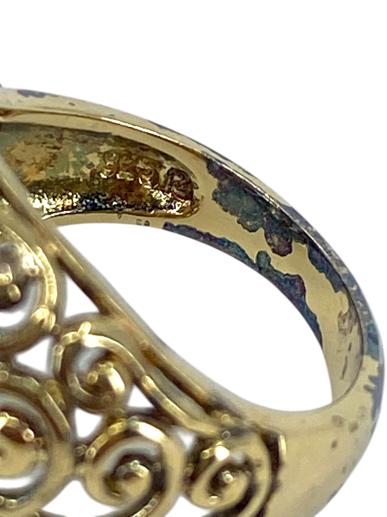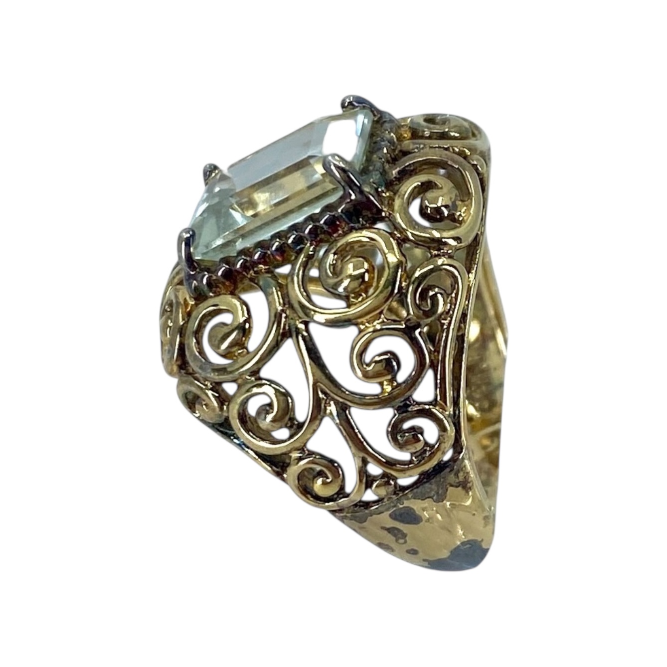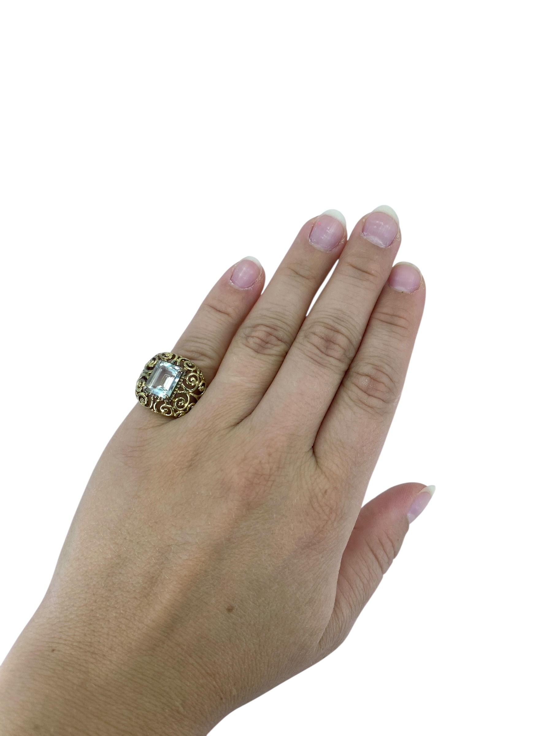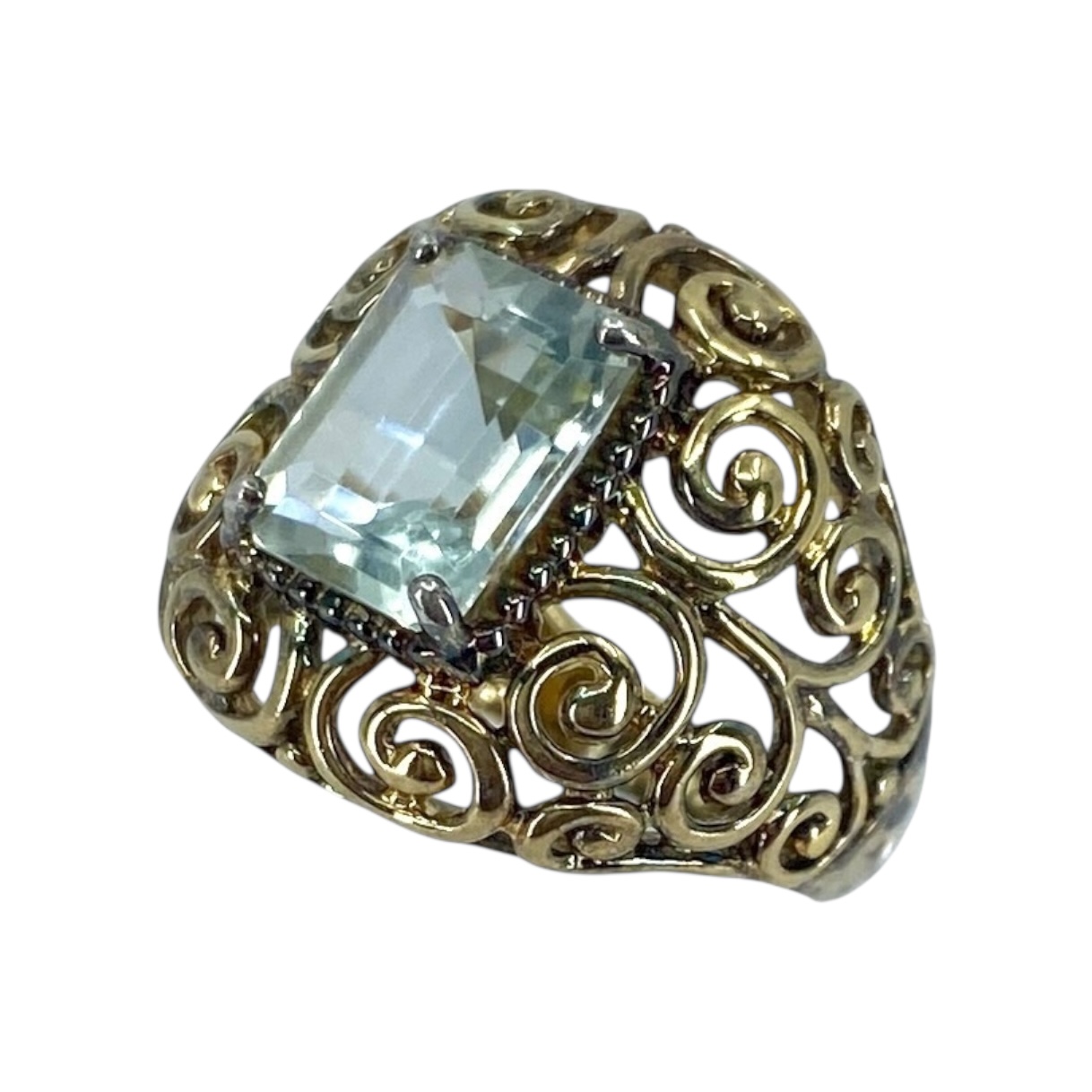 Emerald Cut Aquamarine Ross Rimmons Gold Over Sterling Filigree Cocktail Ring, sz 6, 5.91g, Engraved “925 R”