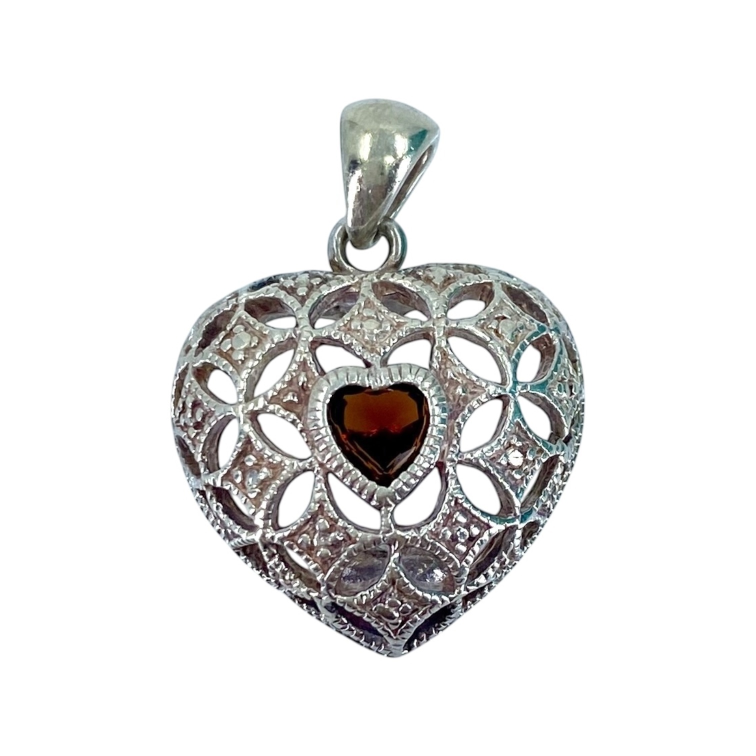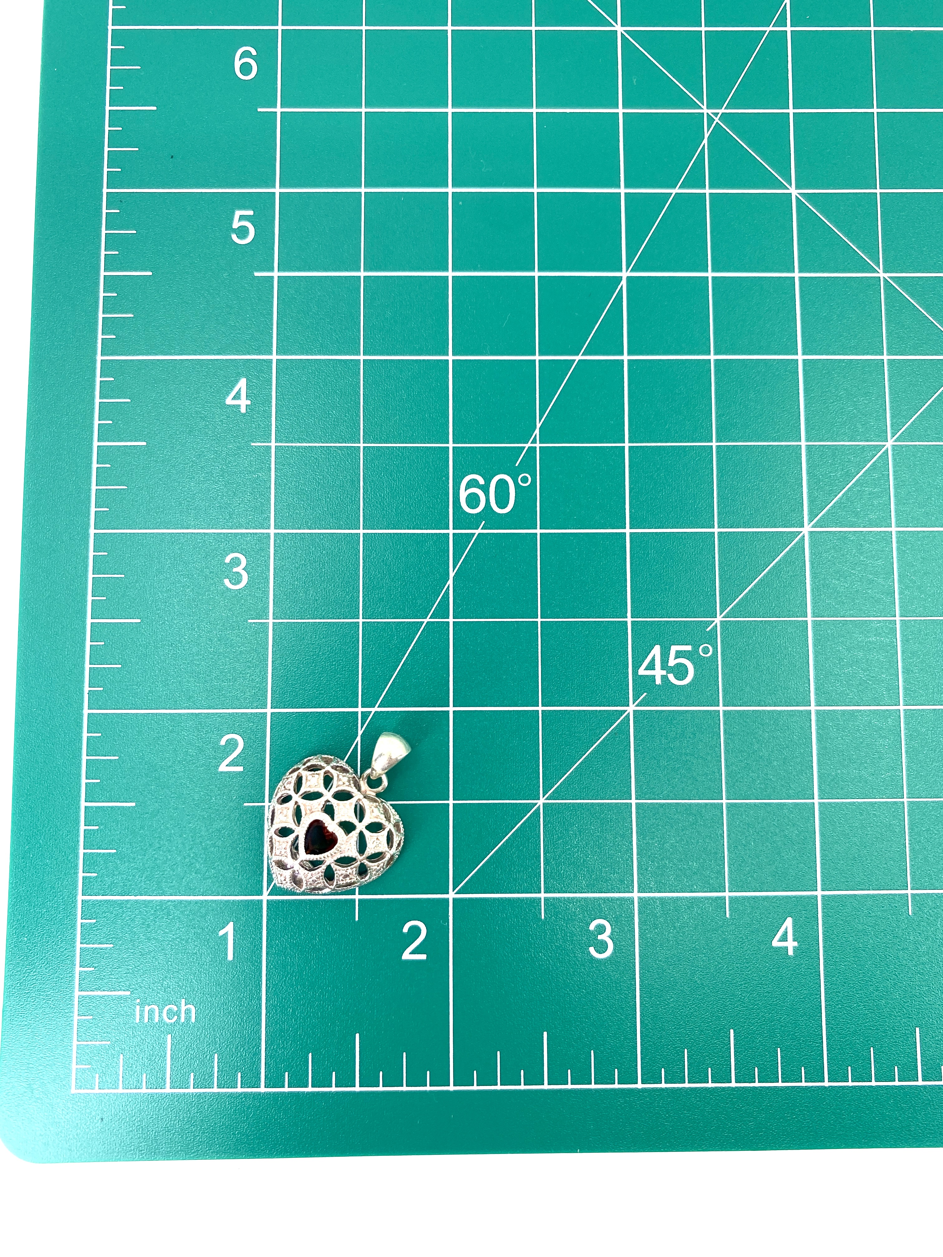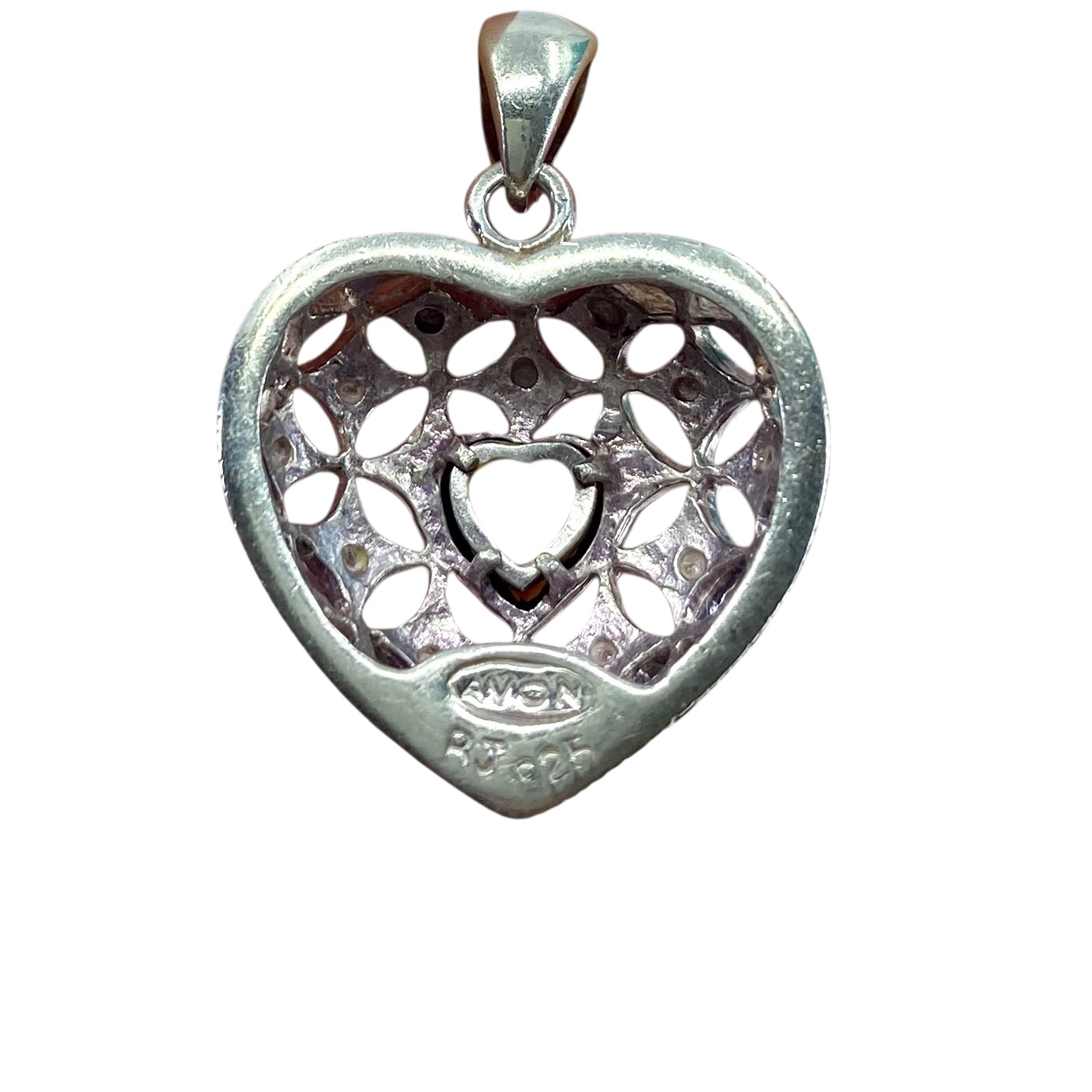 AVON Sterling Silver Filigree Heart Pendant With Red Cubic Zirconia, 3.42g, Engraved “AVON RJ 925”