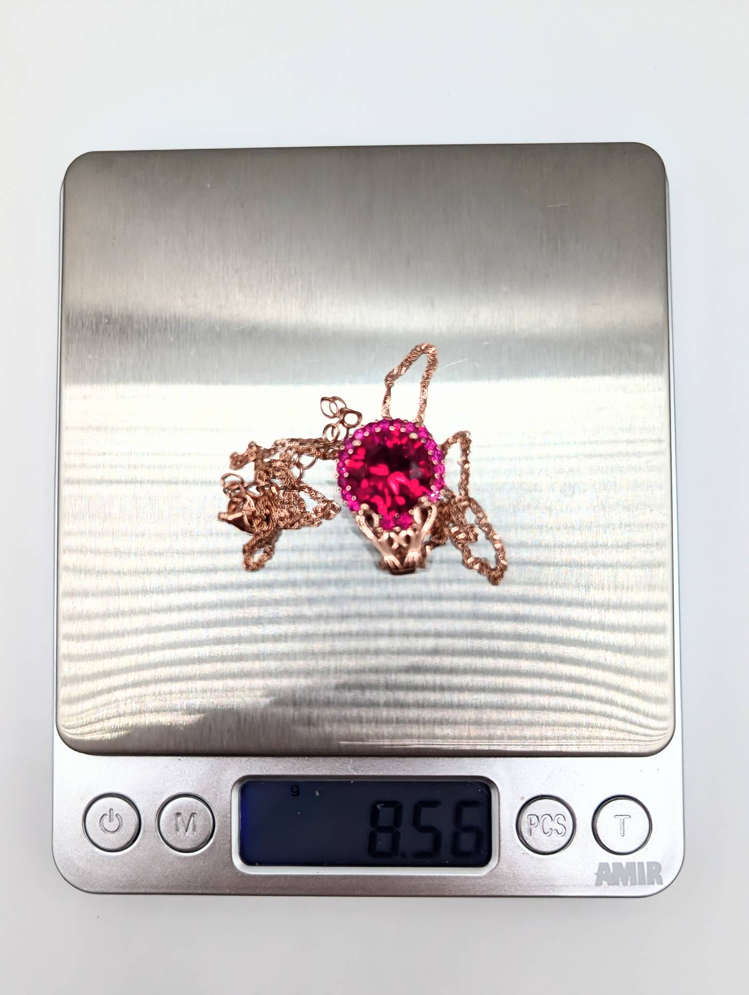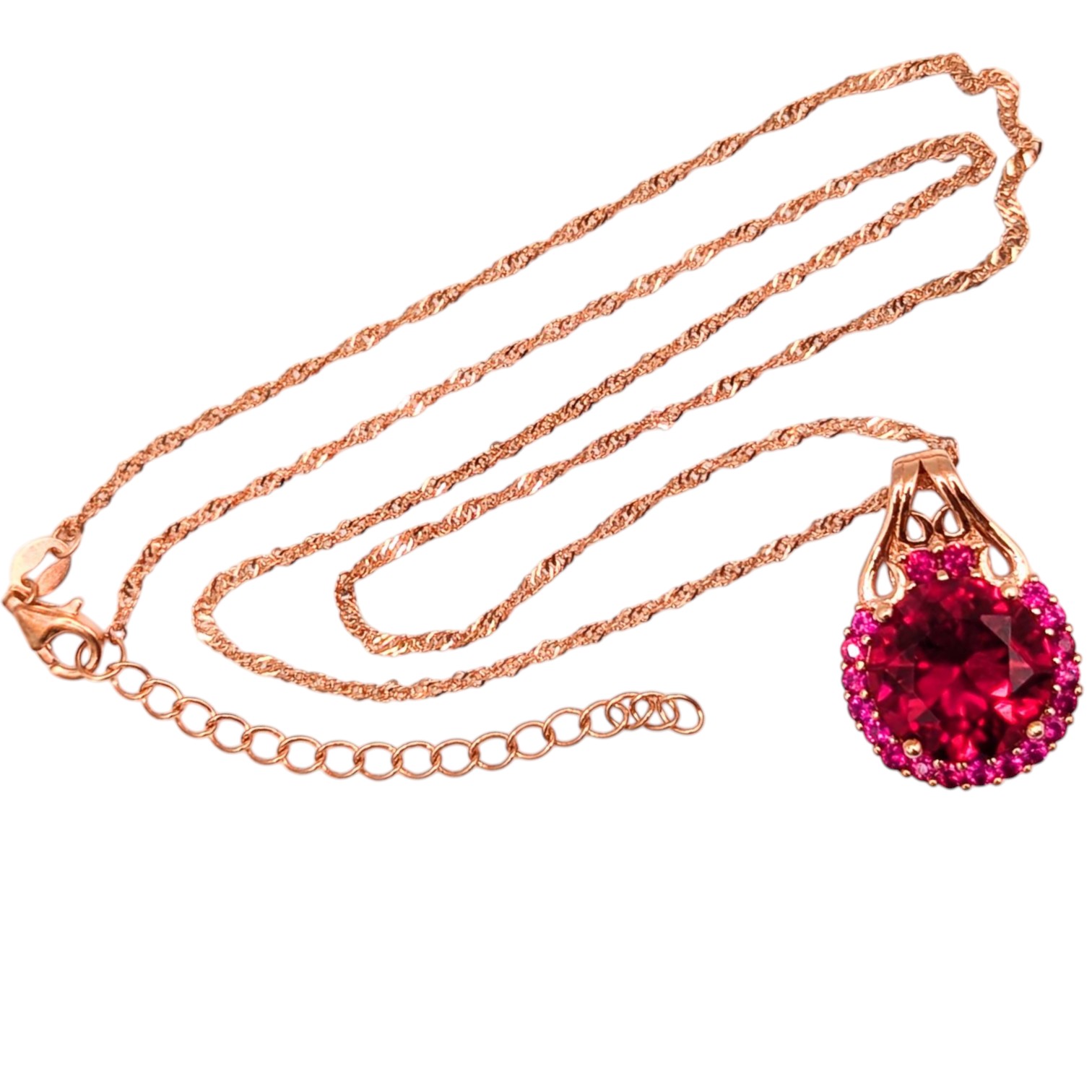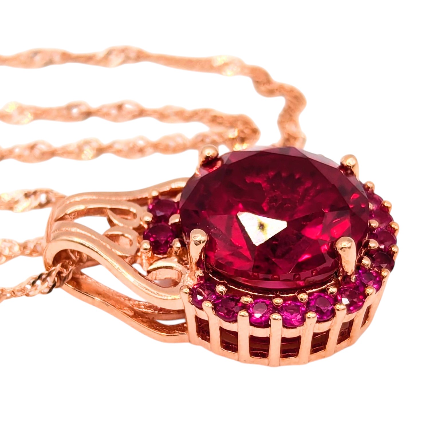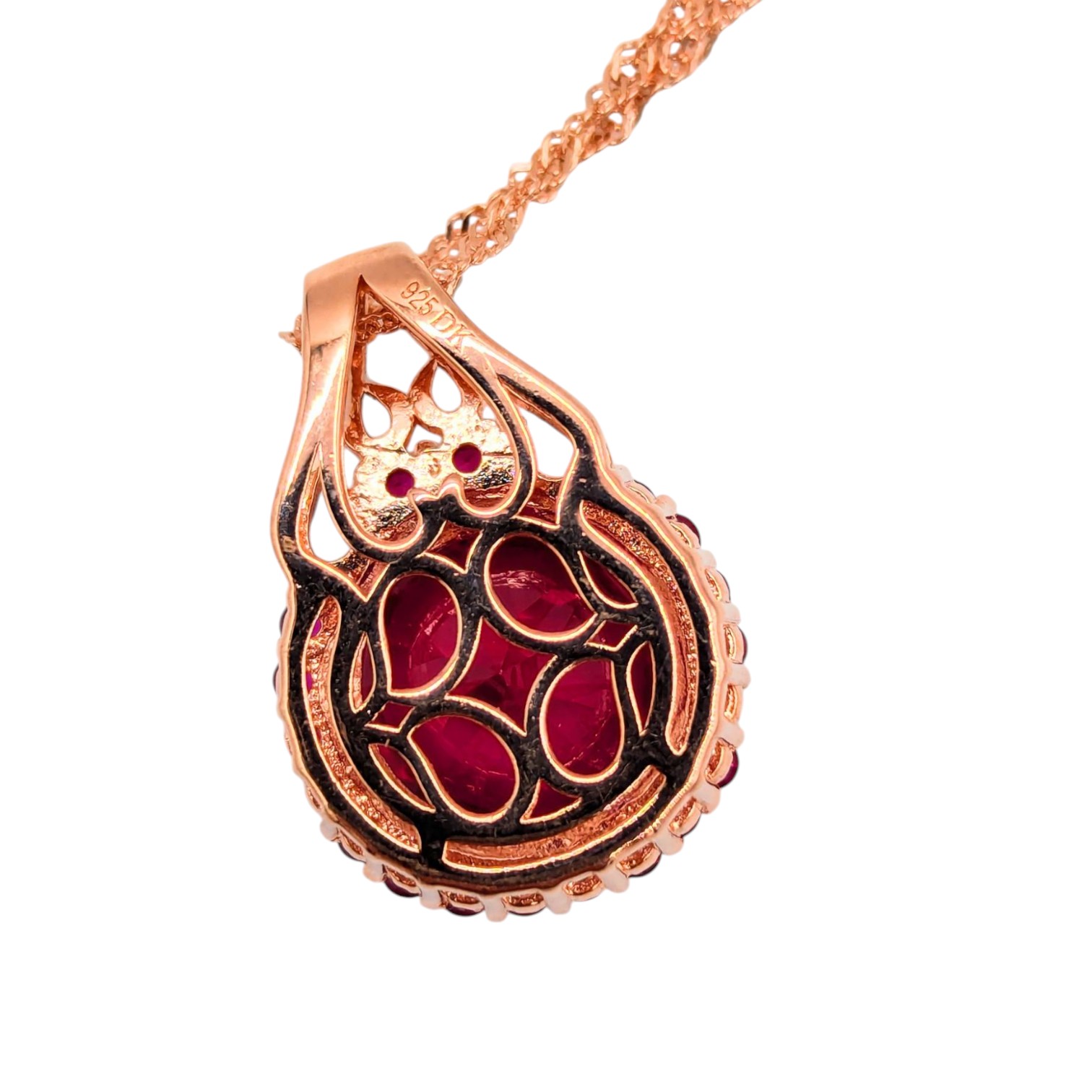 Sterling Rose Gold over, Singapore Chain Necklace with halo of Rubies around Red Ruby Pendant 8.56g DK