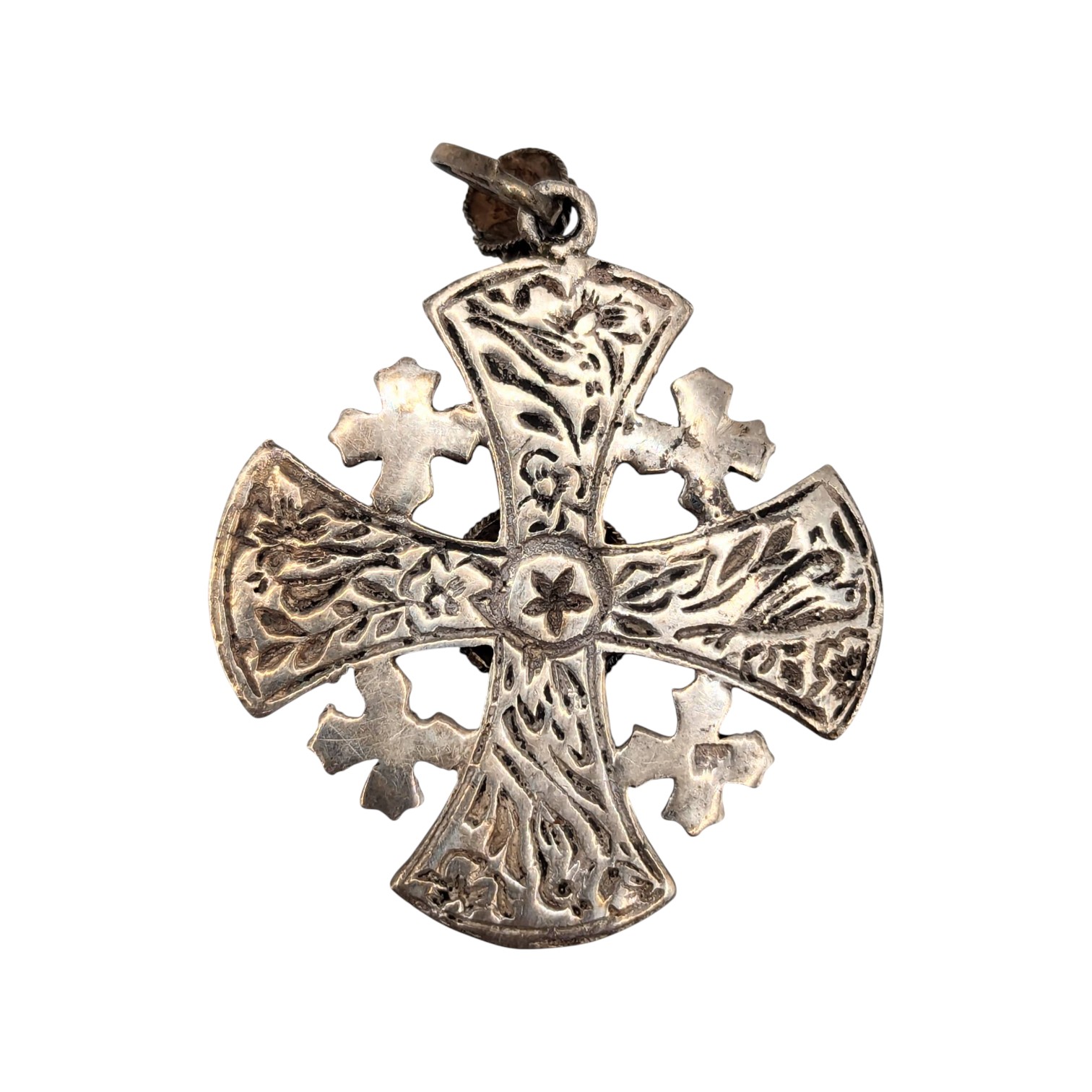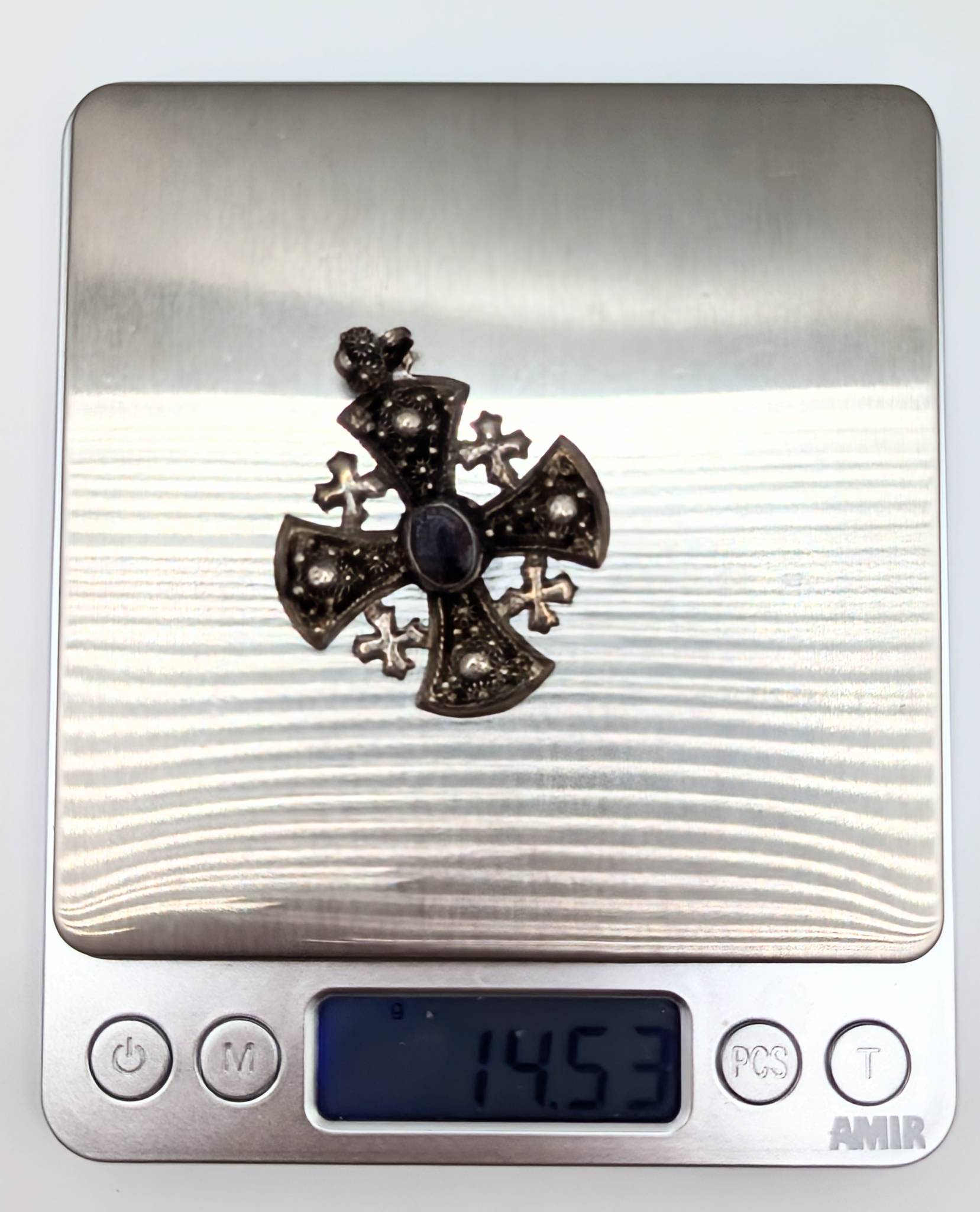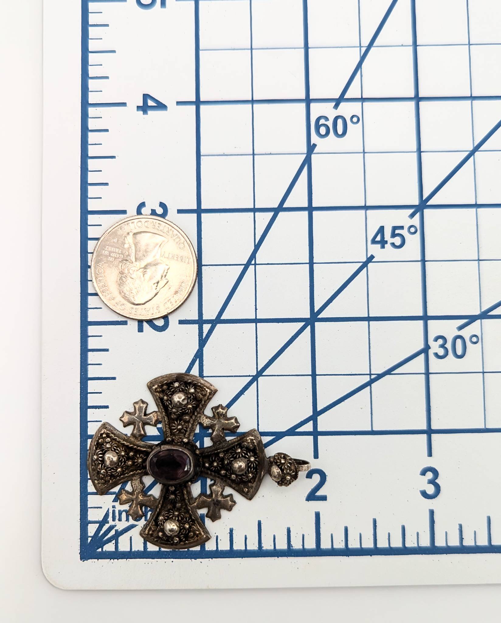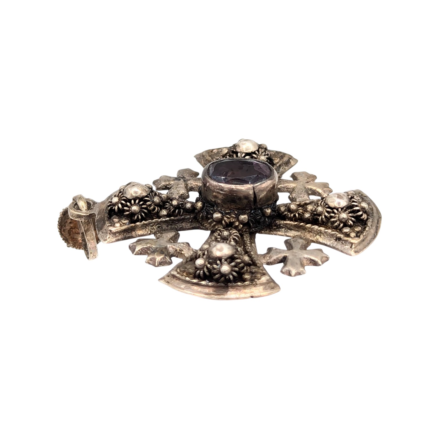 Sterling Cross Pendant with Amethyst Stone and Floral Detailing 14.53g