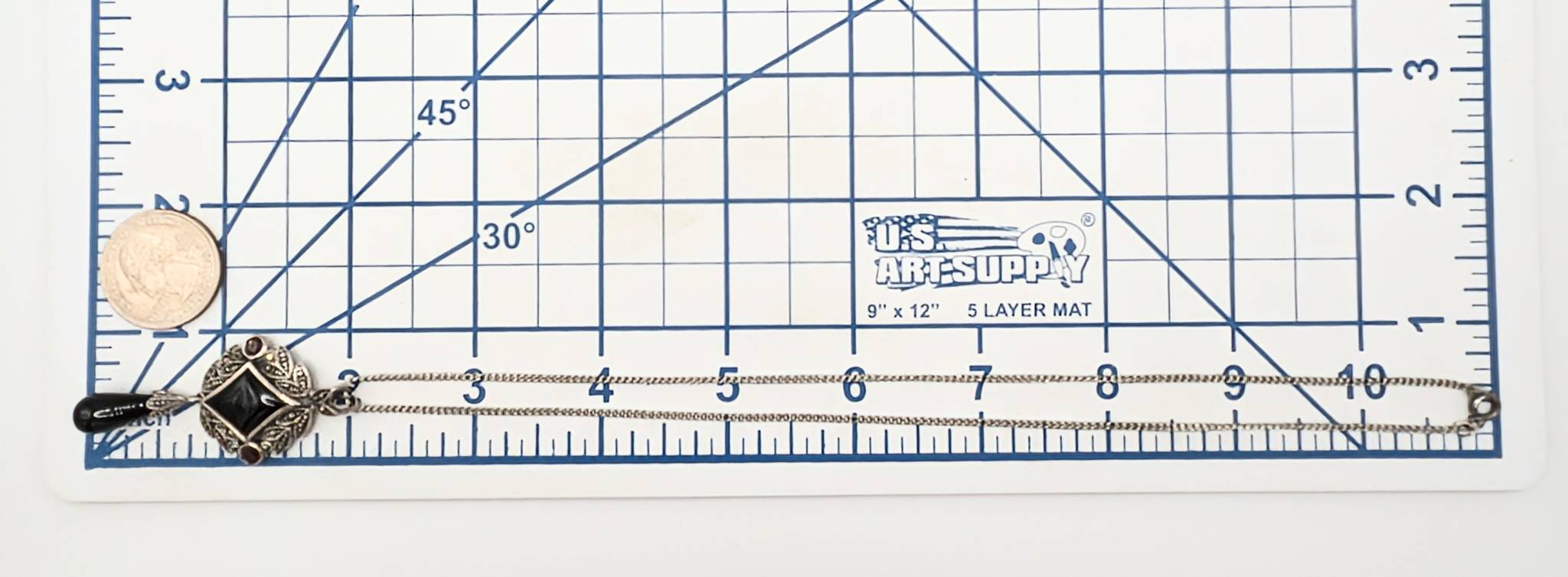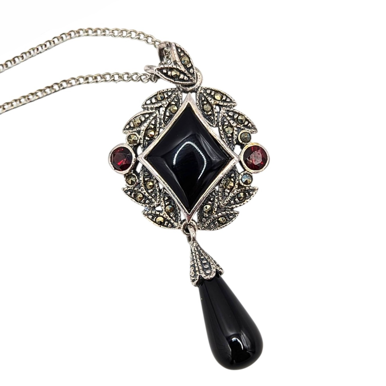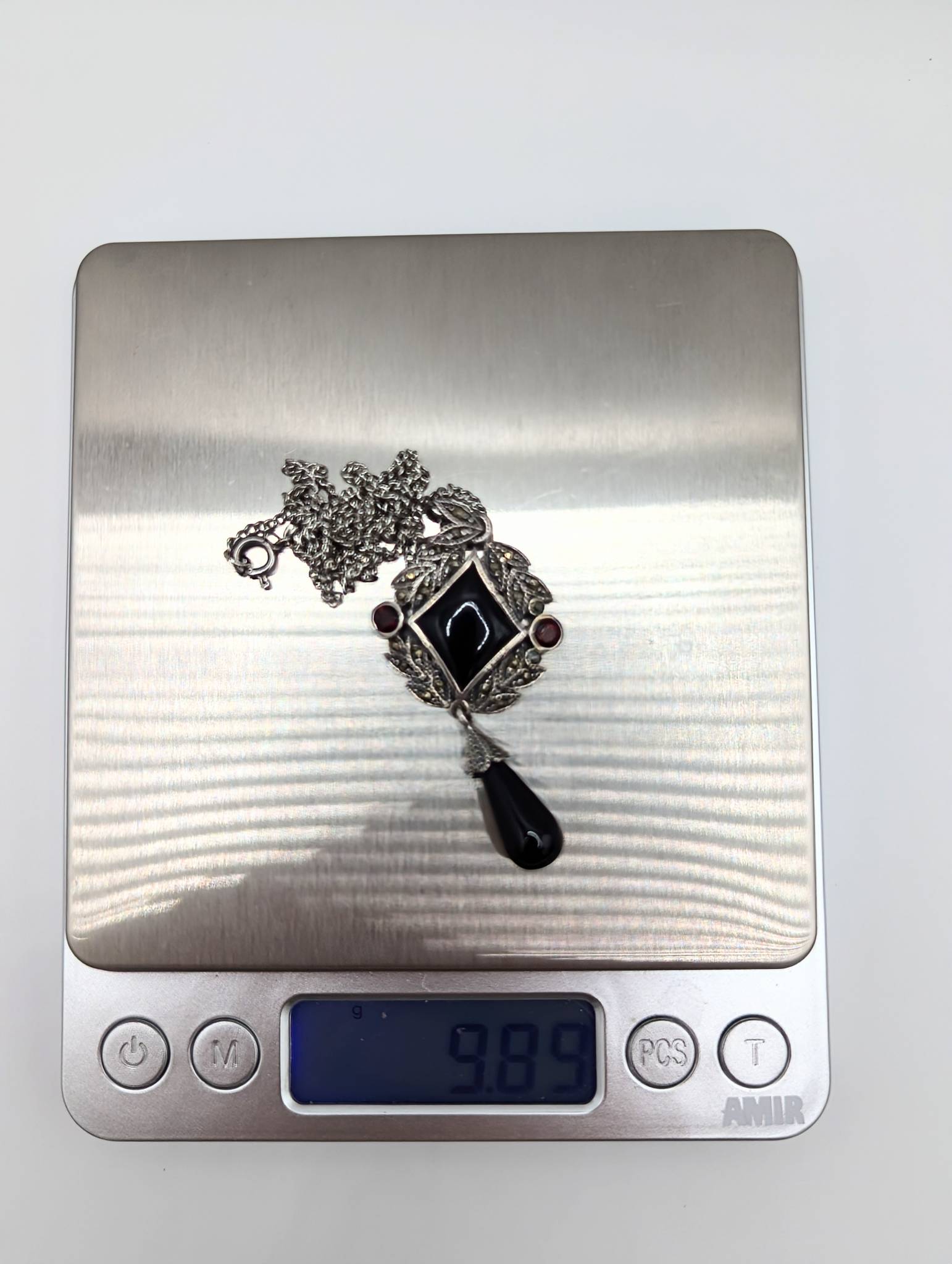 Sterling Curb Chain Necklace with Marcasite, 2 Red Garnet, Onyx center and Teardrop Pendant 9.89g SU