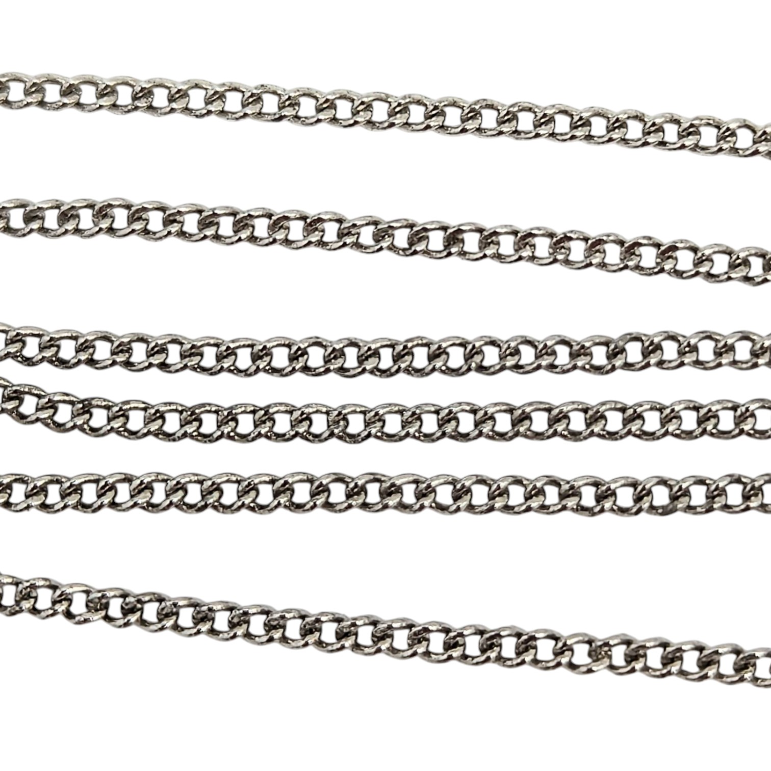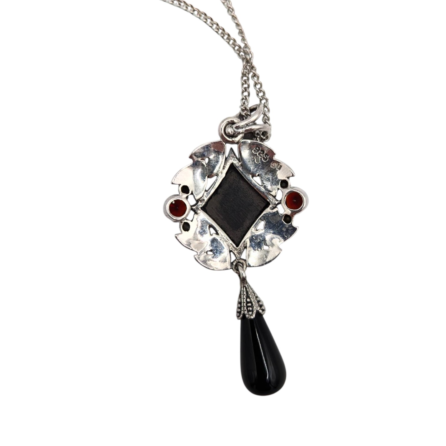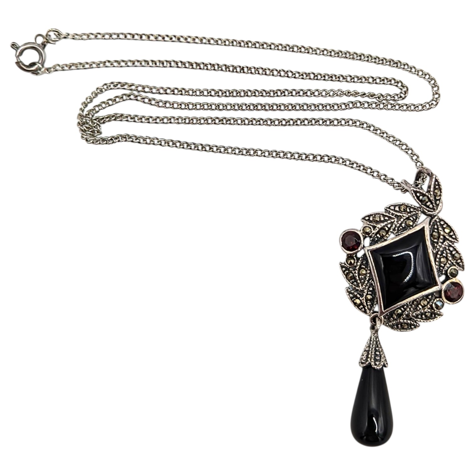 Sterling Curb Chain Necklace with Marcasite, 2 Red Garnet, Onyx center and Teardrop Pendant 9.89g SU