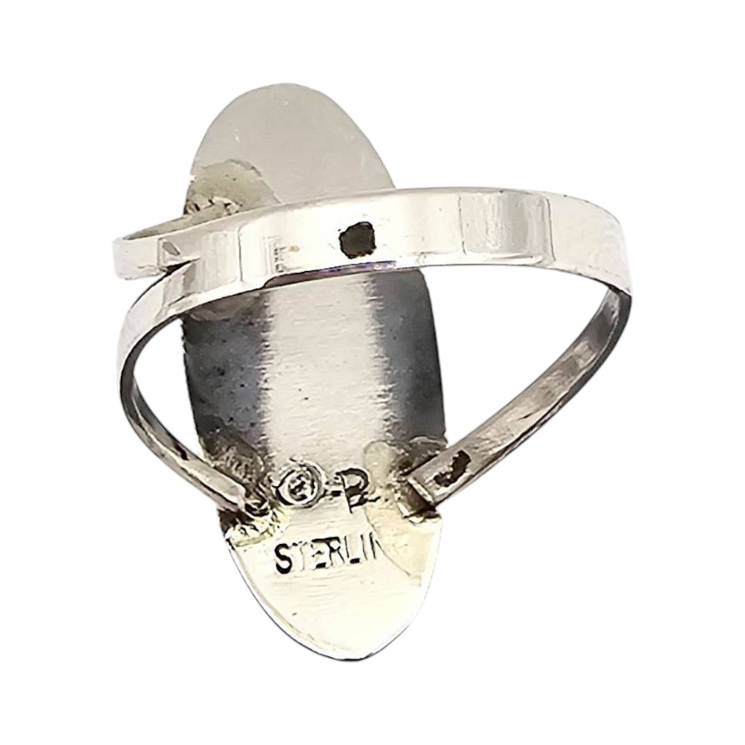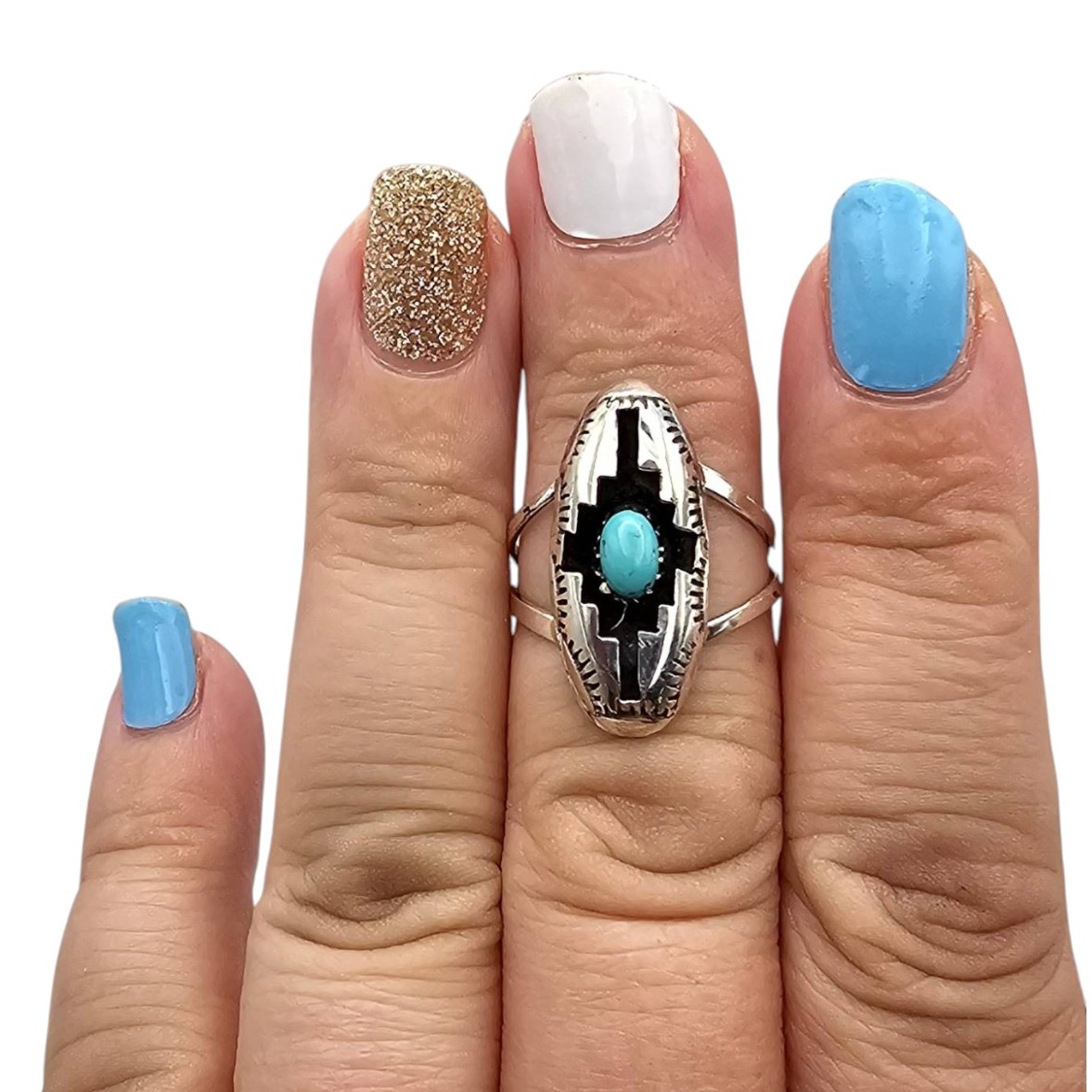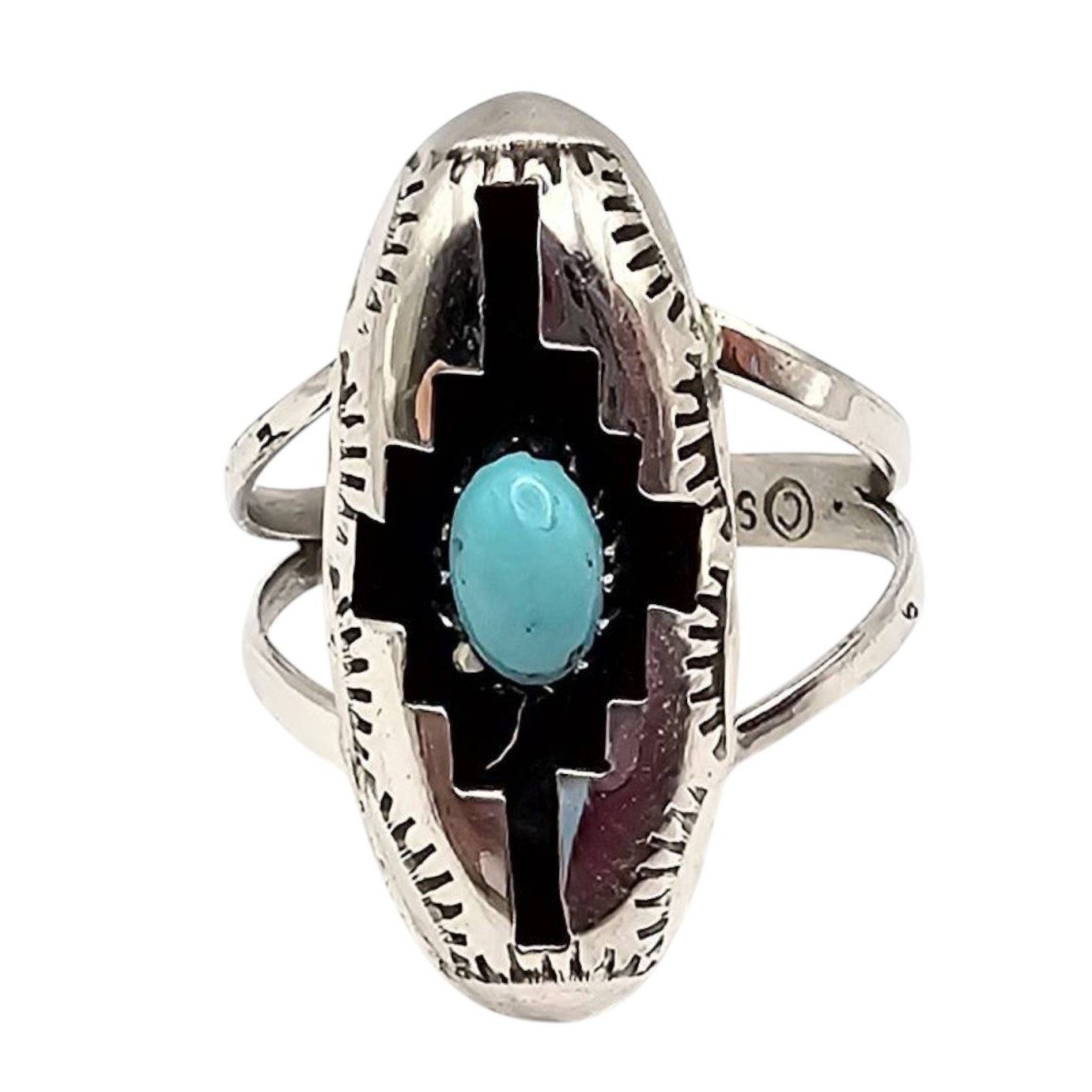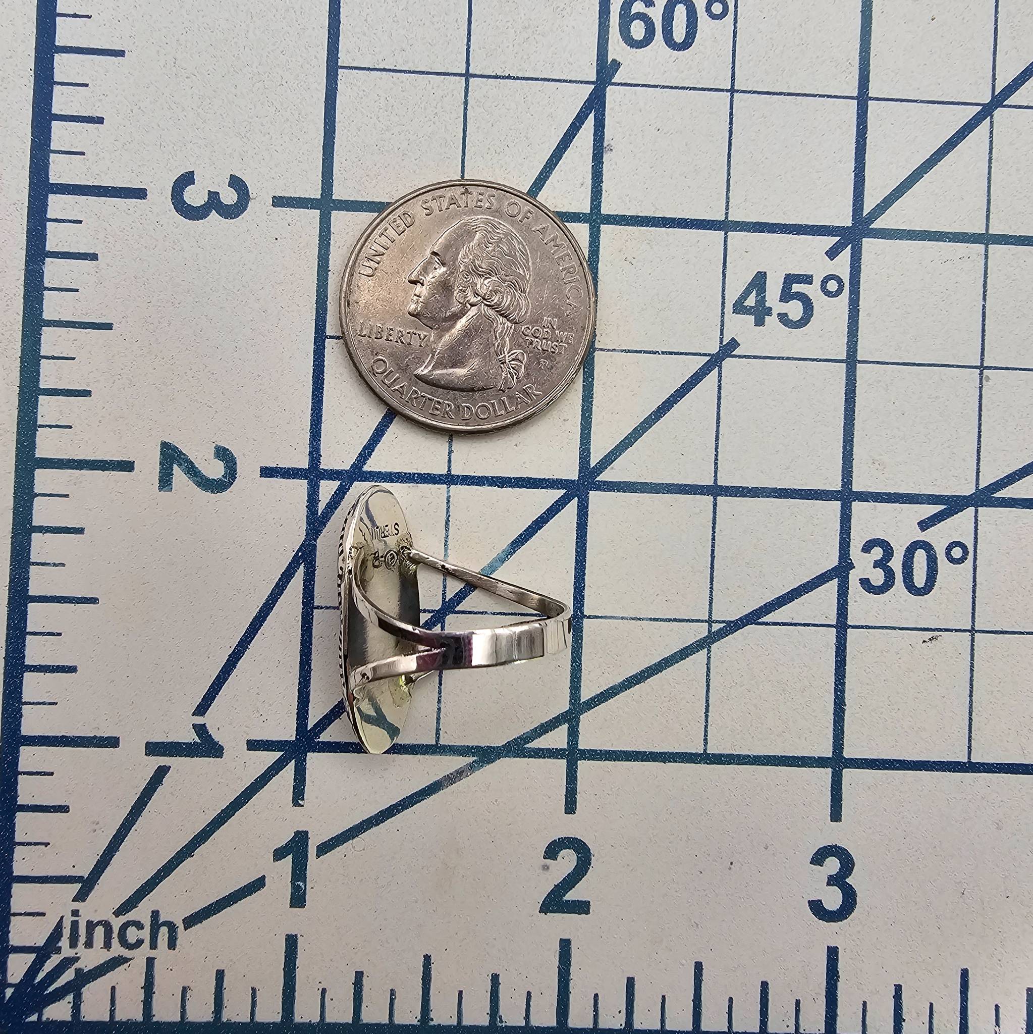 Sterling silver ring handcrafted by Navajo artisan Felix Perry, featuring an oval-shaped face with a turquoise stone inlay. The intricate design includes etched details along the edges for added texture. Stamped ‘F P’ and ‘Sterling’ on the underside. The ring is a size 6.75 and weighs approximately 2.2 grams. Includes a size reference with a US quarter for scale.