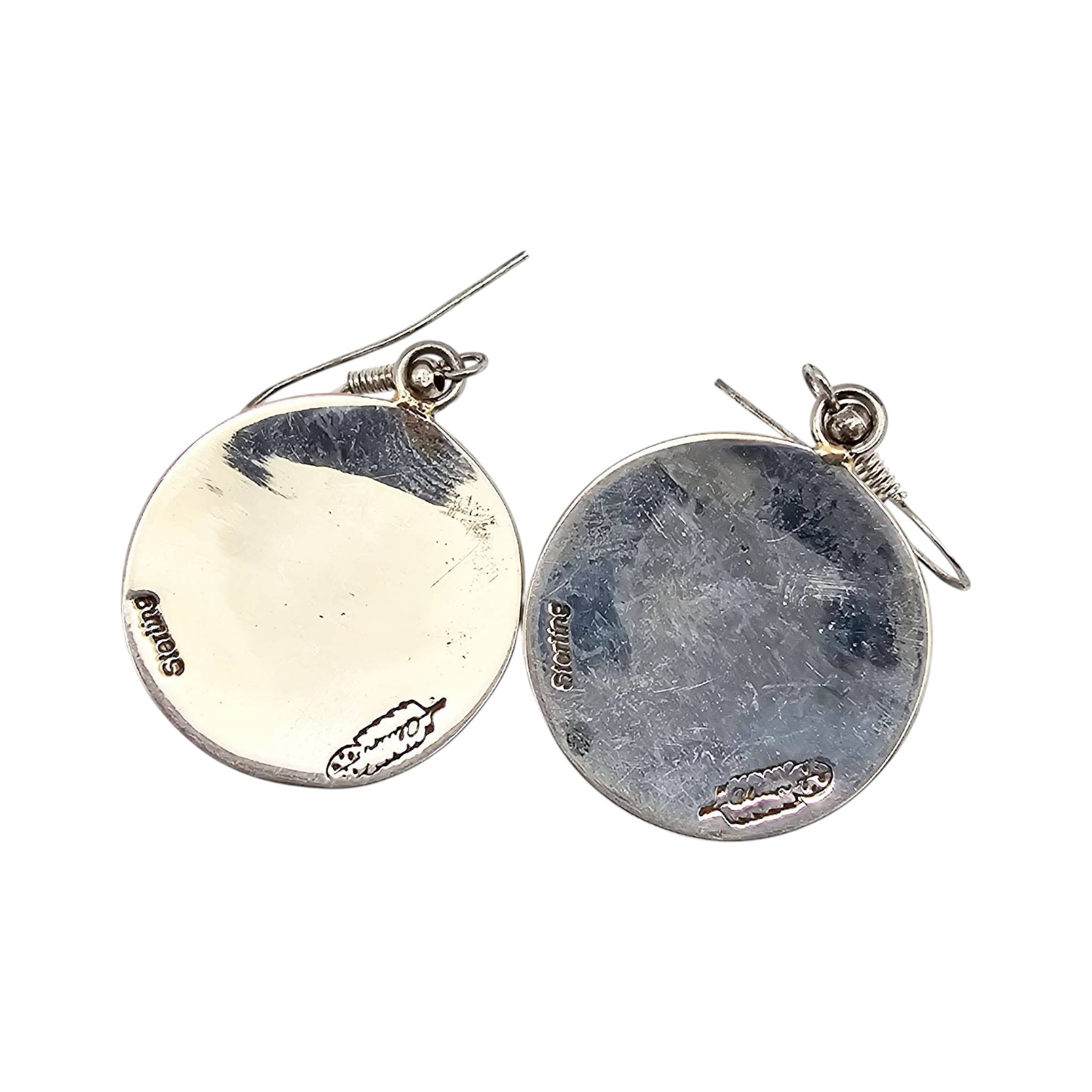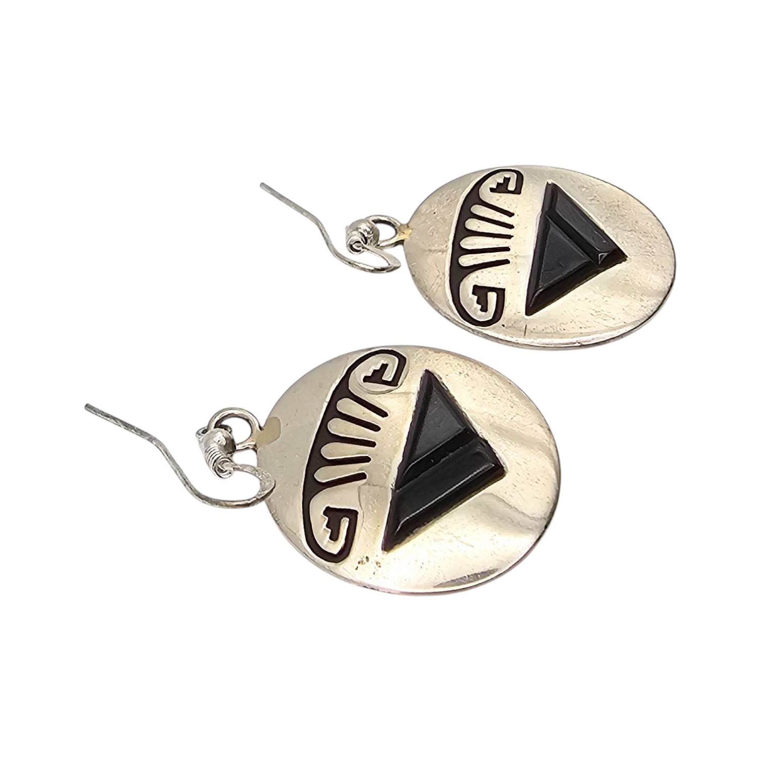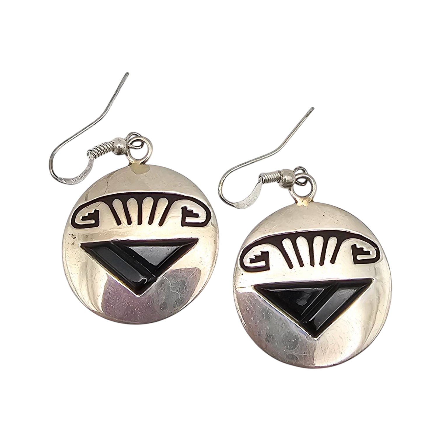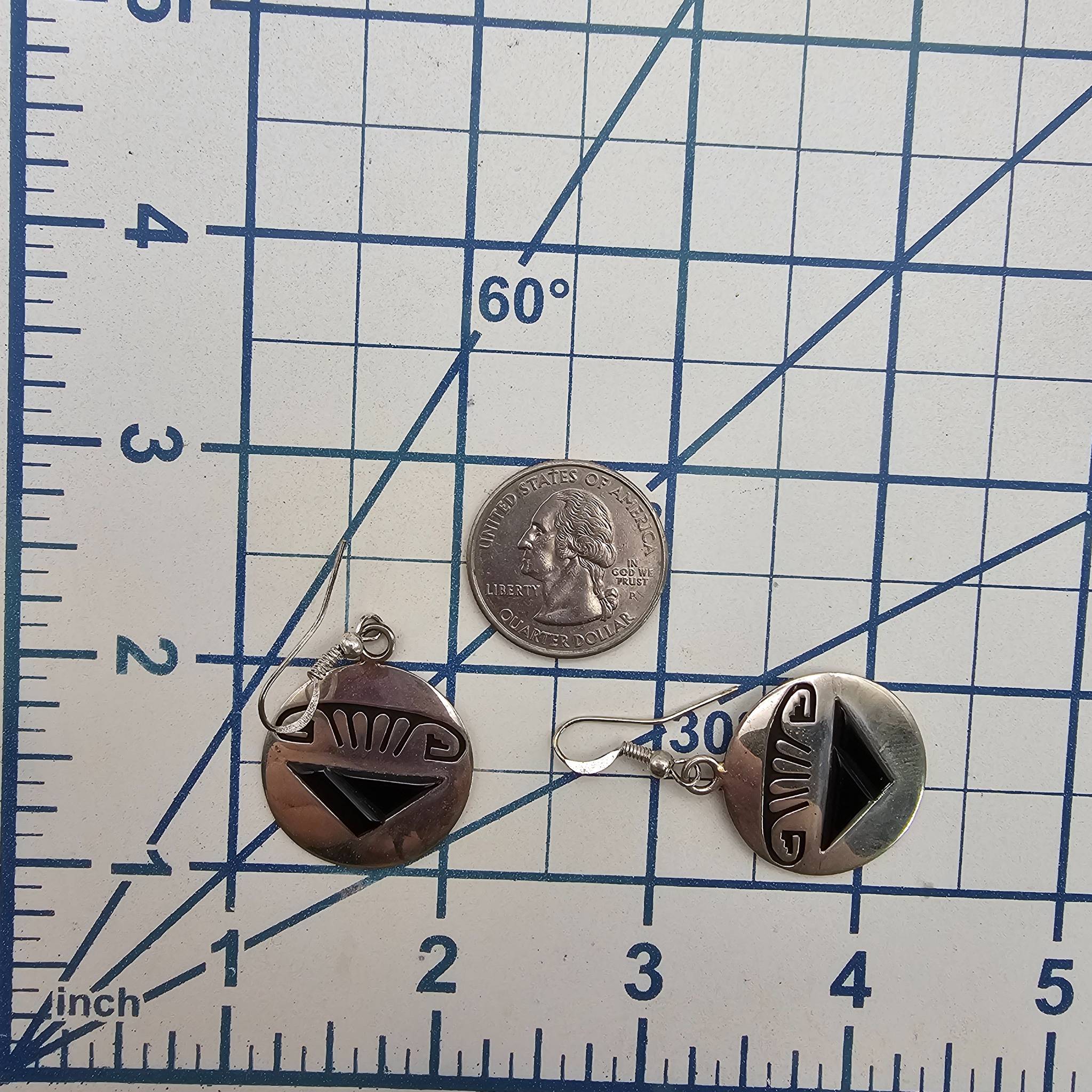 Handmade sterling silver earrings by Navajo artisan Alvin Begay. Featuring a design with black onyx geometric motifs and traditional details. Each earring is marked with ‘Sterling’ and the artisan’s hallmark. Weight is approximately 8.5 grams as shown. Includes ear hooks for wear. Diameter roughly 1 inch.