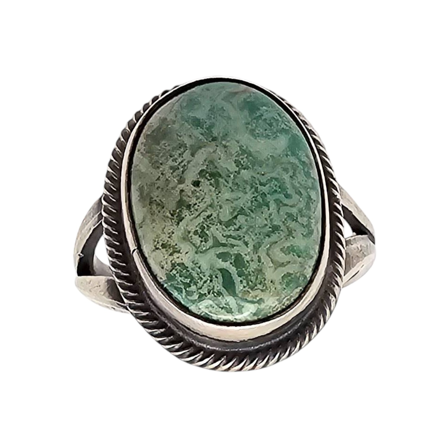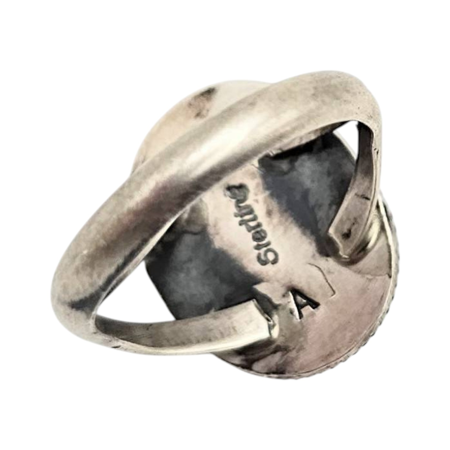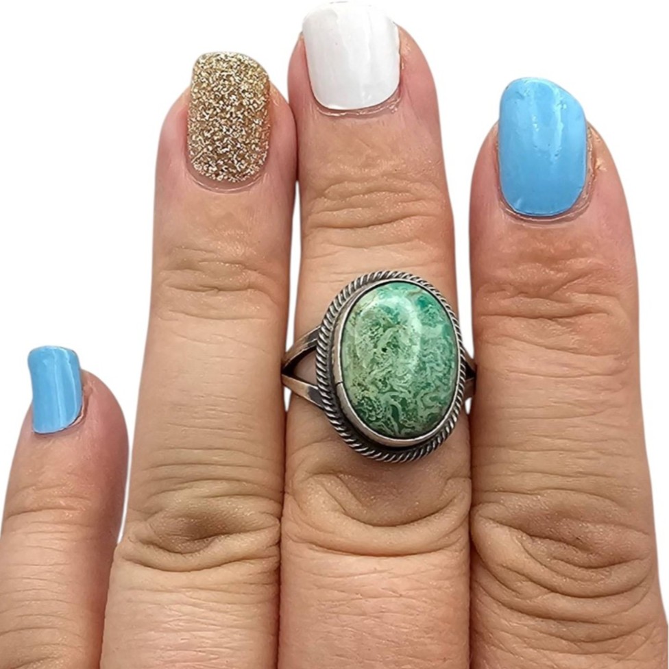 Arthur Martinez Navajo handmade sterling silver ring featuring a vibrant Royston turquoise stone, set in a rope-edged bezel setting. The ring is a size 7.5 and weighs 6.4 grams. The interior of the ring is stamped ‘Sterling’ and ‘A’, confirming its authenticity and material. A detailed handmade design representative of Navajo craftsmanship.