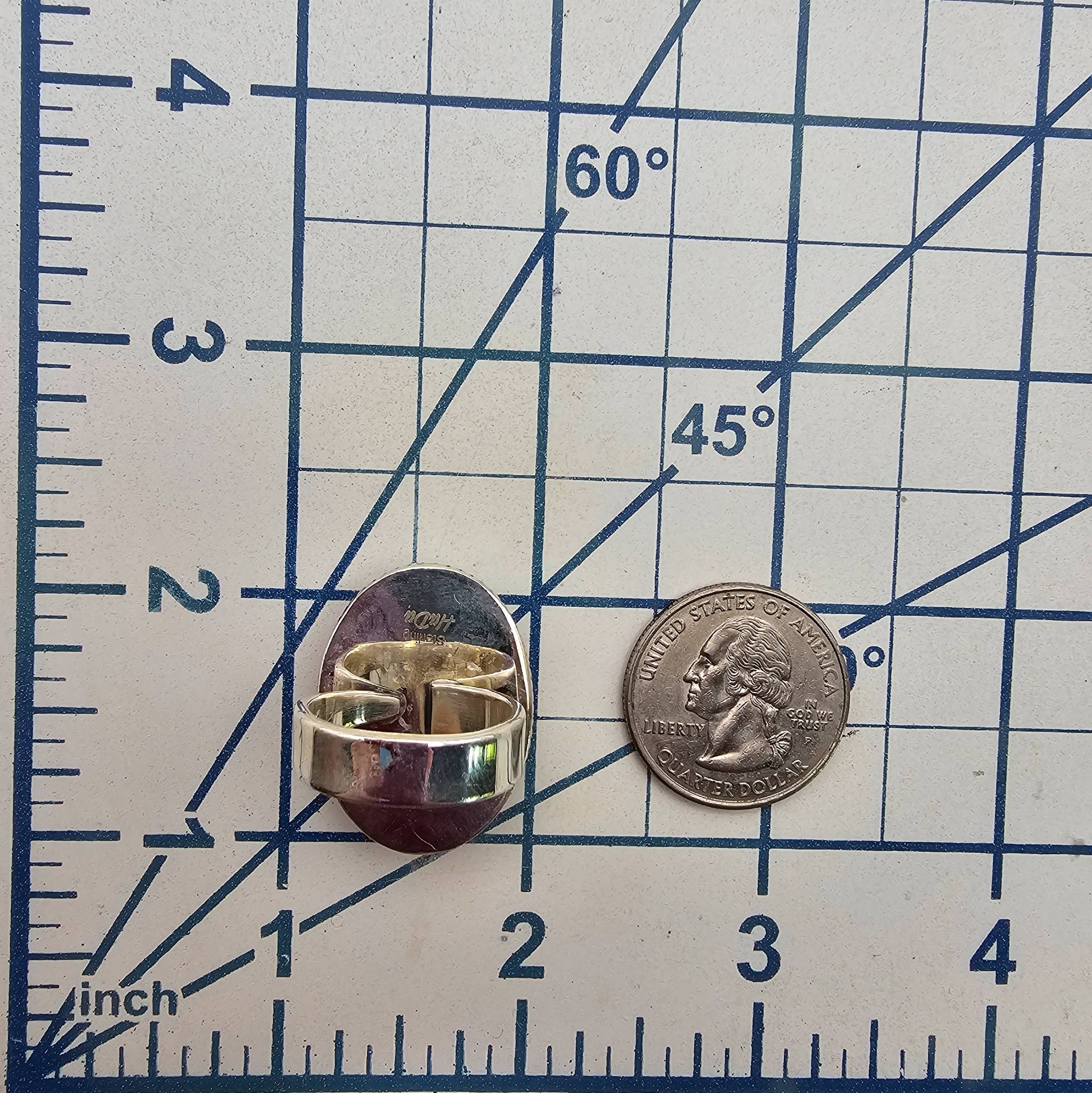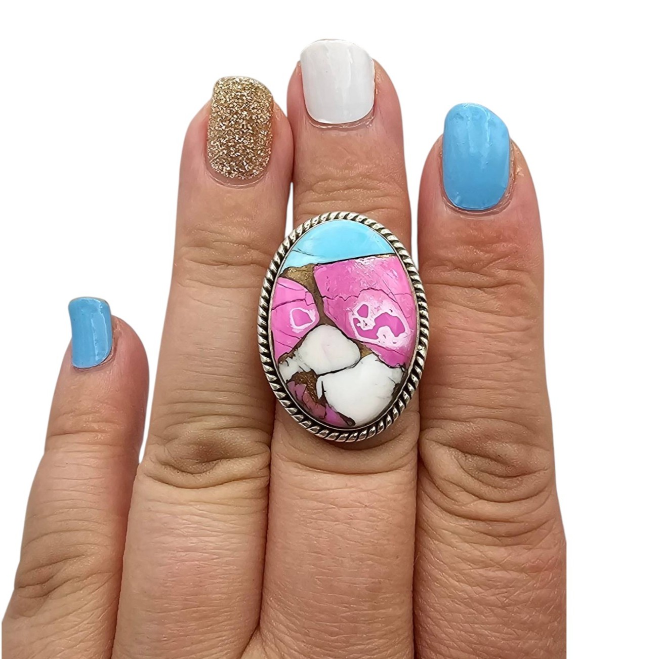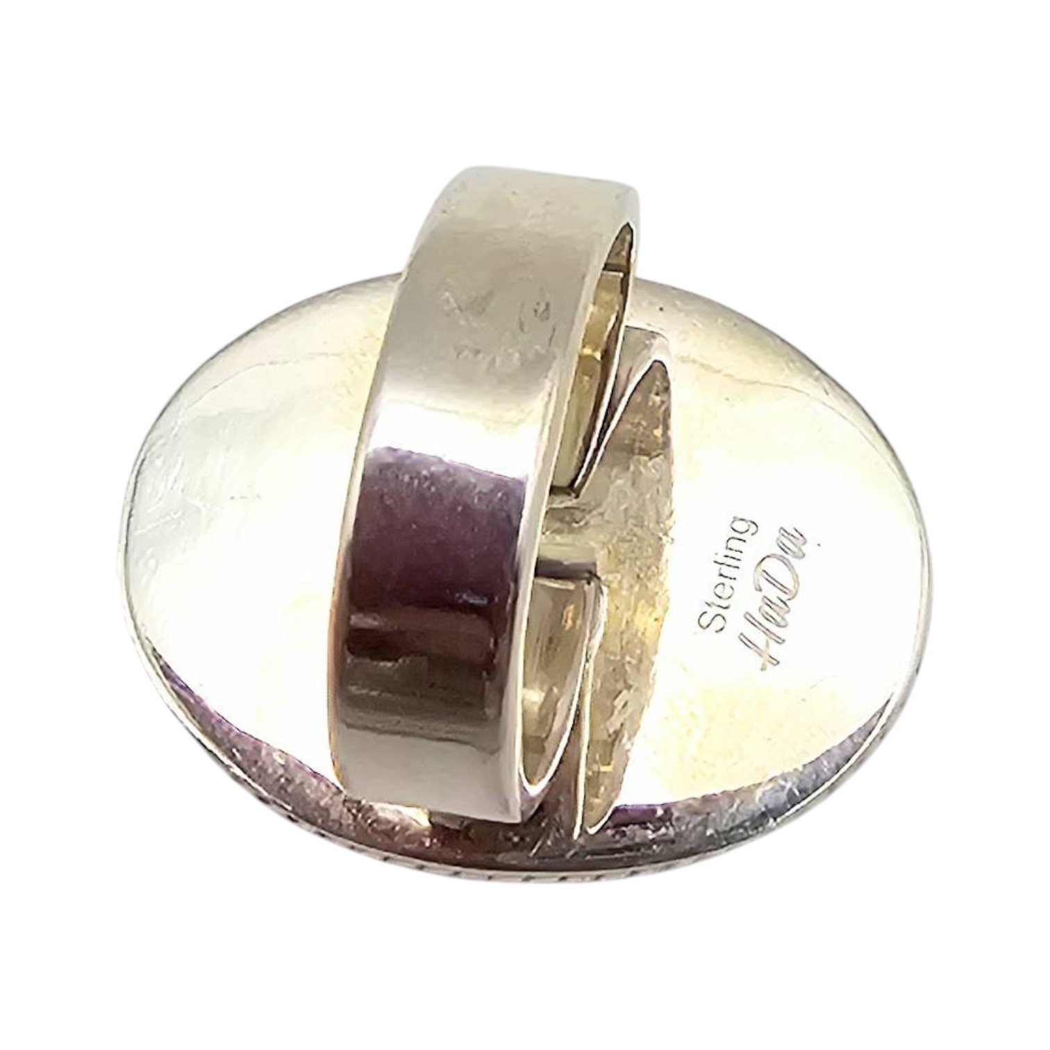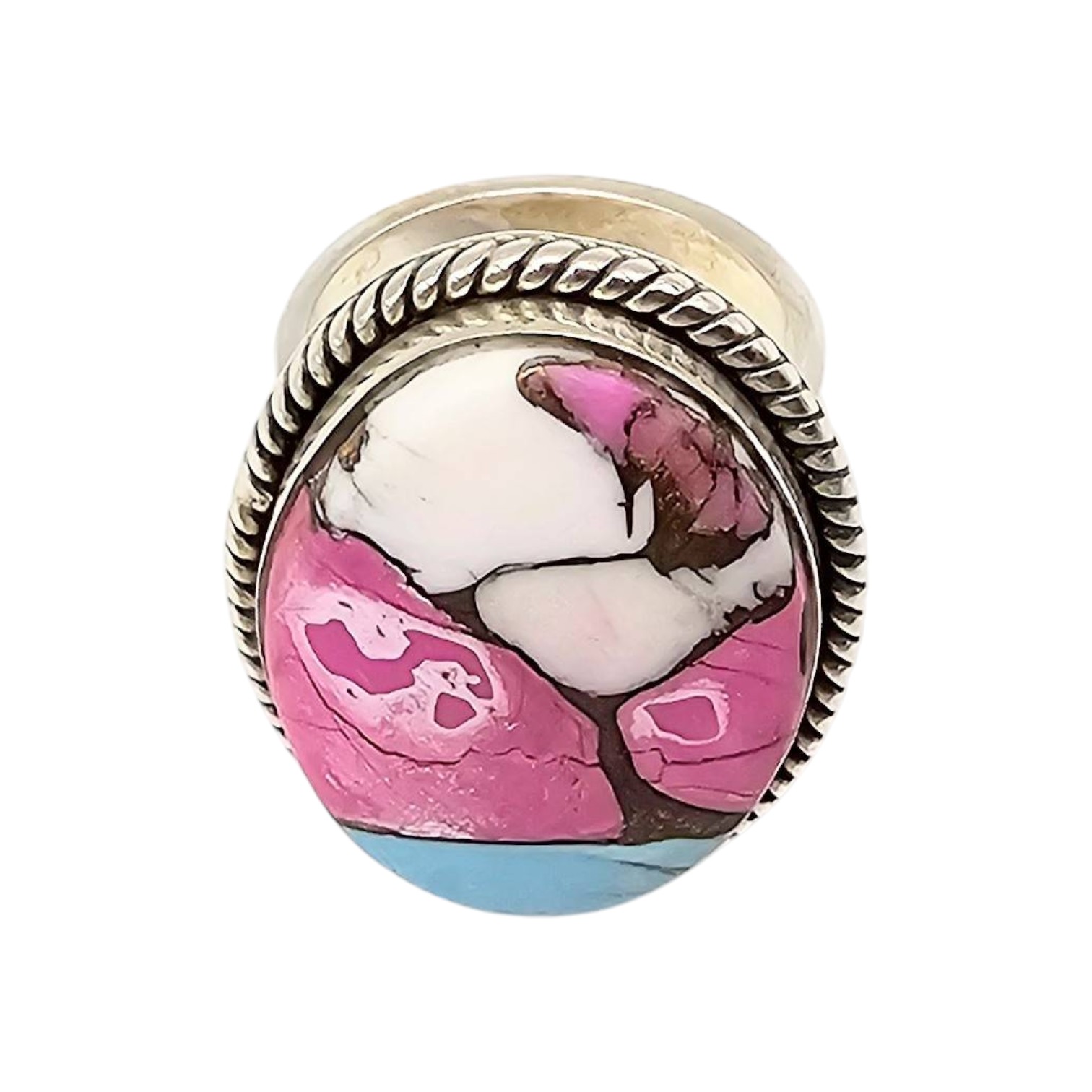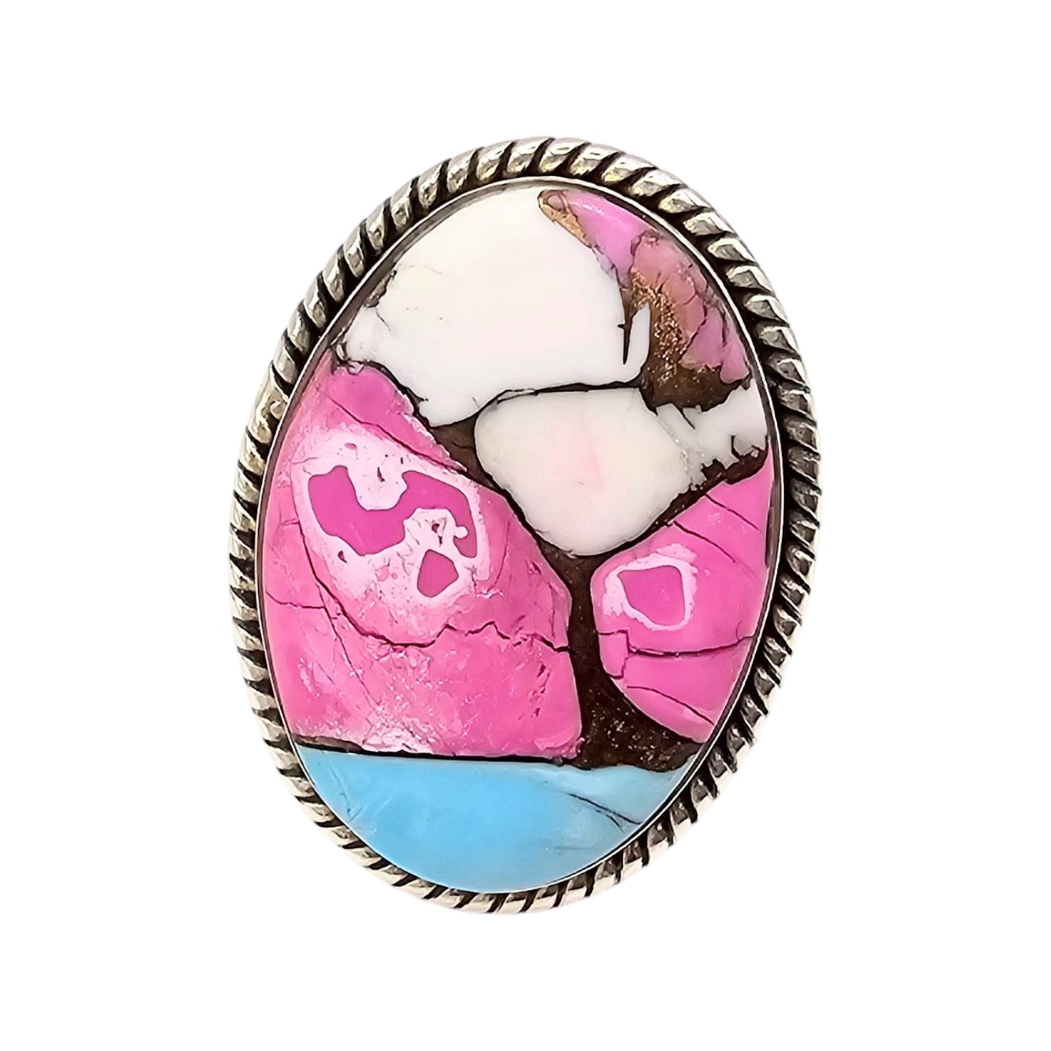 Sterling silver adjustable ring from the Hada Collection, featuring a ‘Cotton Candy’ design. The ring showcases a pink, white, and blue stone centerpiece set in a detailed silver bezel. Stamped with ‘Sterling Silver Hada’ on the back. Weighs approximately 11.9 grams. Ring size is 7.25 but adjustable, making it a versatile fit.