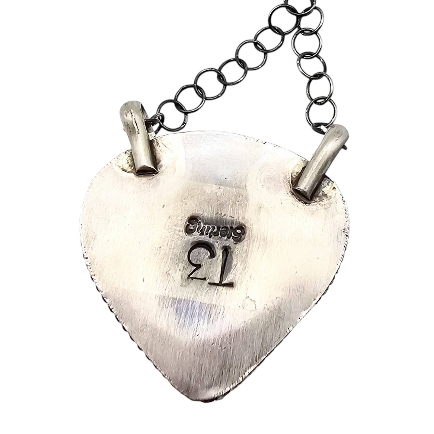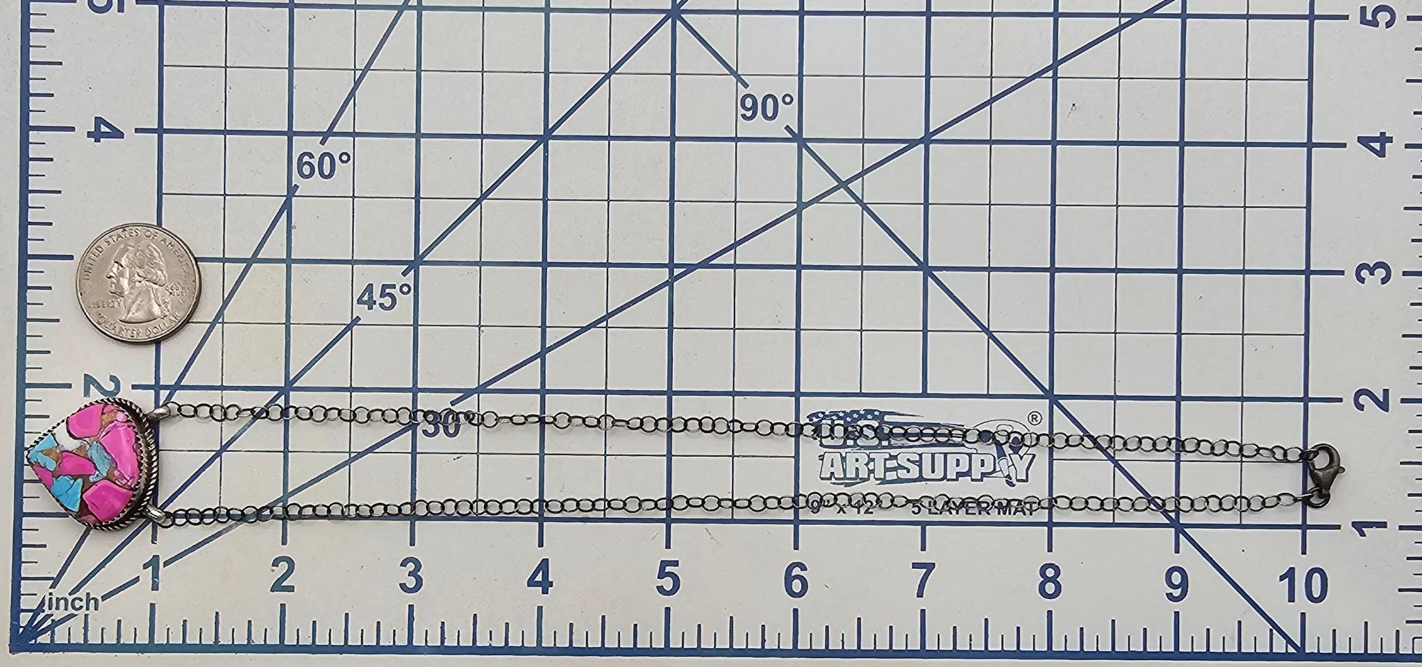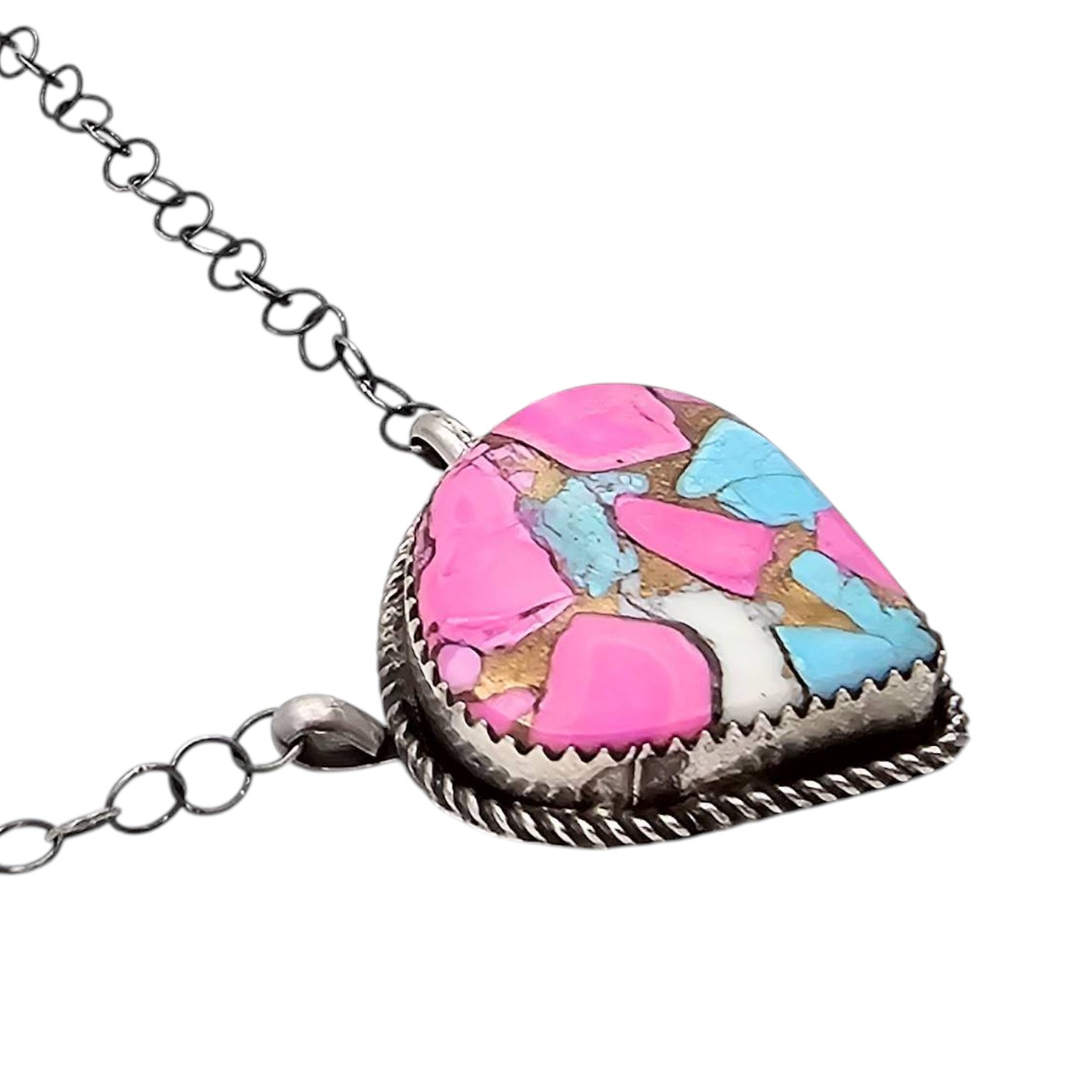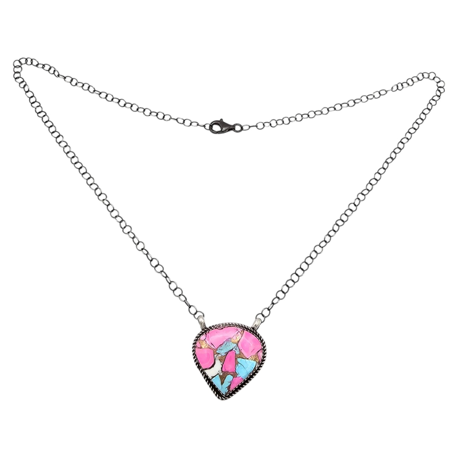 Sterling silver necklace handmade by Navajo artist Tia Long, featuring a teardrop-shaped pendant with a mosaic inlay of pink, blue, and white stones, resembling a ‘cotton candy’ theme. The pendant is secured on a silver chain with a lobster clasp. Total weight is approximately 9.6 grams. Hallmarked on the back.