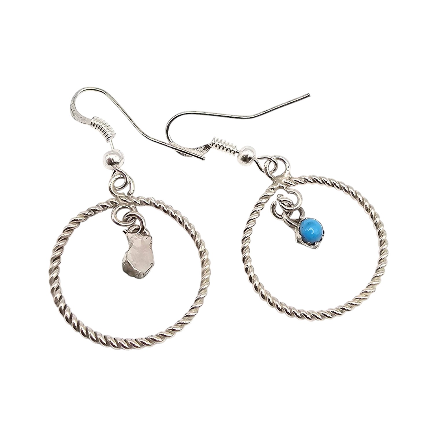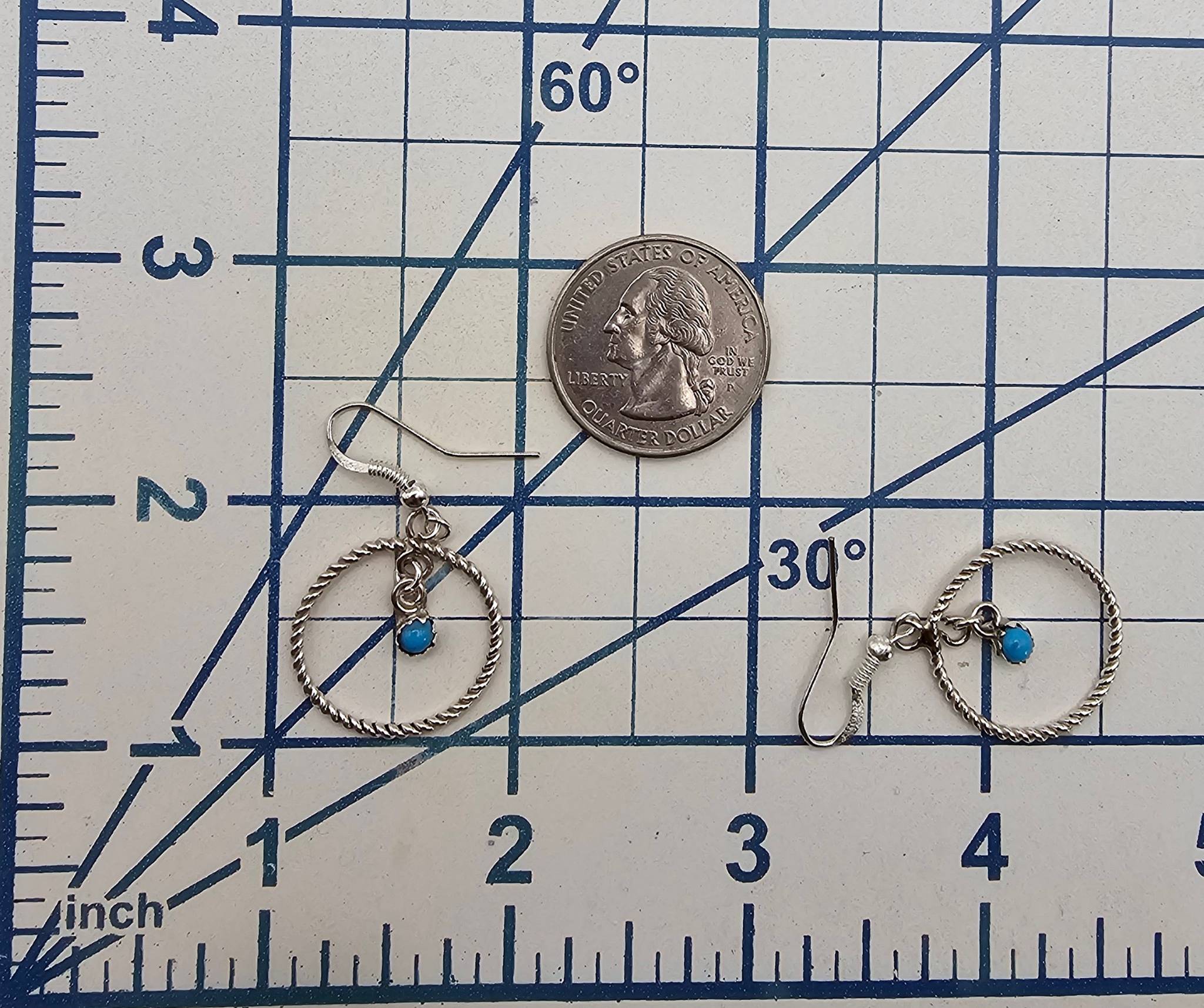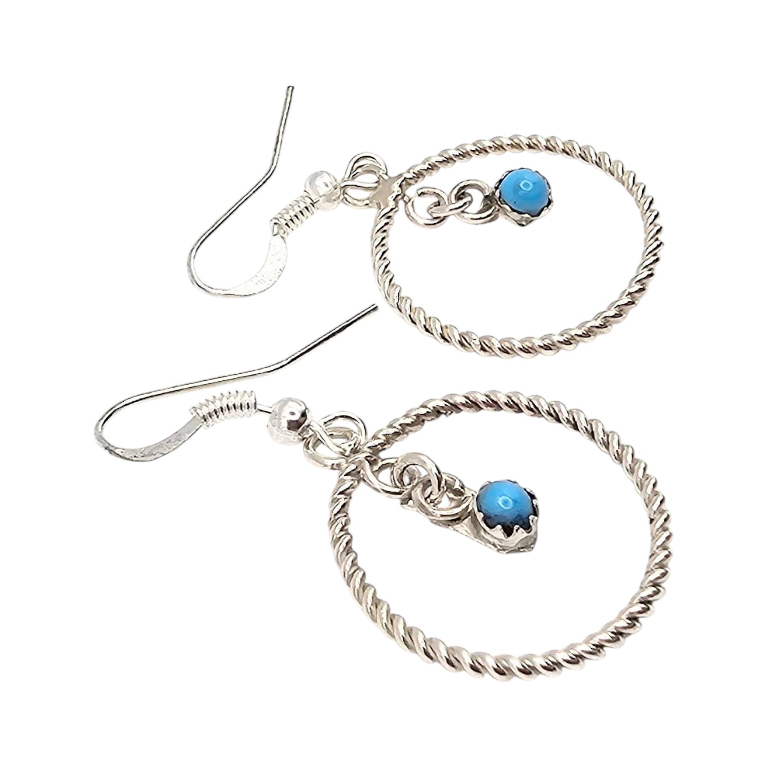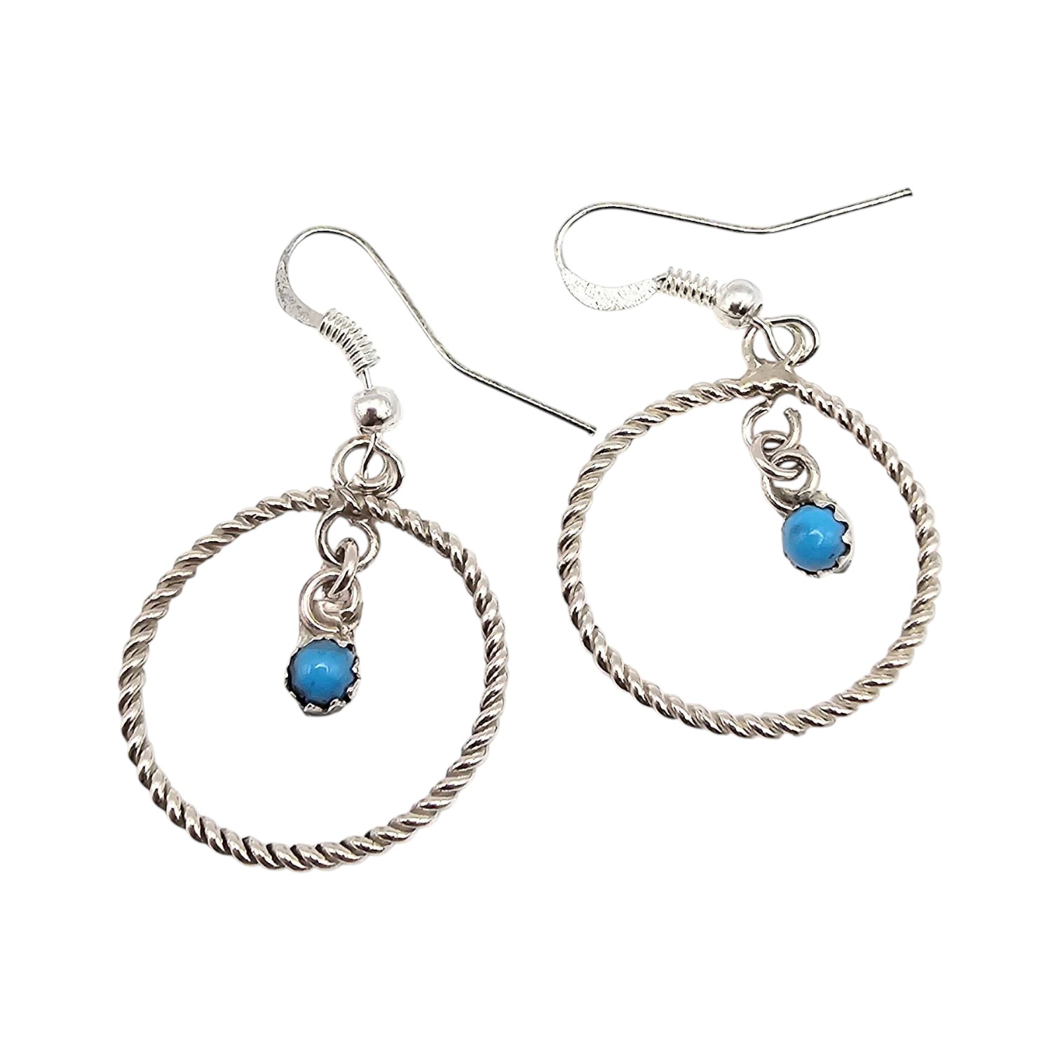 Handcrafted sterling silver circle drop earrings by Skylar Chee, a Navajo artisan. Features twisted silver circles with small turquoise stone pendants. Weighs approximately 7.6 grams. Earrings include fish hook ear wires and measure approximately 1.5 inches in diameter.