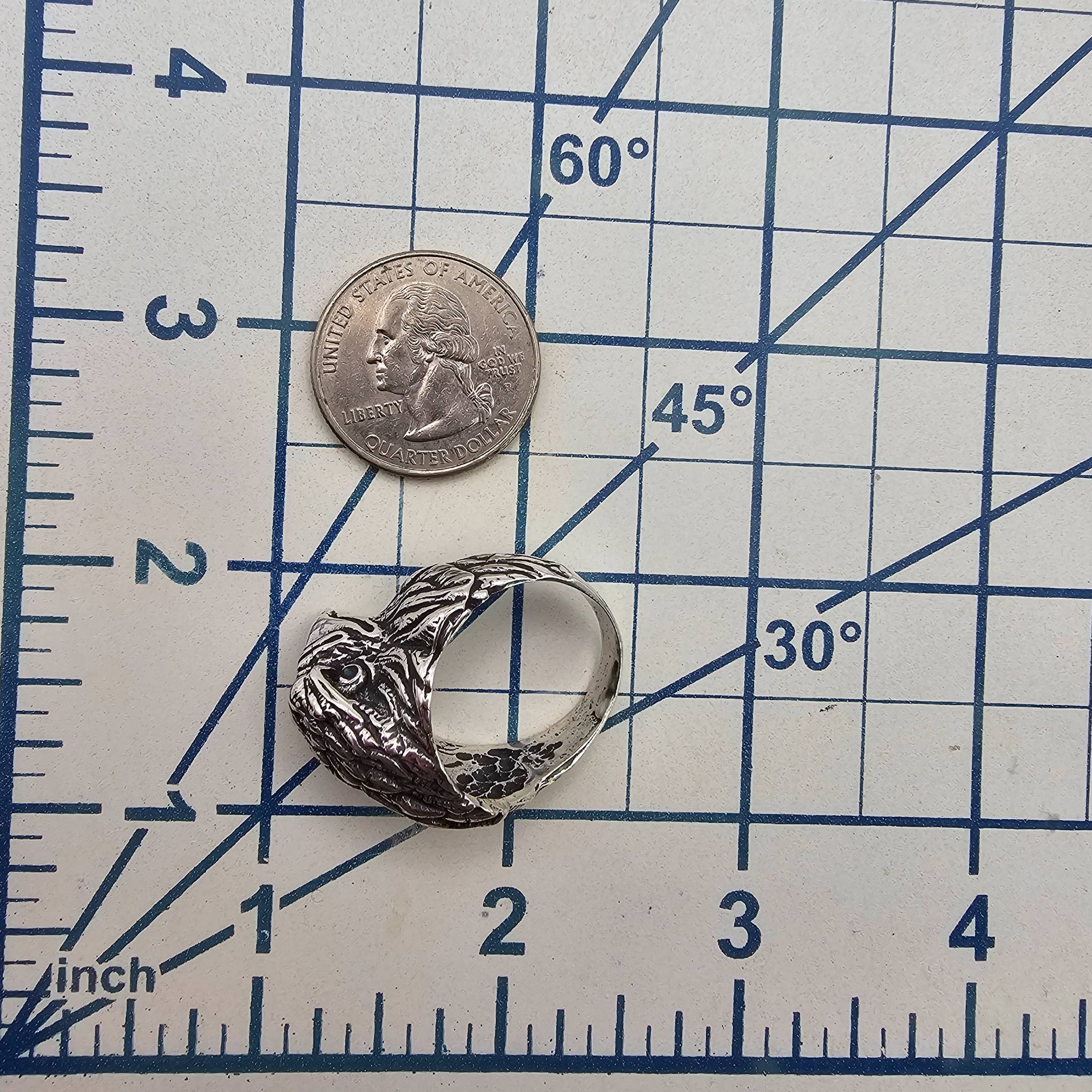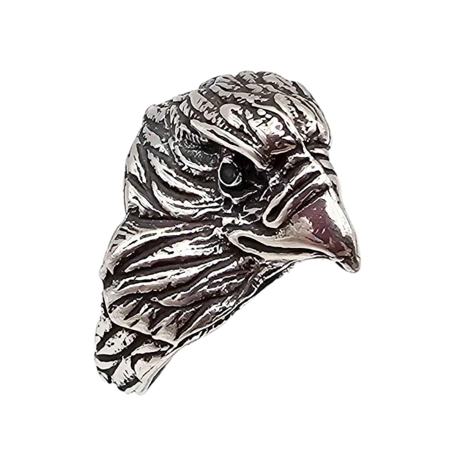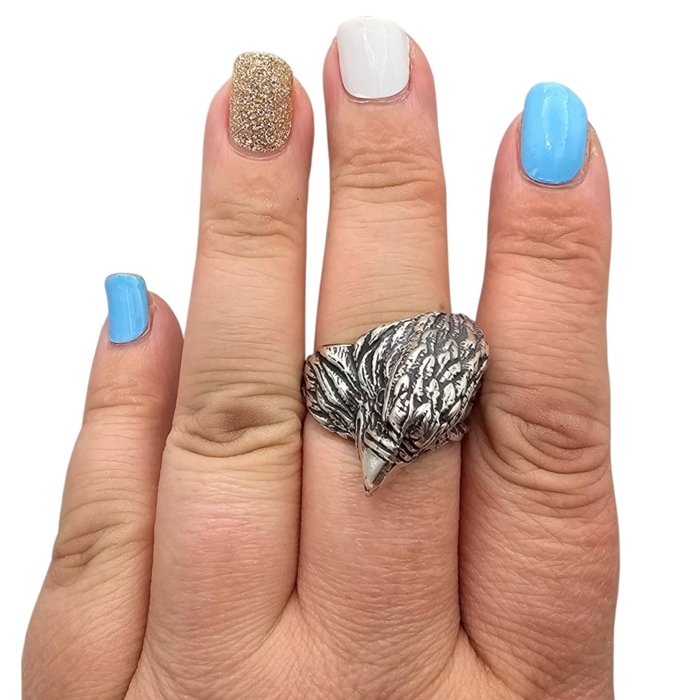 Sterling silver ring featuring an intricately detailed eagle head design. The ring is size 10.5 and weighs approximately 11.7 grams. Crafted with textural detailing to depict feathers and a realistic beak. Perfect for collectors or as a bold statement piece.