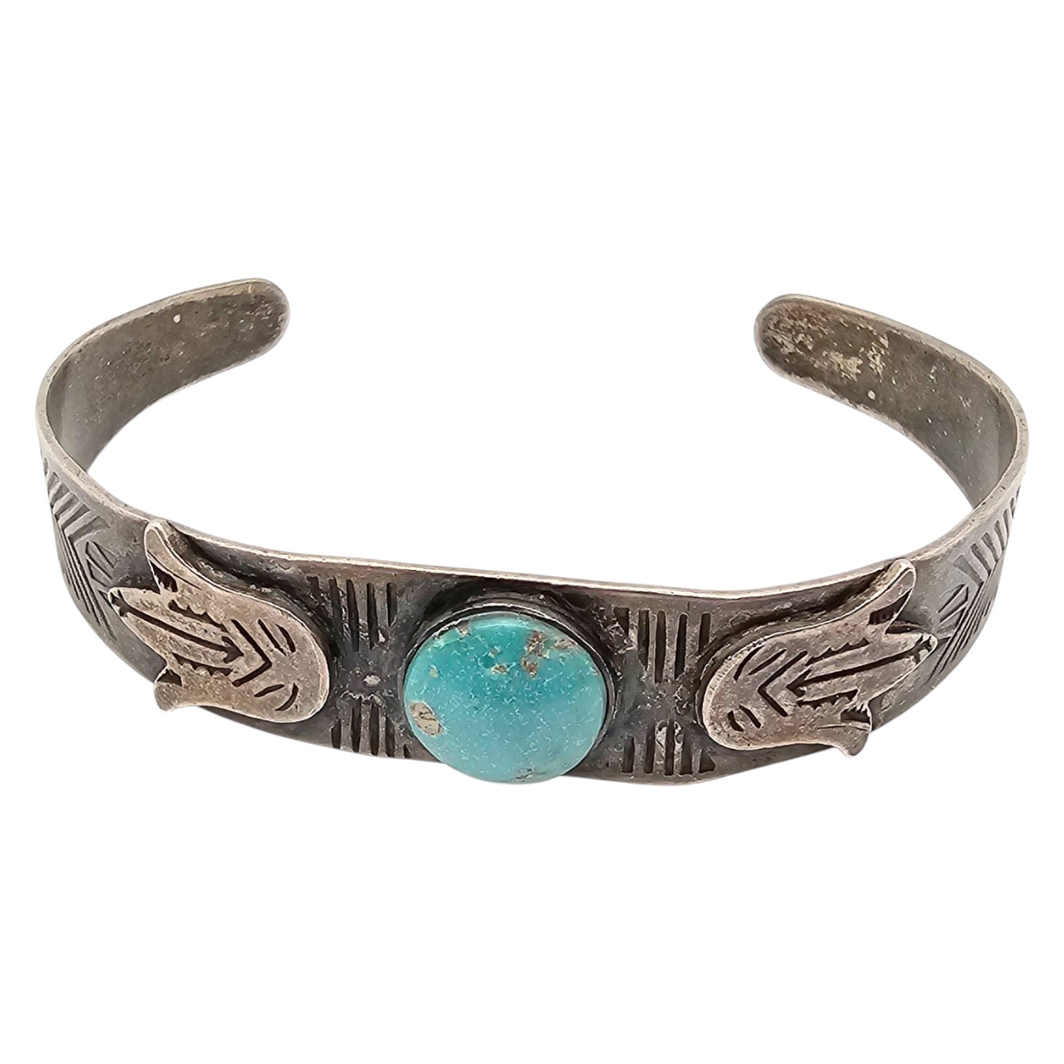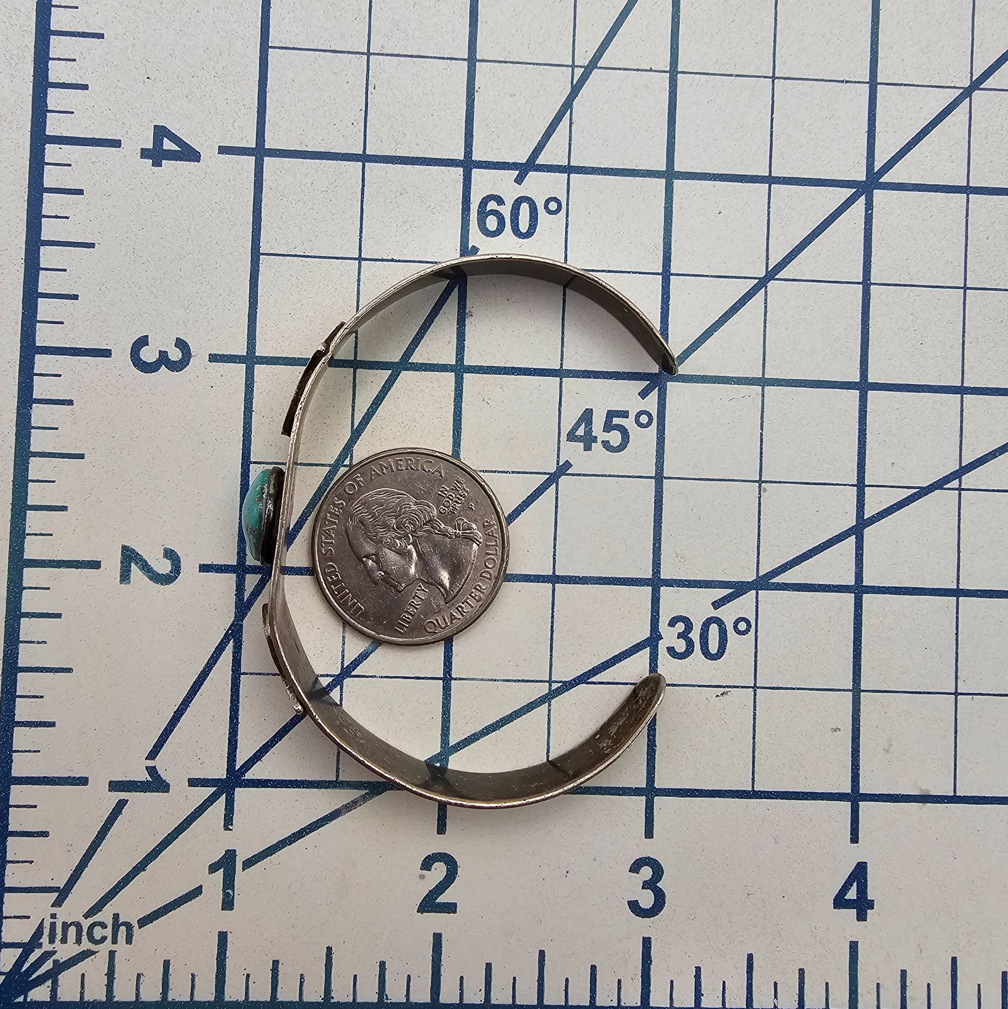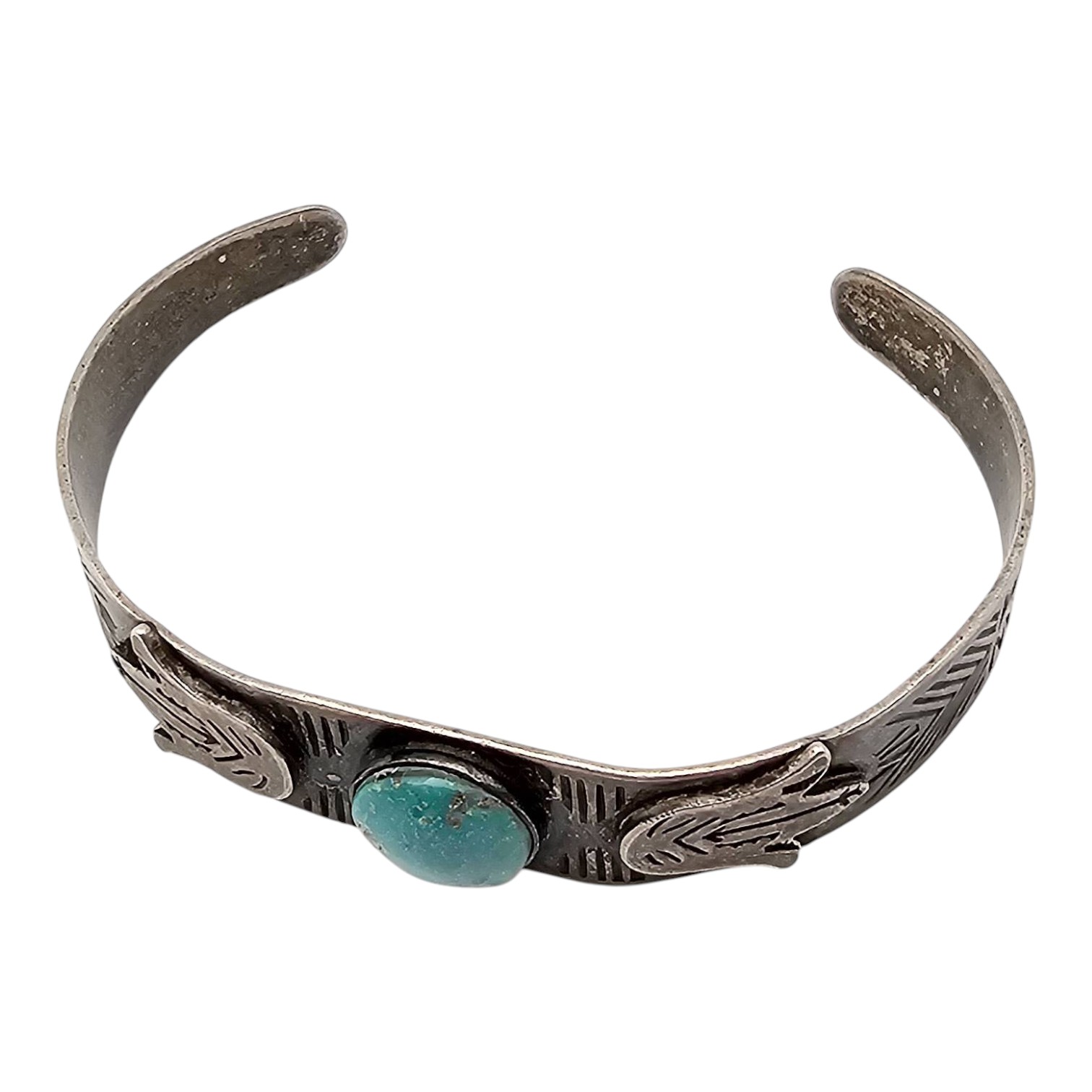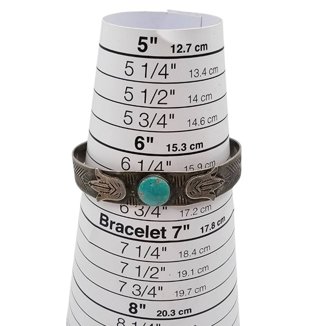 Sterling silver cuff bracelet featuring a natural turquoise stone at the center. The bracelet displays intricate Native-inspired stamped designs. Marked ‘STERLING’ on the inner band. Weighs approximately 14.8 grams. It has an inner circumference suitable for wrists measuring around 6.25 inches.
