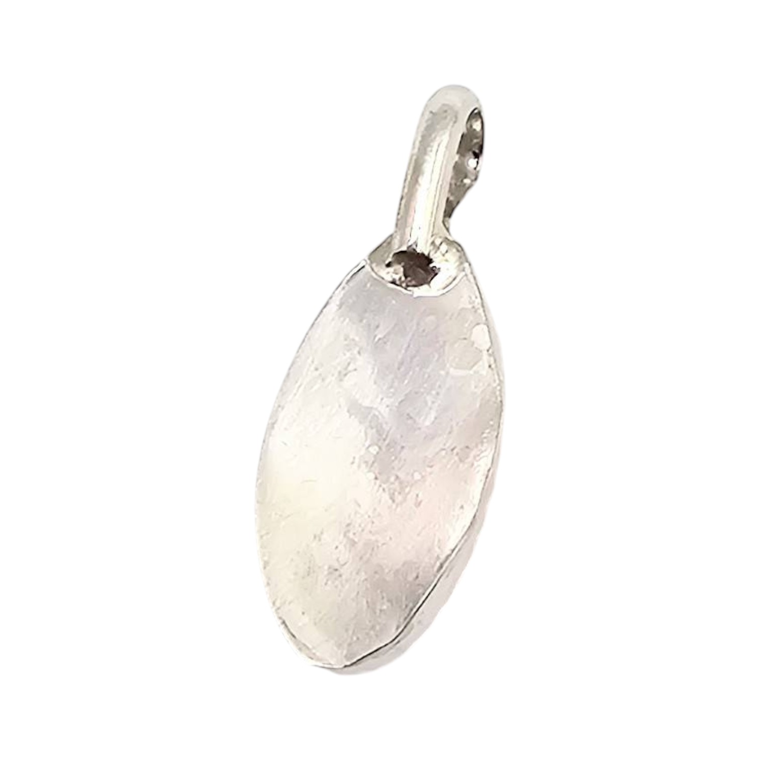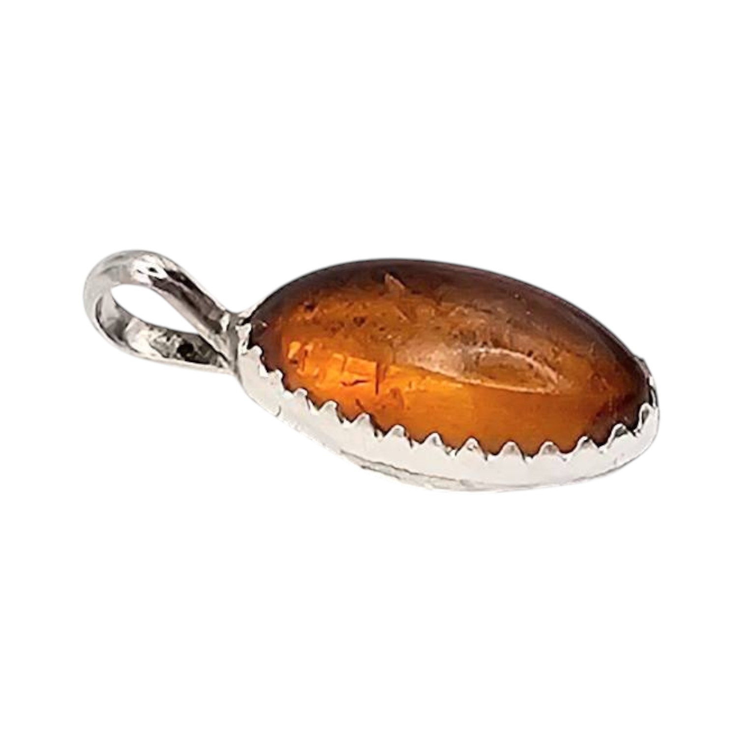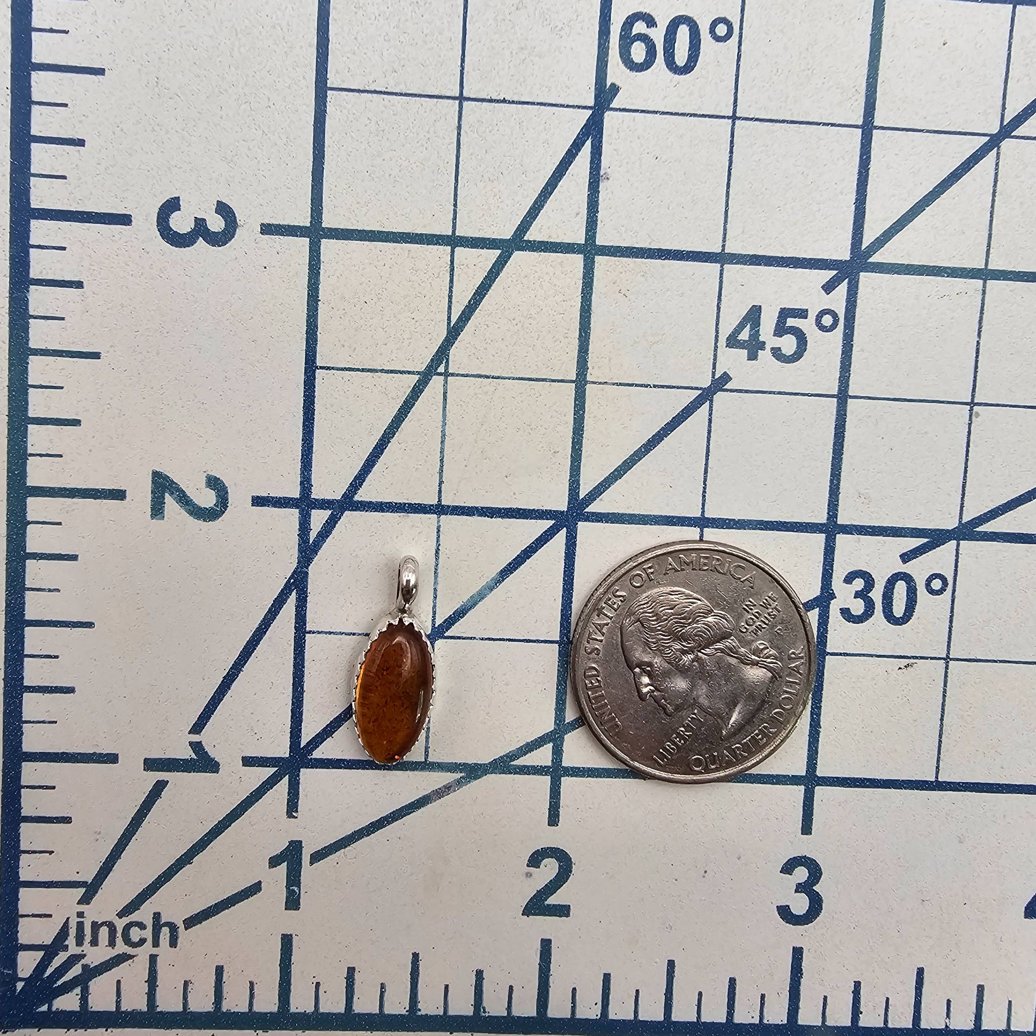 Sterling silver pendant handcrafted by Navajo artist Dorothy Yazzie. Features an amber-colored stone in an oval bezel setting with a polished silver back and integrated bail for a chain. Weighs approximately 0.7 grams. Dimensions are visible in relation to an inch-scaled grid and a U.S. coin for reference.