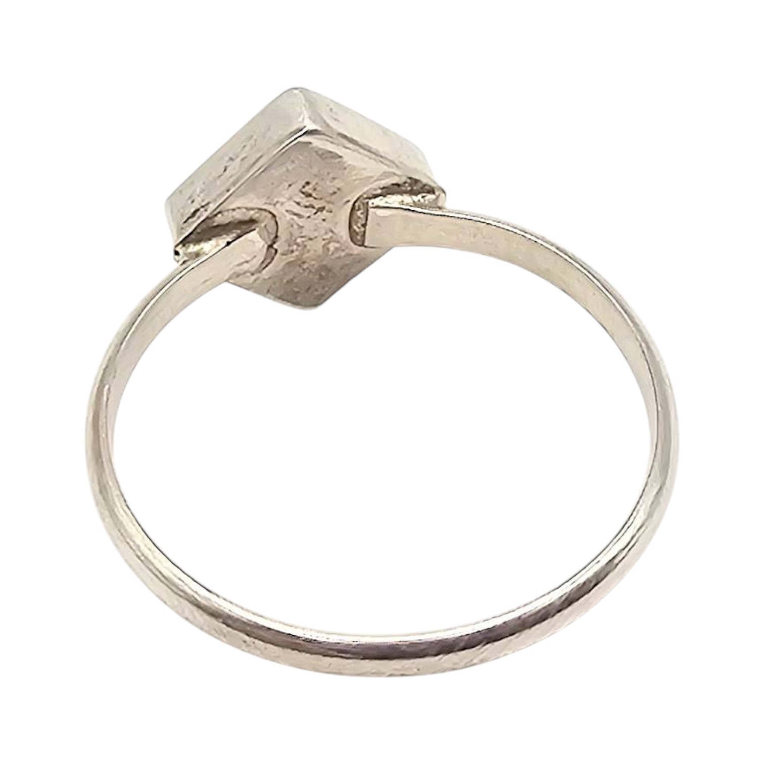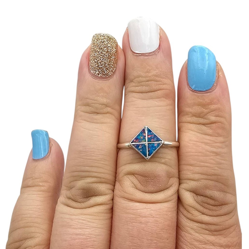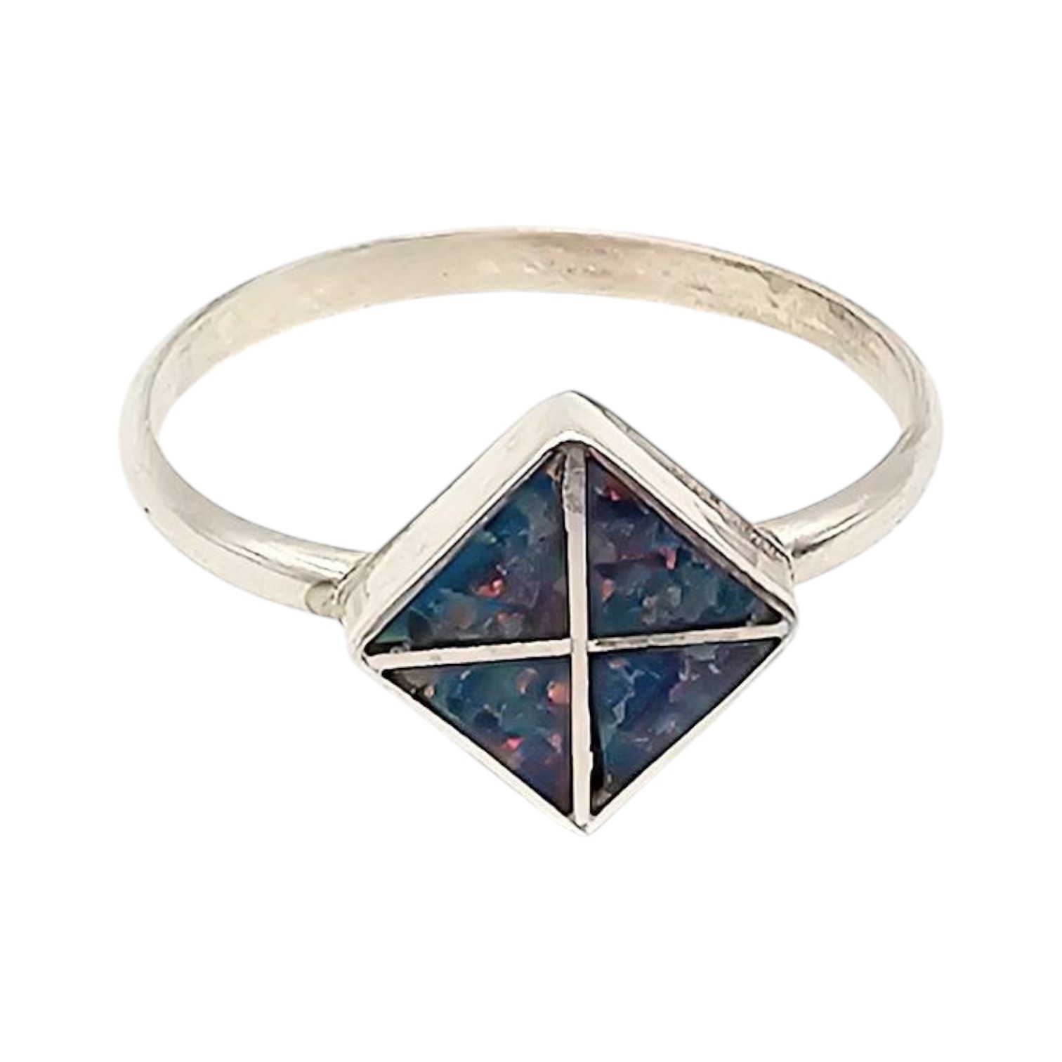 Handmade sterling silver ring by Swain Charlie, a Zuni artisan, featuring a square-shaped opal inlay design. Weighs approximately 1.4 grams. The ring is size 8 and showcases the intricate craftsmanship of Zuni jewelry tradition.