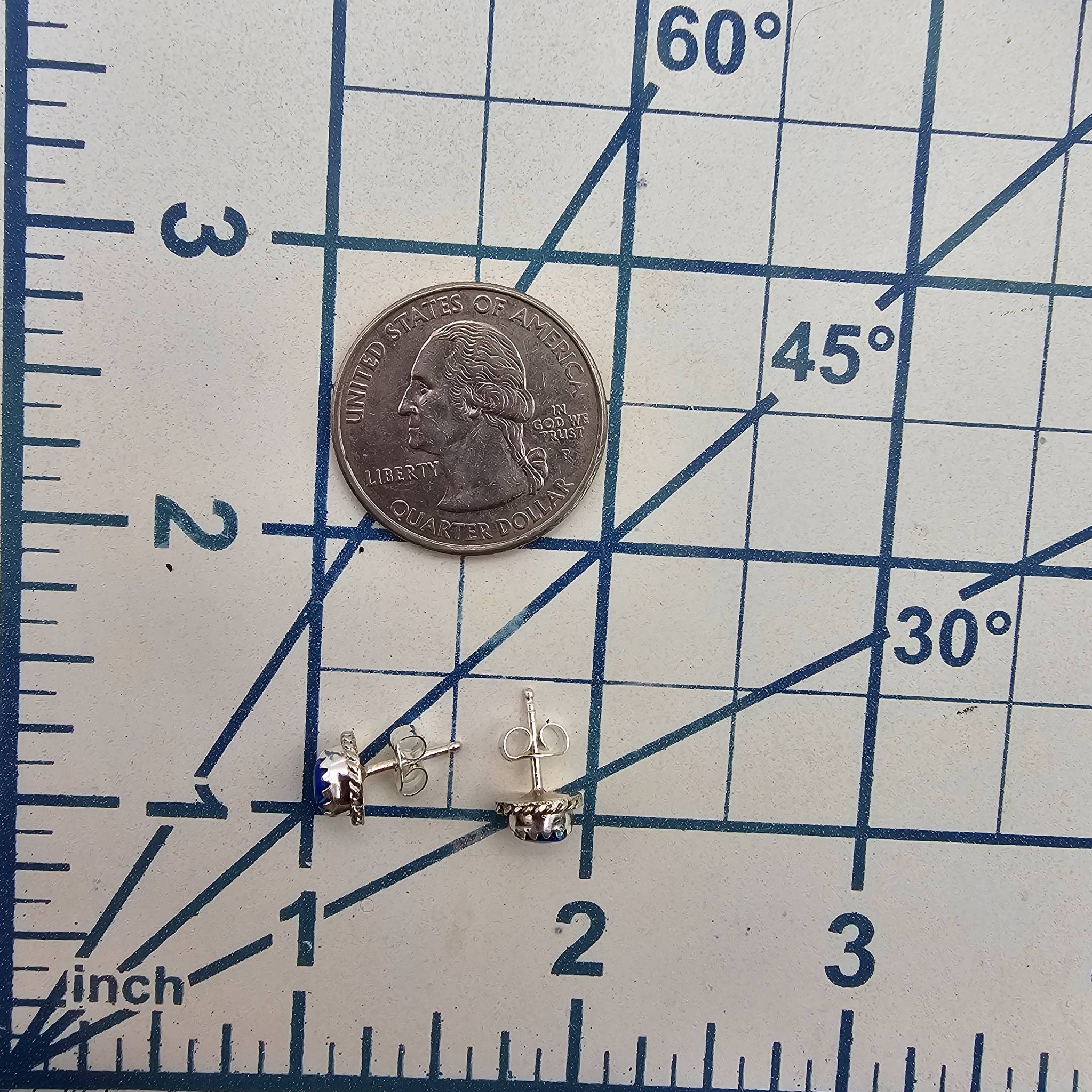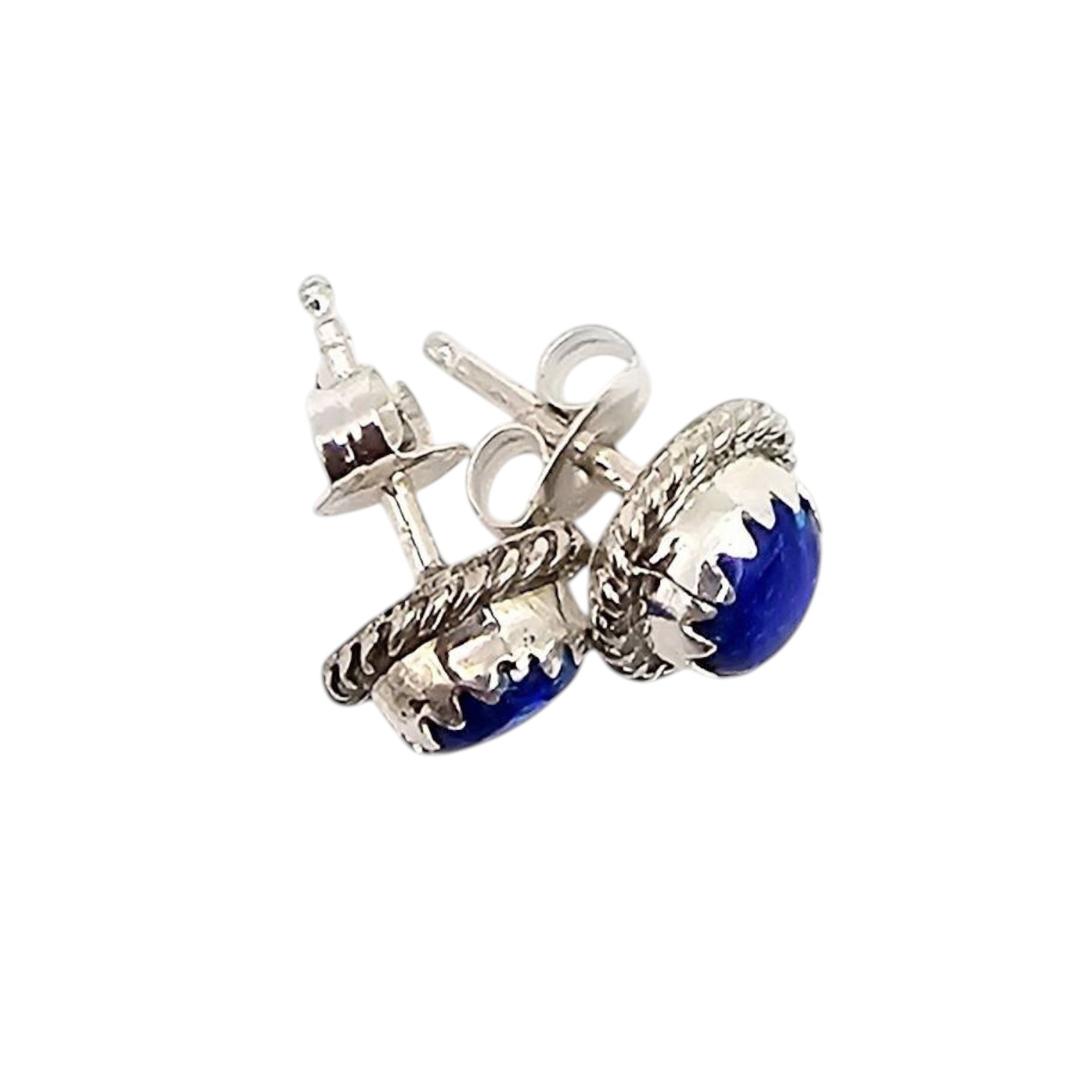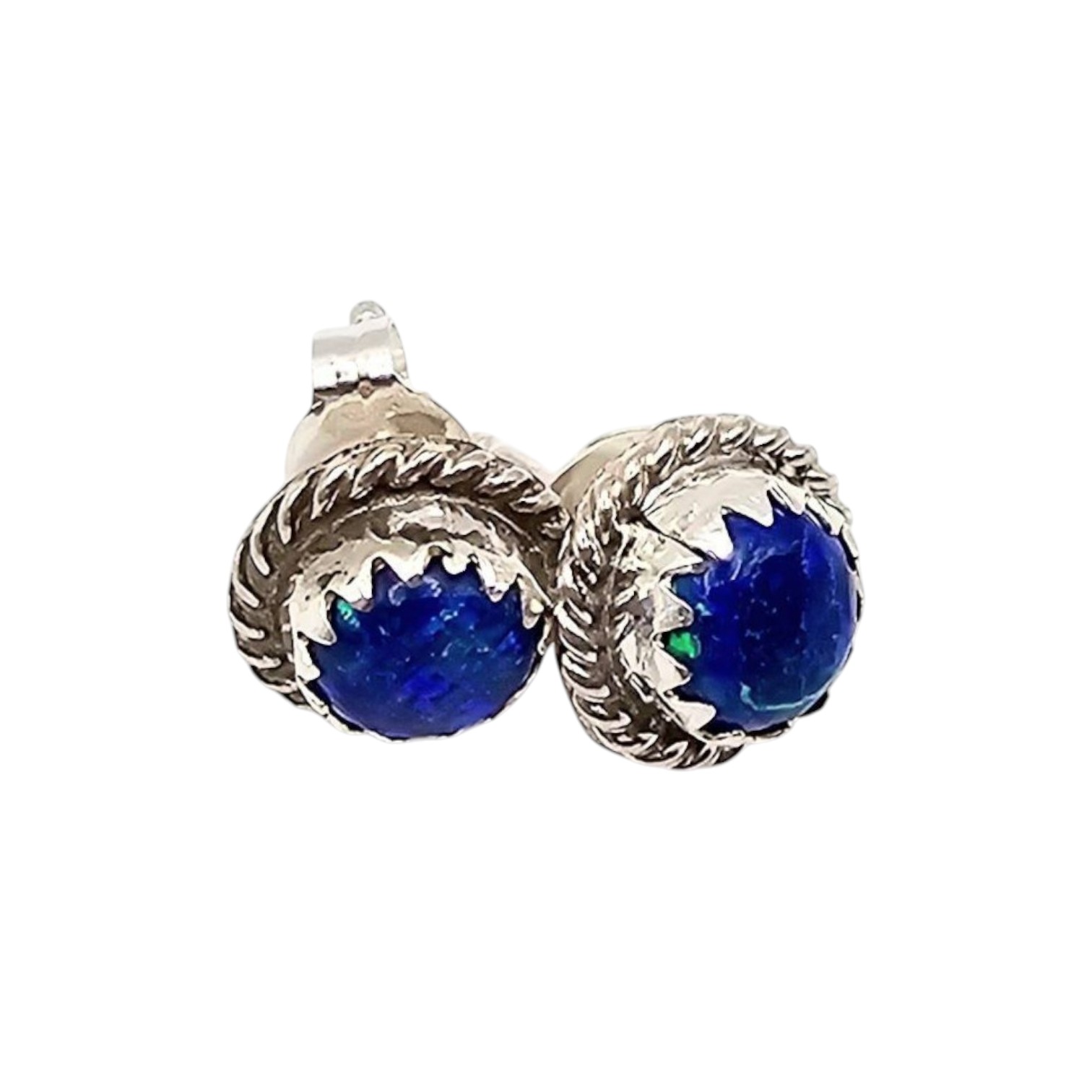 Handcrafted sterling silver stud earrings by Navajo artist Larson Chee. Each earring features a bezel-set synthetic blue opal surrounded by intricate silverwork. Marked as ‘Genuine Indian Handcrafted Sterling Silver.’ Lightweight at approximately 1.1 g total. Size is compact for subtle wear.
