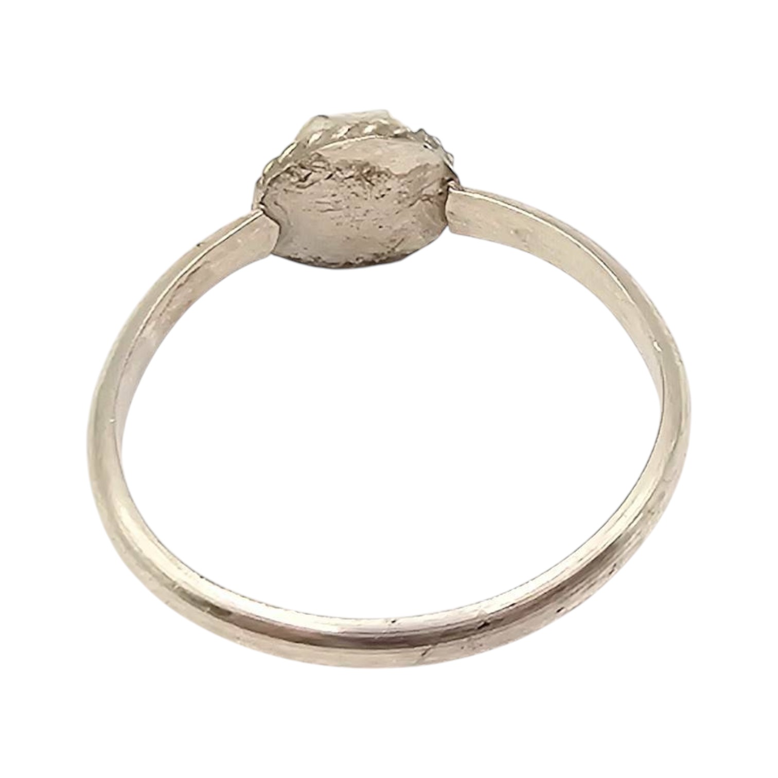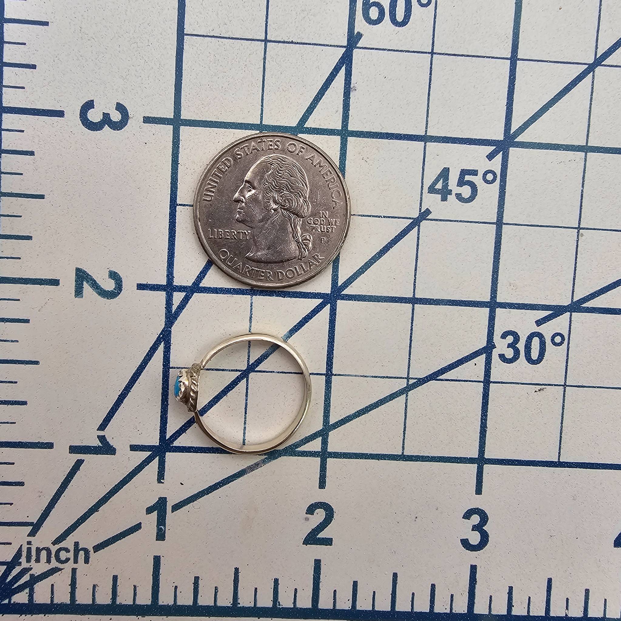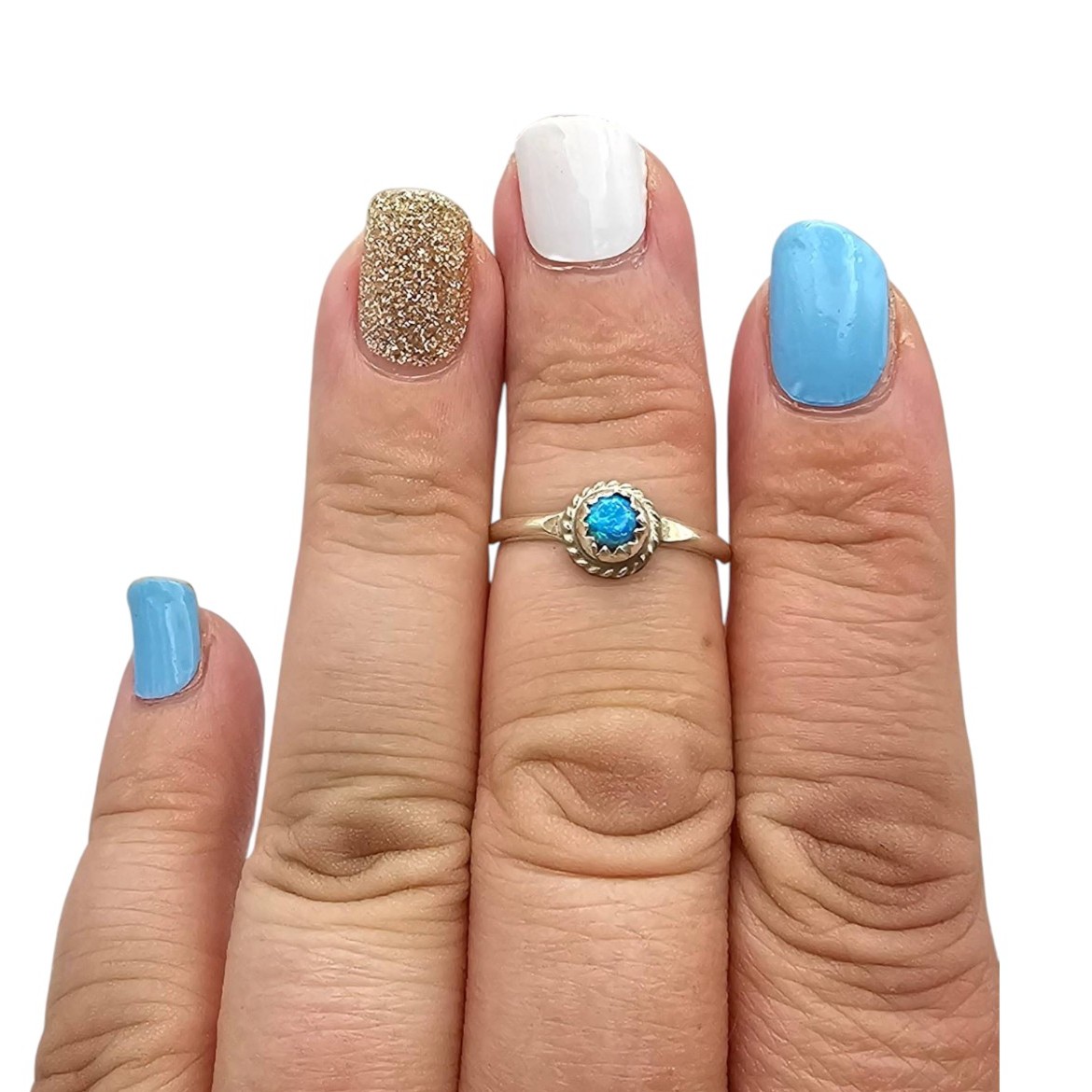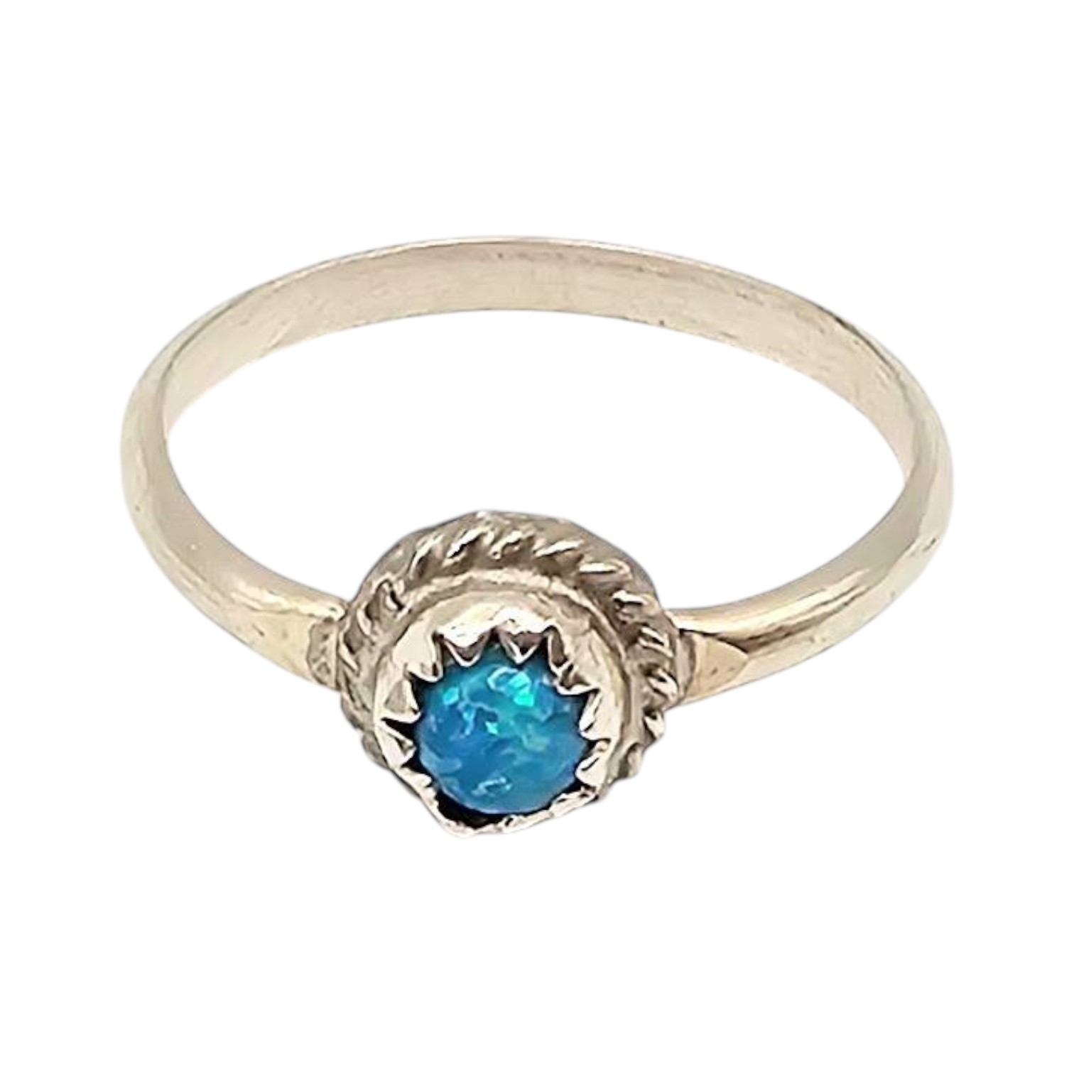 Sterling silver handmade ring by Navajo artisan Esther White, showcasing a round blue opal stone in a decorative bezel setting. Marked as a size 6, this lightweight ring weighs approximately 1.1 grams. The craftsmanship highlights traditional Navajo design techniques and is a refined piece of Native American jewelry.
