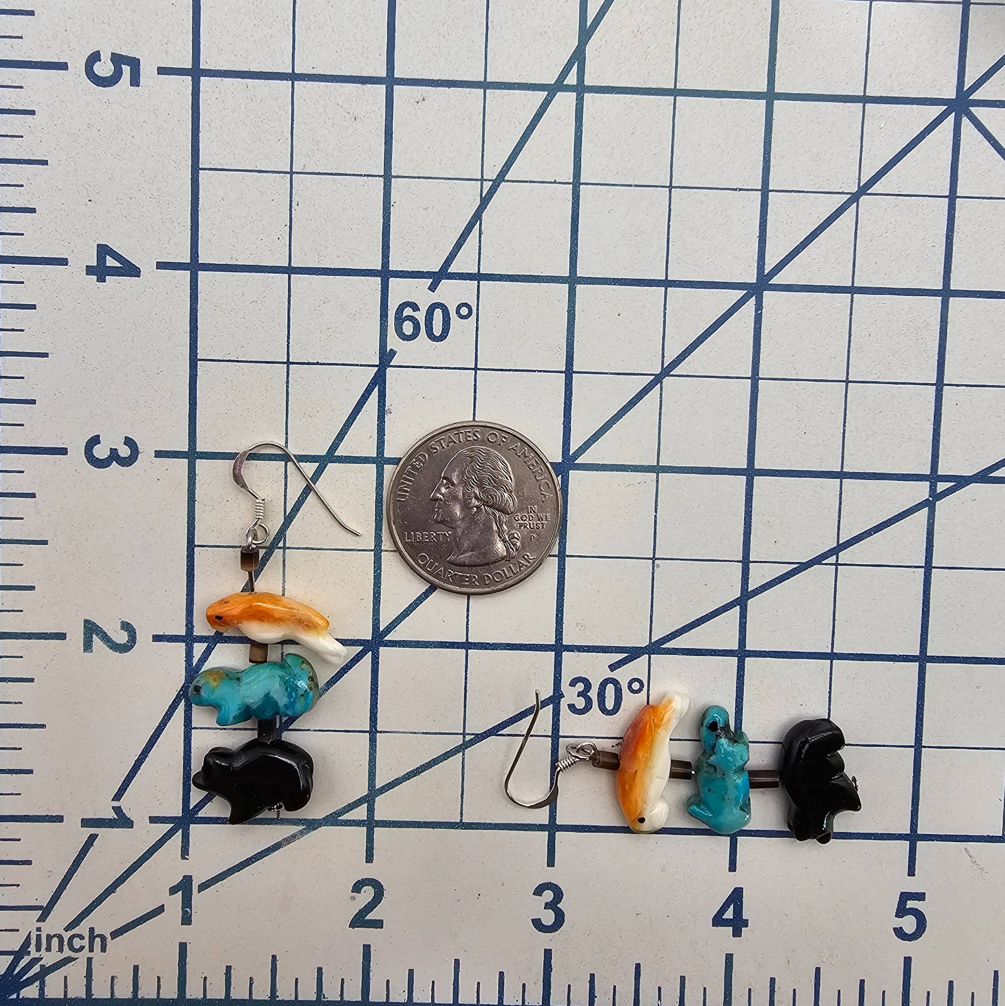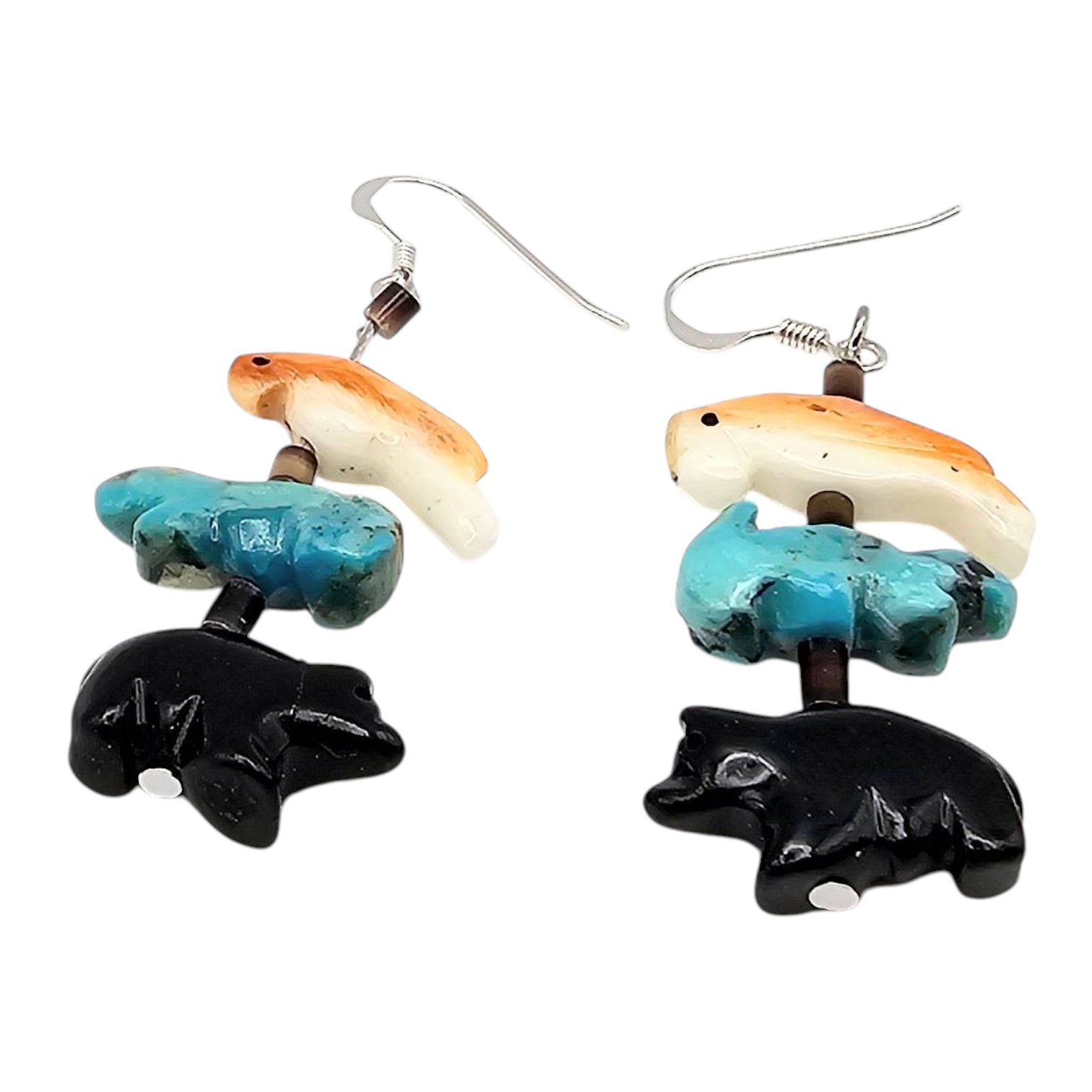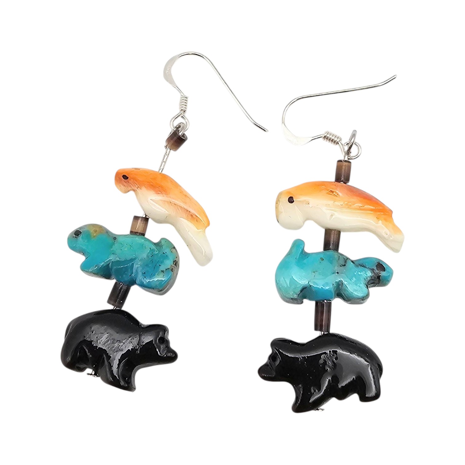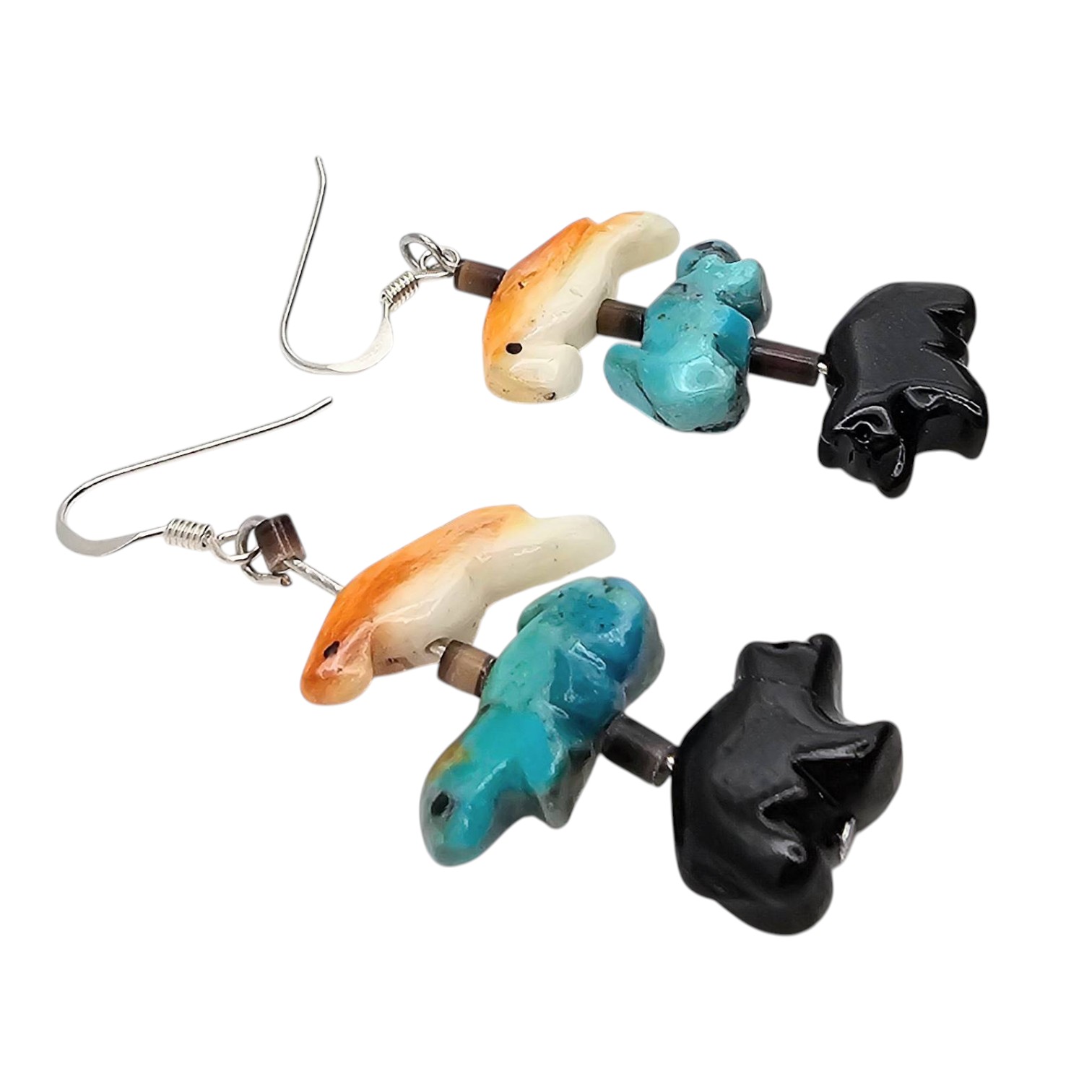 Dangle earrings featuring small fetish animal totem carvings made from various stones, spiny oyster, onyx, and turquoise-colored stones. Each earring includes sterling silver hooks. The earrings measure approximately 2 inches in length and weigh a combined total of 7.1 grams. Suitable for collectors or enthusiasts of handmade jewelry.