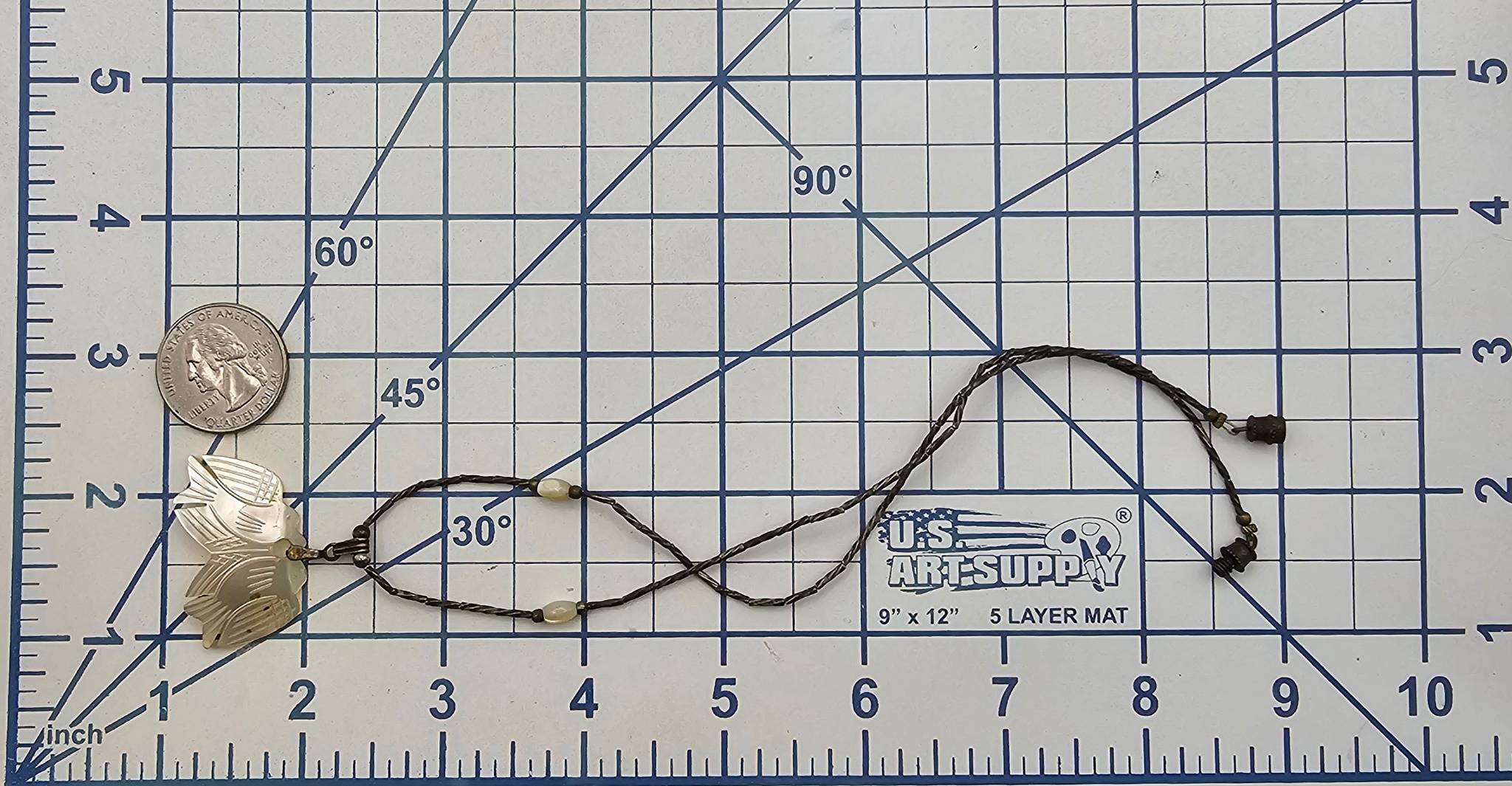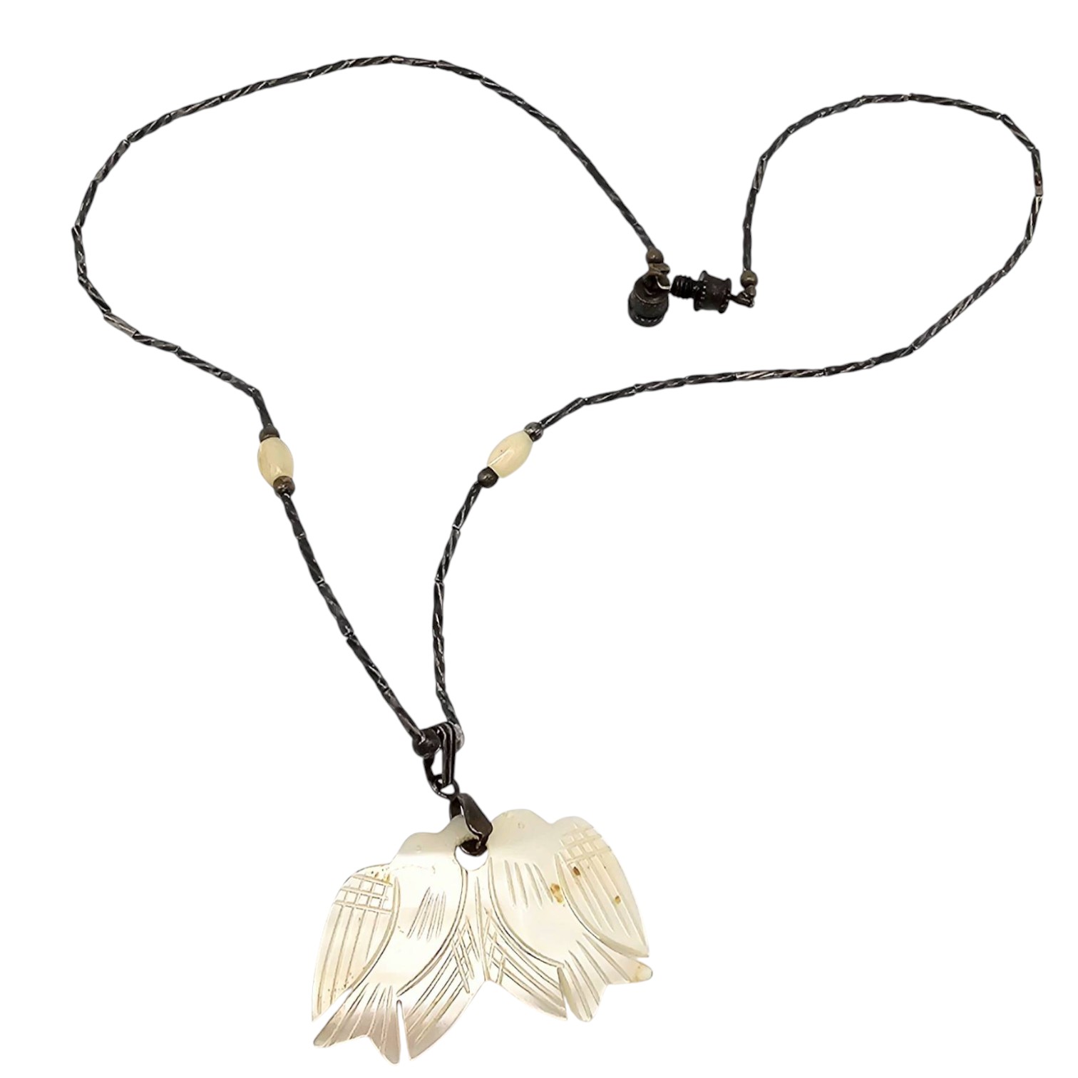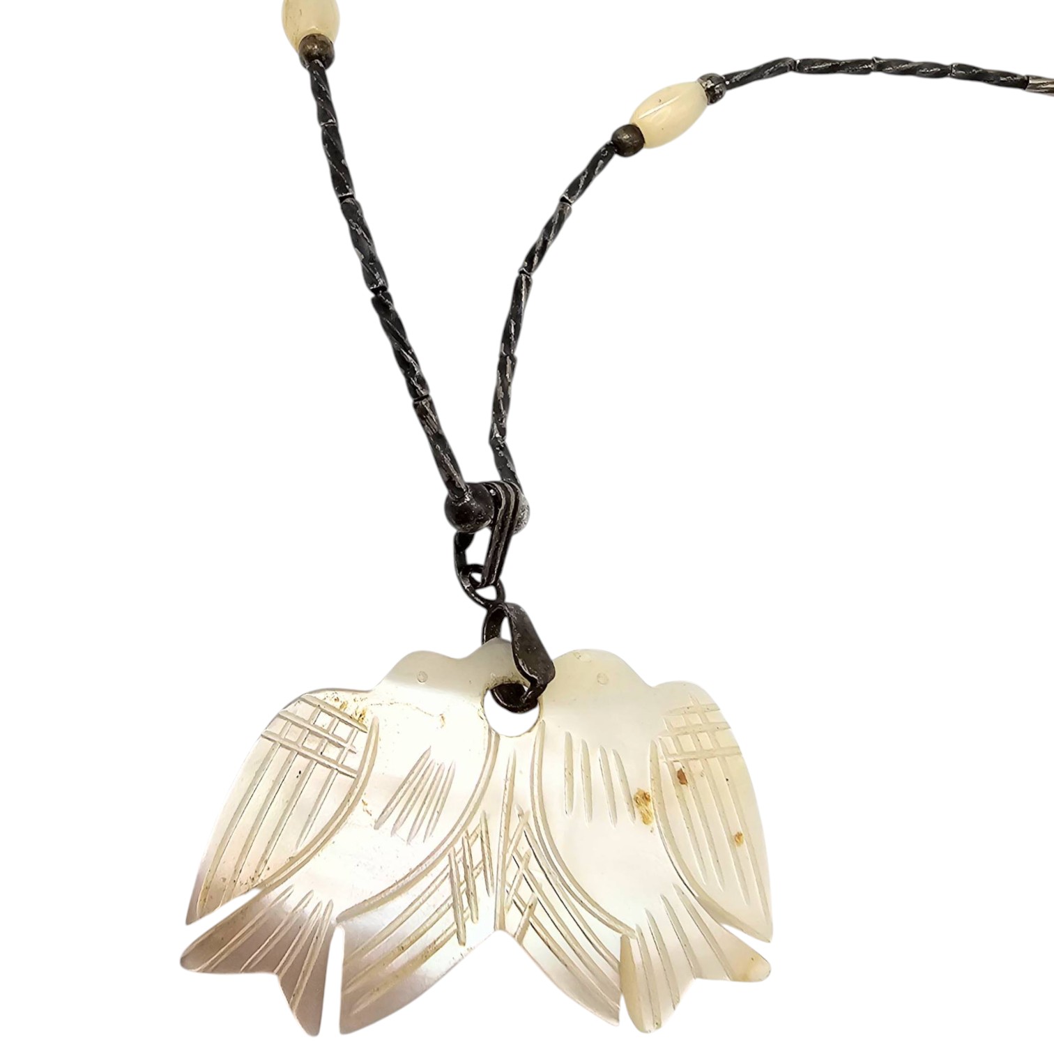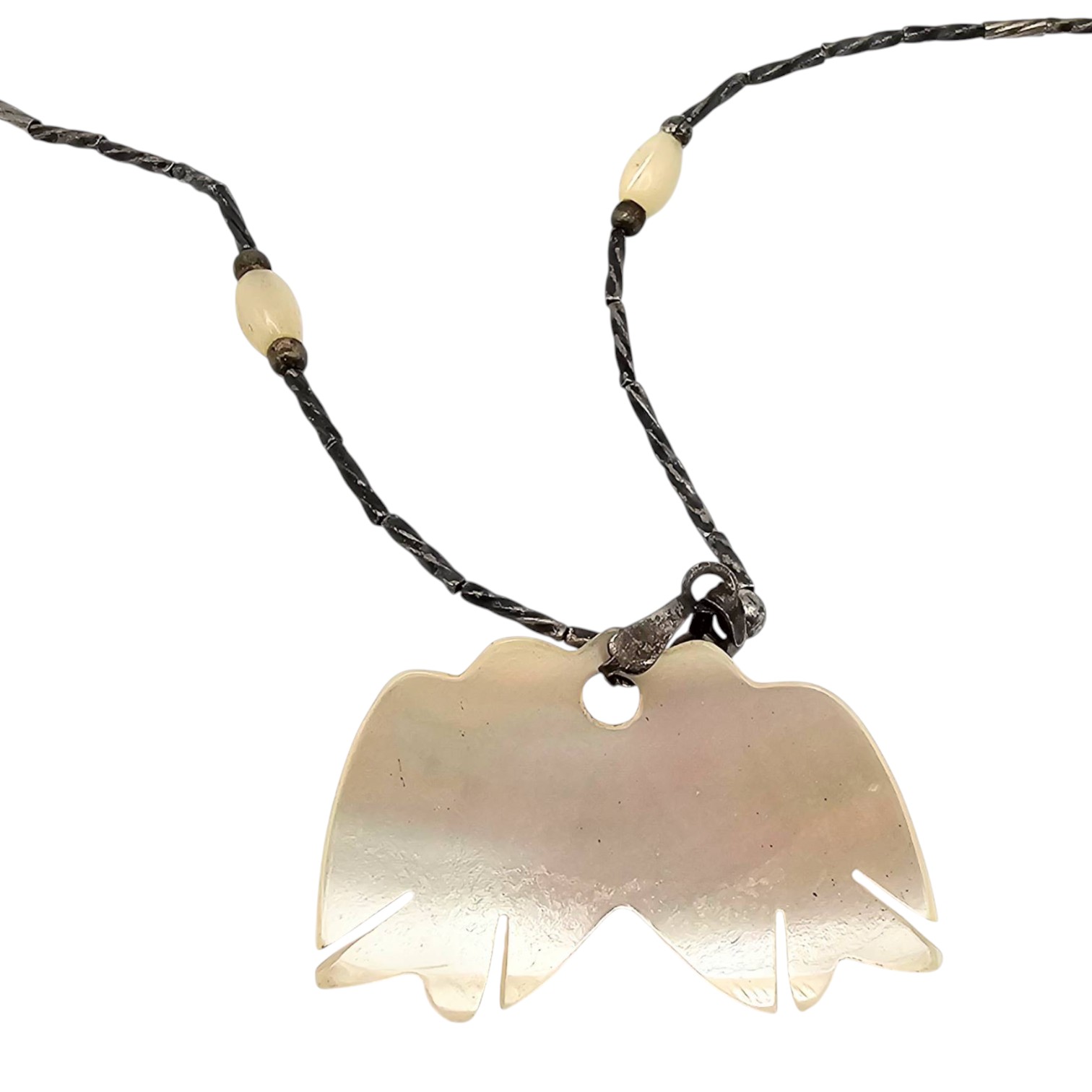 Southwestern necklace featuring sterling liquid silver components and a mother-of-pearl carved pendant in a wing-like design. Weighs approximately 6 grams. Includes decorative beads and a secure clasp. Overall measurement detailed on grid background.