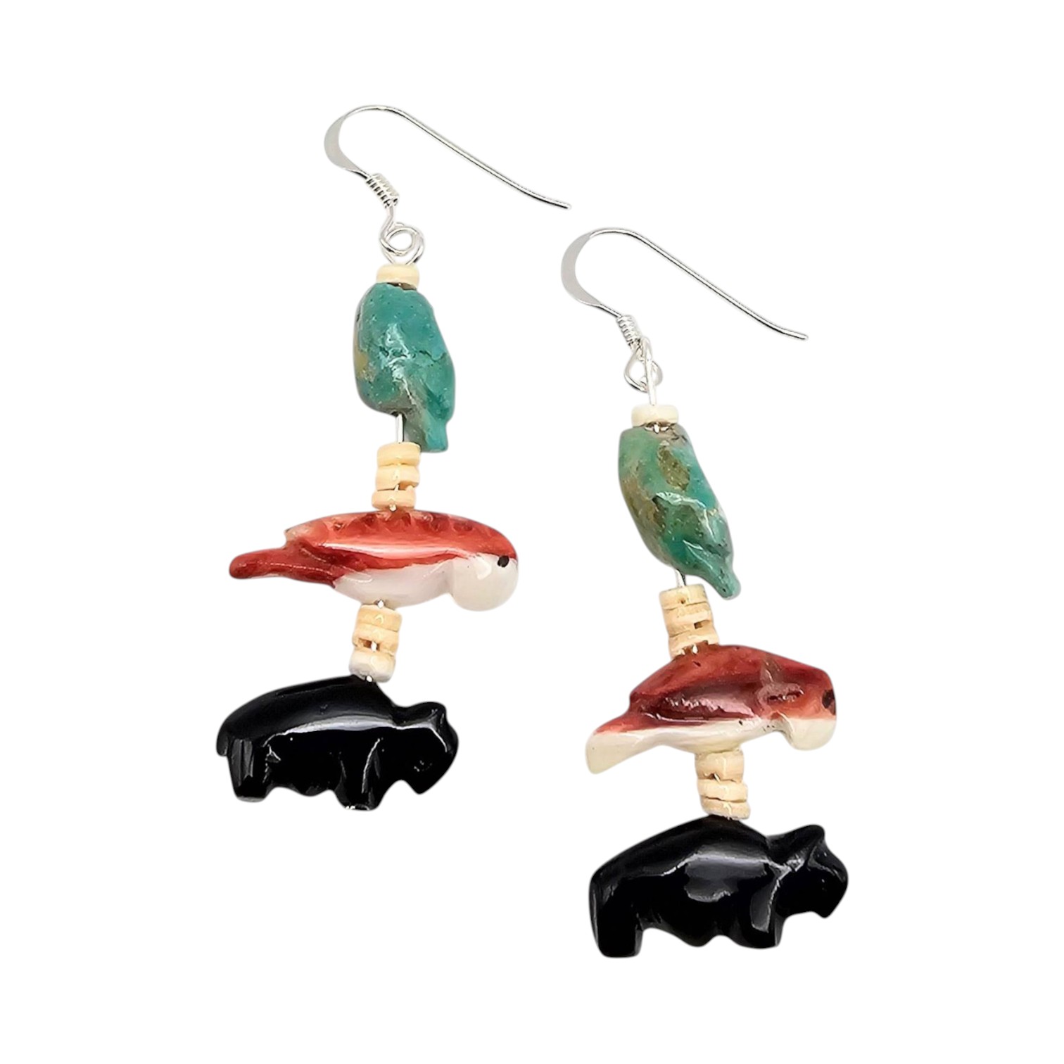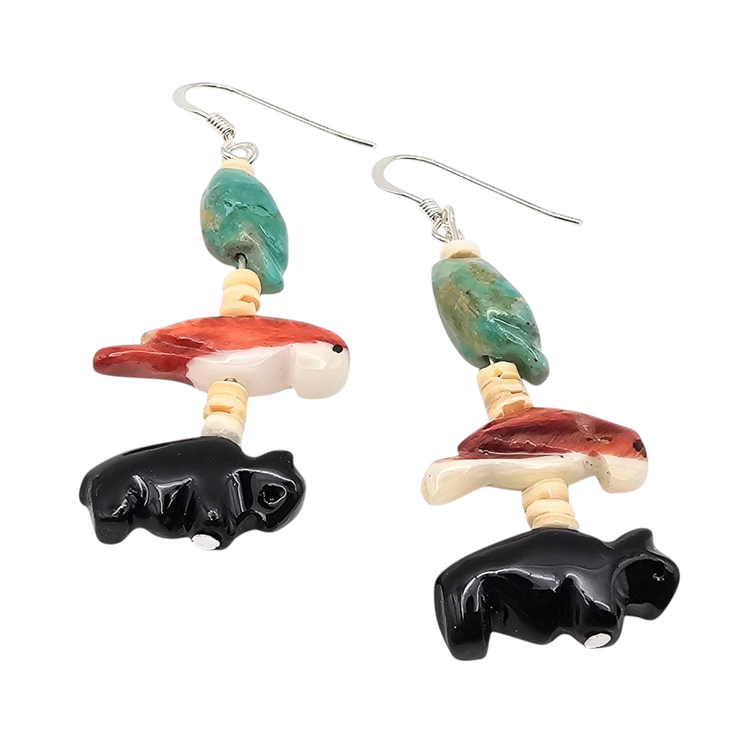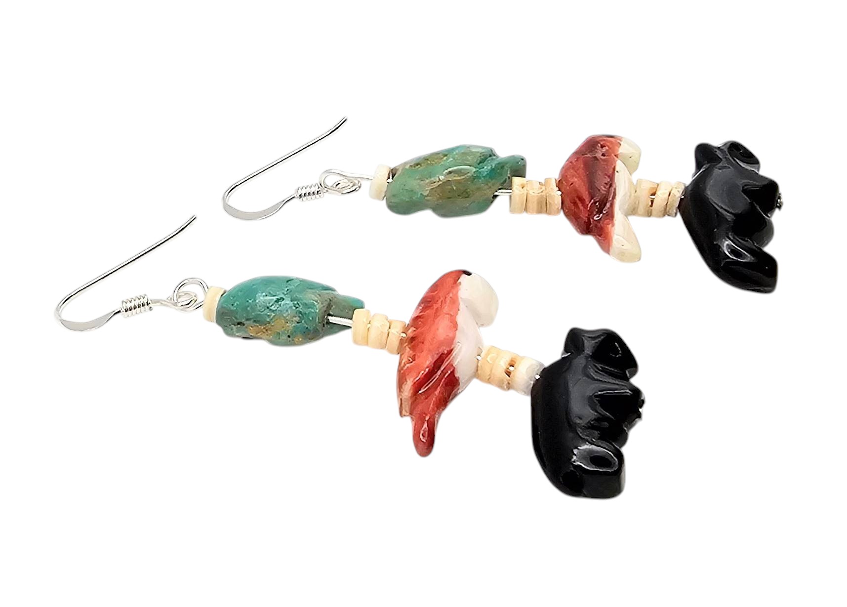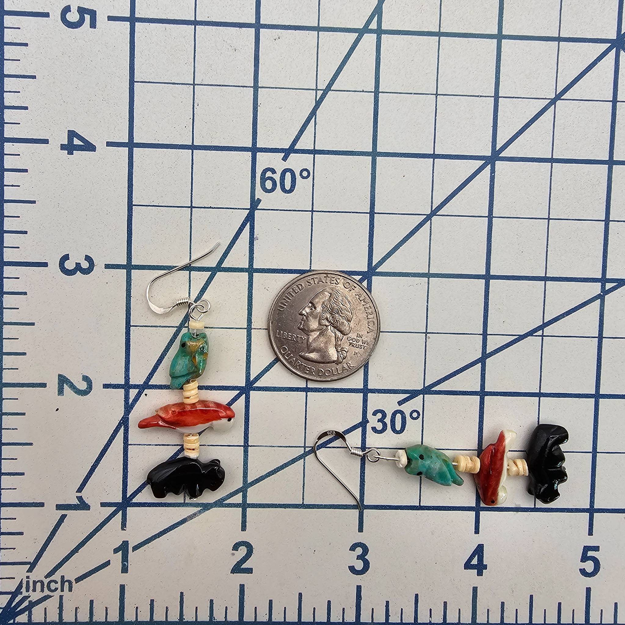Carved animal fetish earrings featuring turquoise, spiny oyster, and black onyx elements. The earrings include intricate depictions of animals and are spaced with bead separators. The hooks are sterling Silver, and the total weight is 5.6 grams. Length and scale are shown relative to a US quarter and grid for size reference.