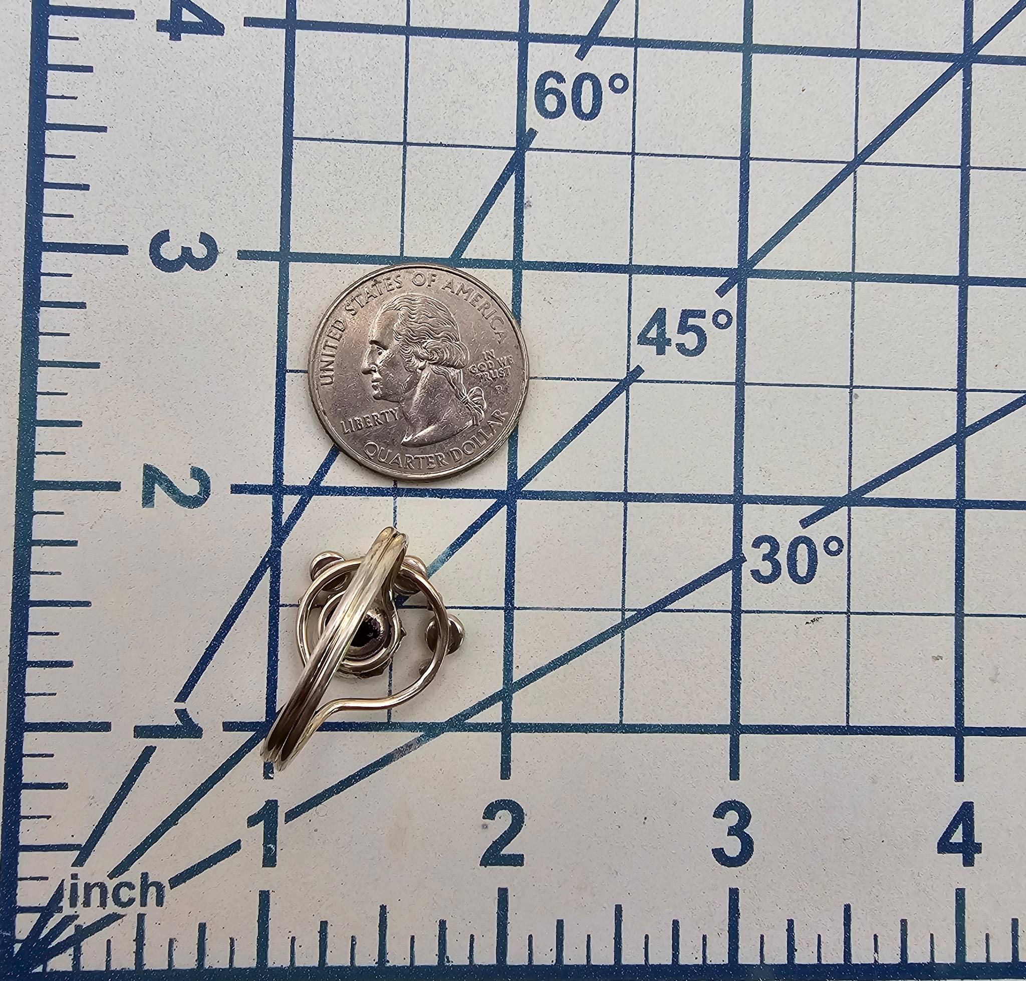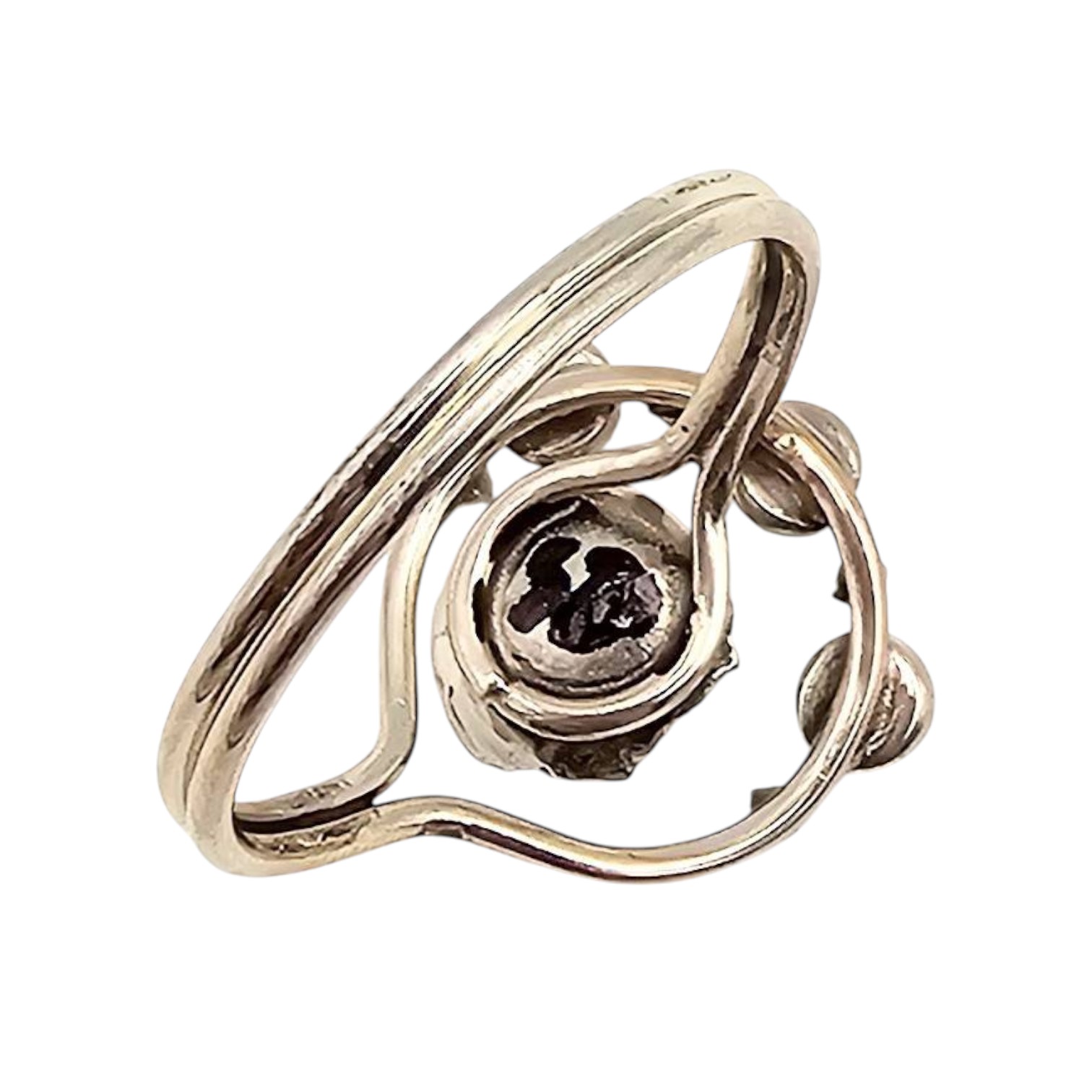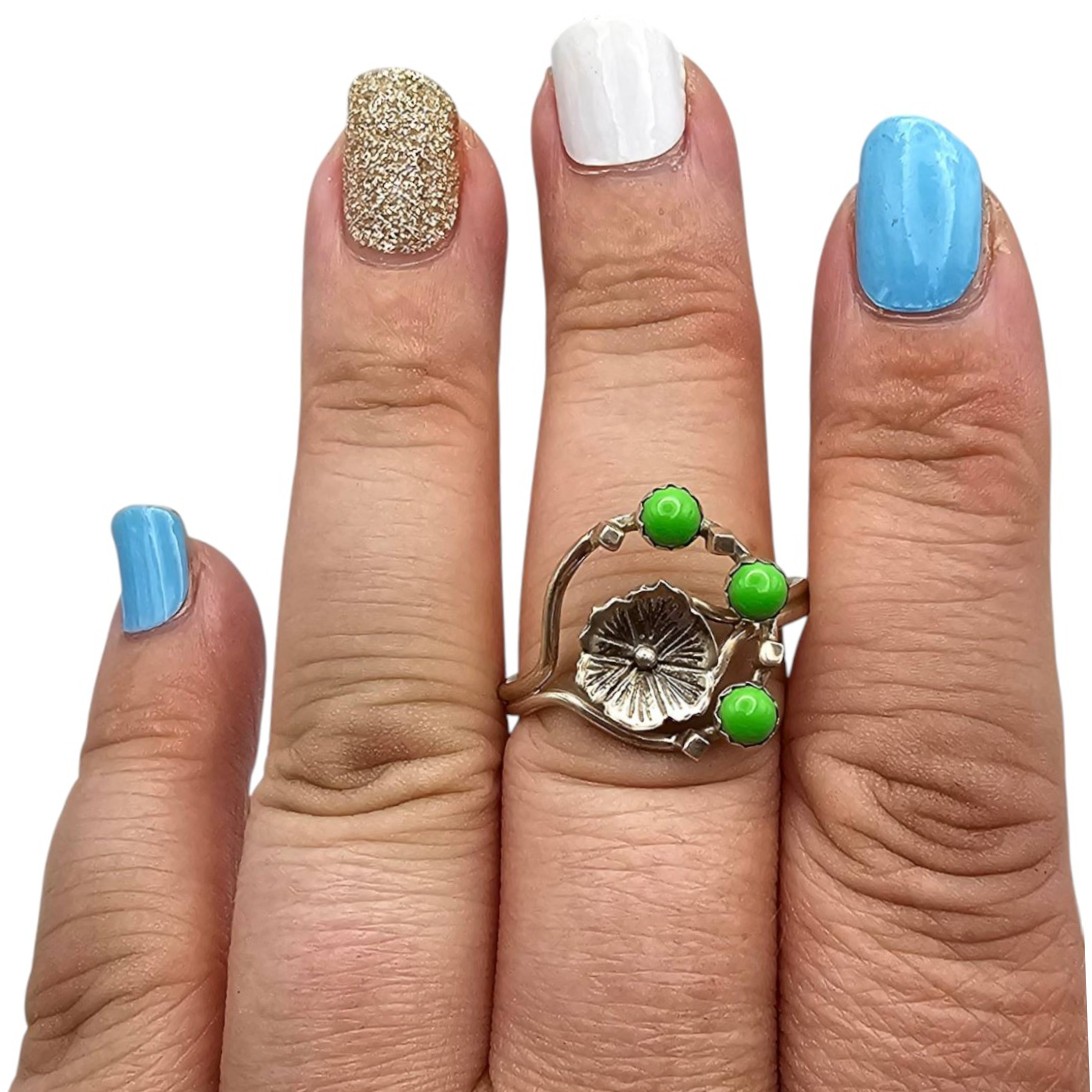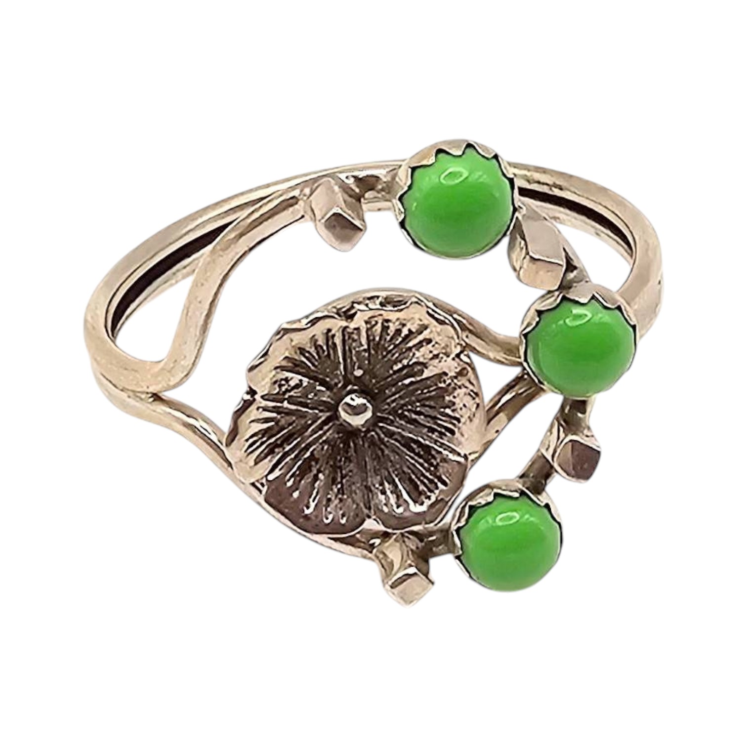 Sterling silver ring featuring an intricate floral design and three green stones. The ring is a size 12 and weighs approximately 3.4 grams. The design includes a central flower accent and a wrapped band, offering a unique aesthetic.