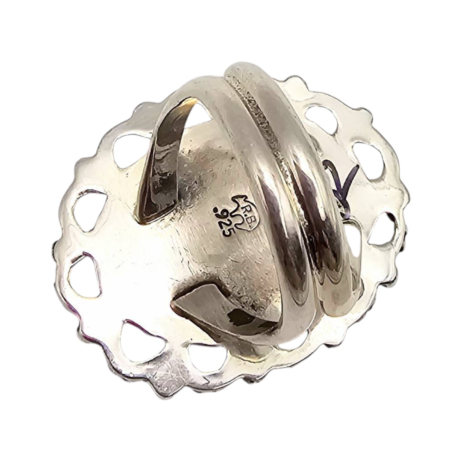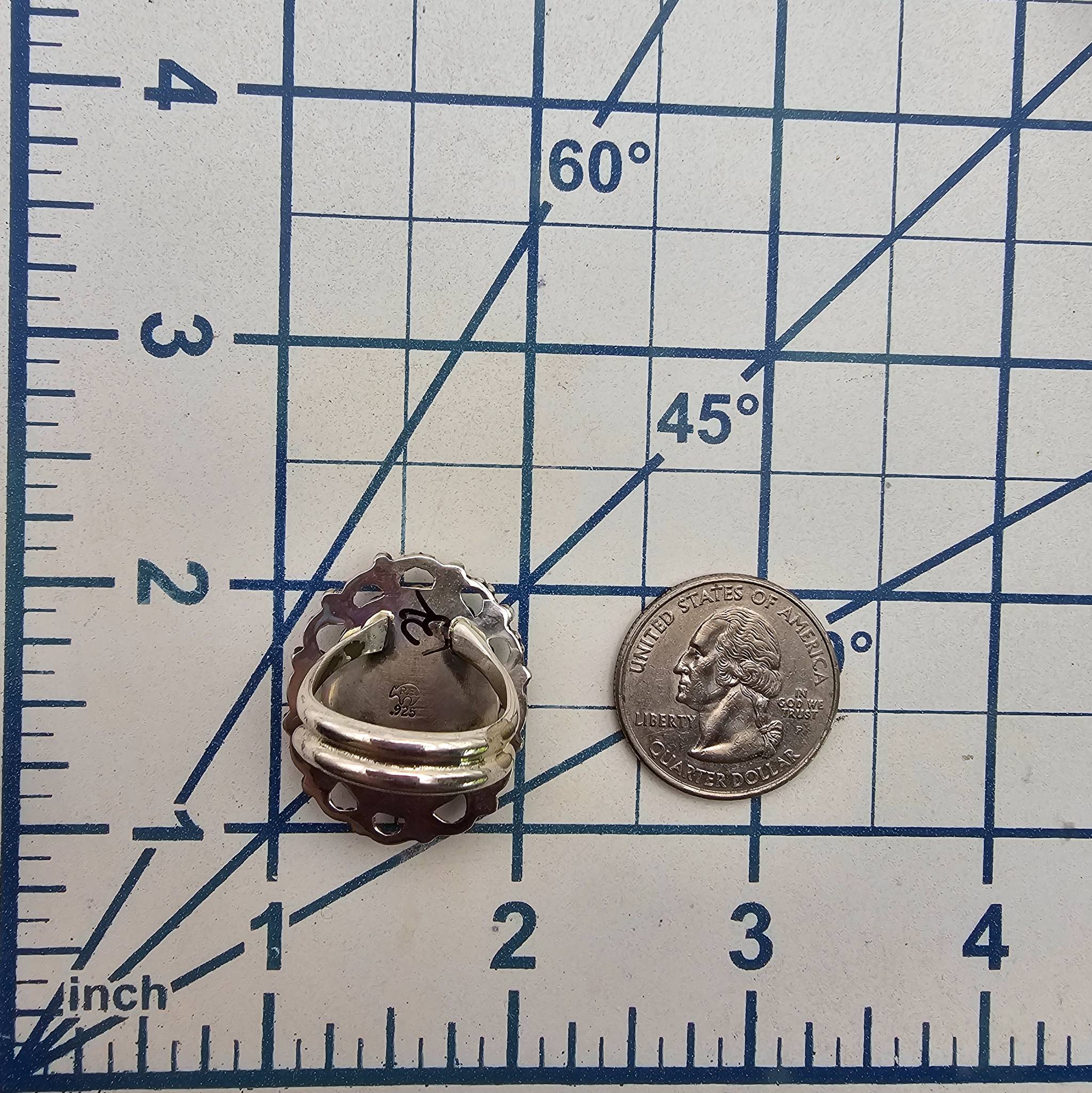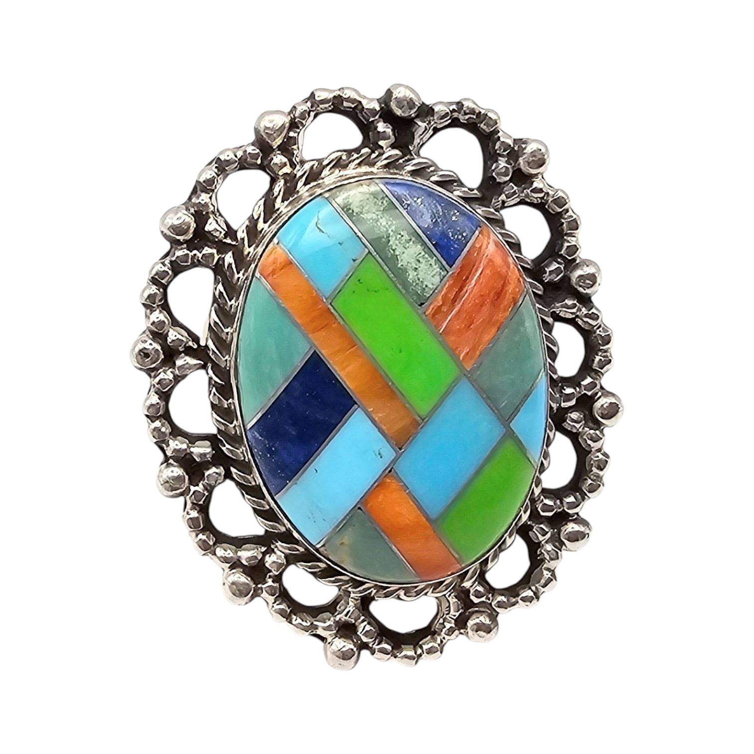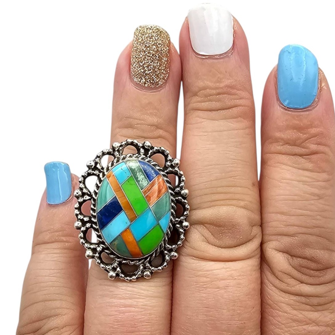 Sterling silver ring featuring an oval inlay centerpiece with a Multi-Stone geometric design of turquoise, lapis lazuli, chrysoprase, and coral. The setting features a filigree border surrounding the inlay. Weighs 8.5 grams. Quarter for reference, size 6.5