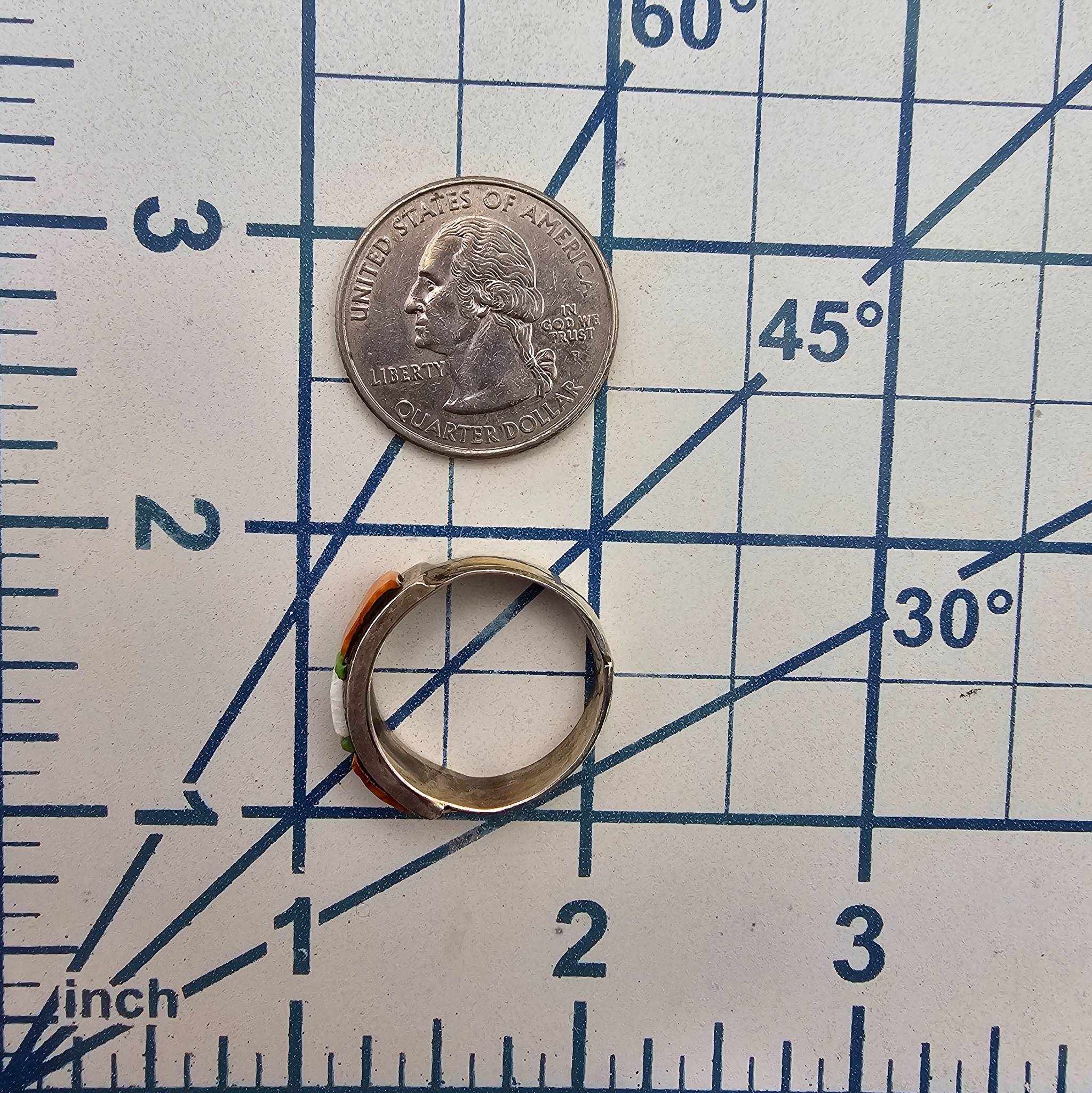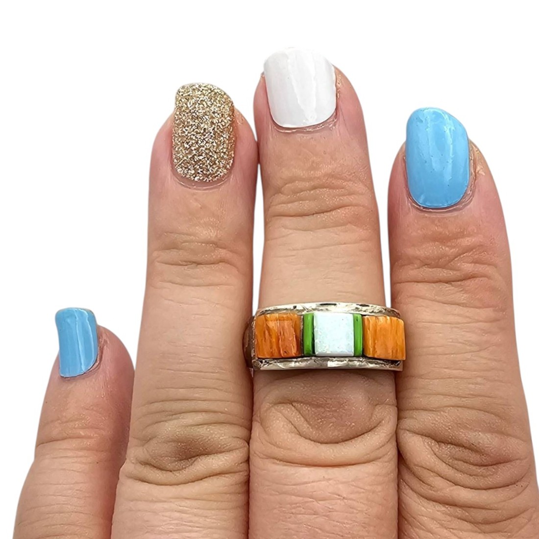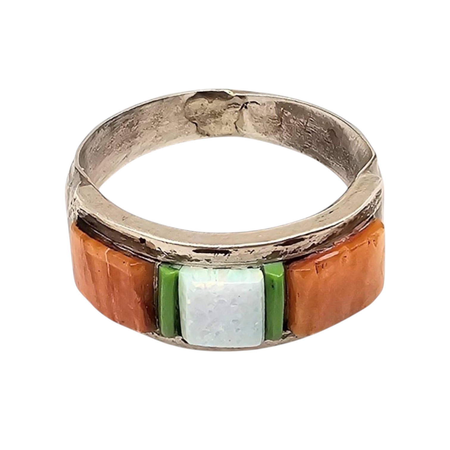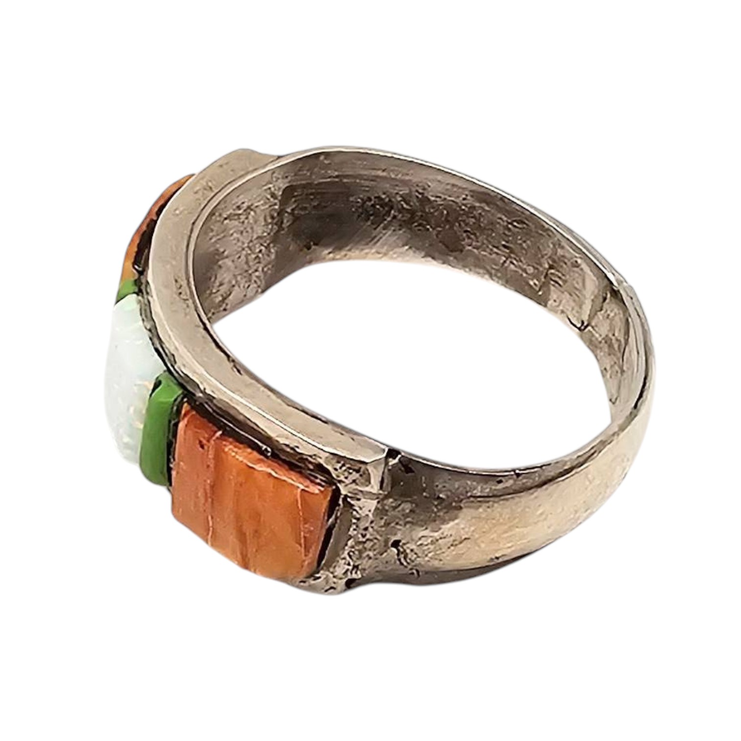 Sterling silver Navajo handmade ring by Victor Thompson, featuring a multi-stone inlay design. The stones include spiny oyster, opal, and green chrysoprase. The ring is a size 8.5 and weighs 5.1 grams. Crafted with precision, this piece is a representation of Navajo artistry.