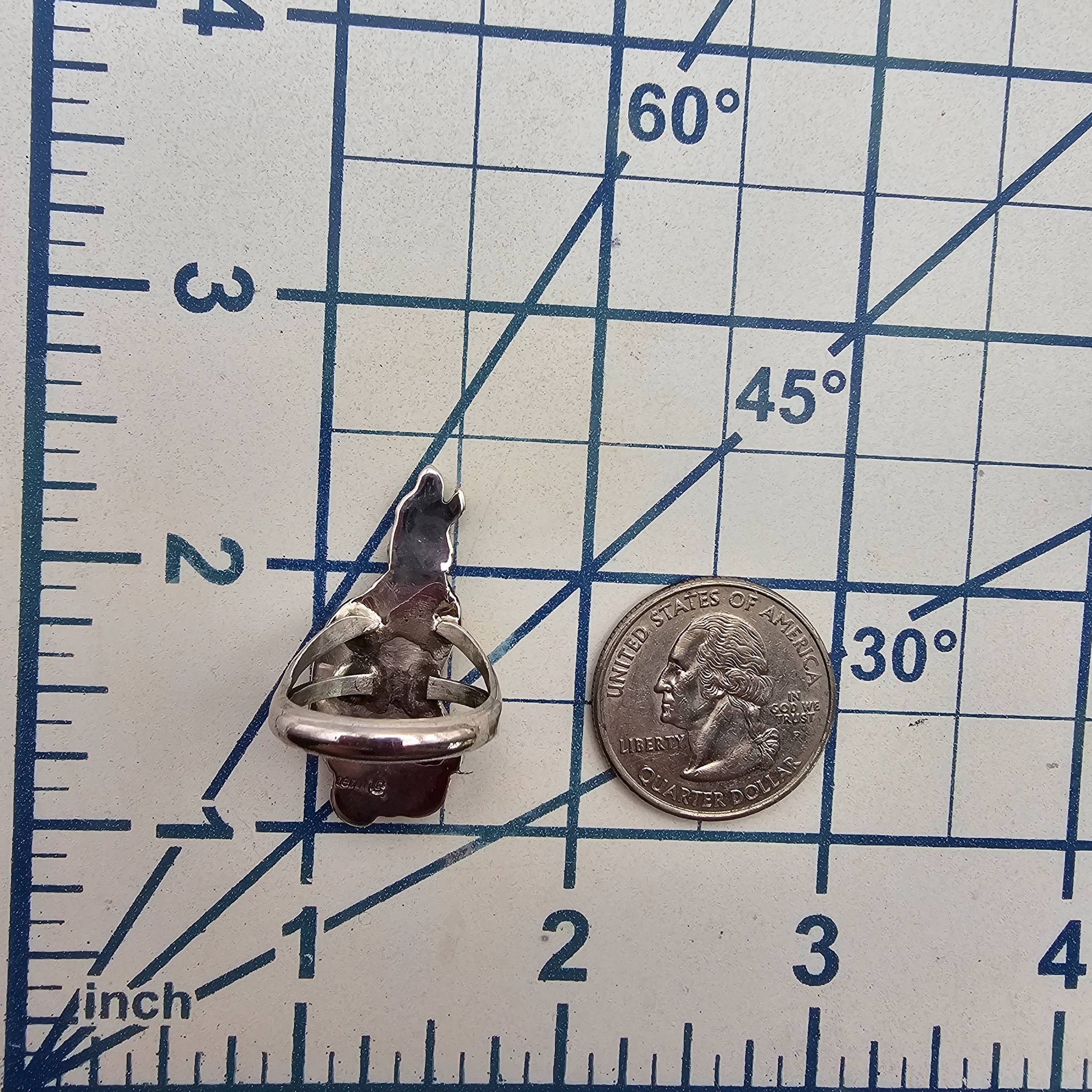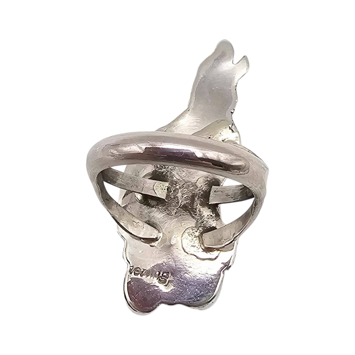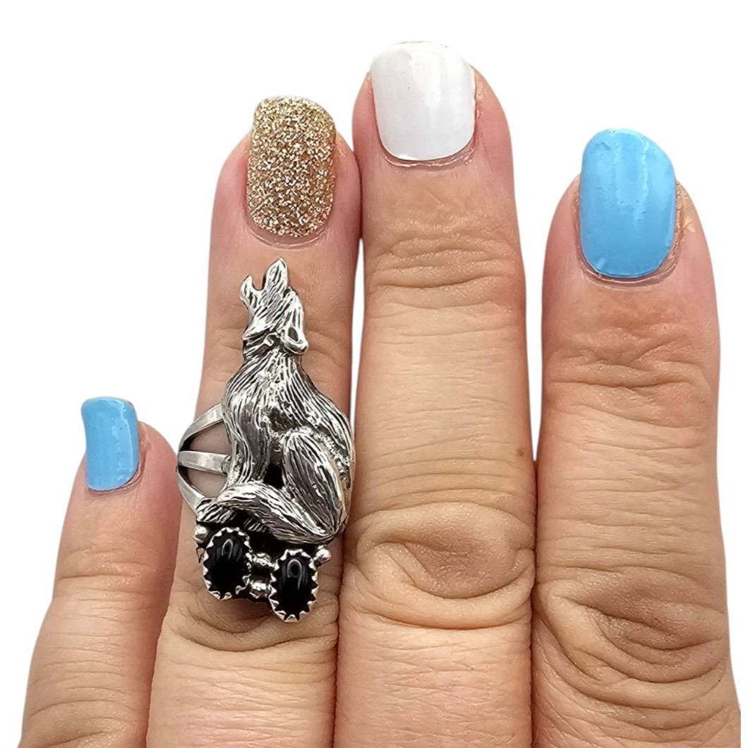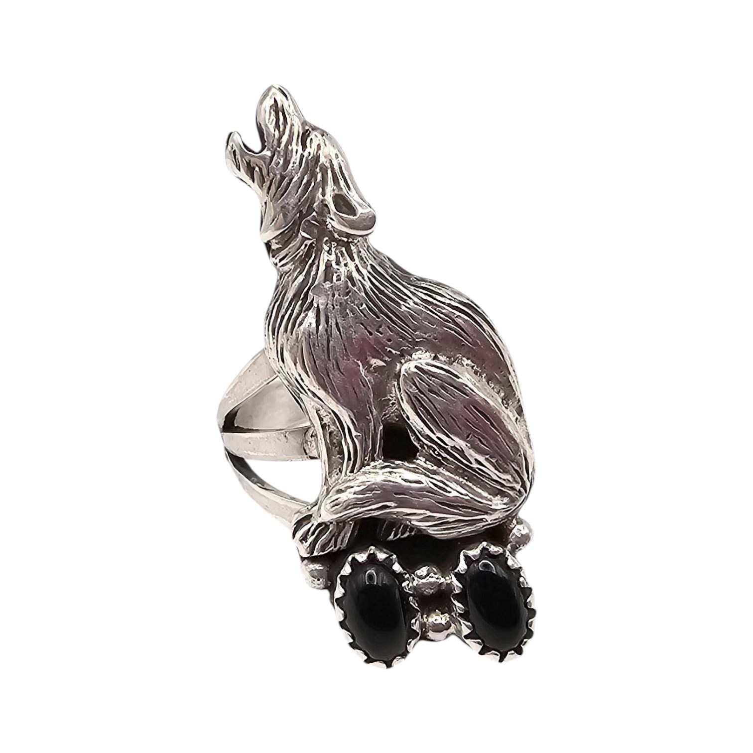 Sterling silver ring designed by Navajo artist Robert Martinez featuring a howling wolf motif. The ring is in size 6 and incorporates two black onyx stones. Weighing approximately 7.3 grams, the hallmarked piece demonstrates traditional Navajo craftsmanship and artistry.